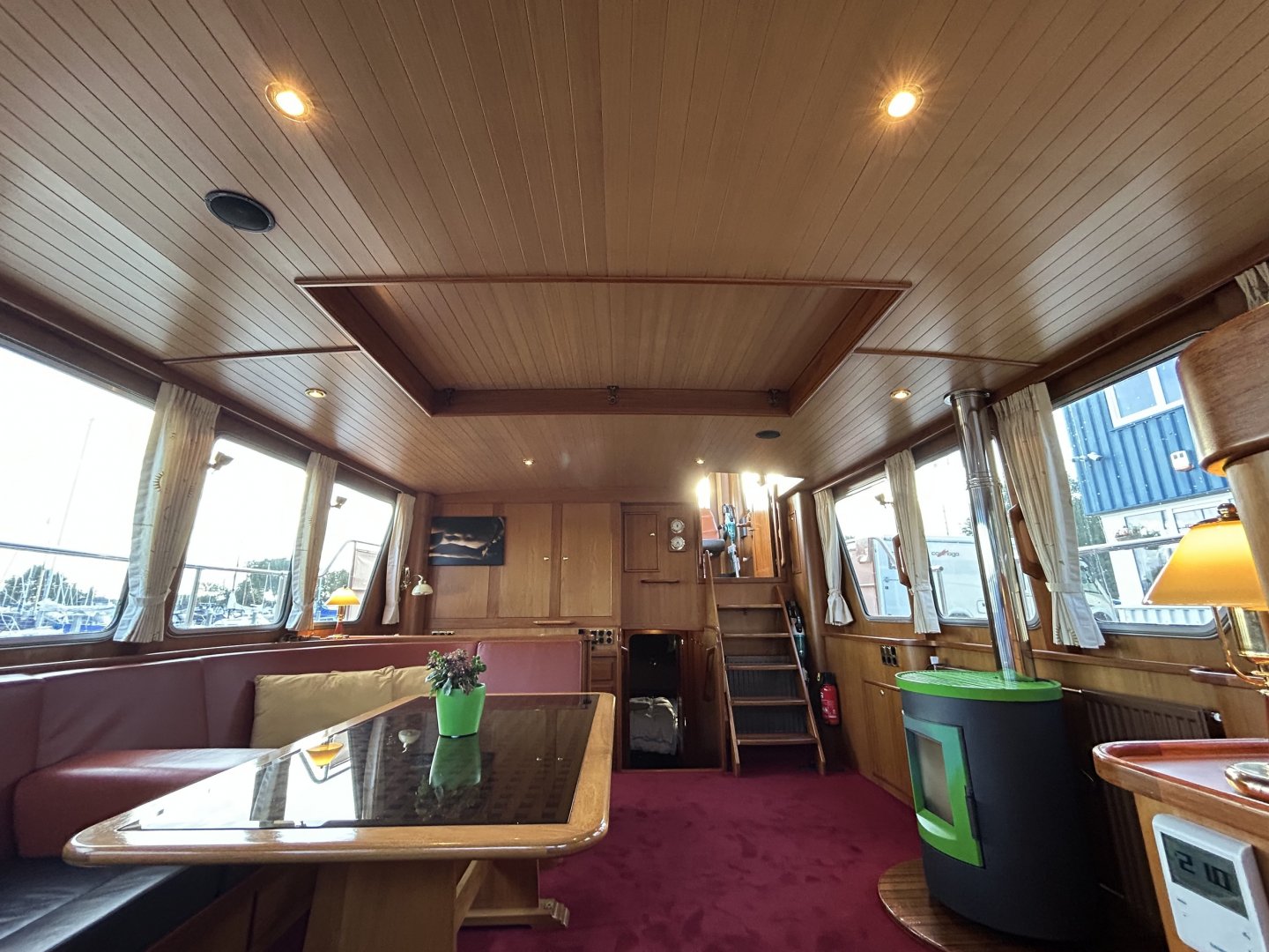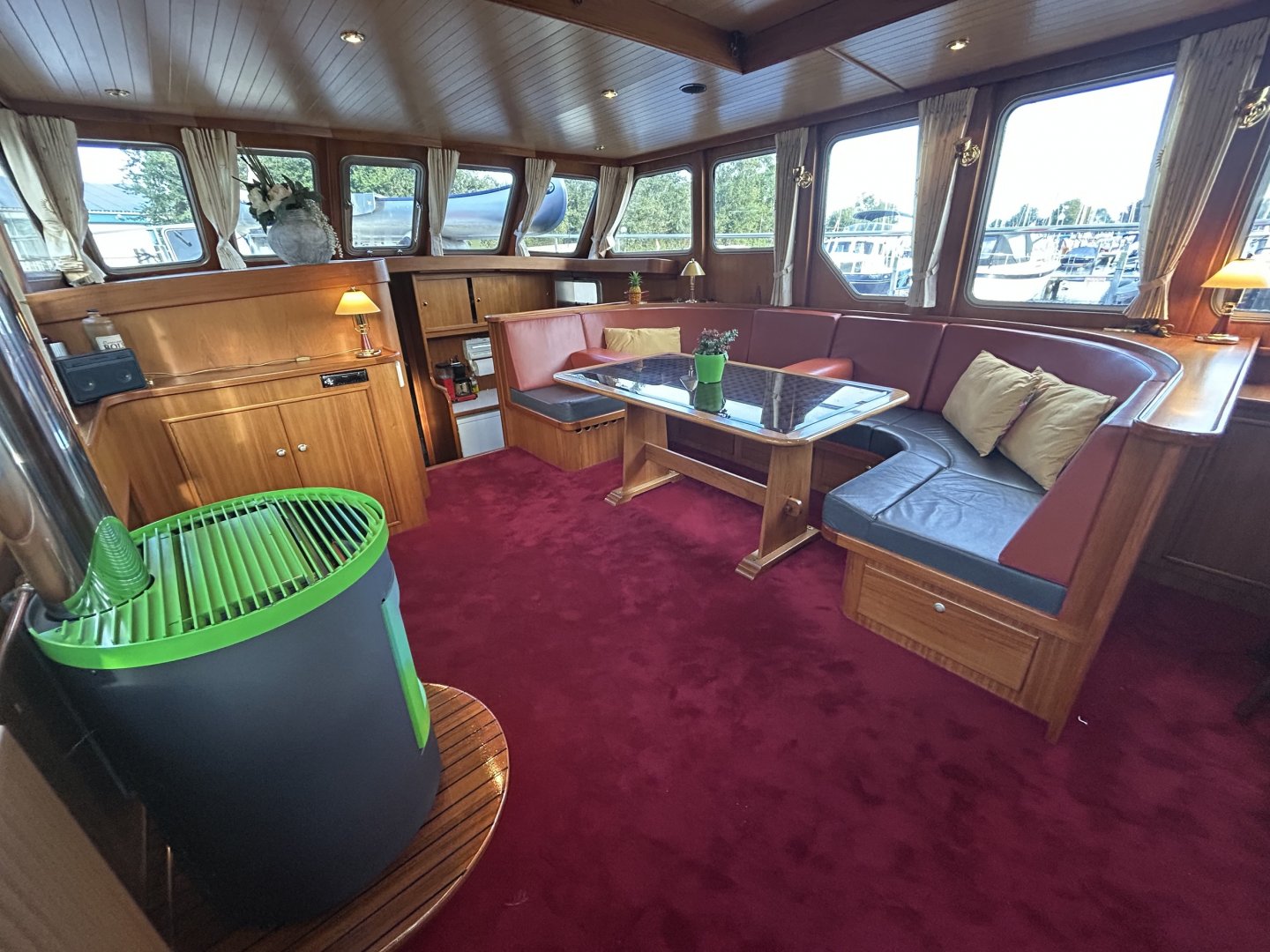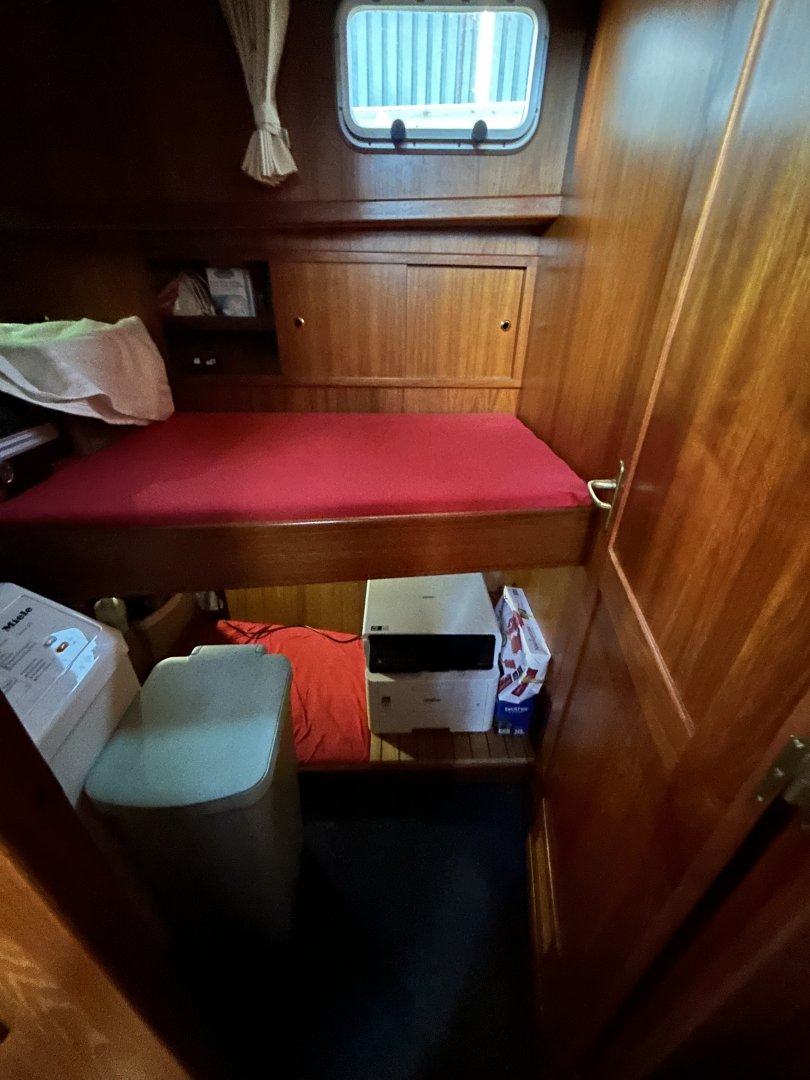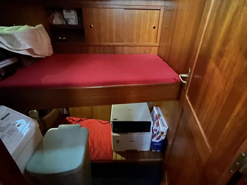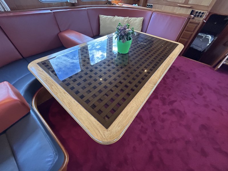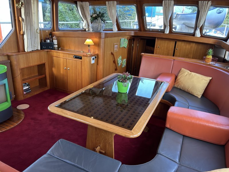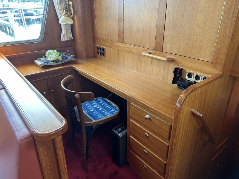 Geräumiges und helles Interieur. Der Salon hat eine große Rundsitzgruppe mit Schreibtisch (Arbeitsplatz) und gemütlichem Palettenofen. Im Heck befindet sich eine geräumige Eignerkabine mit separater Dusche und Toilette. Im vorderen Teil des Schiffes befinden sich 2 weitere Schlafzimmer mit eigenen Sanitäranlagen. Hier ist auch die Waschmaschine untergebracht. Es gibt reichlich Stauraum.