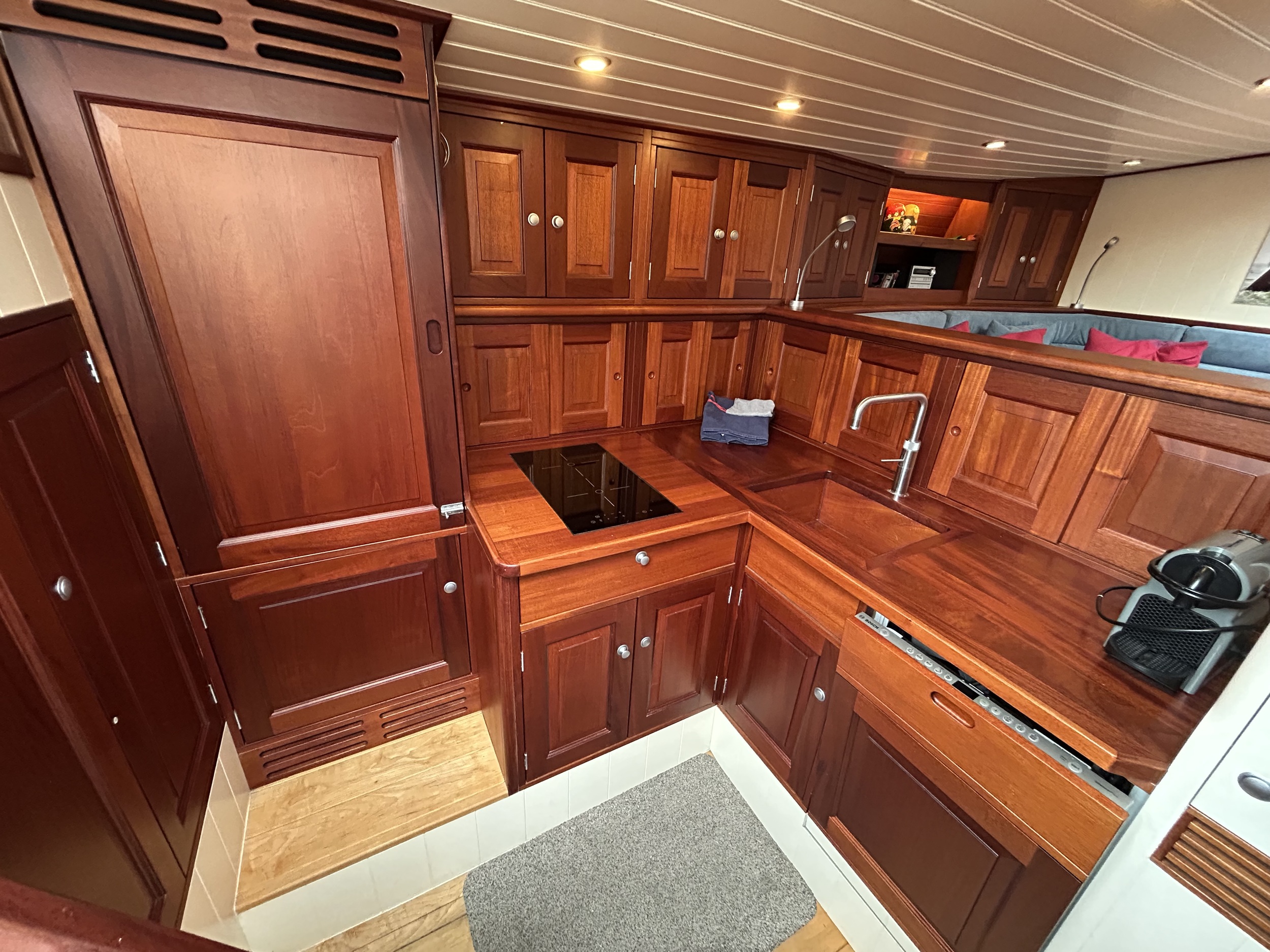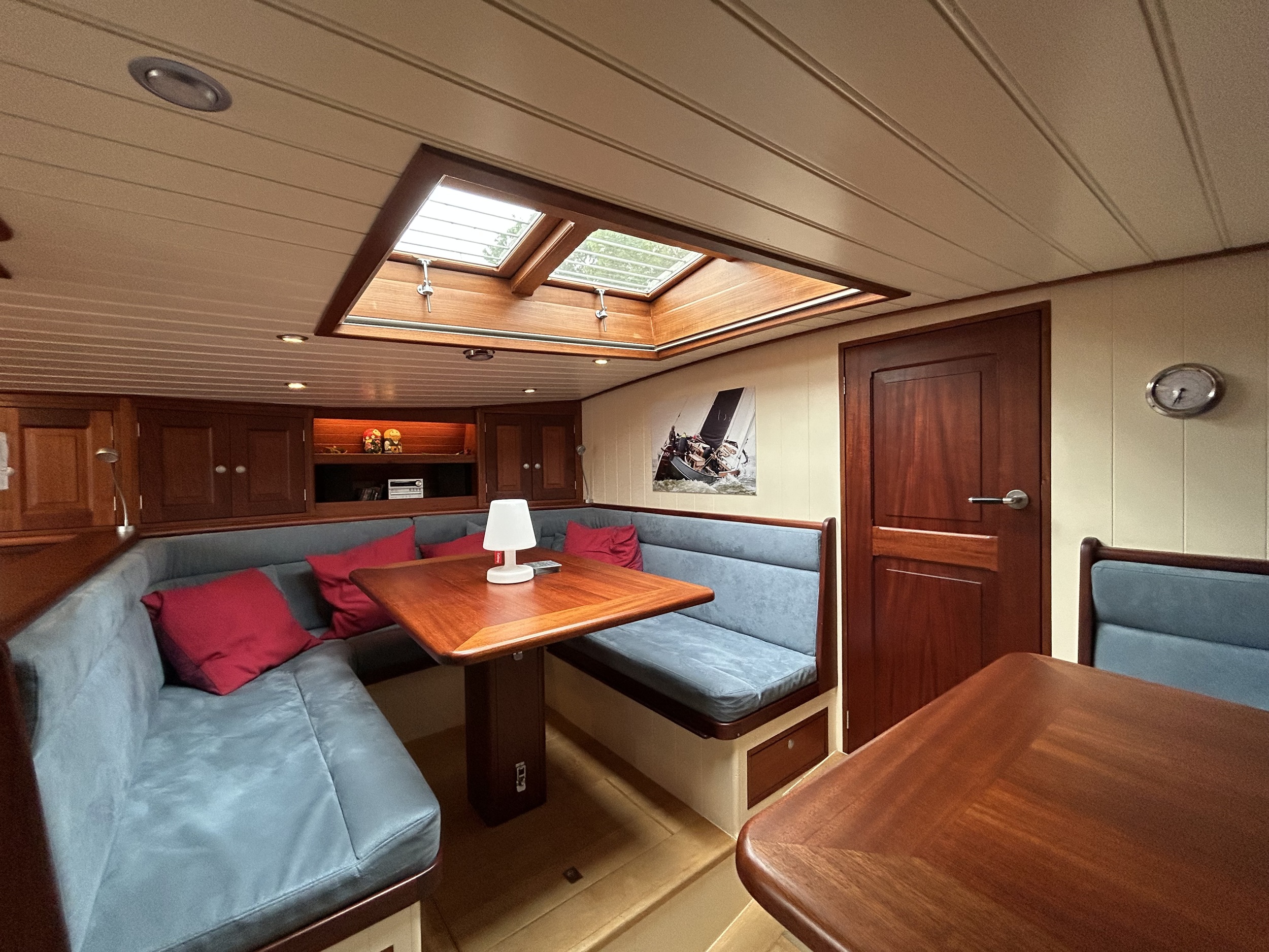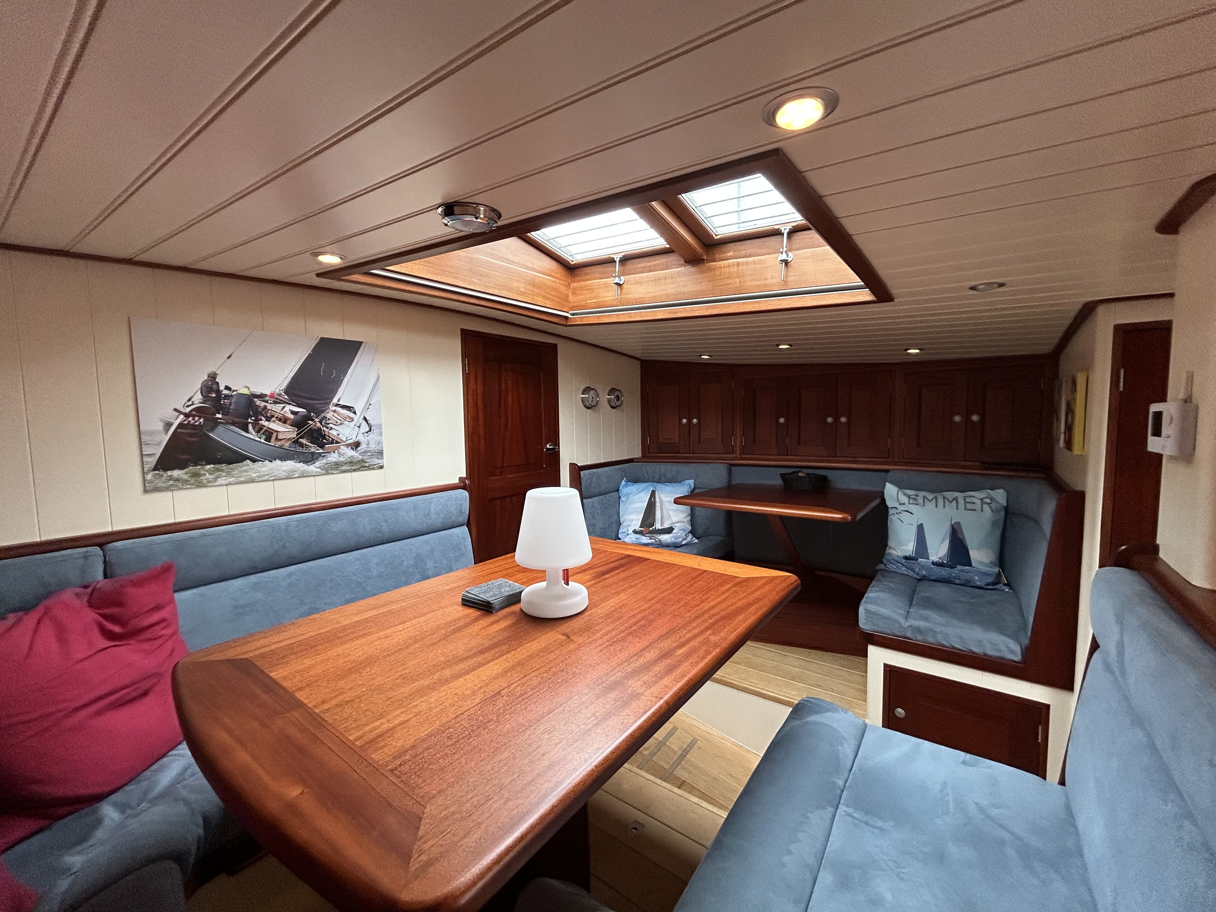 Prachtig betimmerd interieur met veel doordachte details. Het schip is geschikt voor ieder seizoen vanwege de isolatie en centrale verwarming.