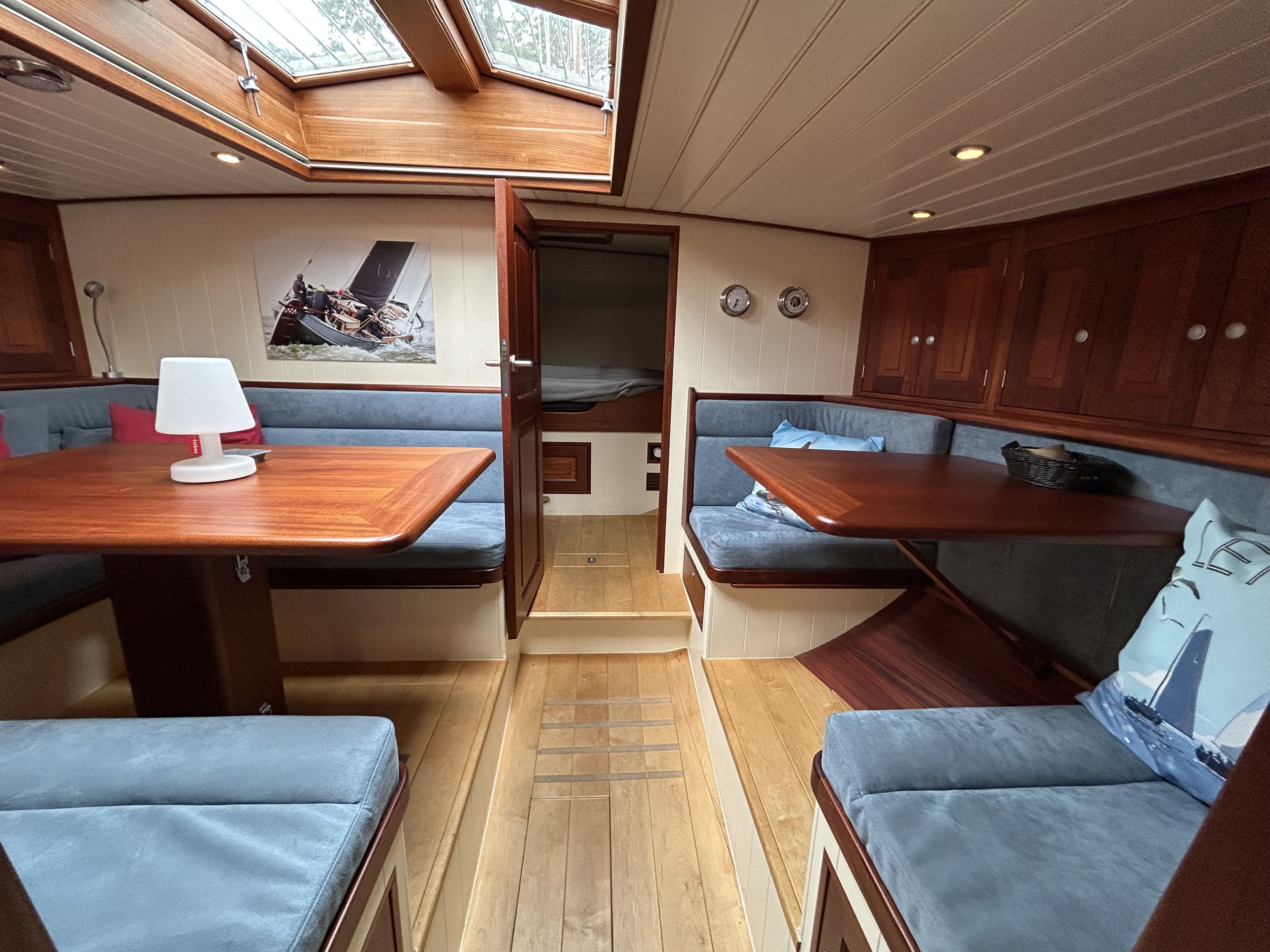 Het interieur is ondanks haar afmeting van nog geen 13 meter verrassend ruim en licht. Er zijn 6 ruime kooien en de eigenaarshut voelt aangenaam. Verder is er een douche en toilet. Het uitgekiende interieur heeft veel kastruimte en bijna overal stahoogte. De kombuis is voorzien van een inductie kookstel, er is dus geen gas aan boord. Binnen en buiten is de afwerking erg verzorgd. De boot is geschikt voor het gehele seizoen vanwege geschuimde isolatie, centrale verwarming met dieselgestookte ketel en radiators en de ramen zijn dubbel glas.