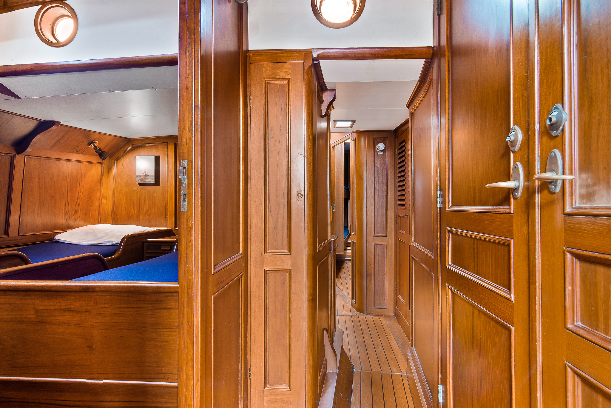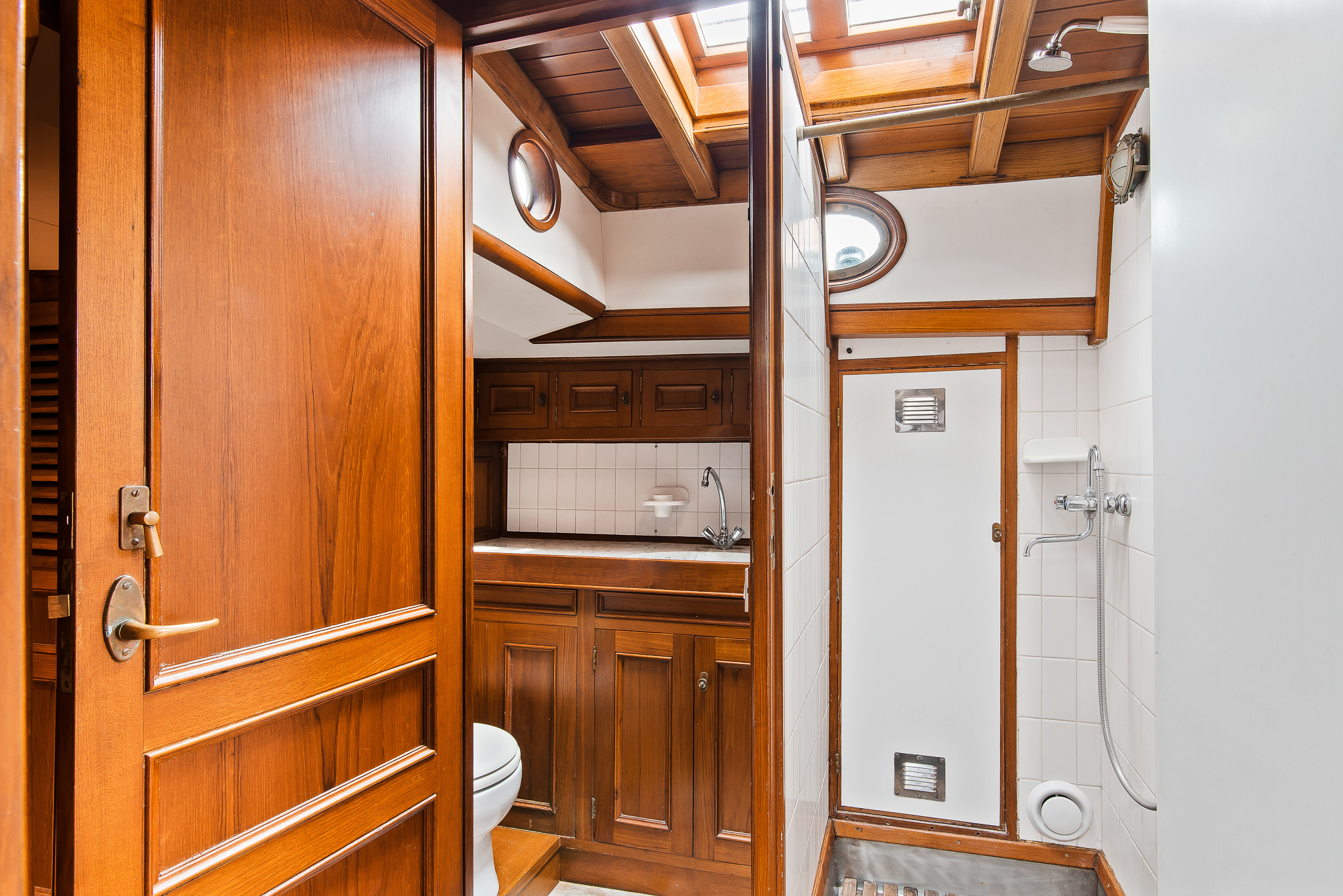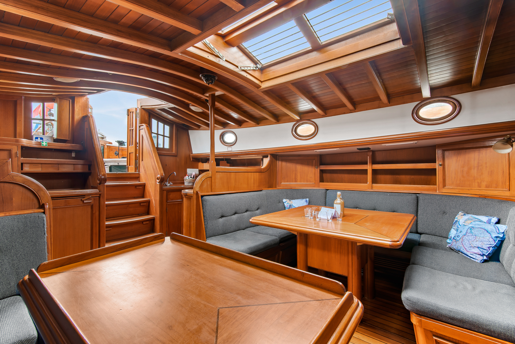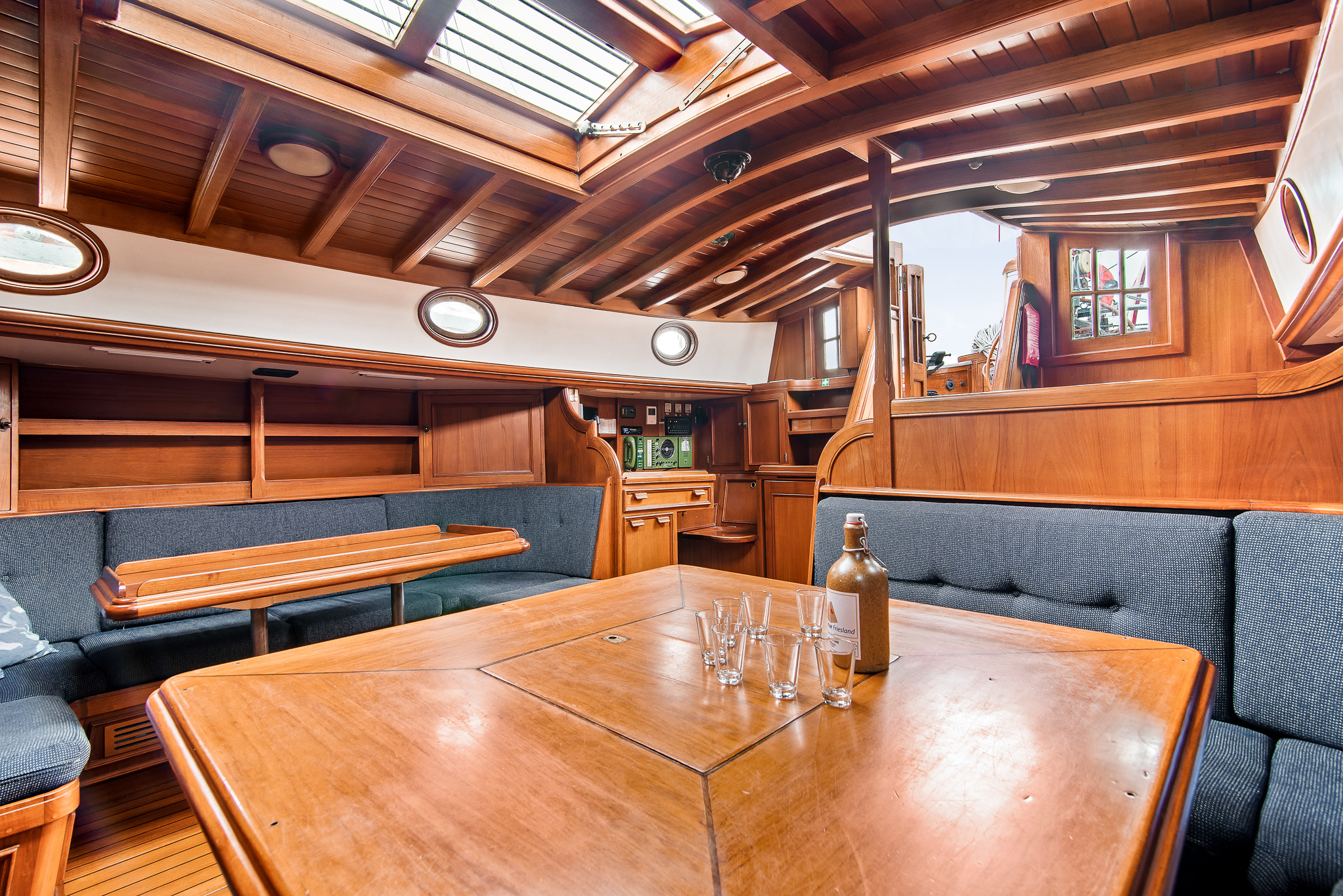 Zeer hoogwaardig teakhouten interieur. Door de Kabola diesel verwarmingsketel in combinatie met radiators is het schip geschikt voor ieder vaarseizoen.