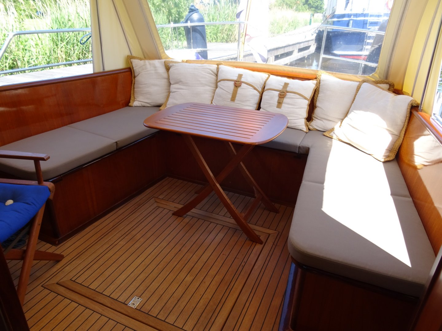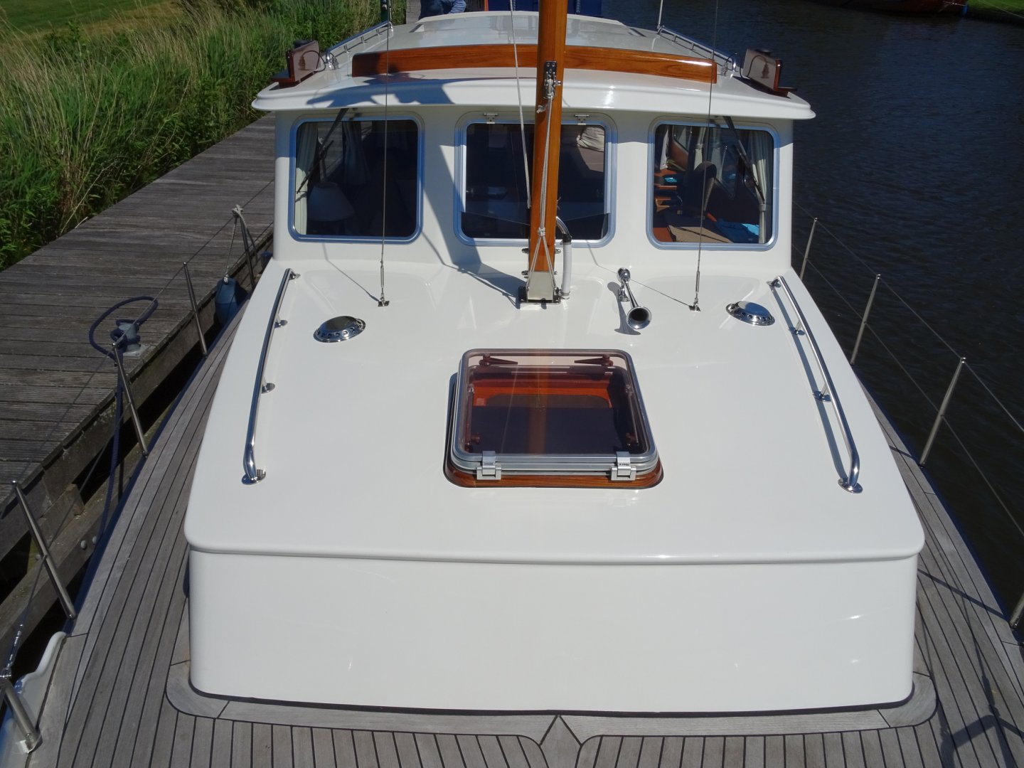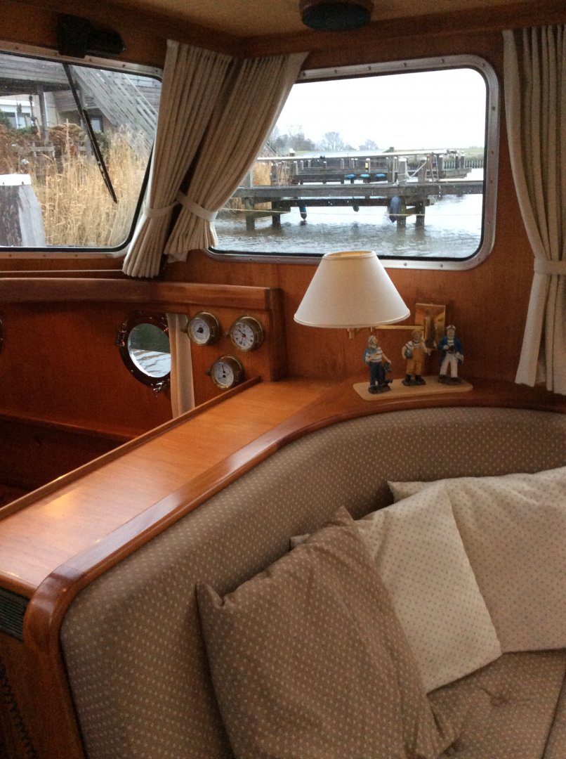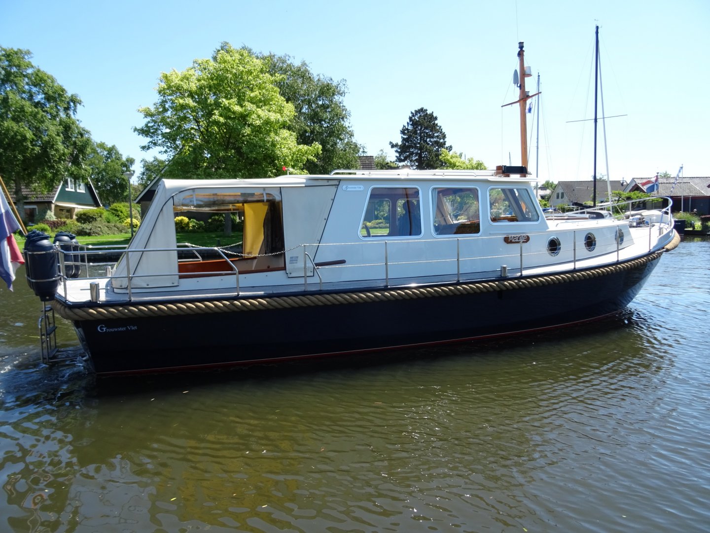 Uitermate goed onderhouden Grouwster Vlet met teakhouten interieur. Refit 2016: opnieuw gespoten in 2 componenten, houtwerk volledig kaal en opgebouwd in 2 componentenlak, lakwerk kuip, alle slangen vervangen (watersysteem, vuilwater, afvoeren), 3-wegkraan voor toilet ingebouwd, nieuw toilet, nieuwe grotere gasfles, nieuwe kuipkussens, nieuwe gordijnen, nieuwe horren, grote motorservice, rvs logo's, nieuwe rvs handgrepen op stuurhuis en kajuit. Laatste motorbeurt 2018. Startaccu vernieuwd in 2017. Massief essen/teakhouten vloer. Groot salonluik. De Grouwster Vlet staat bekend om de zeer goede vaareigenschappen.