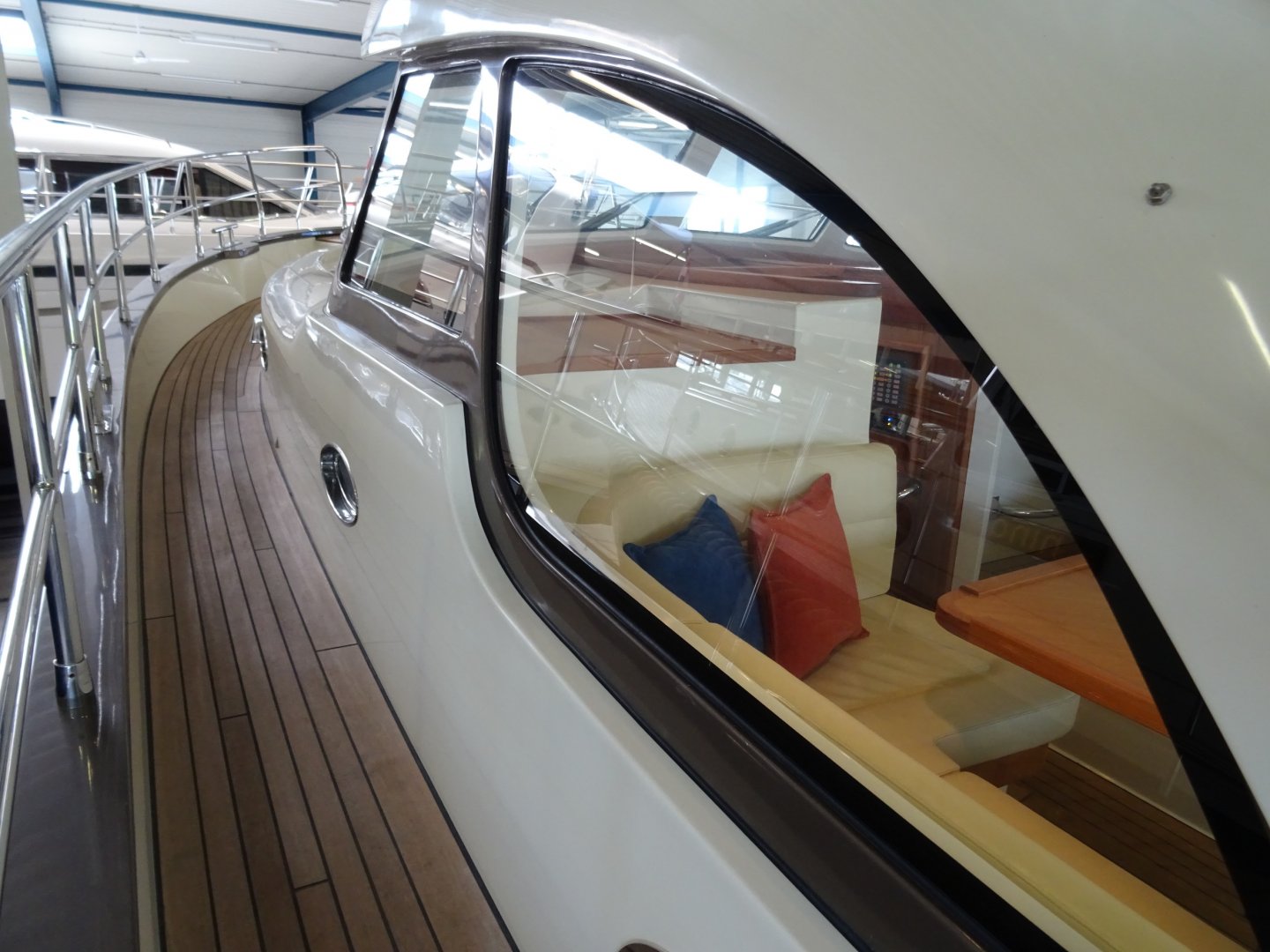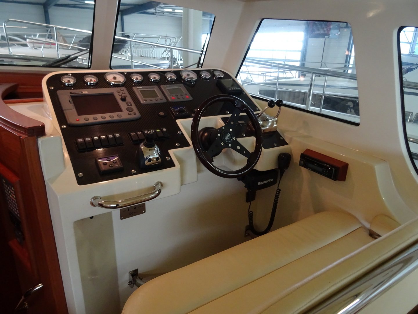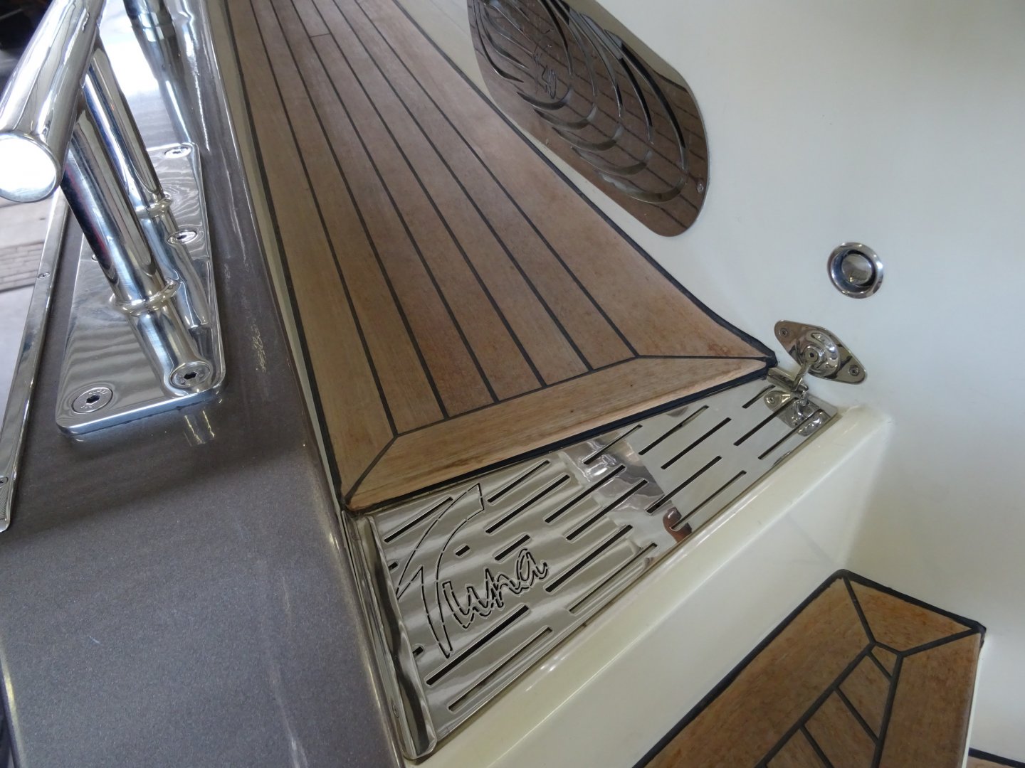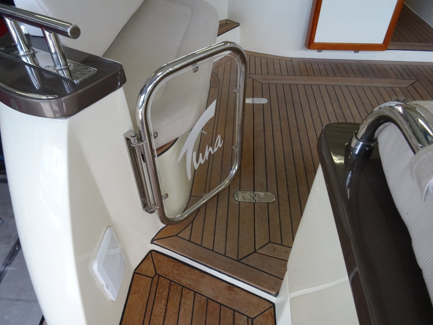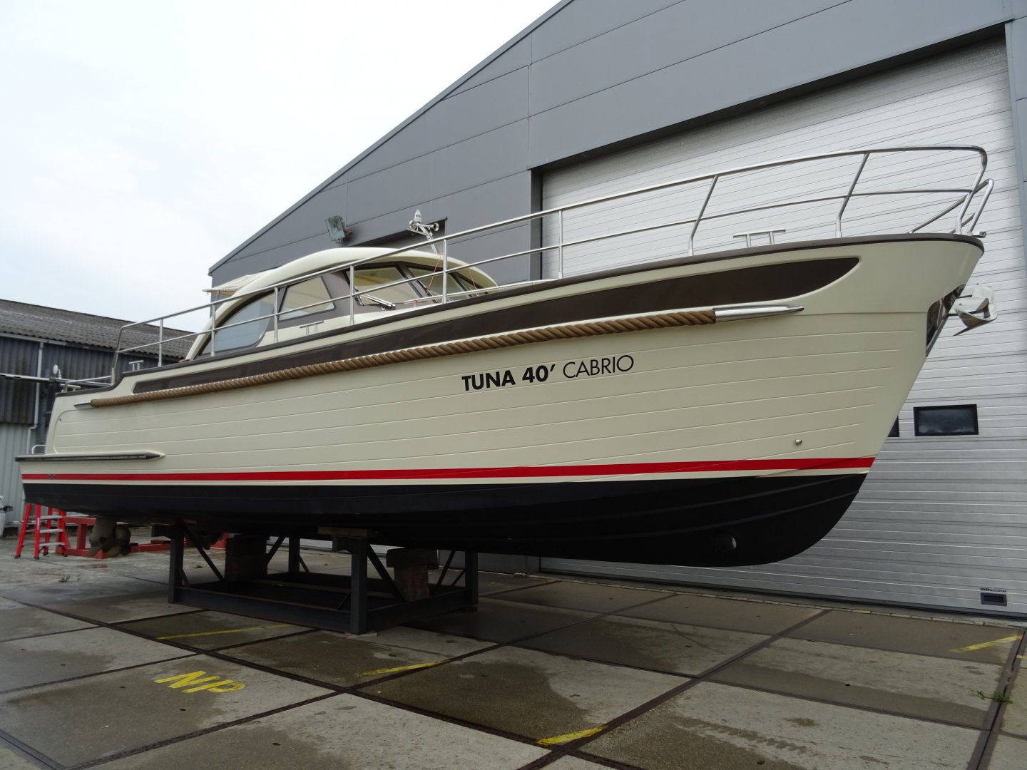Tuna 40 Cabrio. Full options. Demo model, prijs is exclusief BTW. De motoren hebben nog 0 uren en moeten nog door een officiele Volvo Dealer in bedrijf worden gesteld. Zeer luxe gebouwd en afgewerkt. Volvo IPS400 met joystick en elektrische motorbediening, teakhouten sierlijsten, royaal r.v.s. gebruik rondom, brede gangboorden met hoge zeereling, matellic striping, kabelaring, dubbelarmige r.v.s. ruitenwissers, lederen buitenbekleding, verstelbare stuurbank, verstelbaar stuurwiel, LED verlichting, tranenplaat in de machinekamer, massief teakdek rondom, dekwaspomp, kuipdouche, elektrisch bedienbare motorluiken, ruime motorkamer, Racorfilters met glazen kommen, teak betimmering met 6 vaste slaapplaaten, Corean werkbladen in keuken en natte cellen, ruime afsluitbare douche.