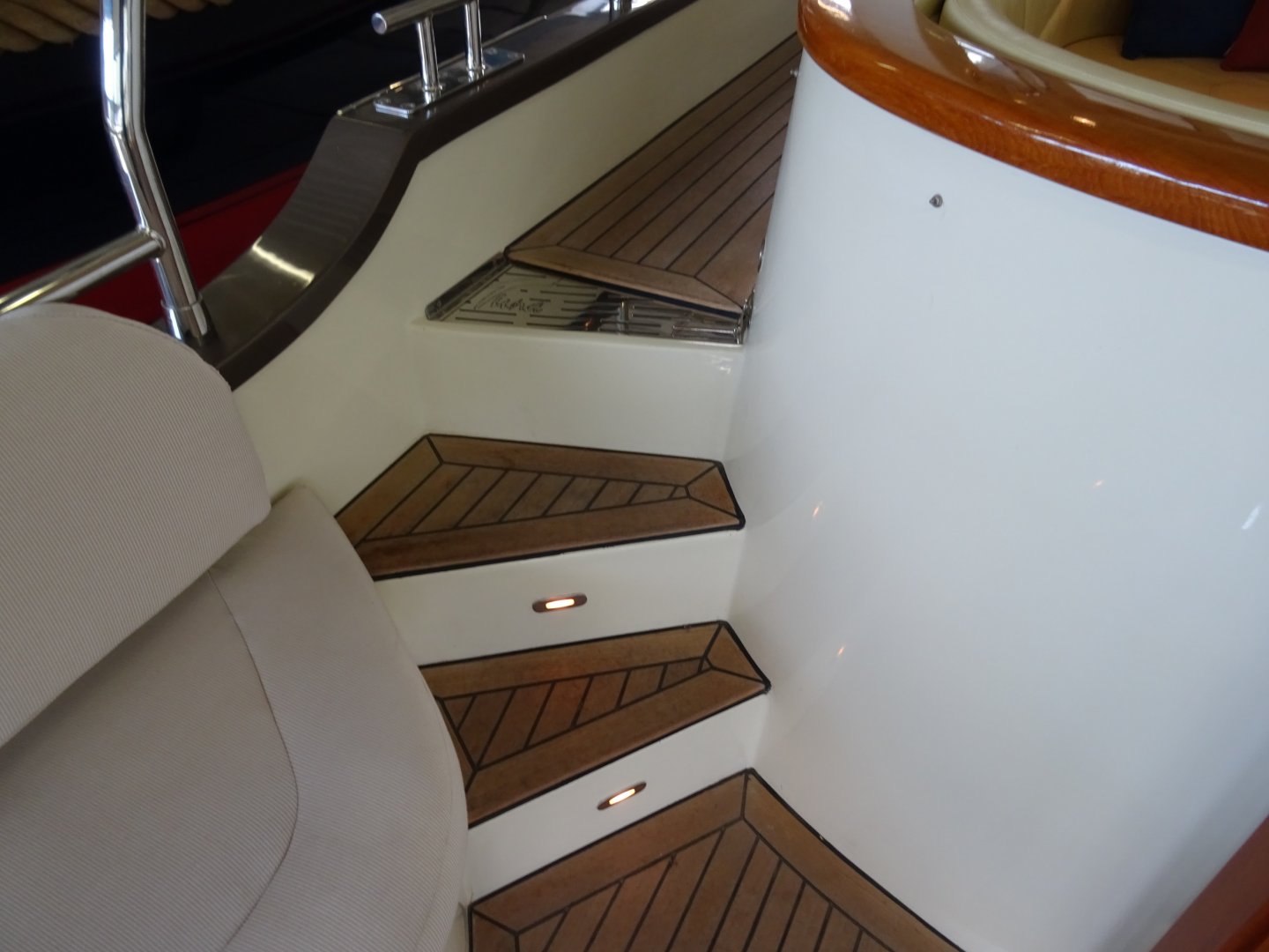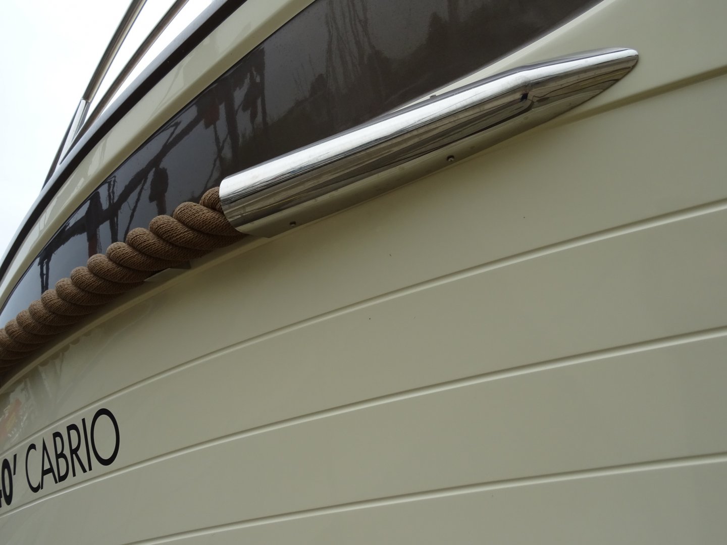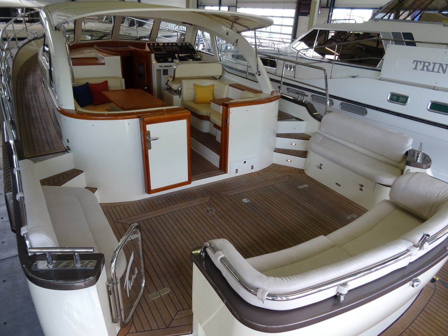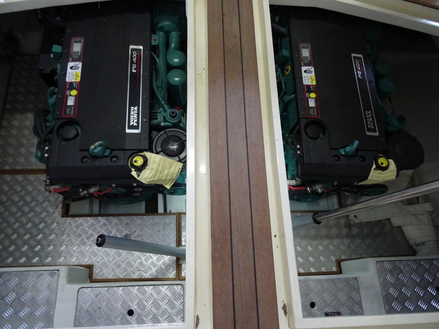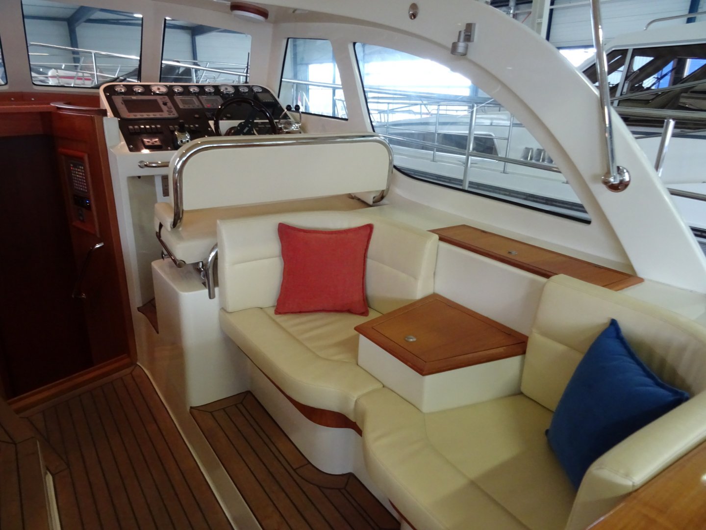 Tuna 40 Cabrio. Full options. Demo model, prijs is exclusief BTW. De motoren hebben nog 0 uren en moeten nog door een officiele Volvo Dealer in bedrijf worden gesteld. Zeer luxe gebouwd en afgewerkt. Volvo IPS400 met joystick en elektrische motorbediening, teakhouten sierlijsten, royaal r.v.s. gebruik rondom, brede gangboorden met hoge zeereling, matellic striping, kabelaring, dubbelarmige r.v.s. ruitenwissers, lederen buitenbekleding, verstelbare stuurbank, verstelbaar stuurwiel, LED verlichting, tranenplaat in de machinekamer, massief teakdek rondom, dekwaspomp, kuipdouche, elektrisch bedienbare motorluiken, ruime motorkamer, Racorfilters met glazen kommen, teak betimmering met 6 vaste slaapplaaten, Corean werkbladen in keuken en natte cellen, ruime afsluitbare douche.