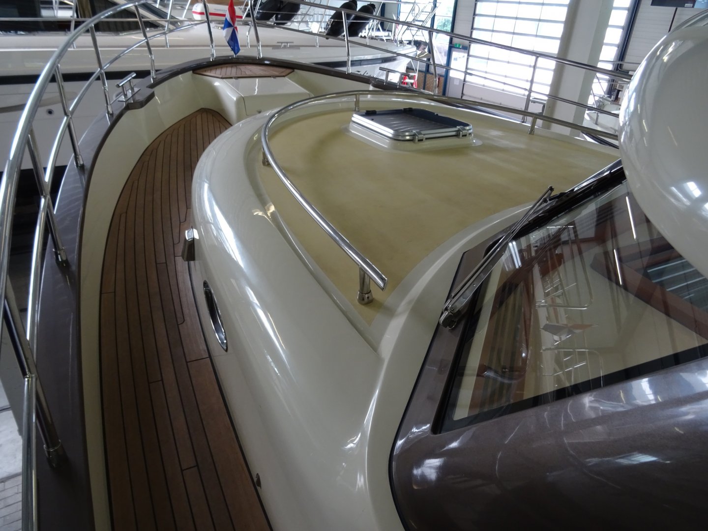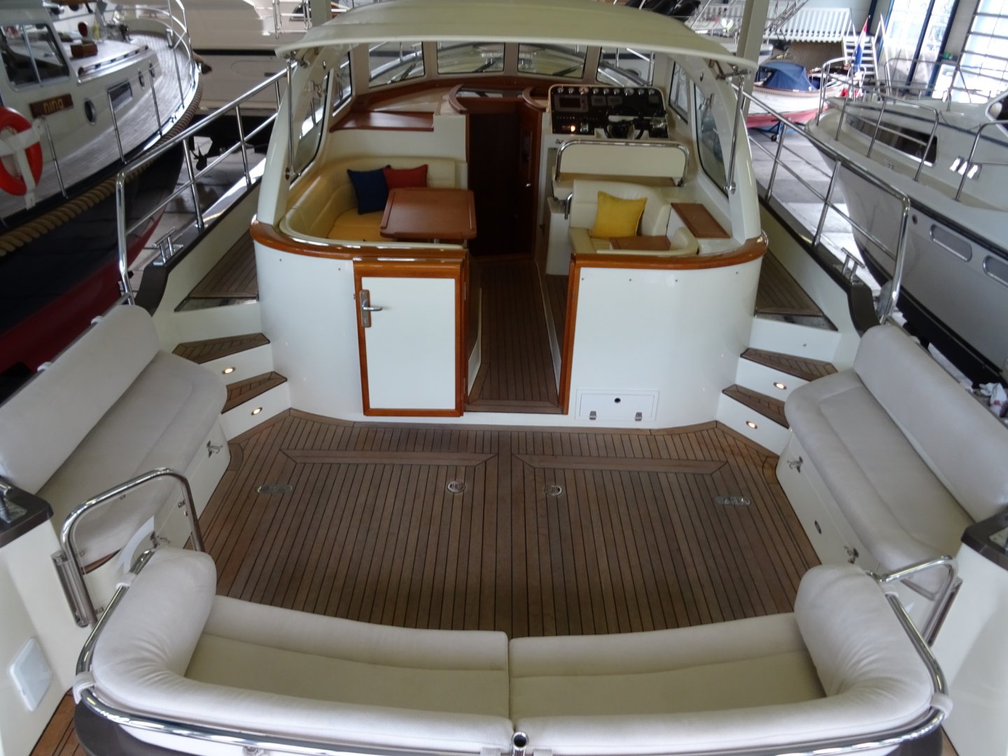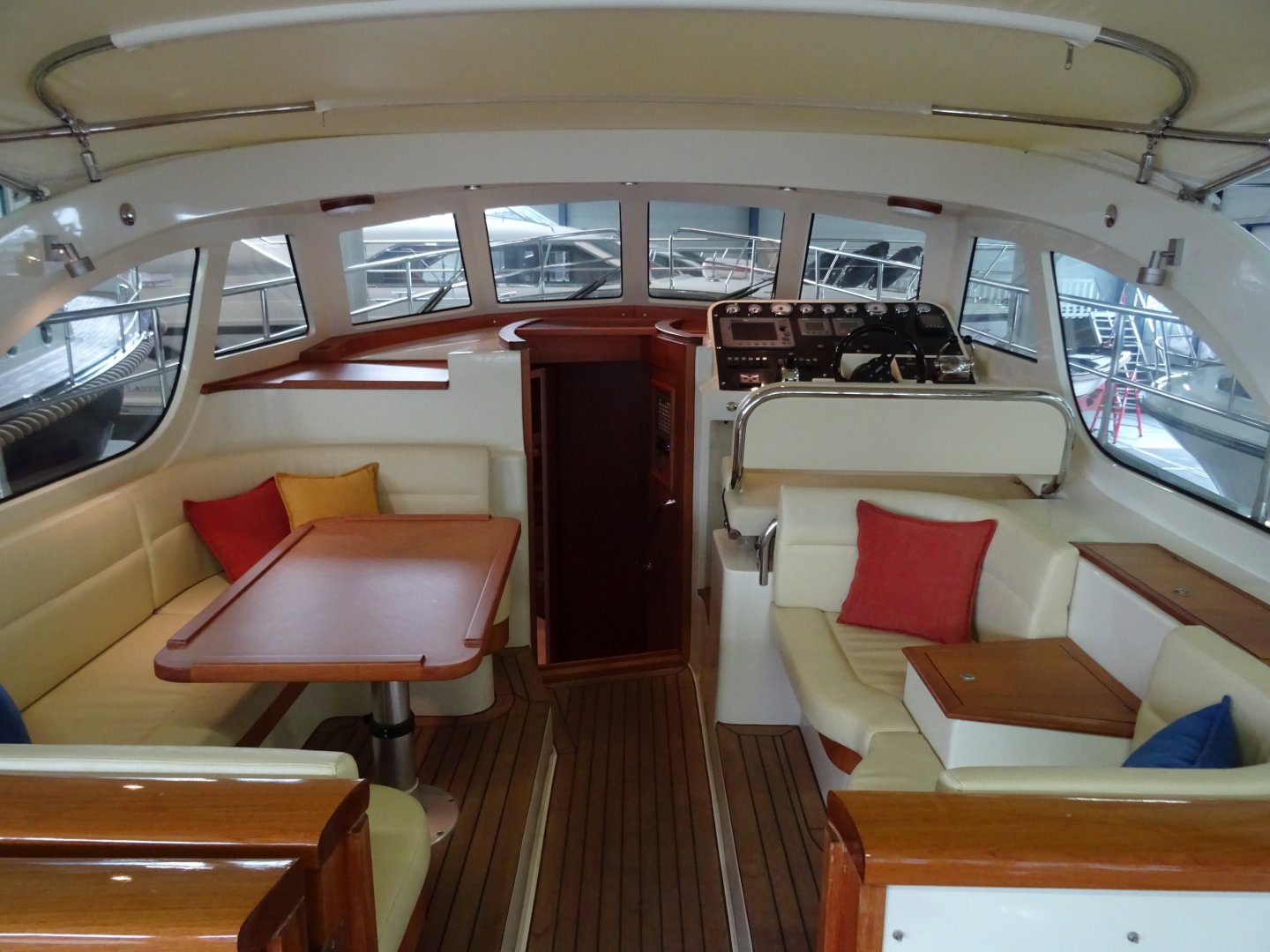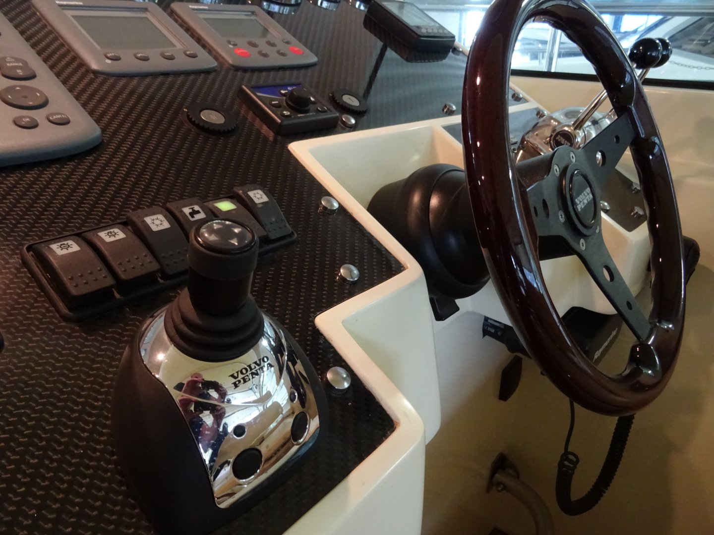 Tuna 40 Cabrio. Full options. Demo model, prijs is exclusief BTW. De motoren hebben nog 0 uren en moeten nog door een officiele Volvo Dealer in bedrijf worden gesteld. Zeer luxe gebouwd en afgewerkt. Volvo IPS400 met joystick en elektrische motorbediening, teakhouten sierlijsten, royaal r.v.s. gebruik rondom, brede gangboorden met hoge zeereling, matellic striping, kabelaring, dubbelarmige r.v.s. ruitenwissers, lederen buitenbekleding, verstelbare stuurbank, verstelbaar stuurwiel, LED verlichting, tranenplaat in de machinekamer, massief teakdek rondom, dekwaspomp, kuipdouche, elektrisch bedienbare motorluiken, ruime motorkamer, Racorfilters met glazen kommen, teak betimmering met 6 vaste slaapplaaten, Corean werkbladen in keuken en natte cellen, ruime afsluitbare douche.