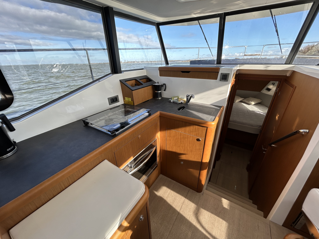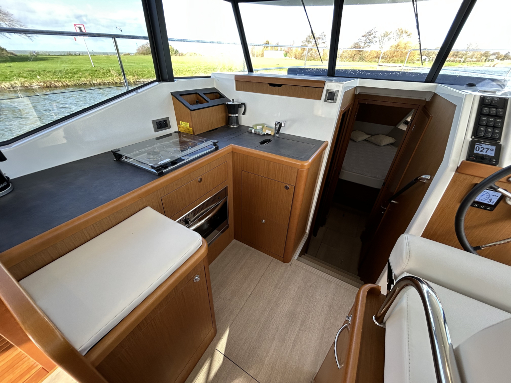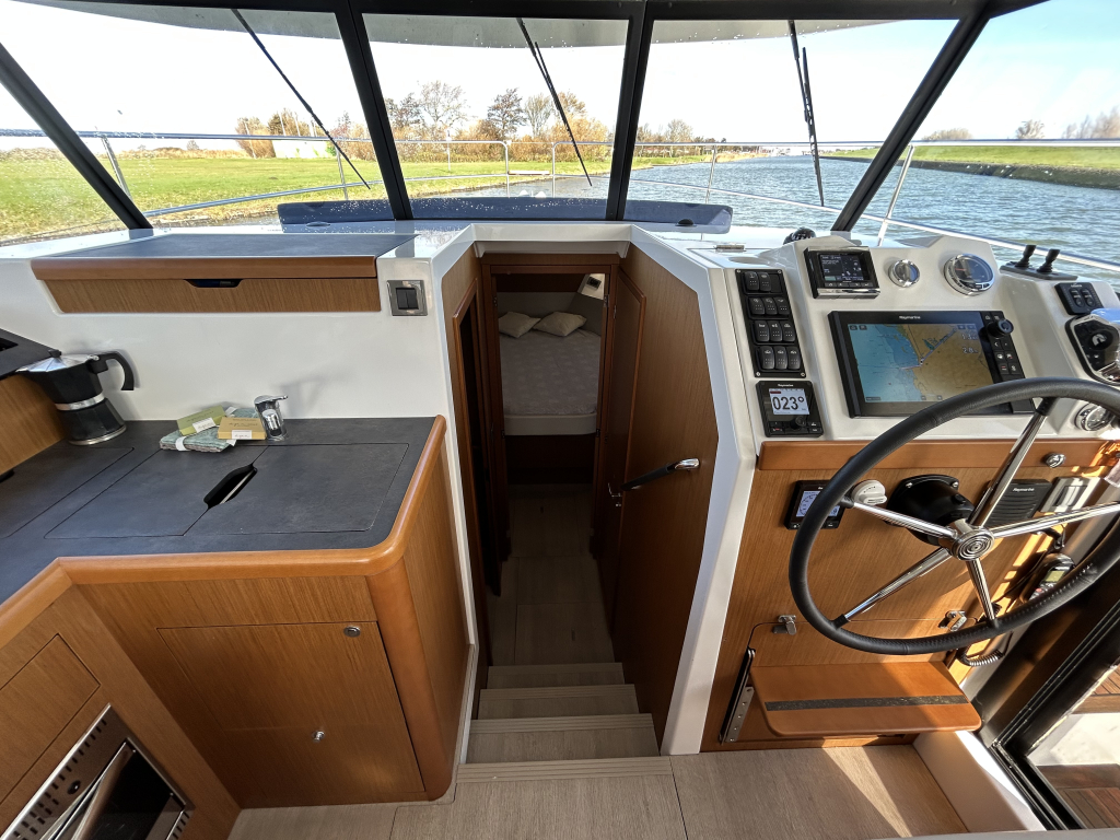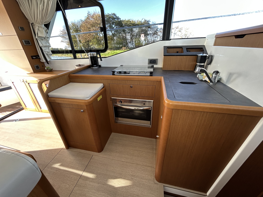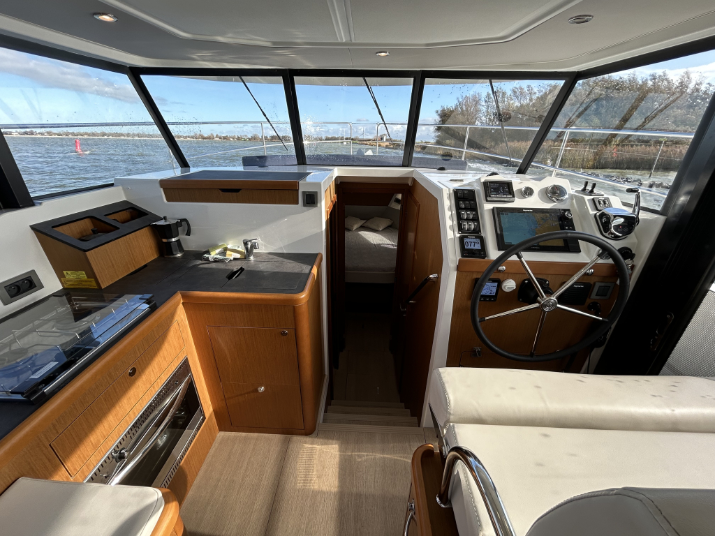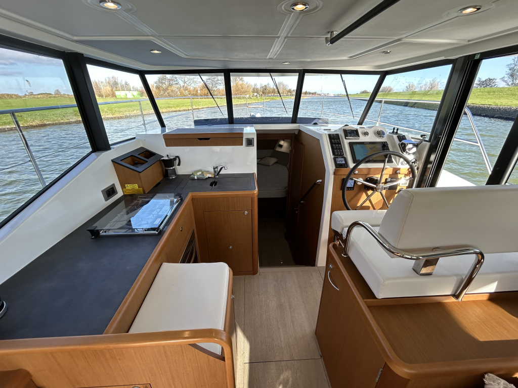 Ruim, licht en slim ontworpen interieur. Binnen in de salon valt direct het open en lichte karakter op, dankzij de grote panoramische ramen. Het interieur is uitgevoerd met warme houtaccenten en praktische opbergruimte, gecombineerd met een modern design.Gezellige salon met bank (om te bouwen tot extra bed). Volledig uitgeruste keuken met koelkast, oven, fornuis en spoelbak. Ruime master cabin met eilandbed en veel kastruimte. Tweede cabine met stapelbed – ideaal voor gasten of kinderen. Natte cel met elektrisch toilet en aparte douche. Grote schuifdeuren naar het achterdek naadloze overgang tussen binnen en buiten. Flybridge: comfort op het hoogste niveau. De flybridge is een van de paradepaardjes van deze Swift Trawler. Deze biedt niet alleen een tweede stuurstand met uitstekend zicht rondom, maar ook een royale zitbank, tafel en ruimte om te genieten van de zon en frisse lucht. Dankzij de slimme indeling blijft dit een volwaardig leefdek, zelfs tijdens het varen.