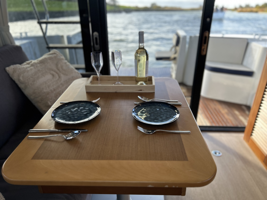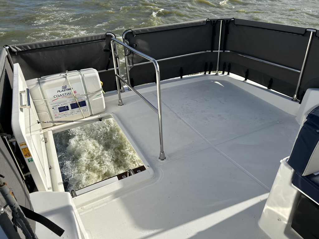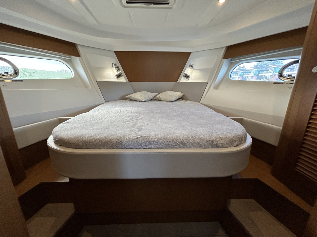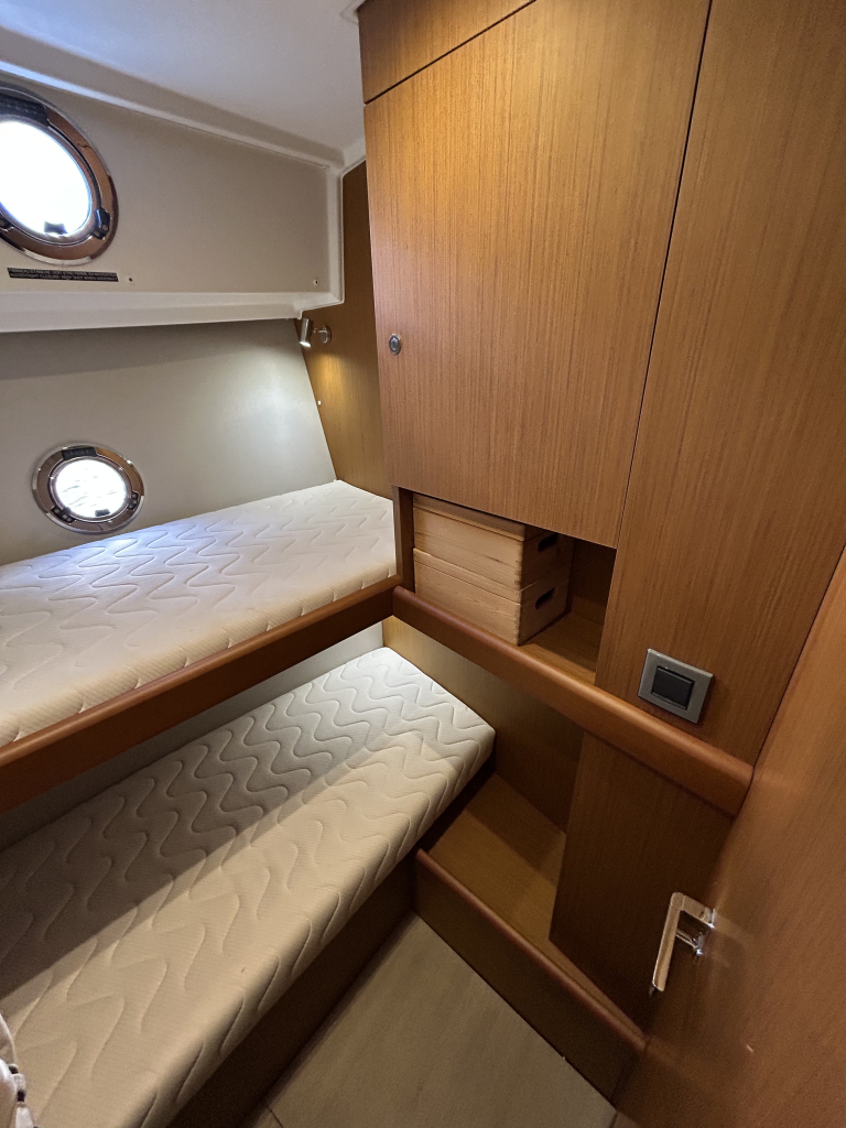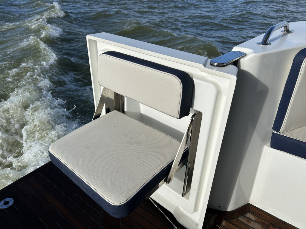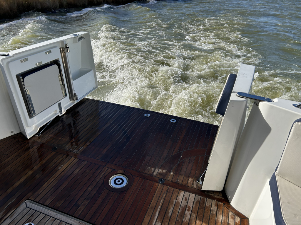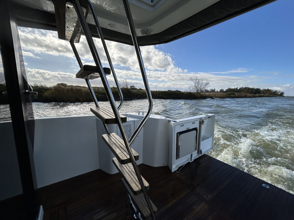 Ruim, licht en slim ontworpen interieur. Binnen in de salon valt direct het open en lichte karakter op, dankzij de grote panoramische ramen. Het interieur is uitgevoerd met warme houtaccenten en praktische opbergruimte, gecombineerd met een modern design.Gezellige salon met bank (om te bouwen tot extra bed). Volledig uitgeruste keuken met koelkast, oven, fornuis en spoelbak. Ruime master cabin met eilandbed en veel kastruimte. Tweede cabine met stapelbed – ideaal voor gasten of kinderen. Natte cel met elektrisch toilet en aparte douche. Grote schuifdeuren naar het achterdek naadloze overgang tussen binnen en buiten. Flybridge: comfort op het hoogste niveau. De flybridge is een van de paradepaardjes van deze Swift Trawler. Deze biedt niet alleen een tweede stuurstand met uitstekend zicht rondom, maar ook een royale zitbank, tafel en ruimte om te genieten van de zon en frisse lucht. Dankzij de slimme indeling blijft dit een volwaardig leefdek, zelfs tijdens het varen.