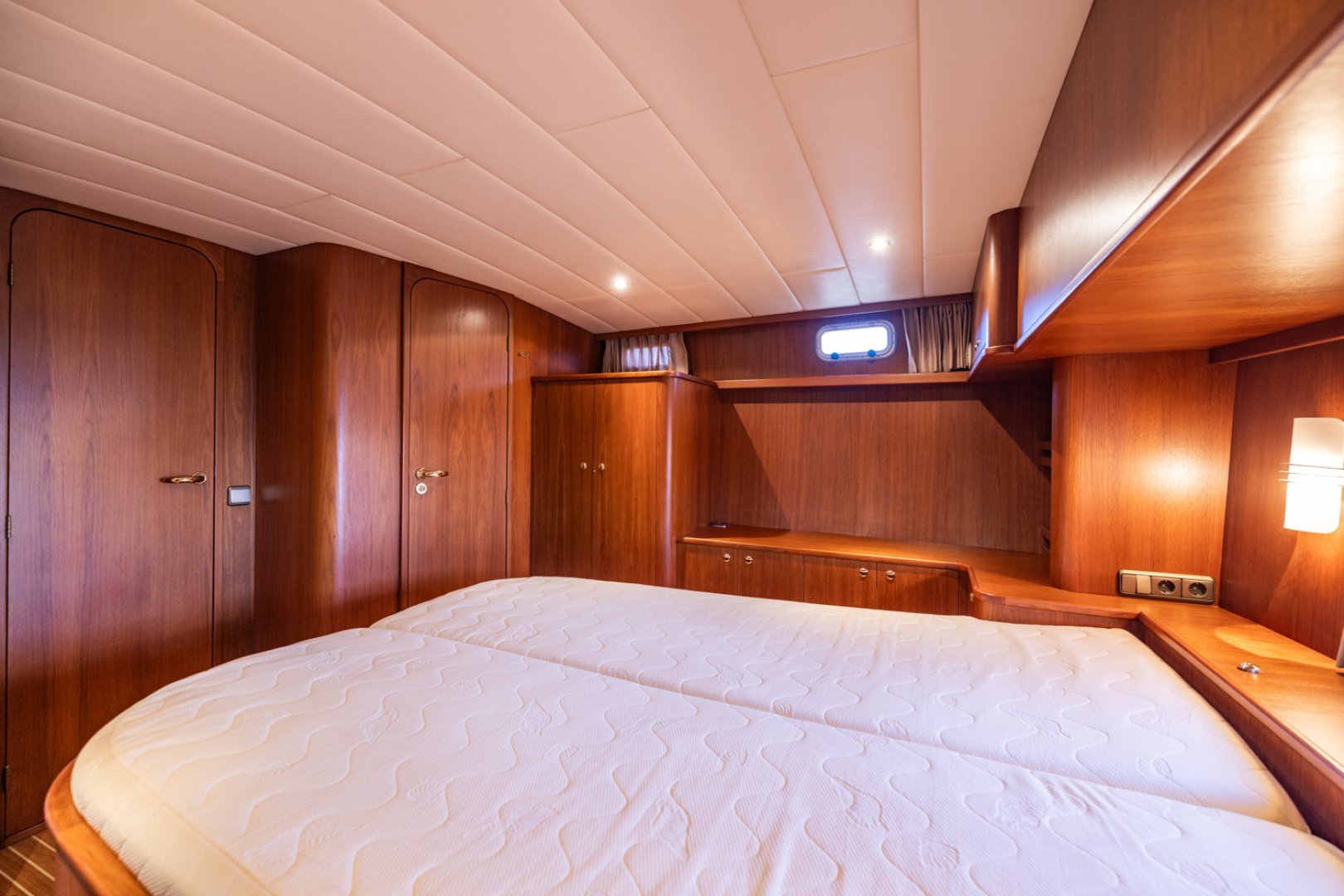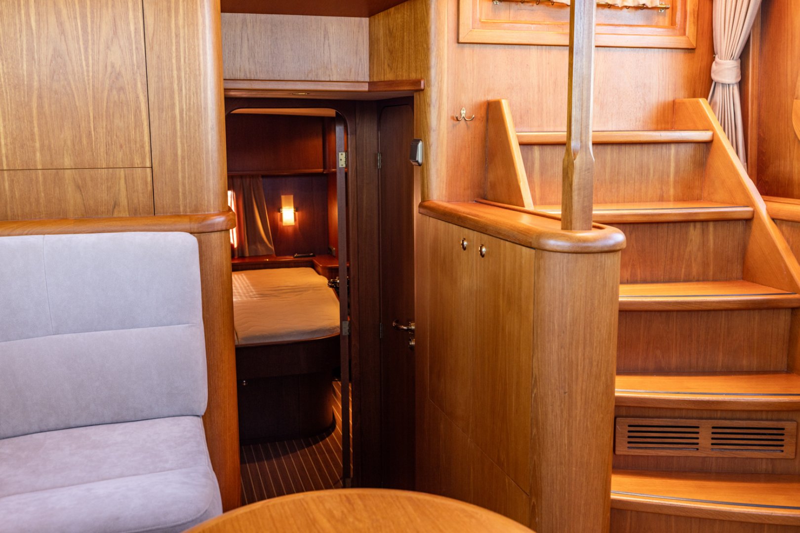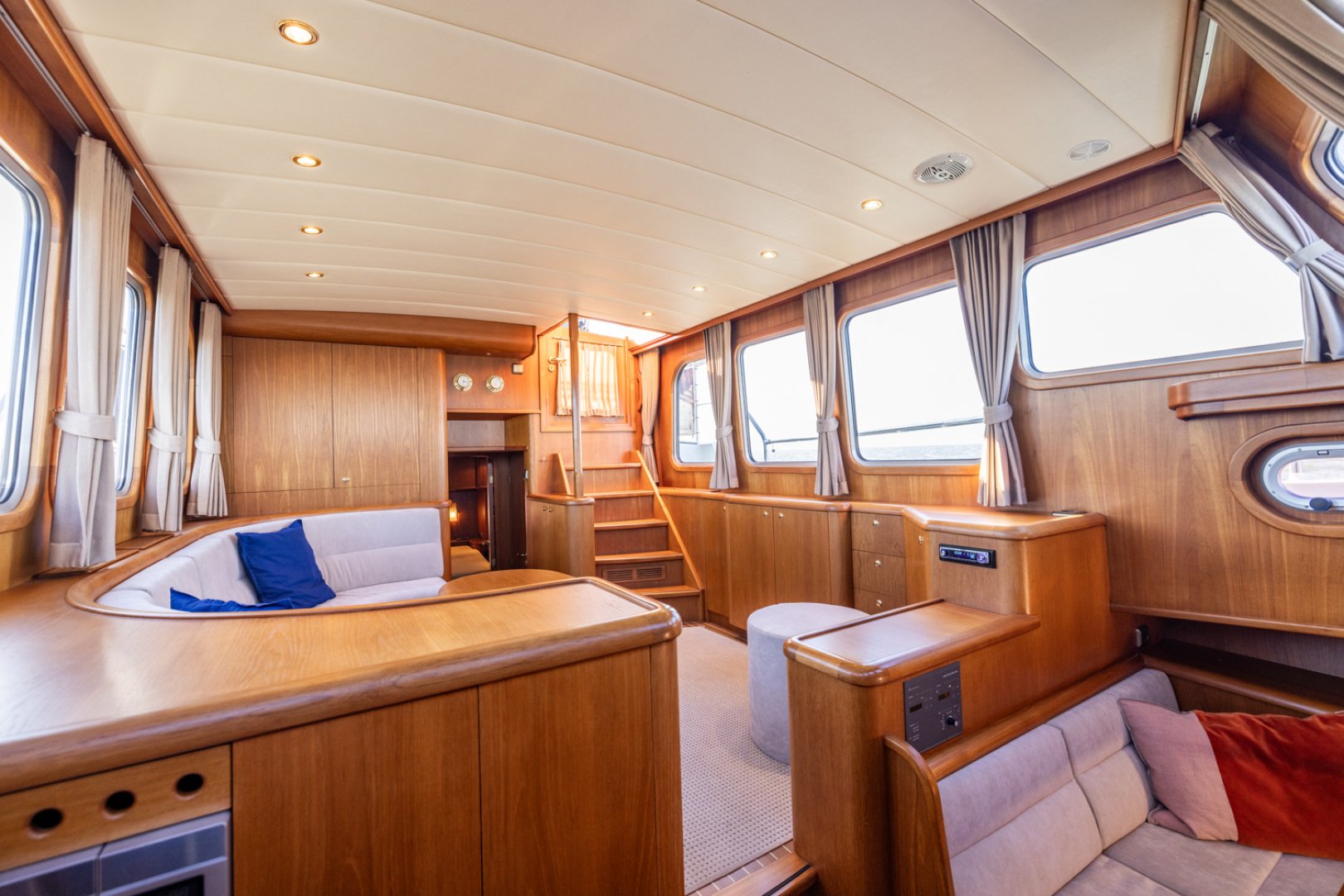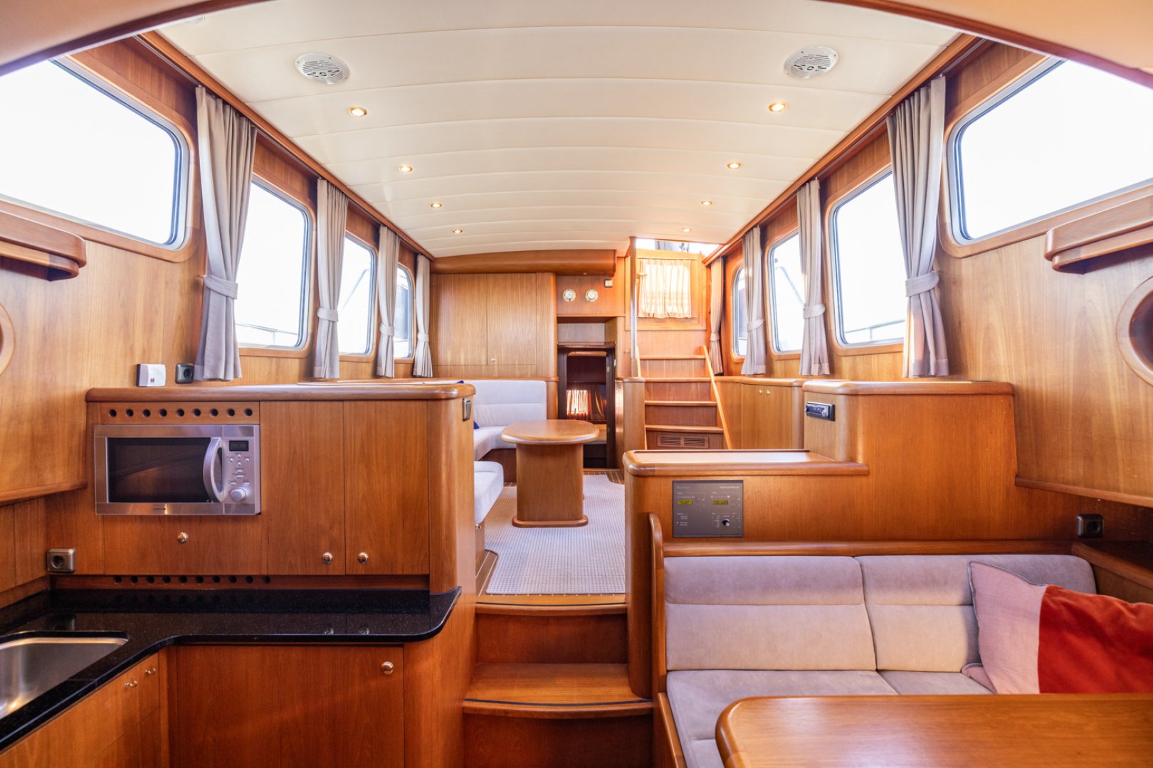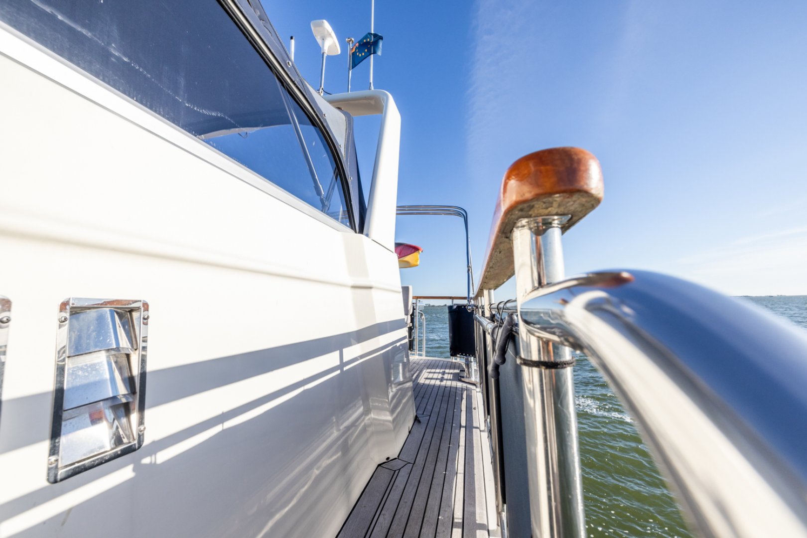 Het jacht is goed onderhouden en er zijn veel vernieuwingen aangebracht de laatste jaren. Aan de buitenzijde en het interieur ziet u veel fraaie details. Een teakhouten interieur met luxe lijstwerk en graniet bladen in keuken en natte cellen.