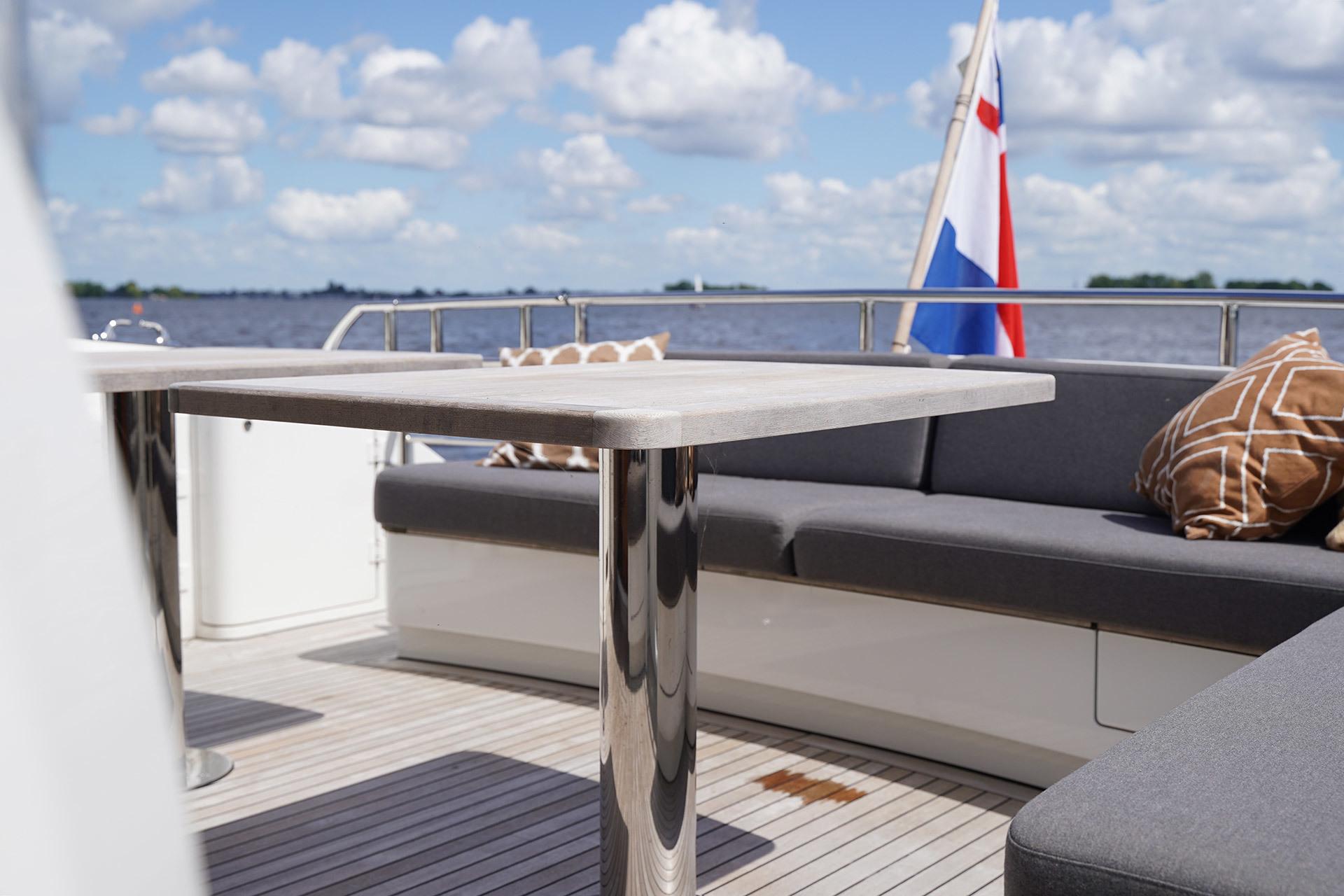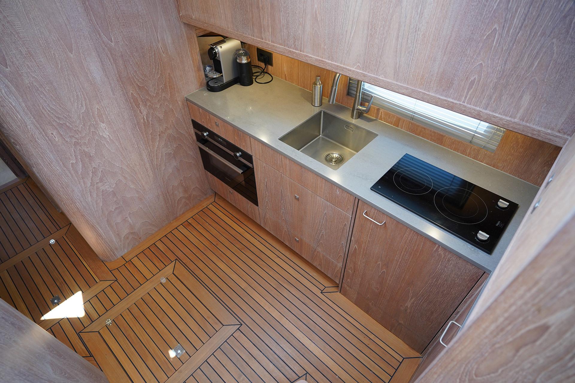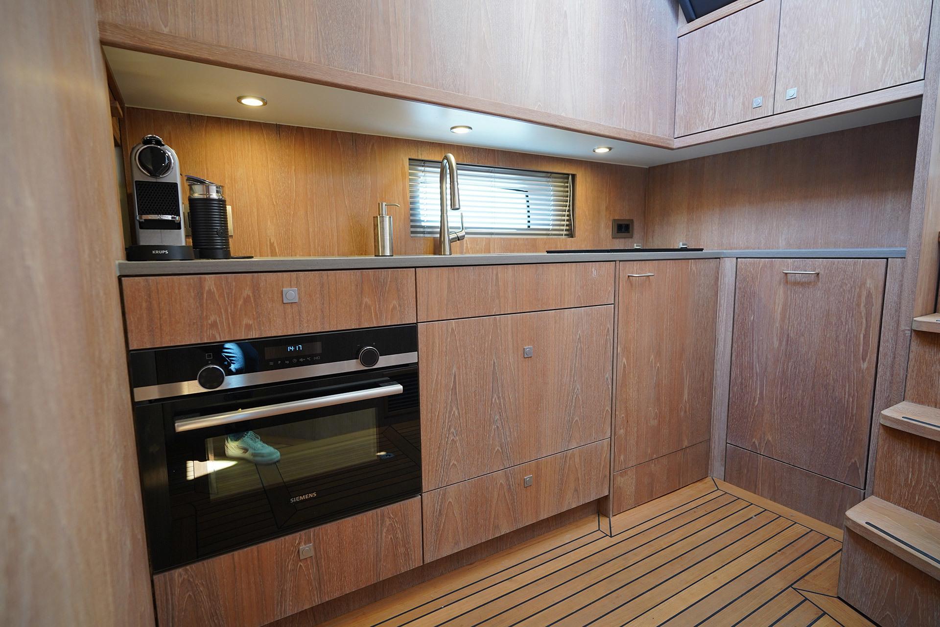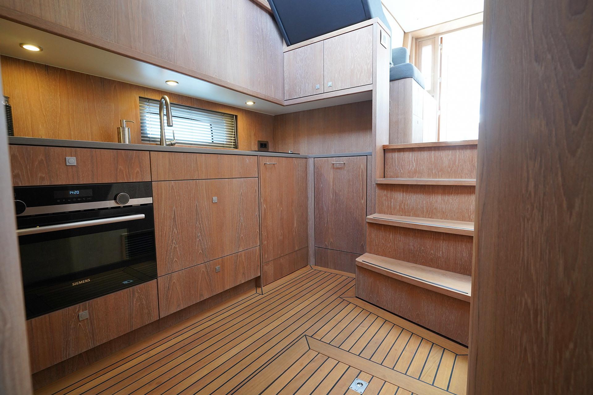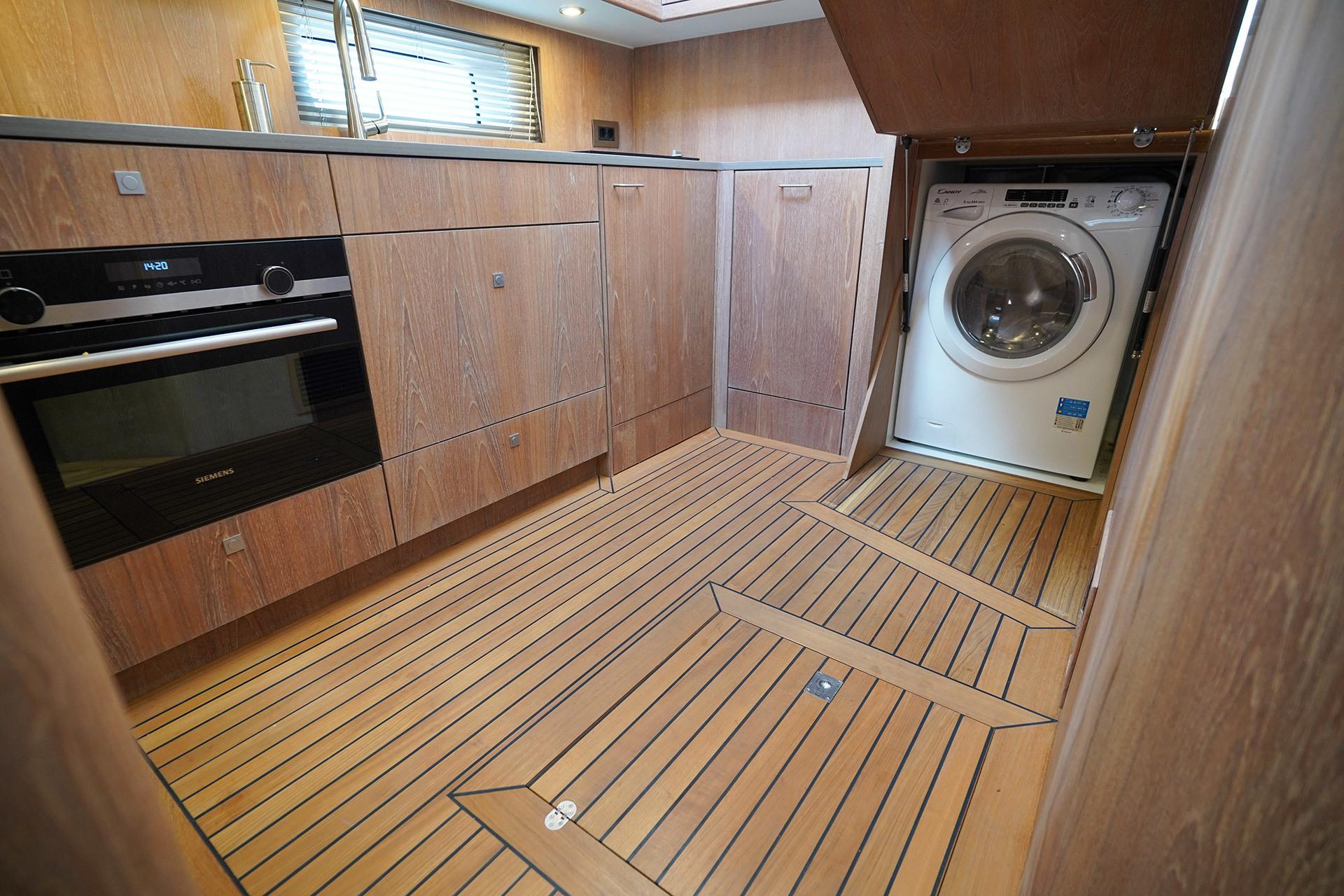 Heerlijk comfortabel teakhouten interieur. Voorzien van vloerverwarming met massief teakhouten vloerdelen. In de keuken is een wasmachine (Candy 8 kg) een vaatwasser (Siemens) en Corean werkbladen. Dit is echt een jacht voor alle seizoenen door de perfecte isolatie en dubbel glas. Het salonluik kan elektrisch geopend worden.