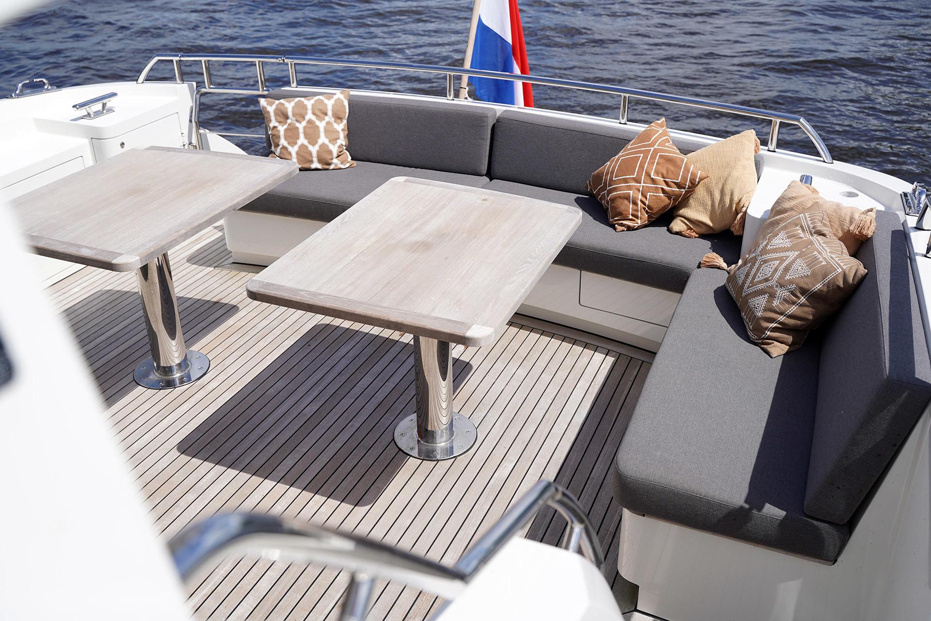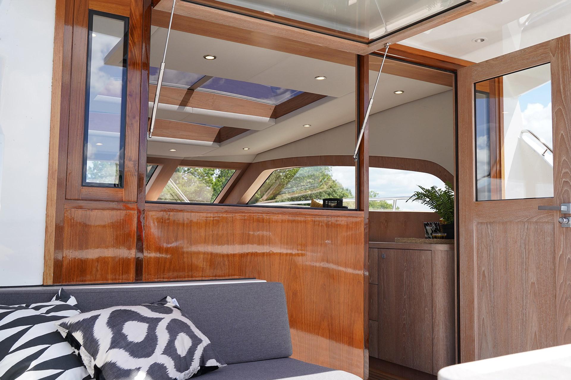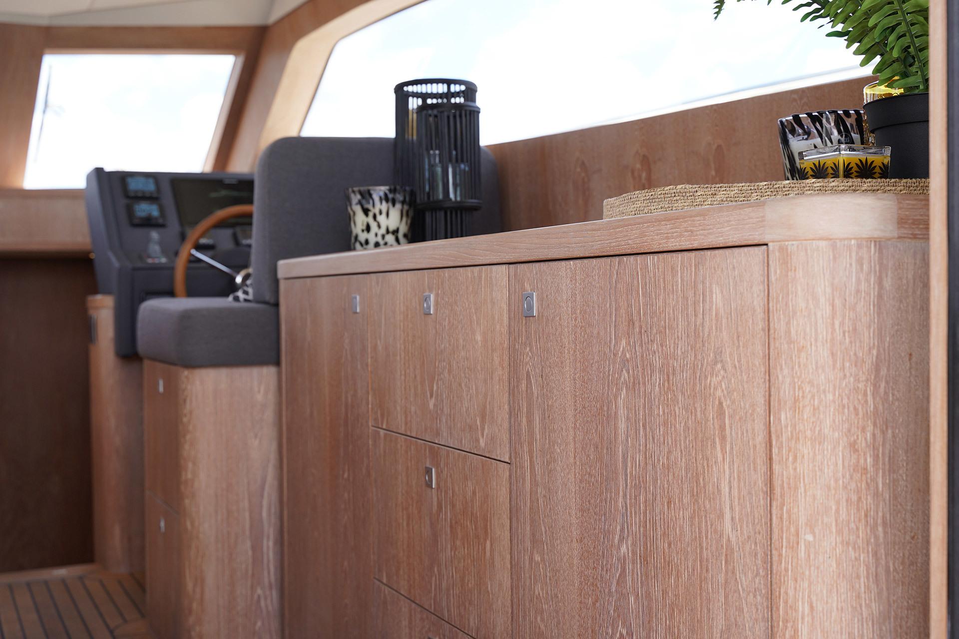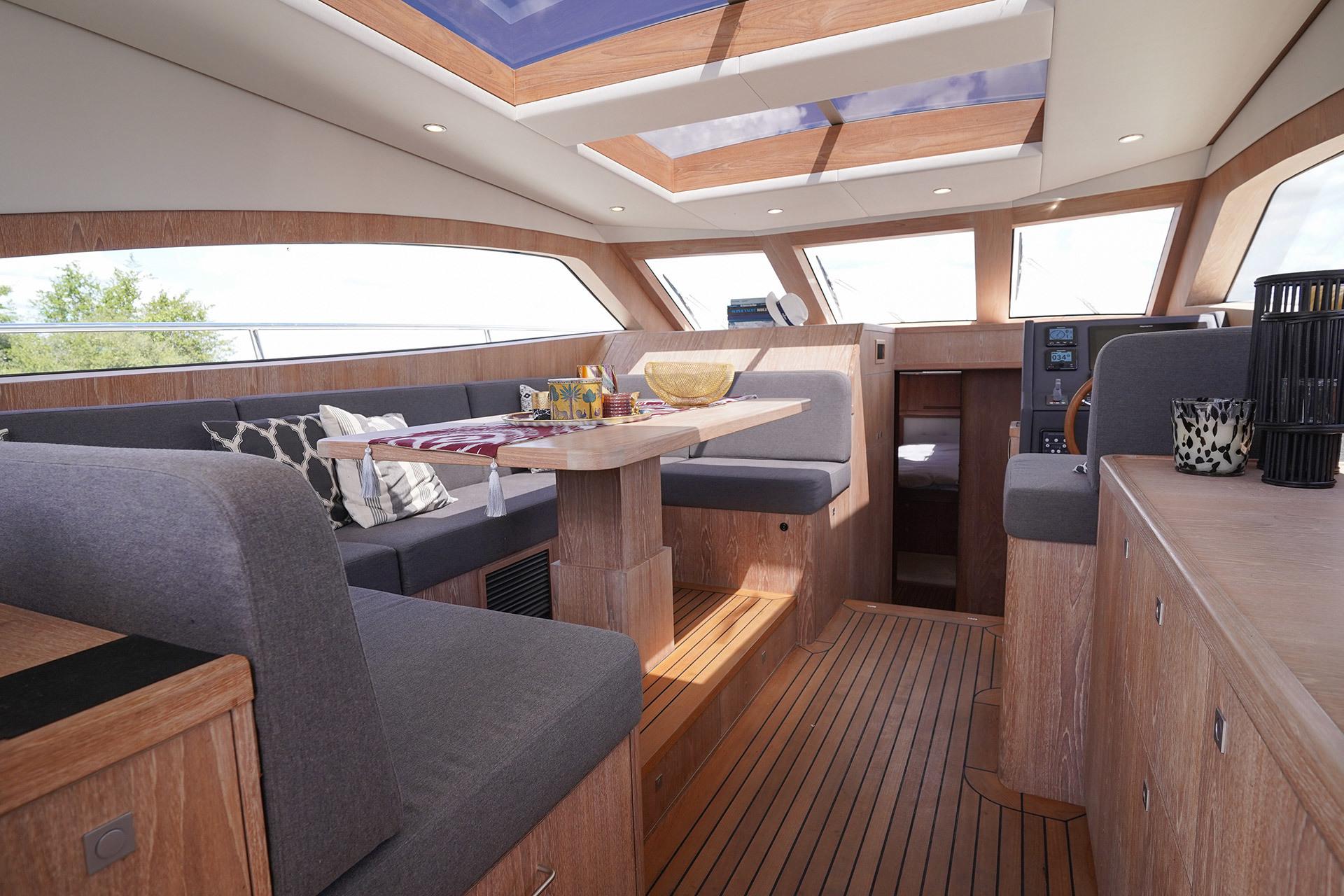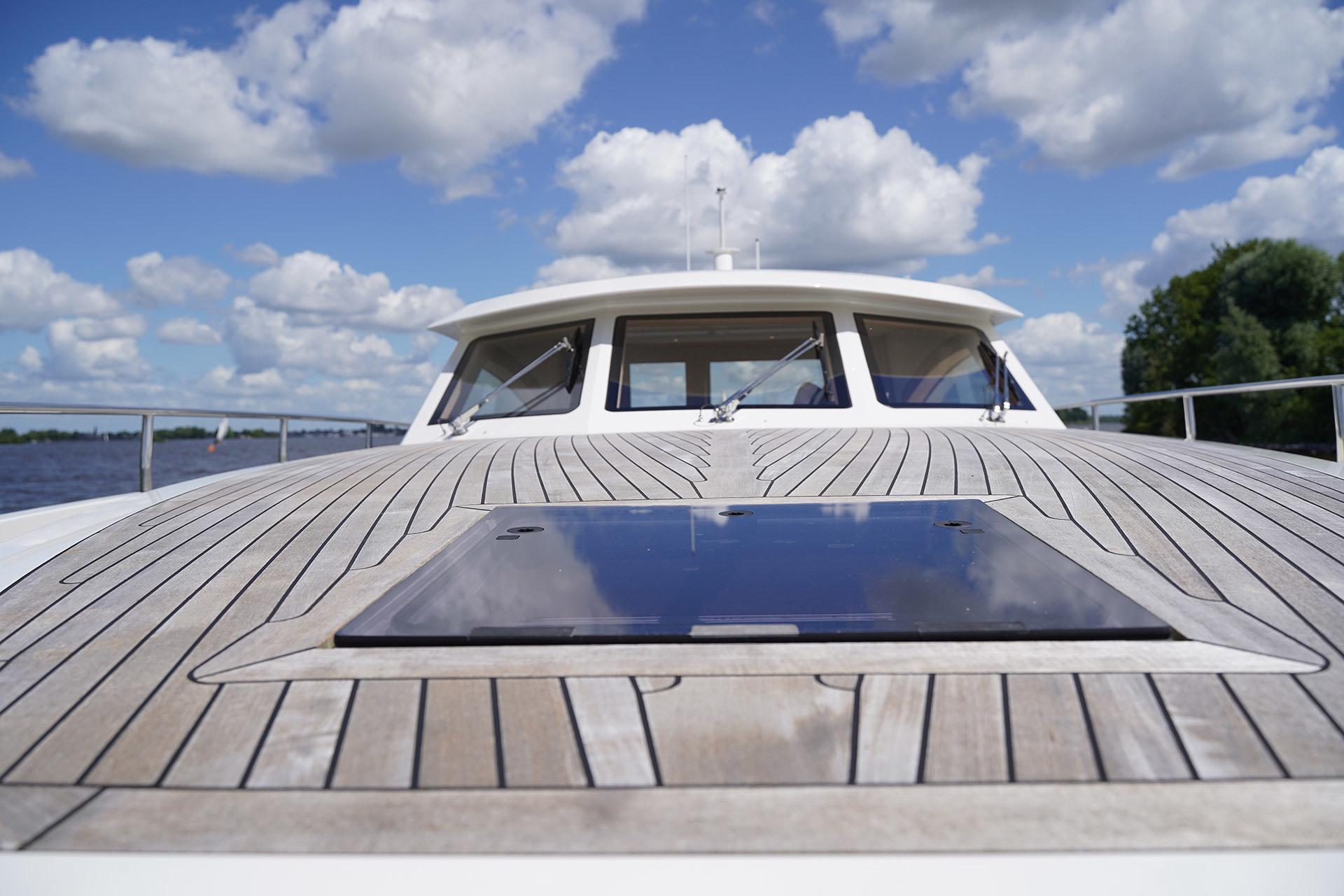 Heerlijk comfortabel teakhouten interieur. Voorzien van vloerverwarming met massief teakhouten vloerdelen. In de keuken is een wasmachine (Candy 8 kg) een vaatwasser (Siemens) en Corean werkbladen. Dit is echt een jacht voor alle seizoenen door de perfecte isolatie en dubbel glas. Het salonluik kan elektrisch geopend worden.