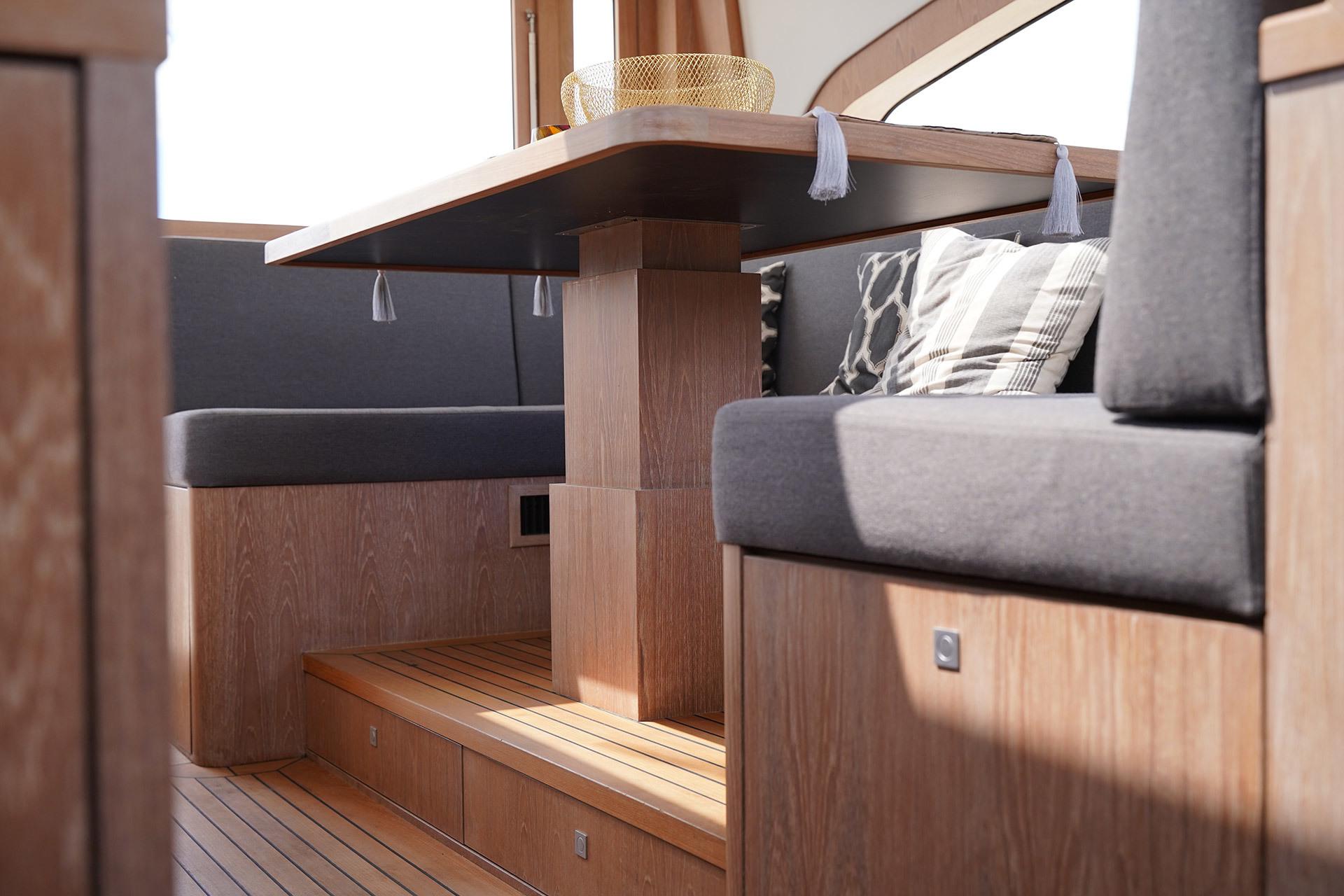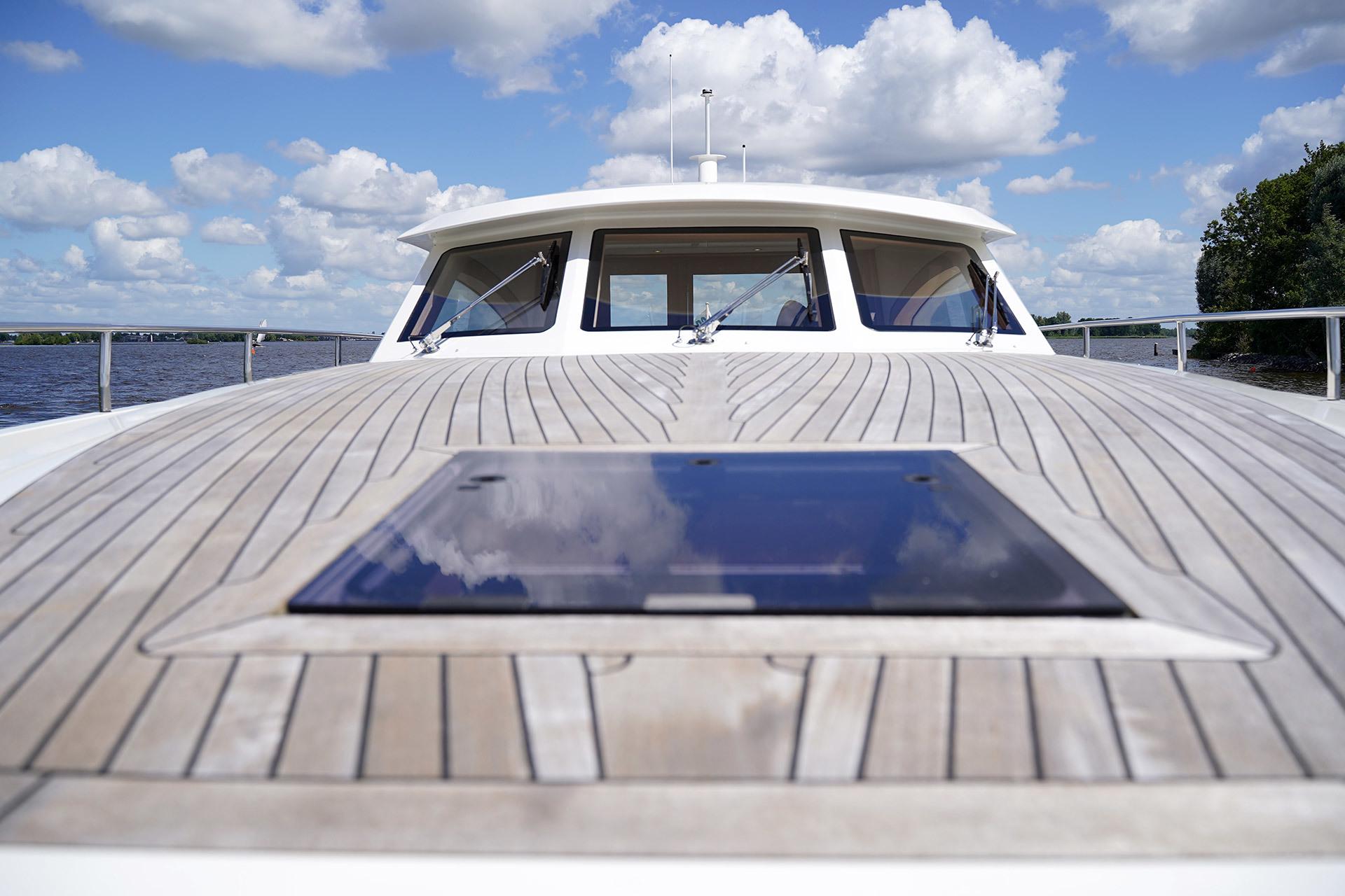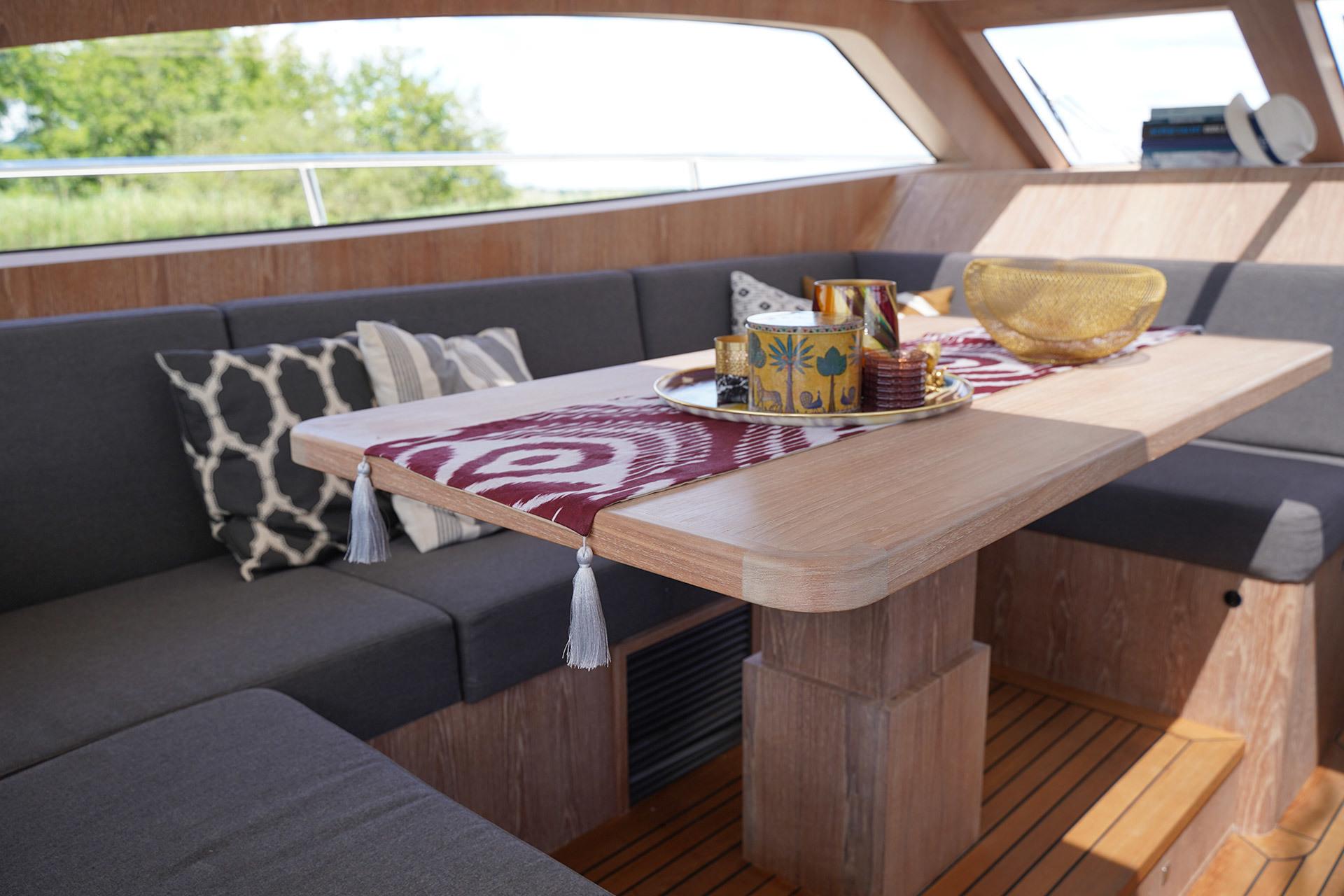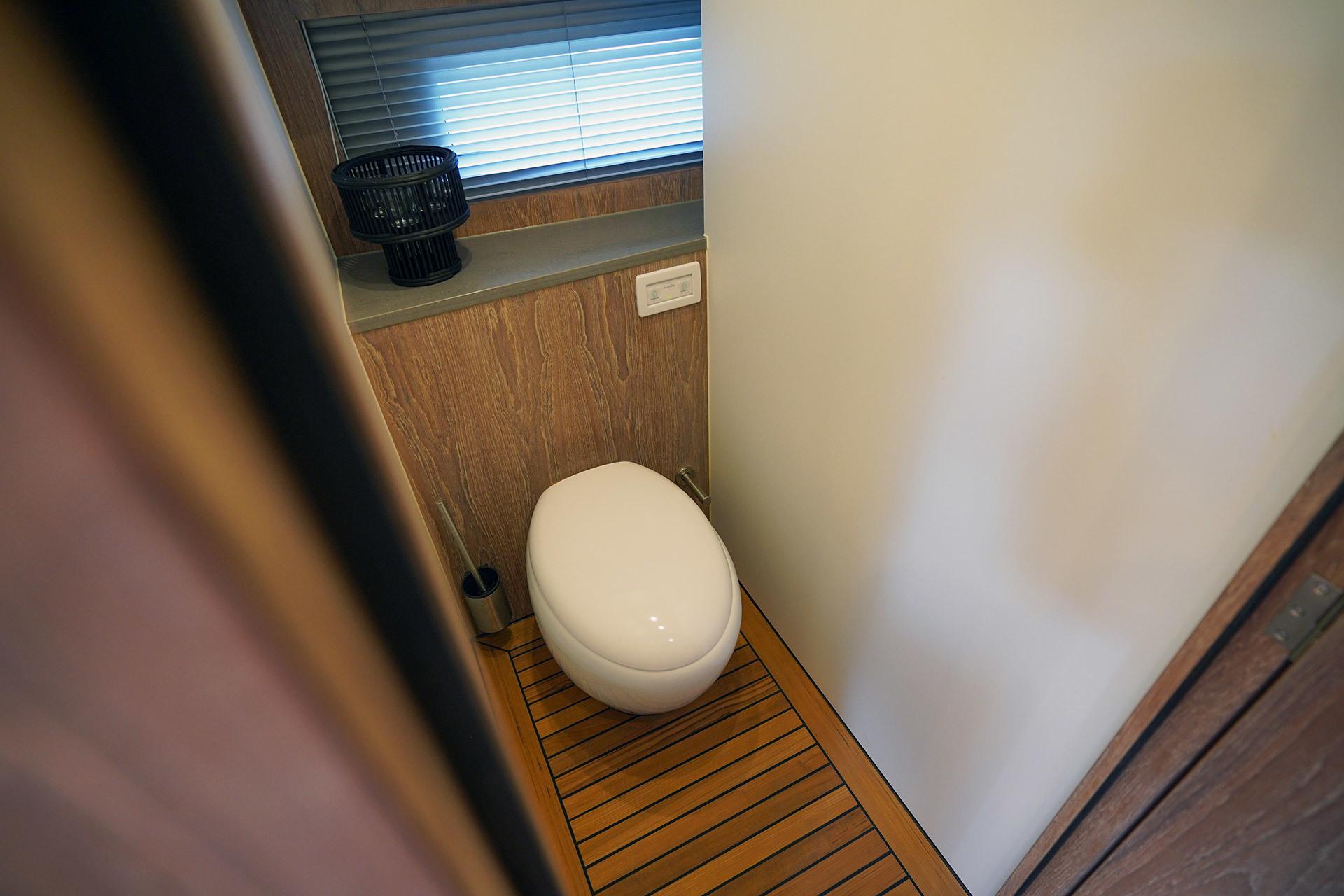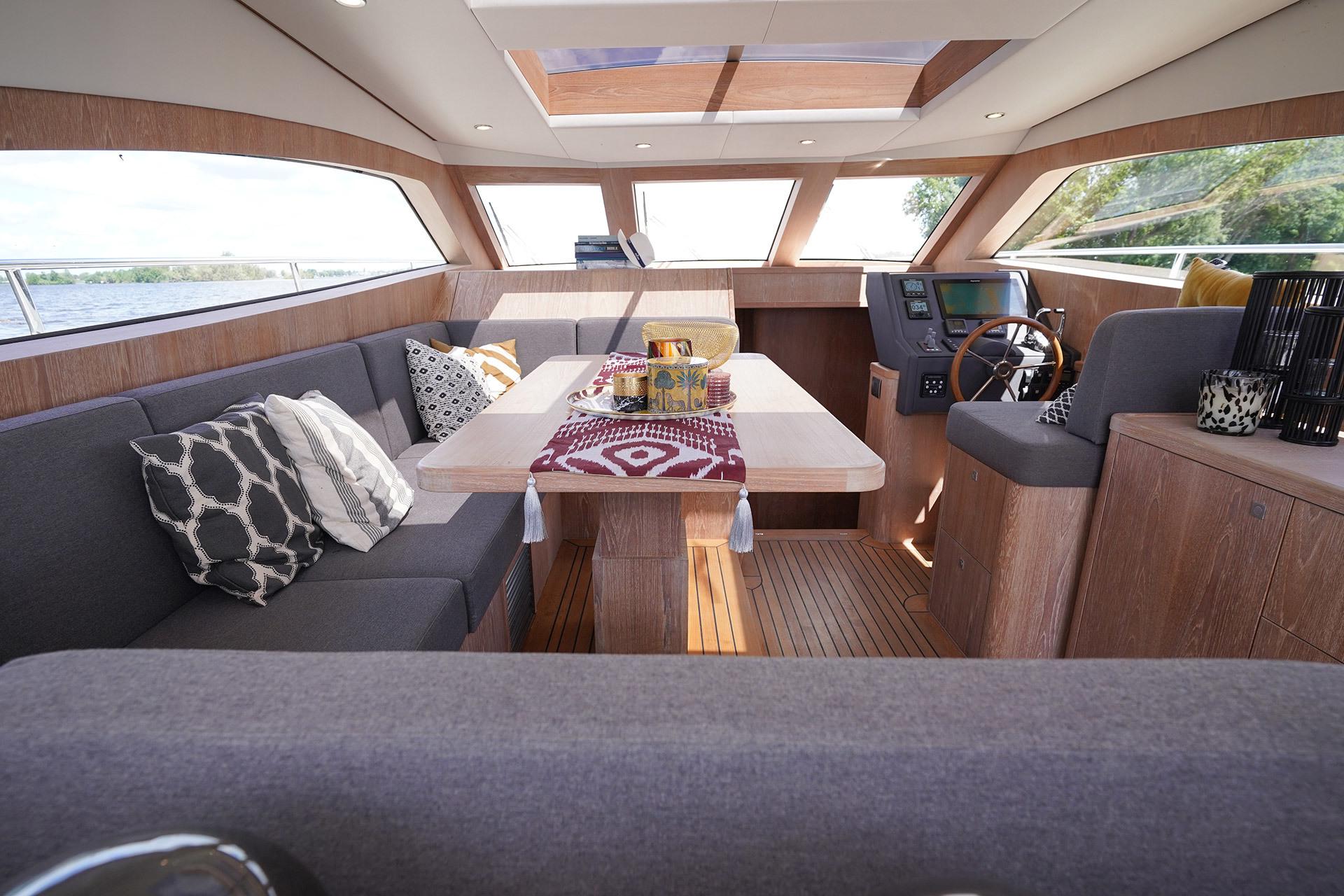 Heerlijk comfortabel teakhouten interieur. Voorzien van vloerverwarming met massief teakhouten vloerdelen. In de keuken is een wasmachine (Candy 8 kg) een vaatwasser (Siemens) en Corean werkbladen. Dit is echt een jacht voor alle seizoenen door de perfecte isolatie en dubbel glas. Het salonluik kan elektrisch geopend worden.