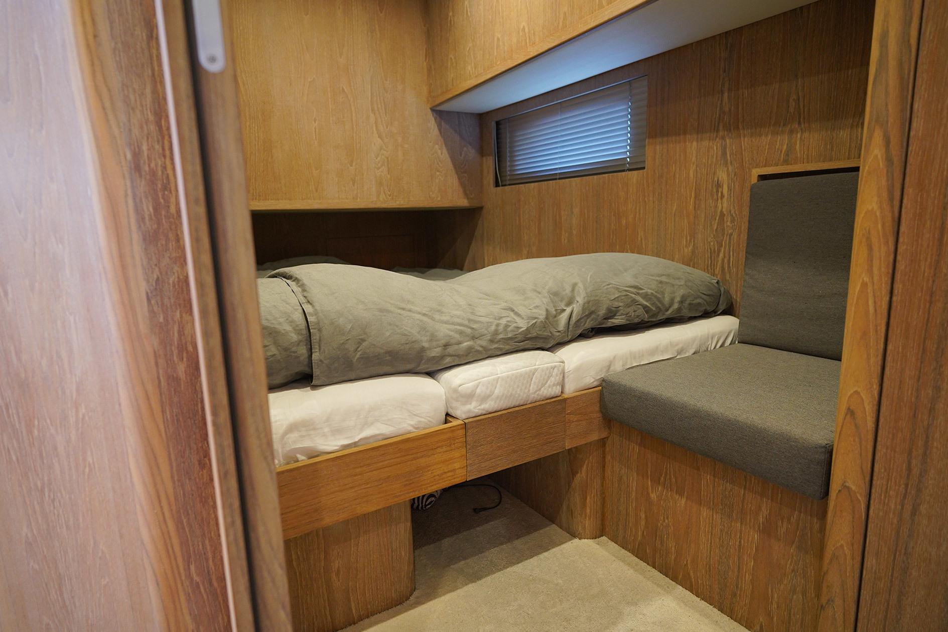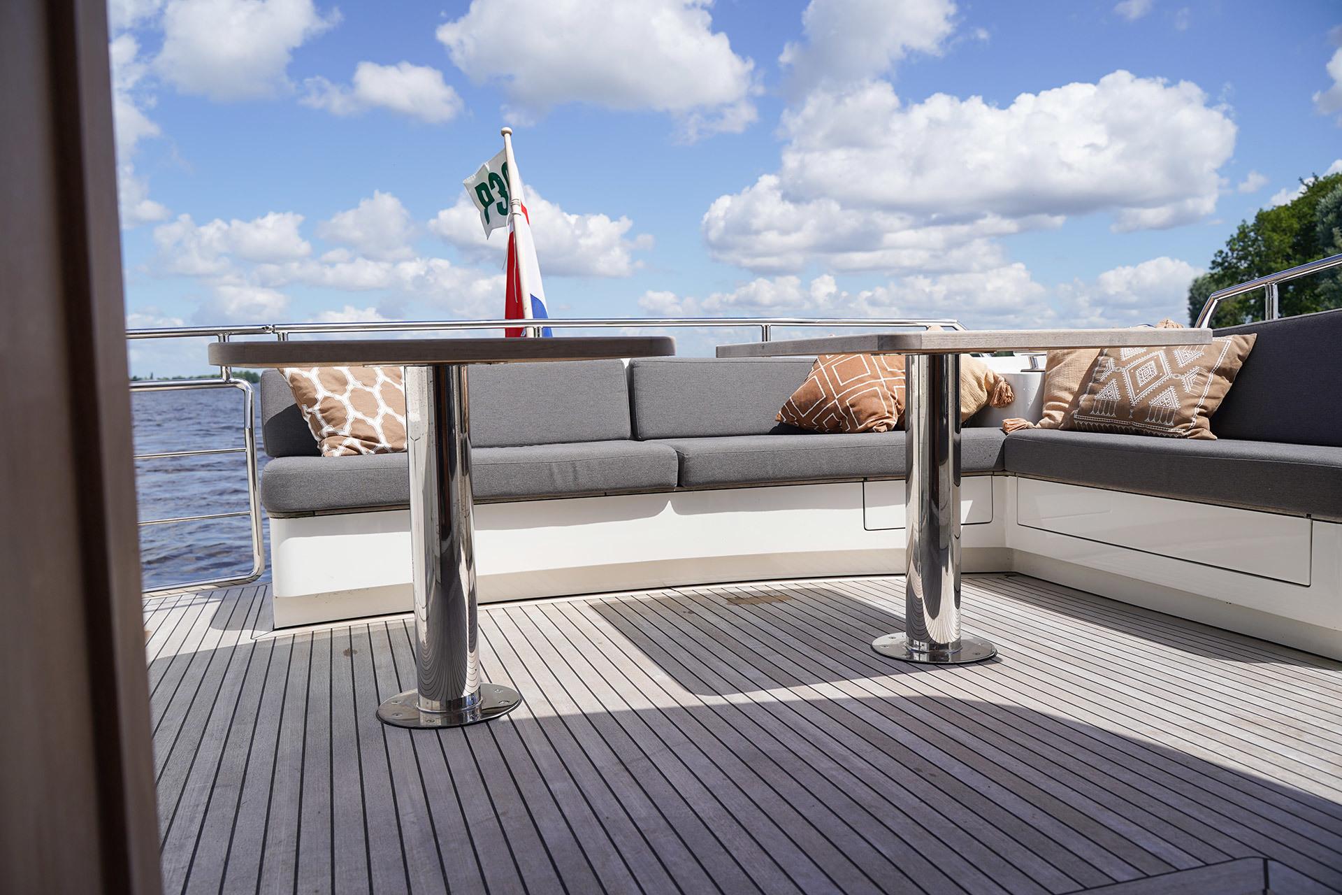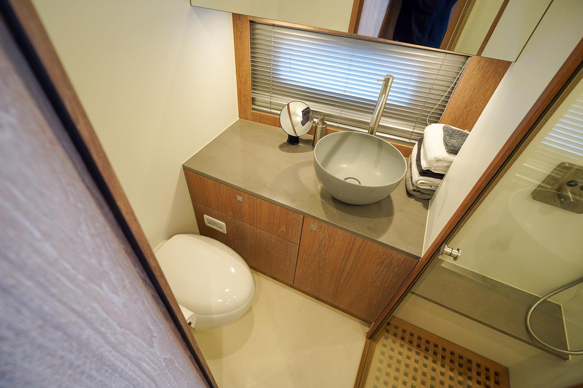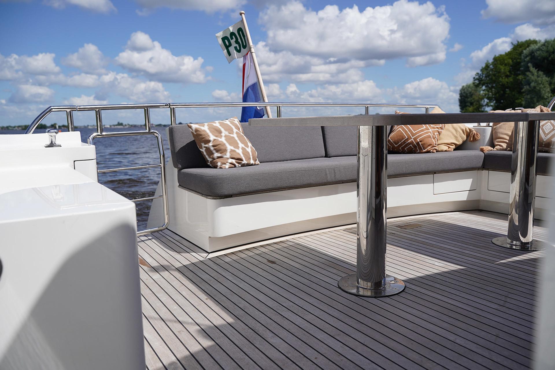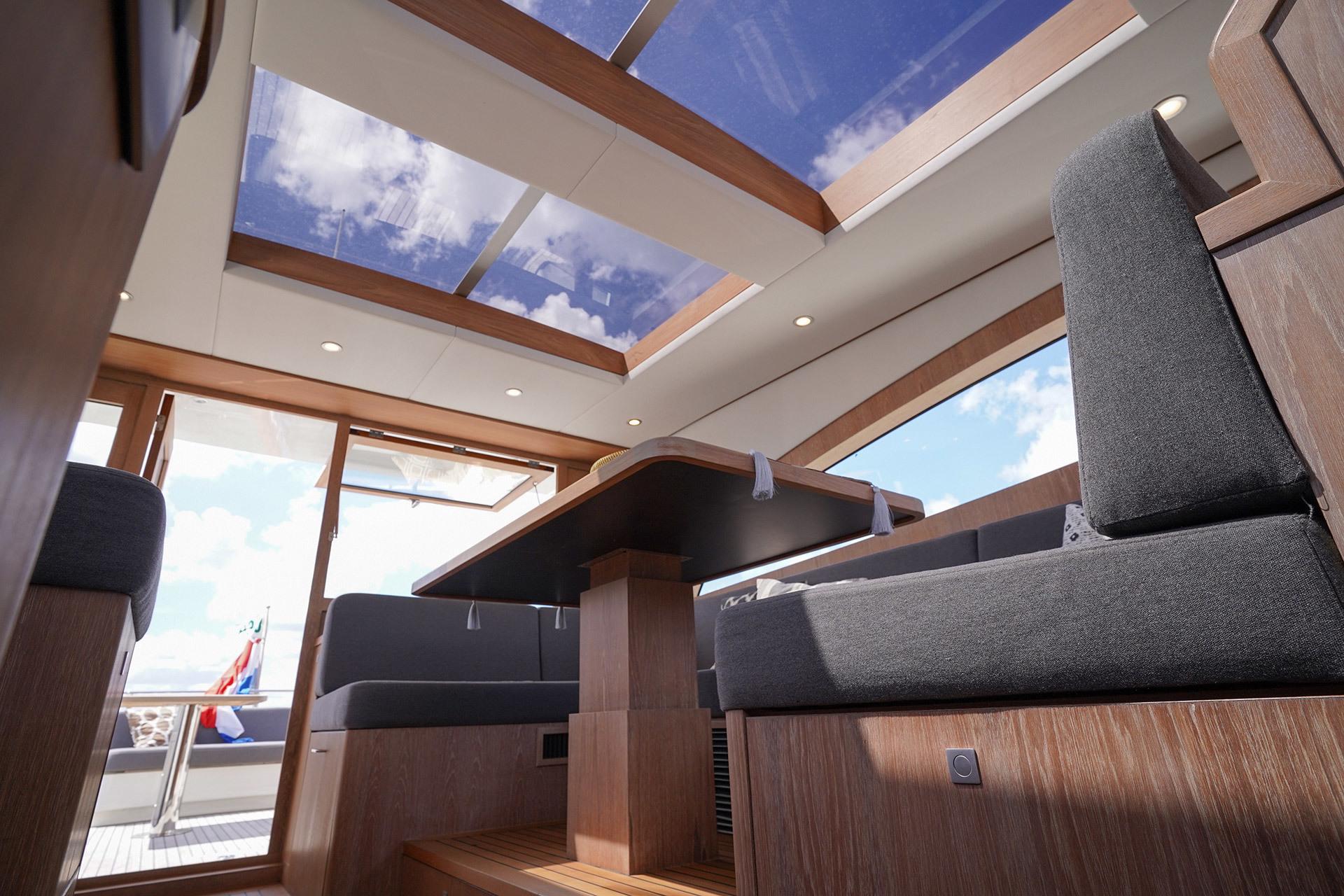 Heerlijk comfortabel teakhouten interieur. Voorzien van vloerverwarming met massief teakhouten vloerdelen. In de keuken is een wasmachine (Candy 8 kg) een vaatwasser (Siemens) en Corean werkbladen. Dit is echt een jacht voor alle seizoenen door de perfecte isolatie en dubbel glas. Het salonluik kan elektrisch geopend worden.