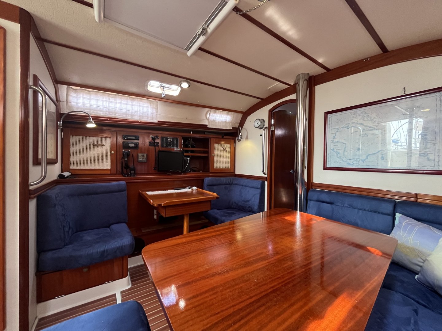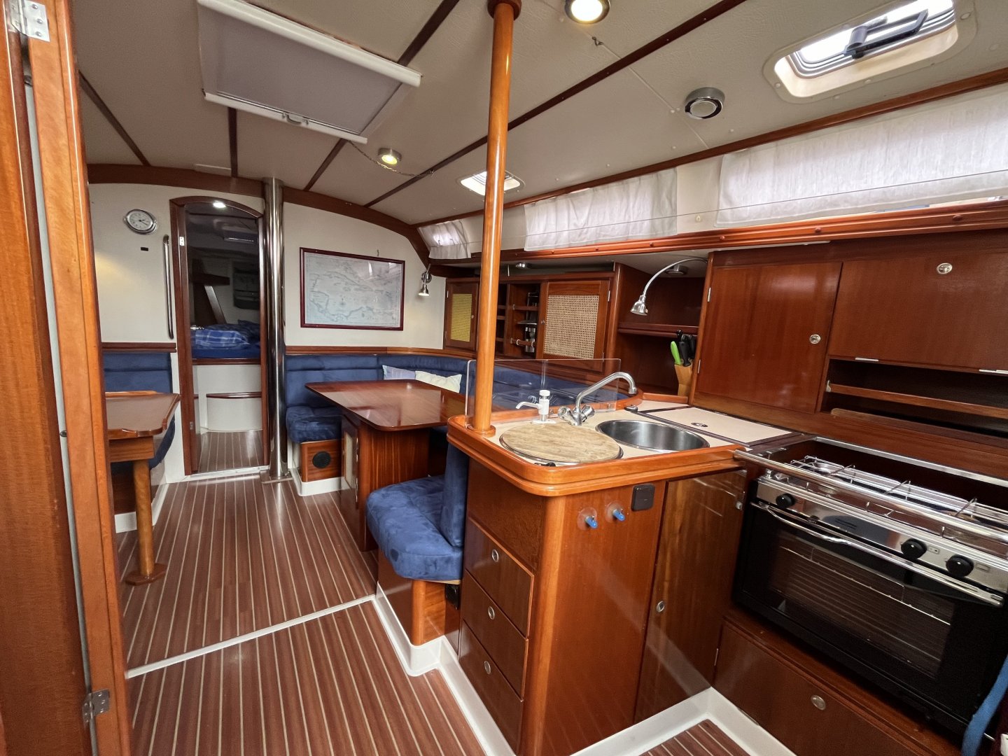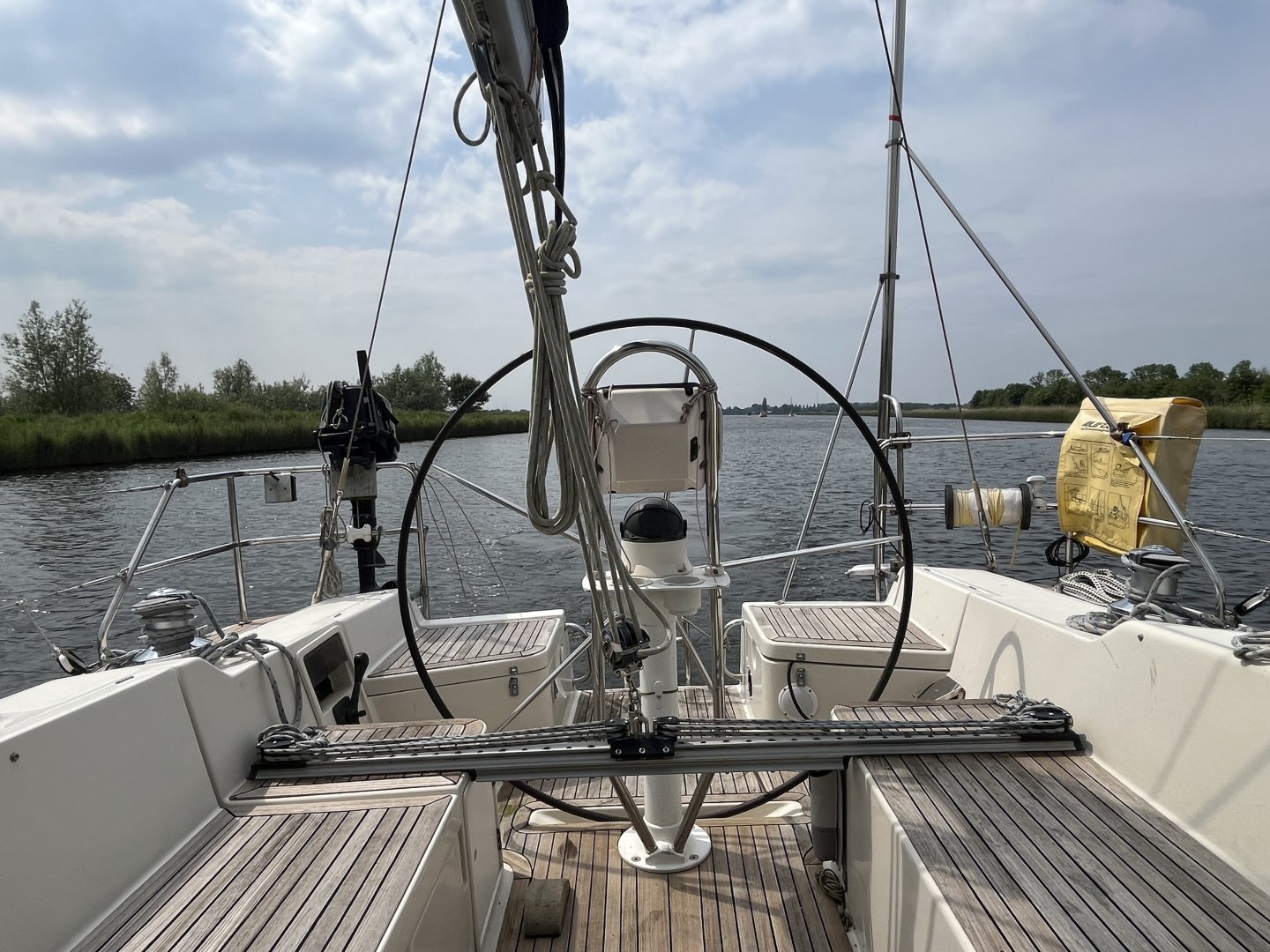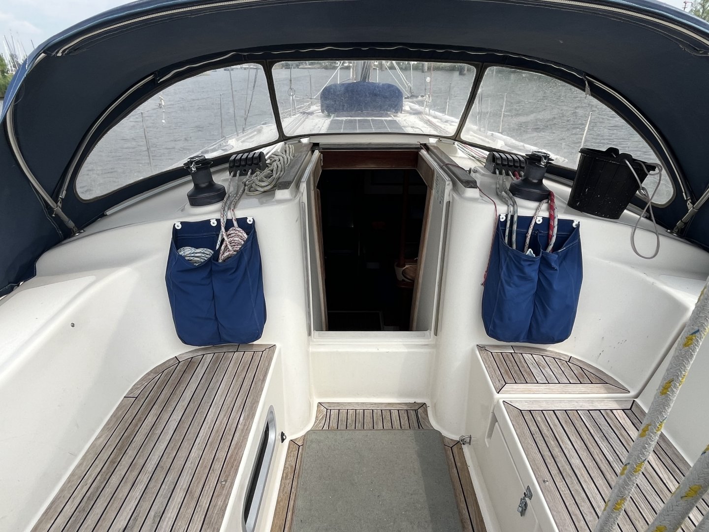 De ruime beschutte kuip heeft een gemakkelijke stap naar de steiger. De gangboorden zijn goed beloopbaar. Deze generatie Hanse is nog uitgevoerd met veel massief houten lijstwerk wat het interieur sfeervol maakt.