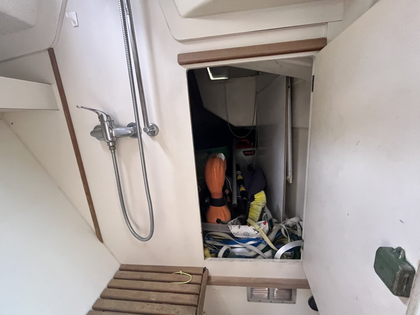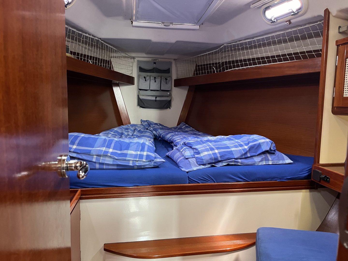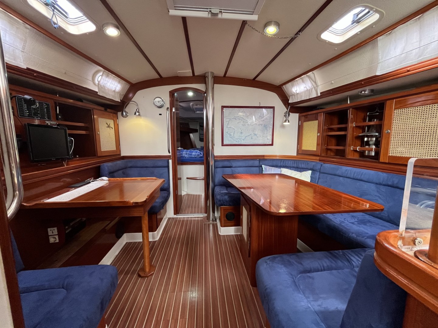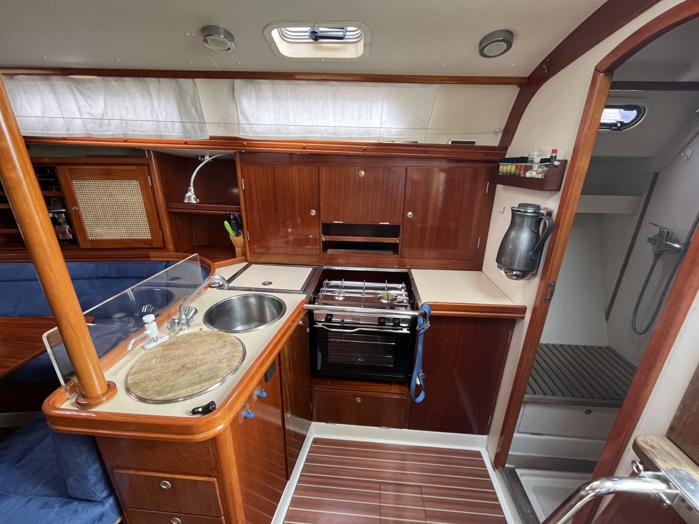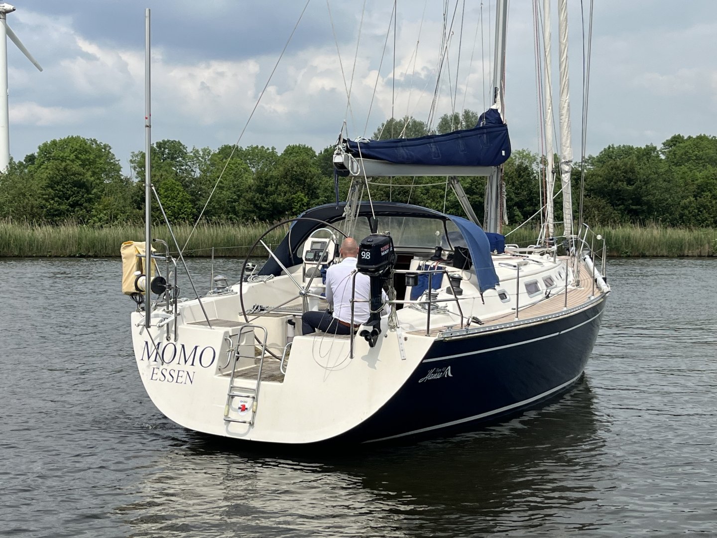 De ruime beschutte kuip heeft een gemakkelijke stap naar de steiger. De gangboorden zijn goed beloopbaar. Deze generatie Hanse is nog uitgevoerd met veel massief houten lijstwerk wat het interieur sfeervol maakt.