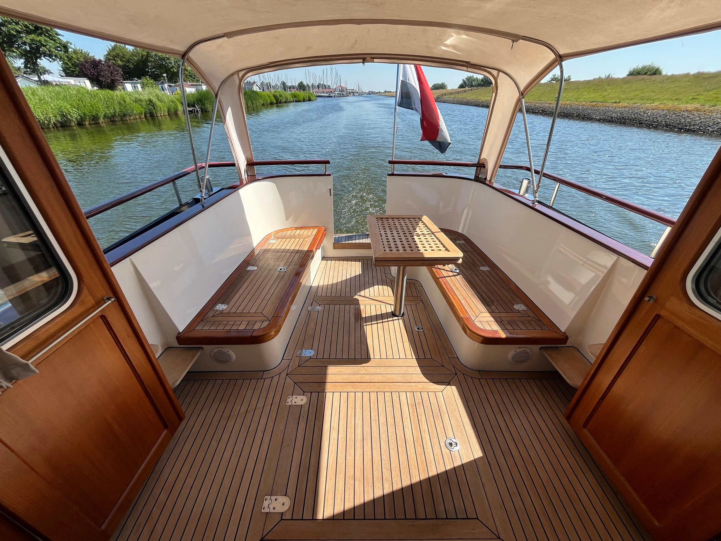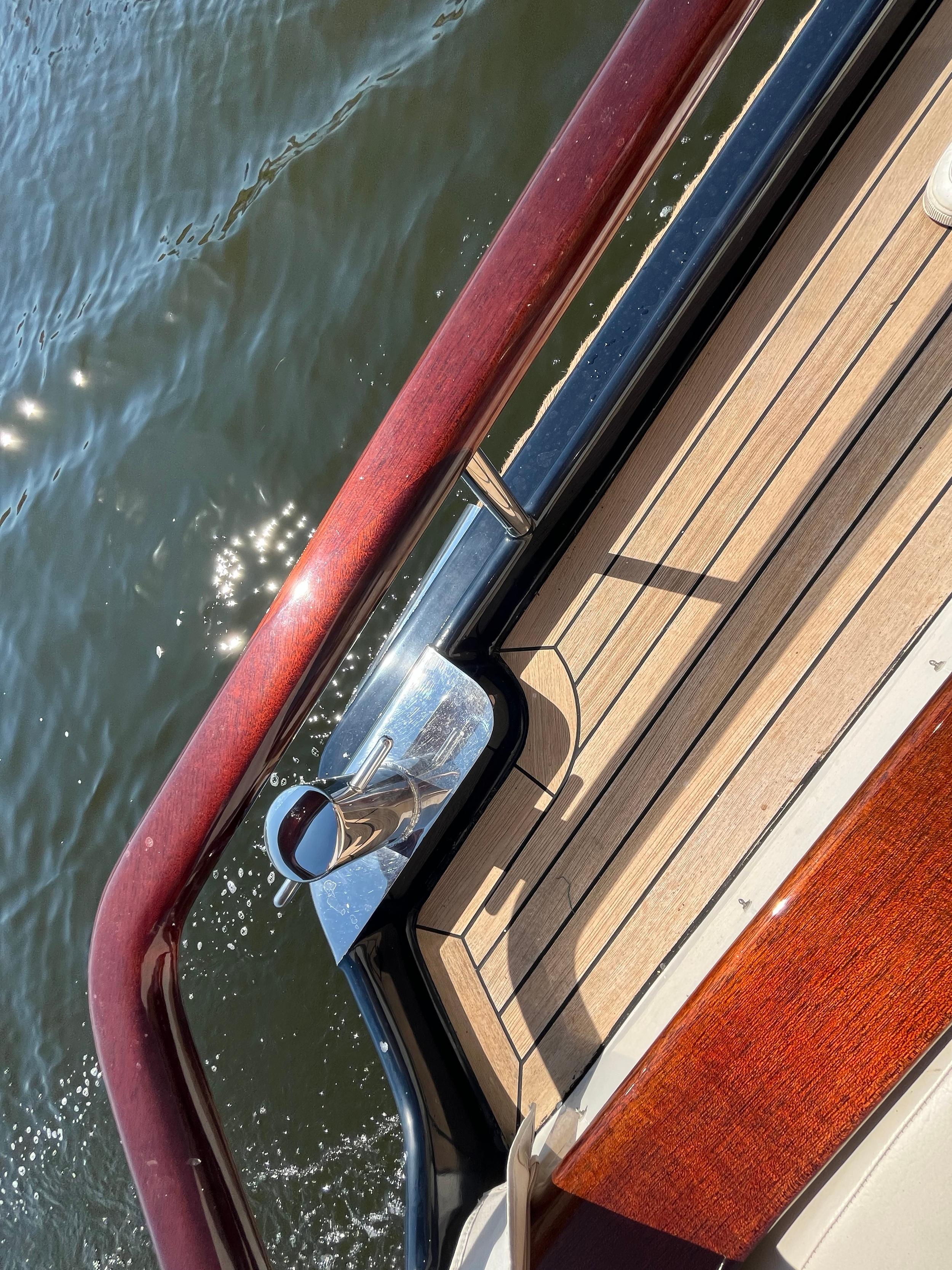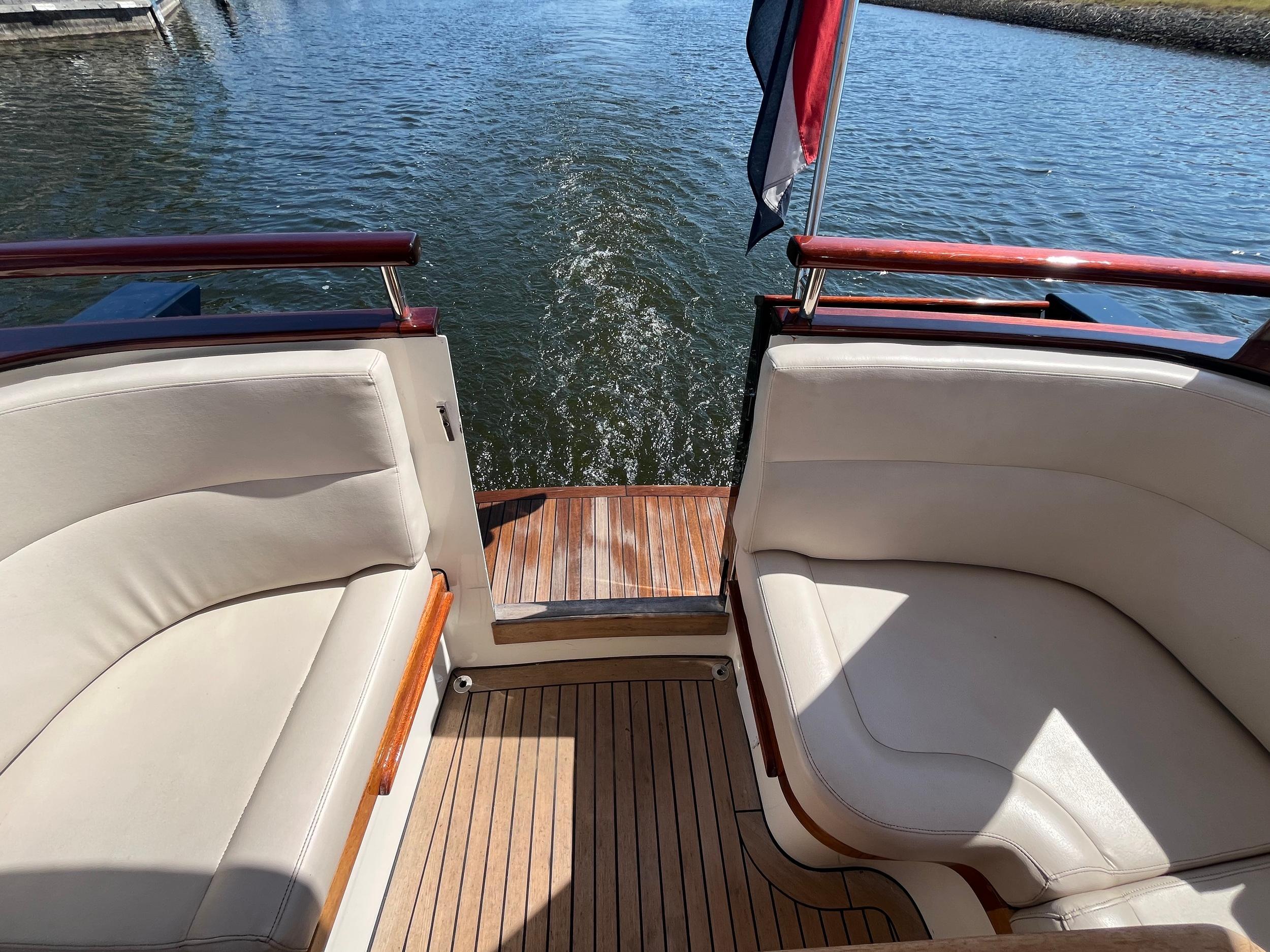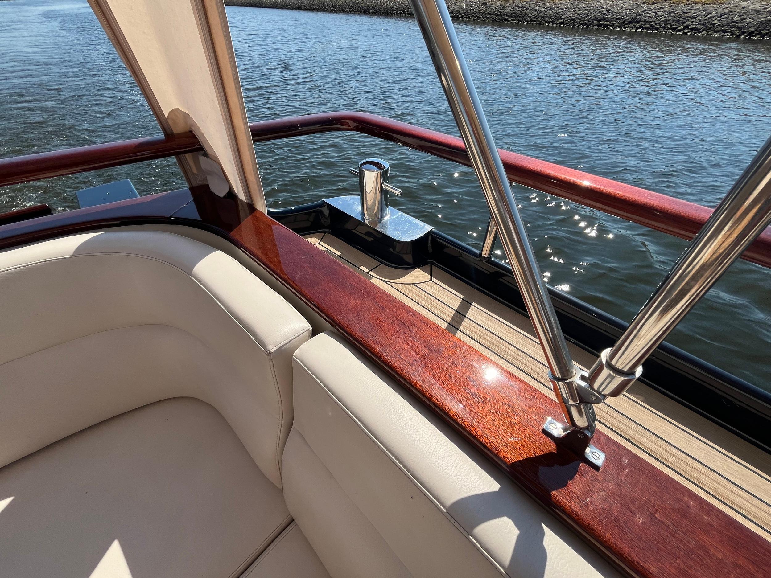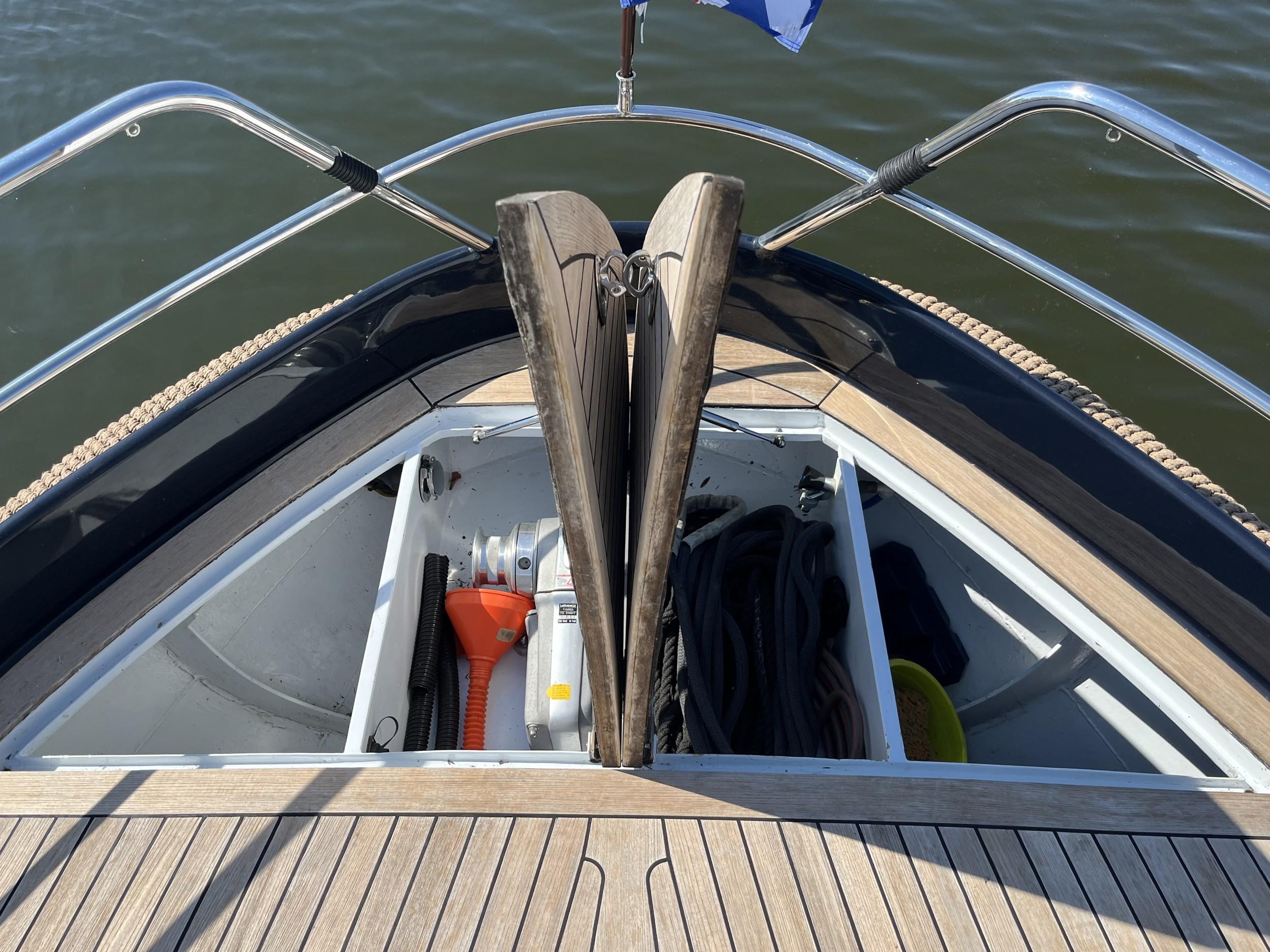 Dubbele walstroomaansluiting, boegschroef en hekschroef, dekwaspomp, fenderopslag in het voordek, gelakte mahoniehouten lijst op de hekstoel, deur vanuit kuip naar het zwemplatform. Buitendouche. RVS stootlijst rondom zwemplatform. Strijkbare lichtmast.