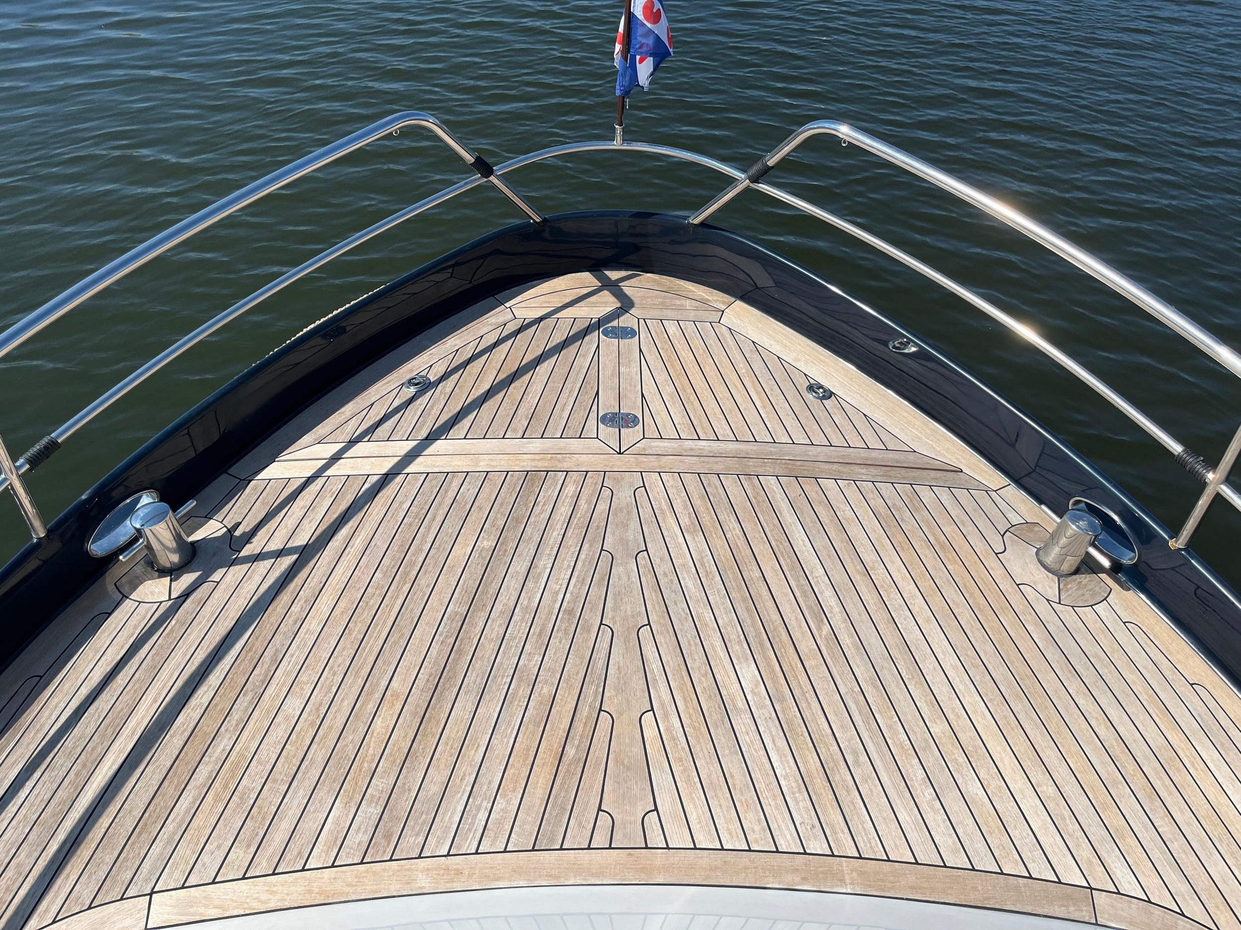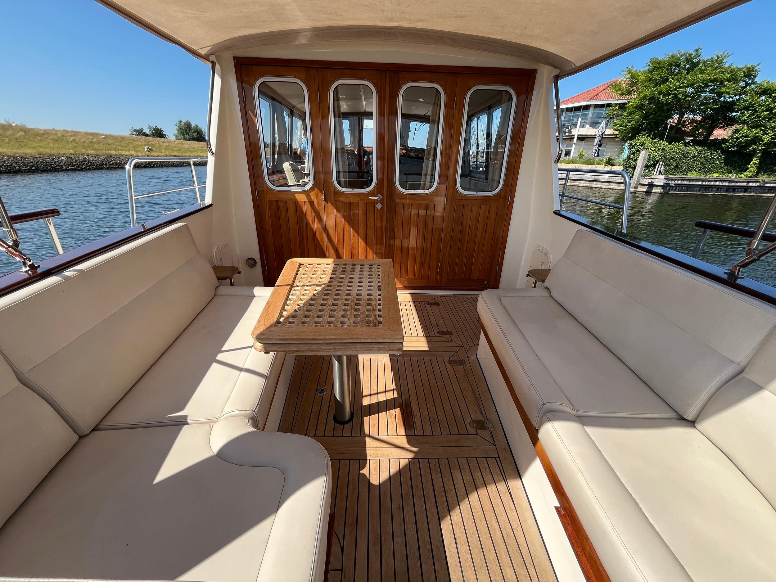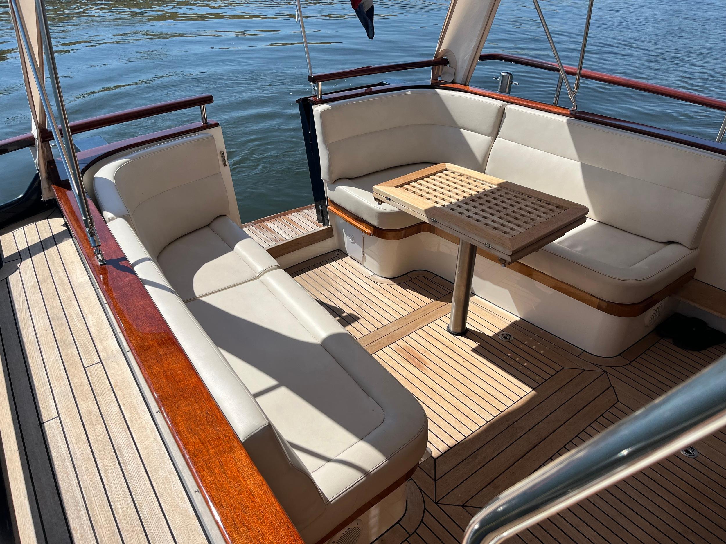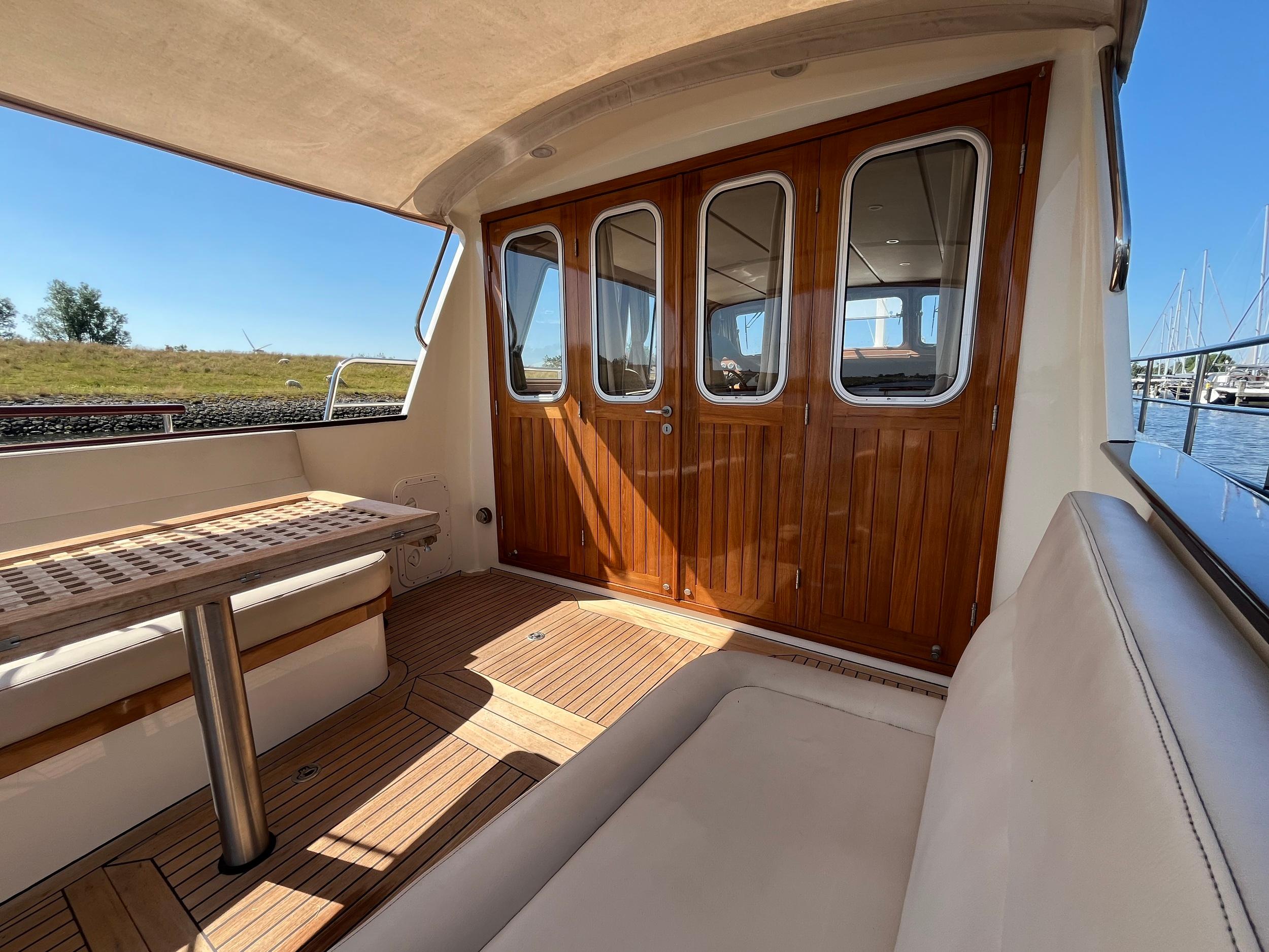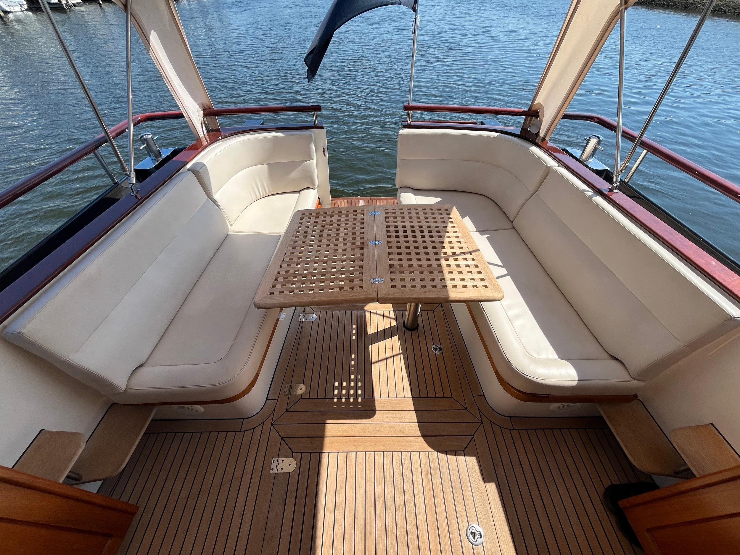 Dubbele walstroomaansluiting, boegschroef en hekschroef, dekwaspomp, fenderopslag in het voordek, gelakte mahoniehouten lijst op de hekstoel, deur vanuit kuip naar het zwemplatform. Buitendouche. RVS stootlijst rondom zwemplatform. Strijkbare lichtmast.