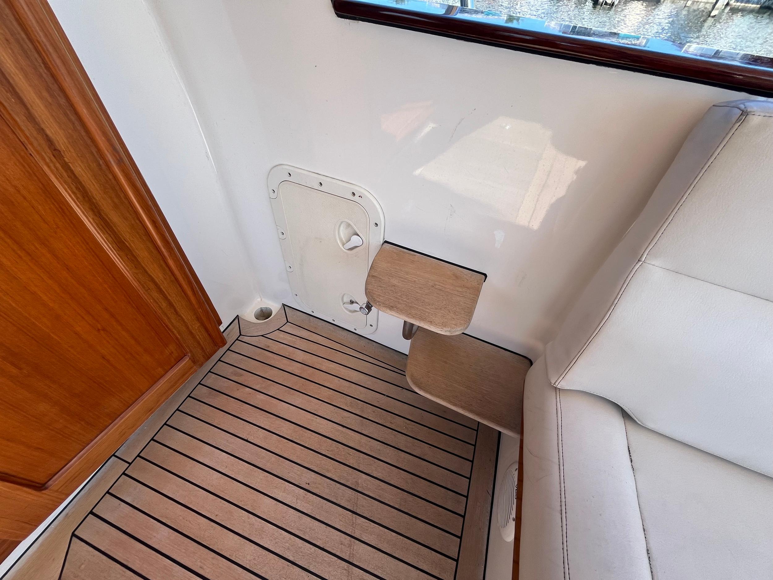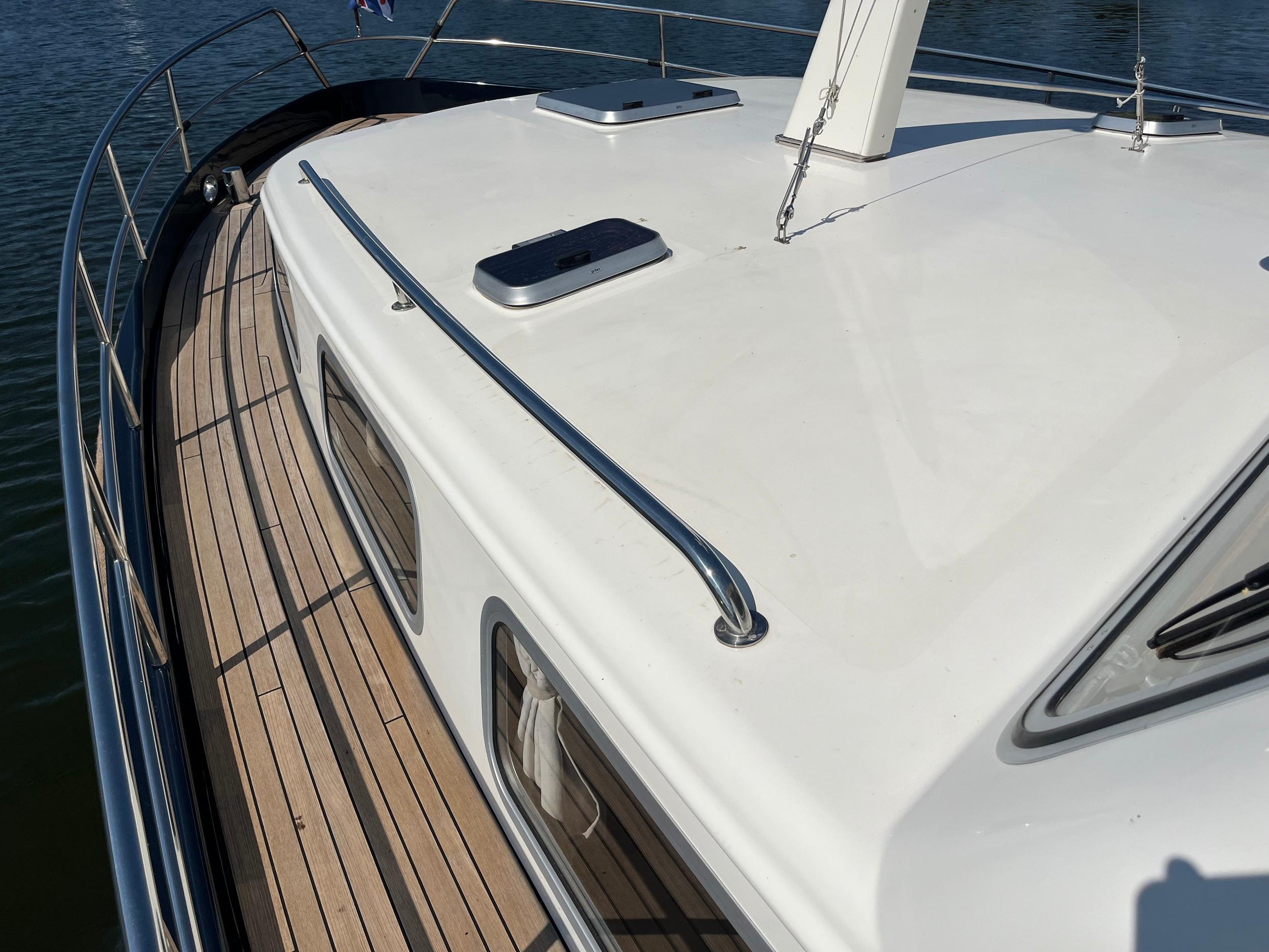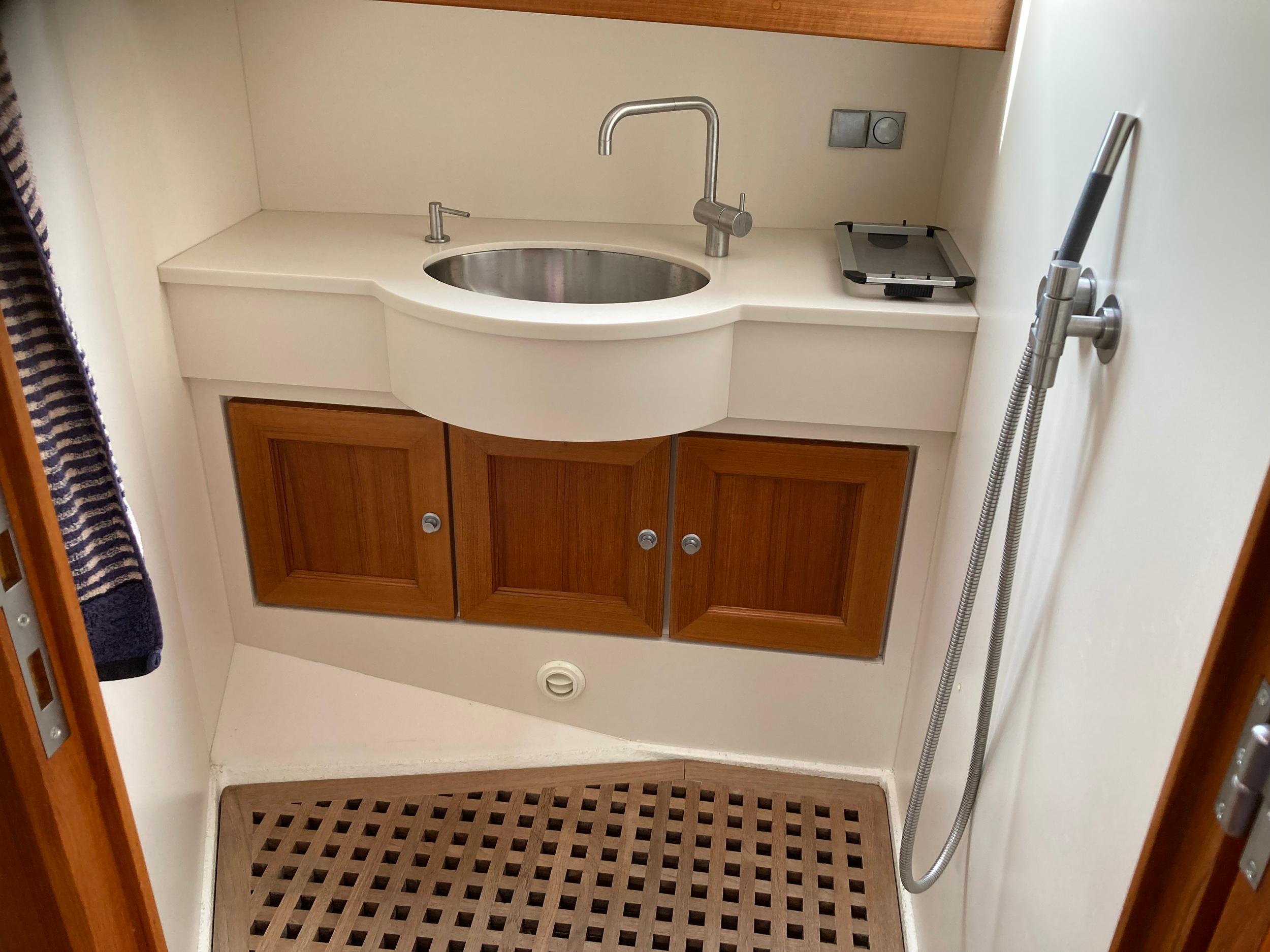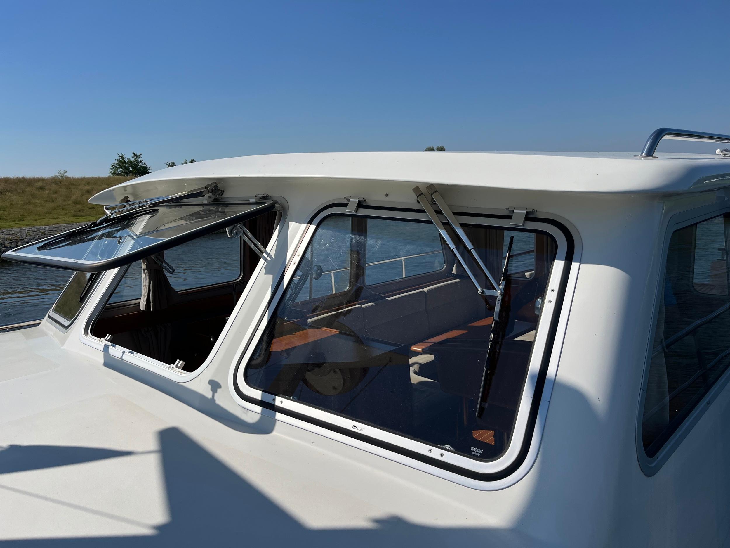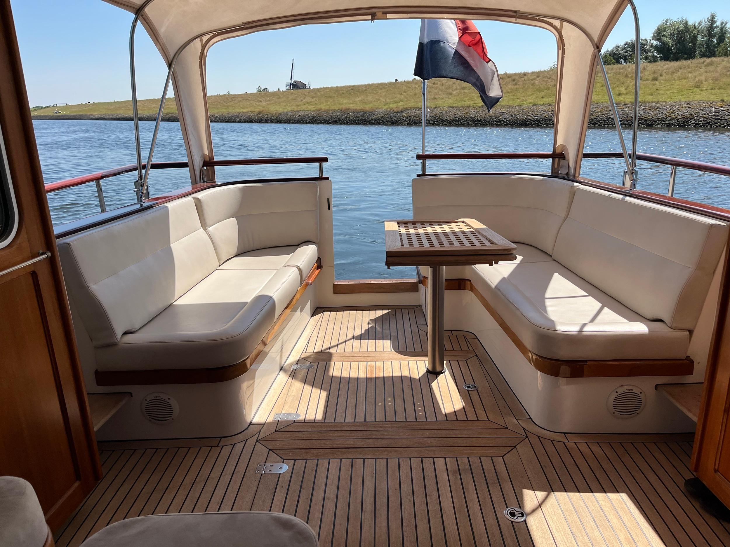Dubbele walstroomaansluiting, boegschroef en hekschroef, dekwaspomp, fenderopslag in het voordek, gelakte mahoniehouten lijst op de hekstoel, deur vanuit kuip naar het zwemplatform. Buitendouche. RVS stootlijst rondom zwemplatform. Strijkbare lichtmast.