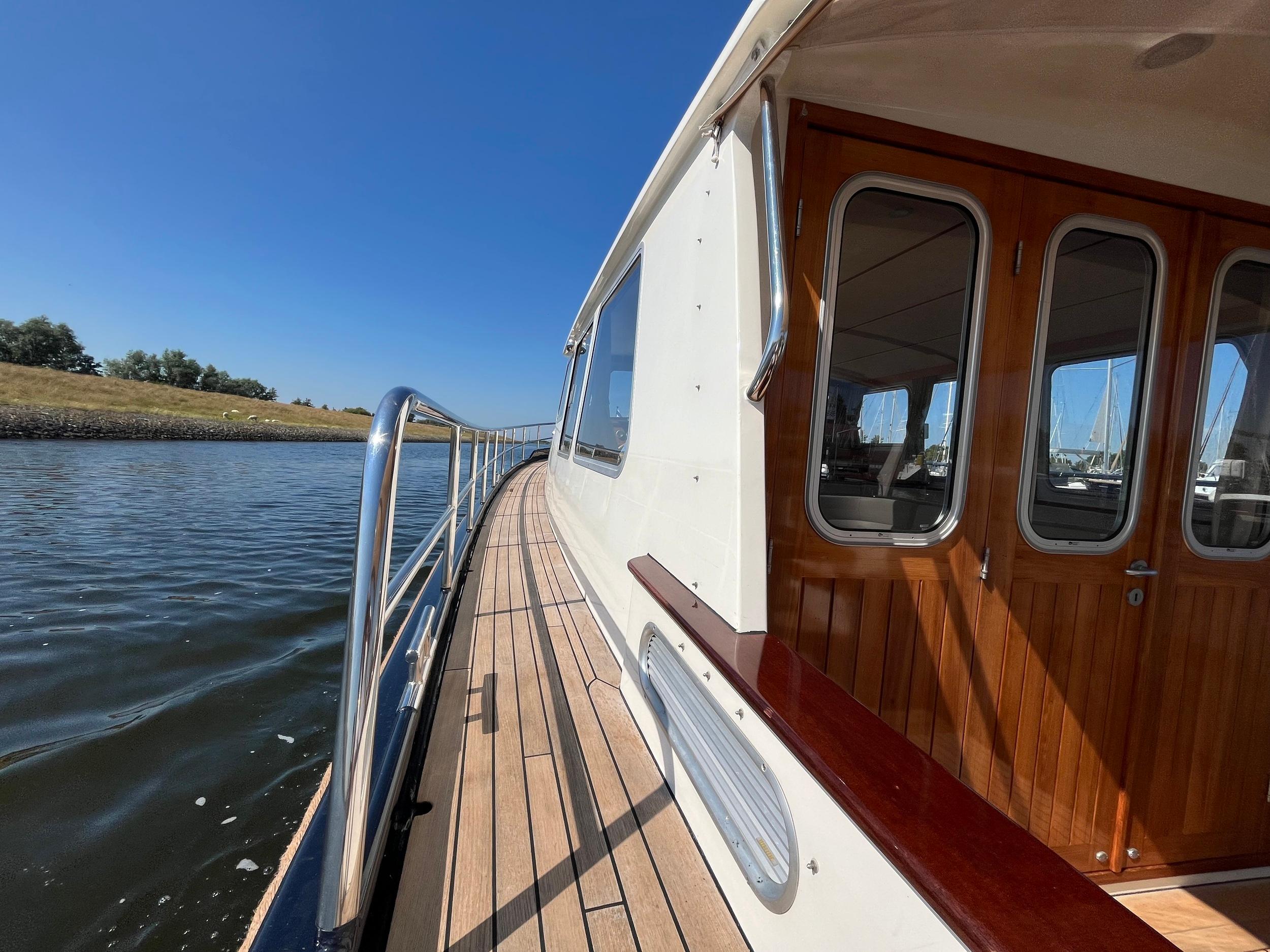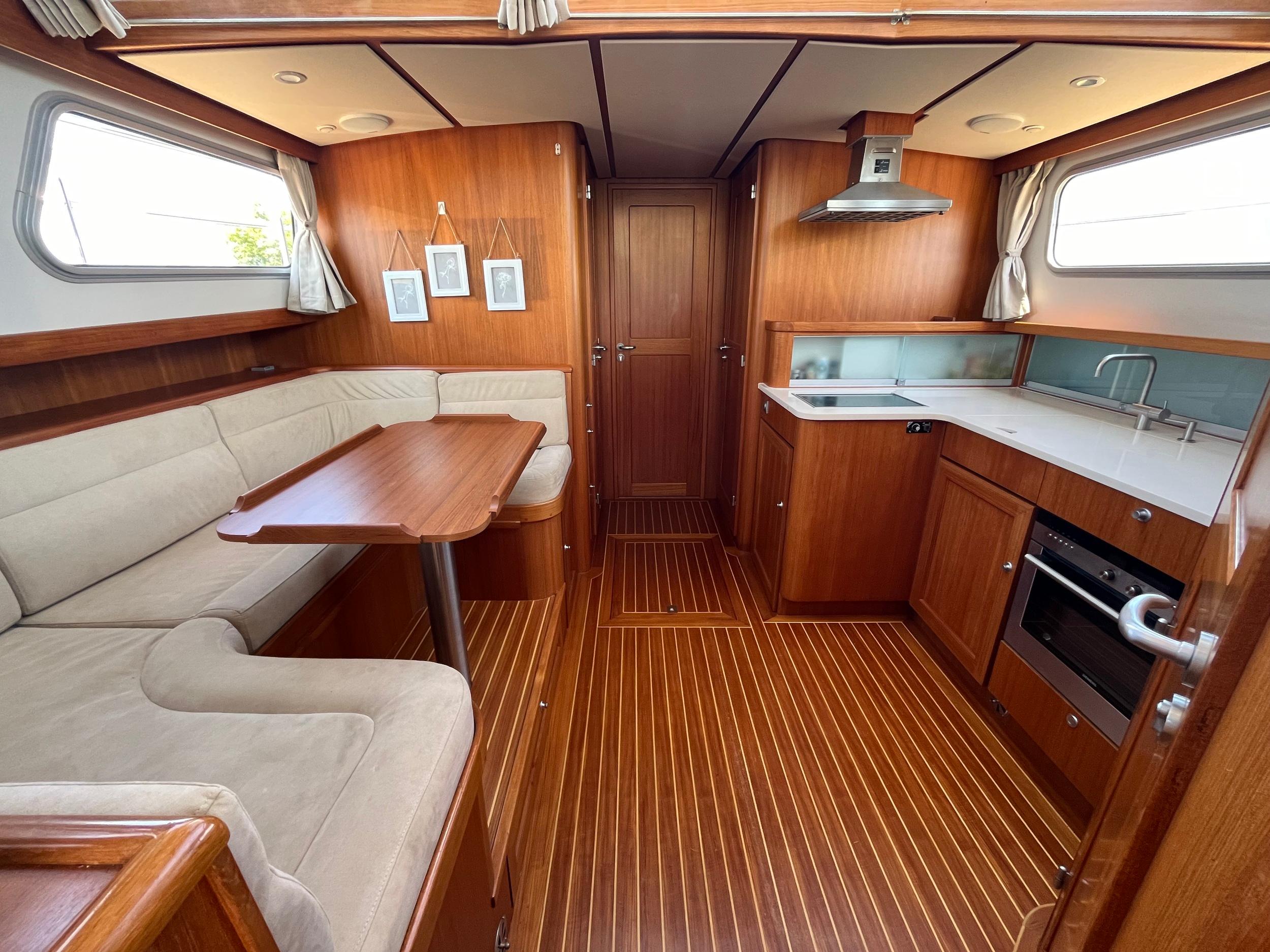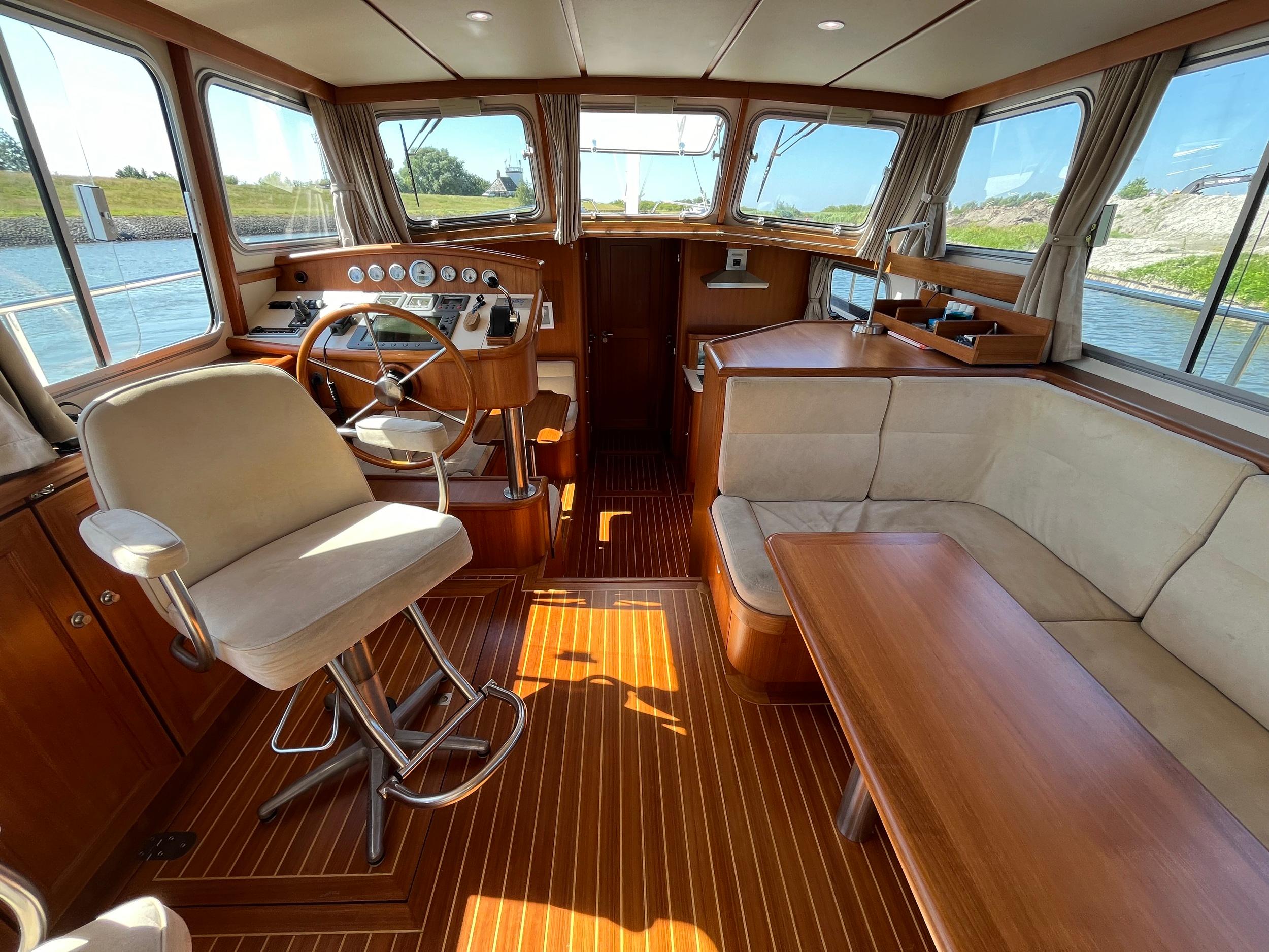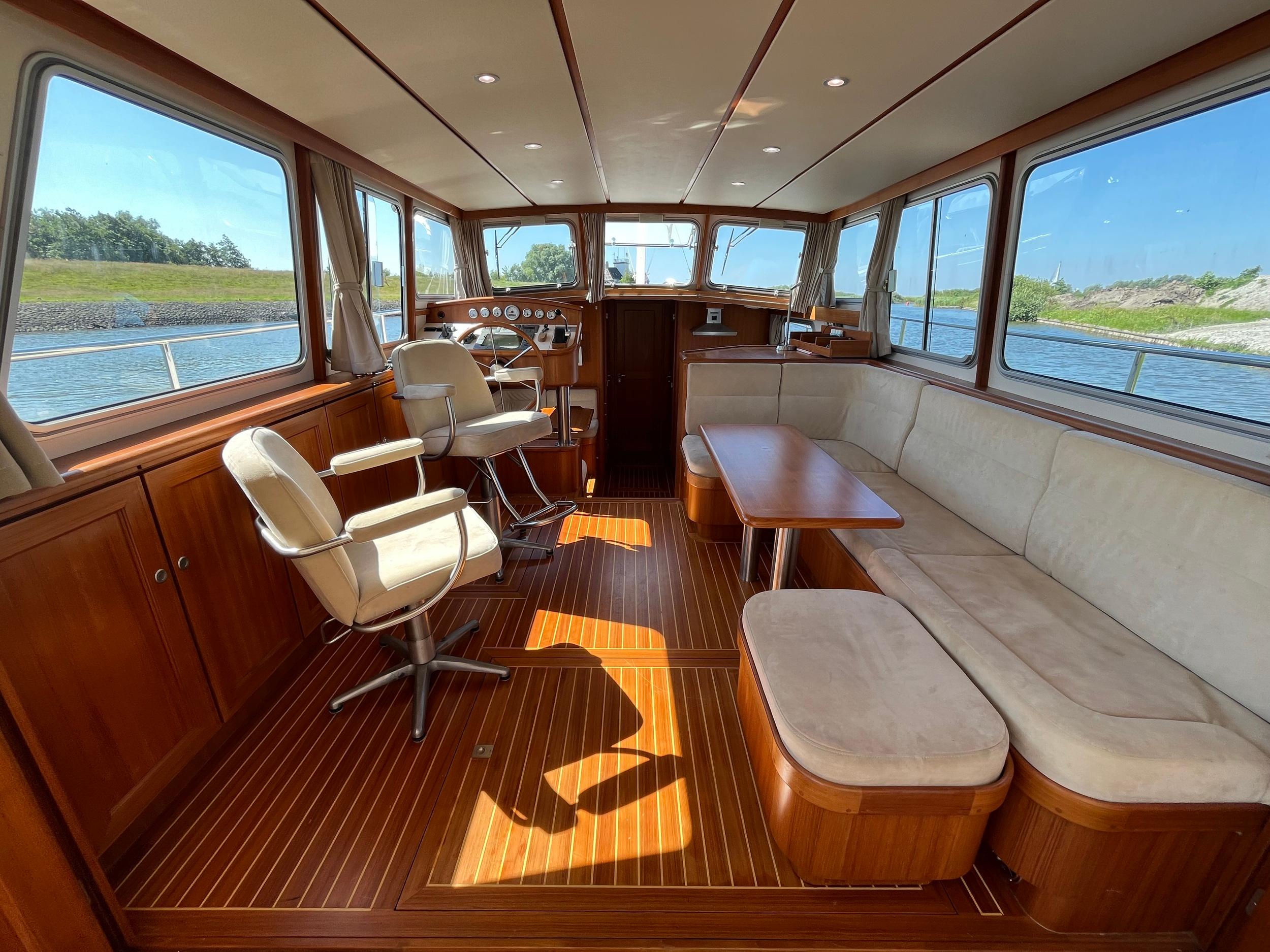 Webasto hetelucht verwarming. Goed geïsoleerd en daardoor ideaal voor alle seizoenen. Fraaie keuken met Siemens apparatuur en rolkast. Massief teakhouten vloeren en deurlijsten van massief teakhout. Seperate douche en toilet. Ruime mastercabin. Er is in het hele jacht veel kastruimte. Onder de salon is een berging met daarin een was/droogmachine.