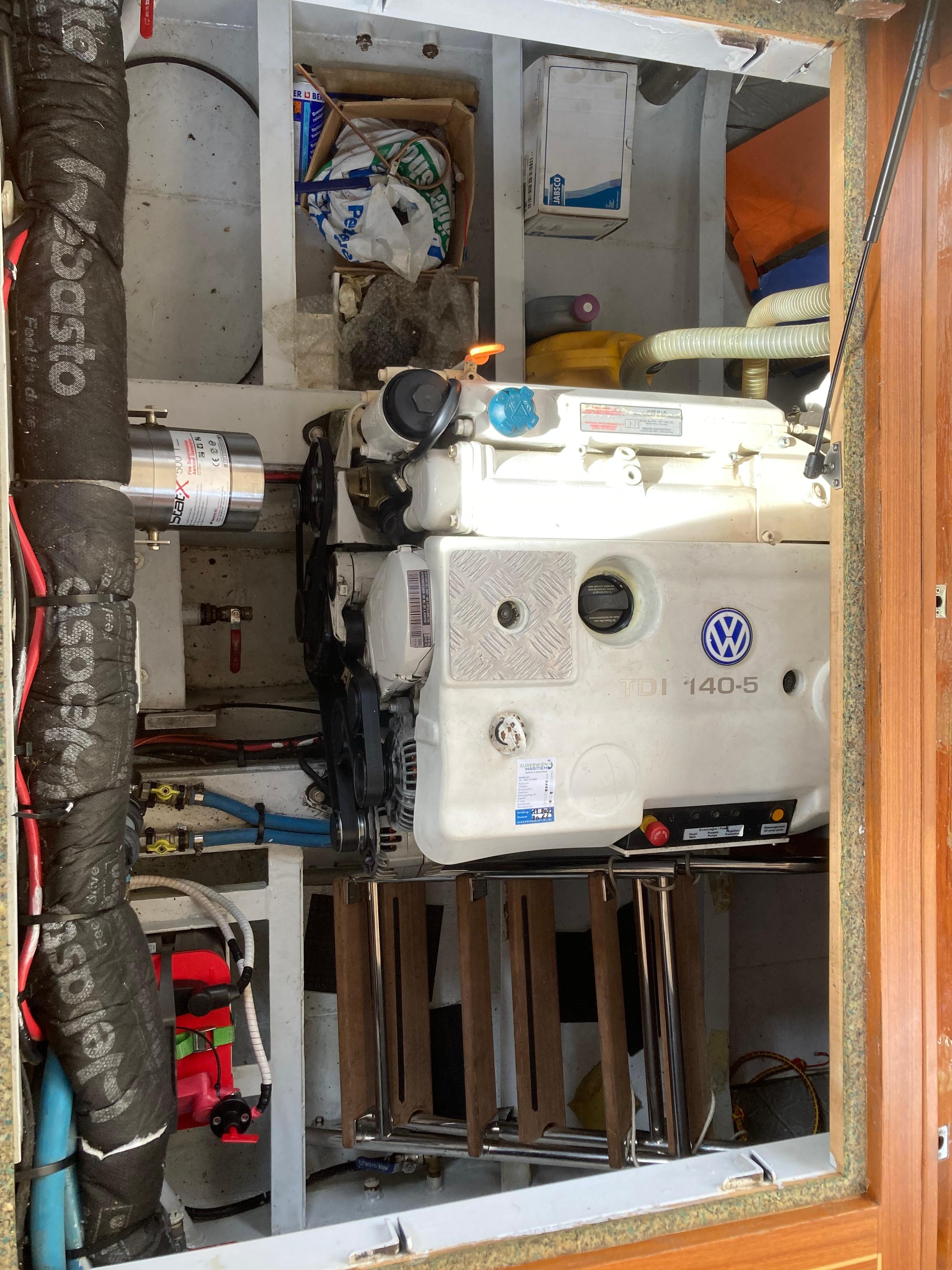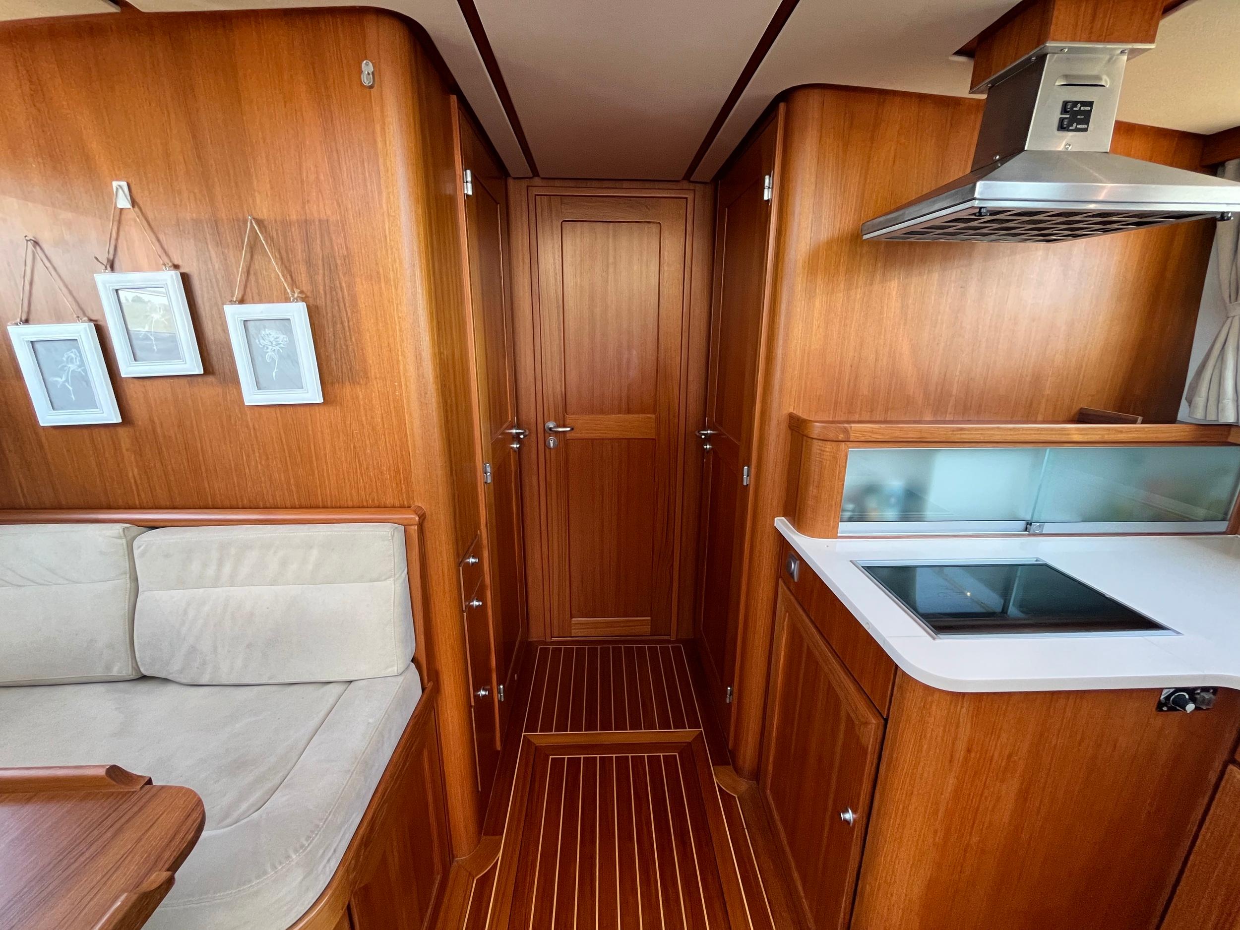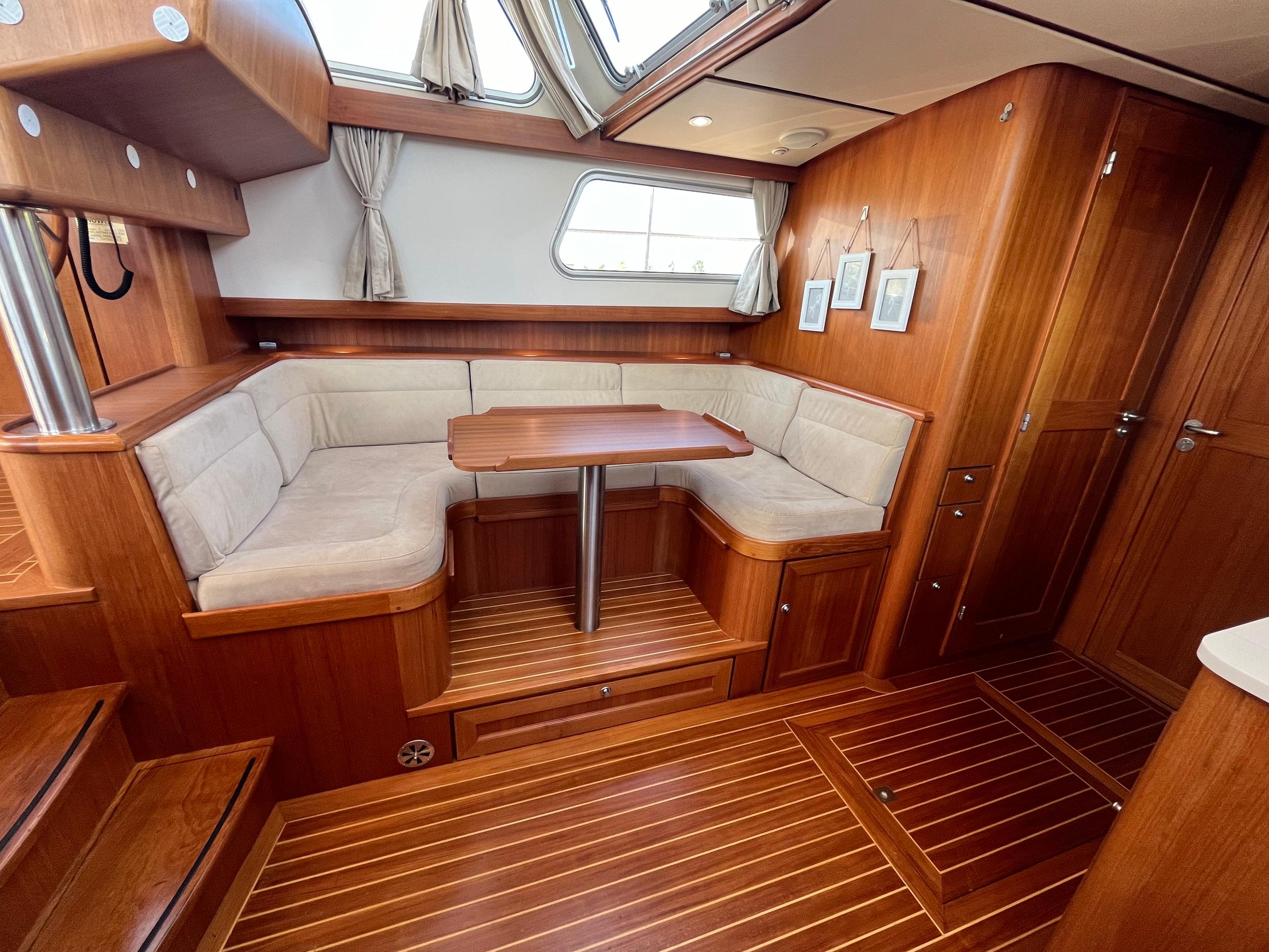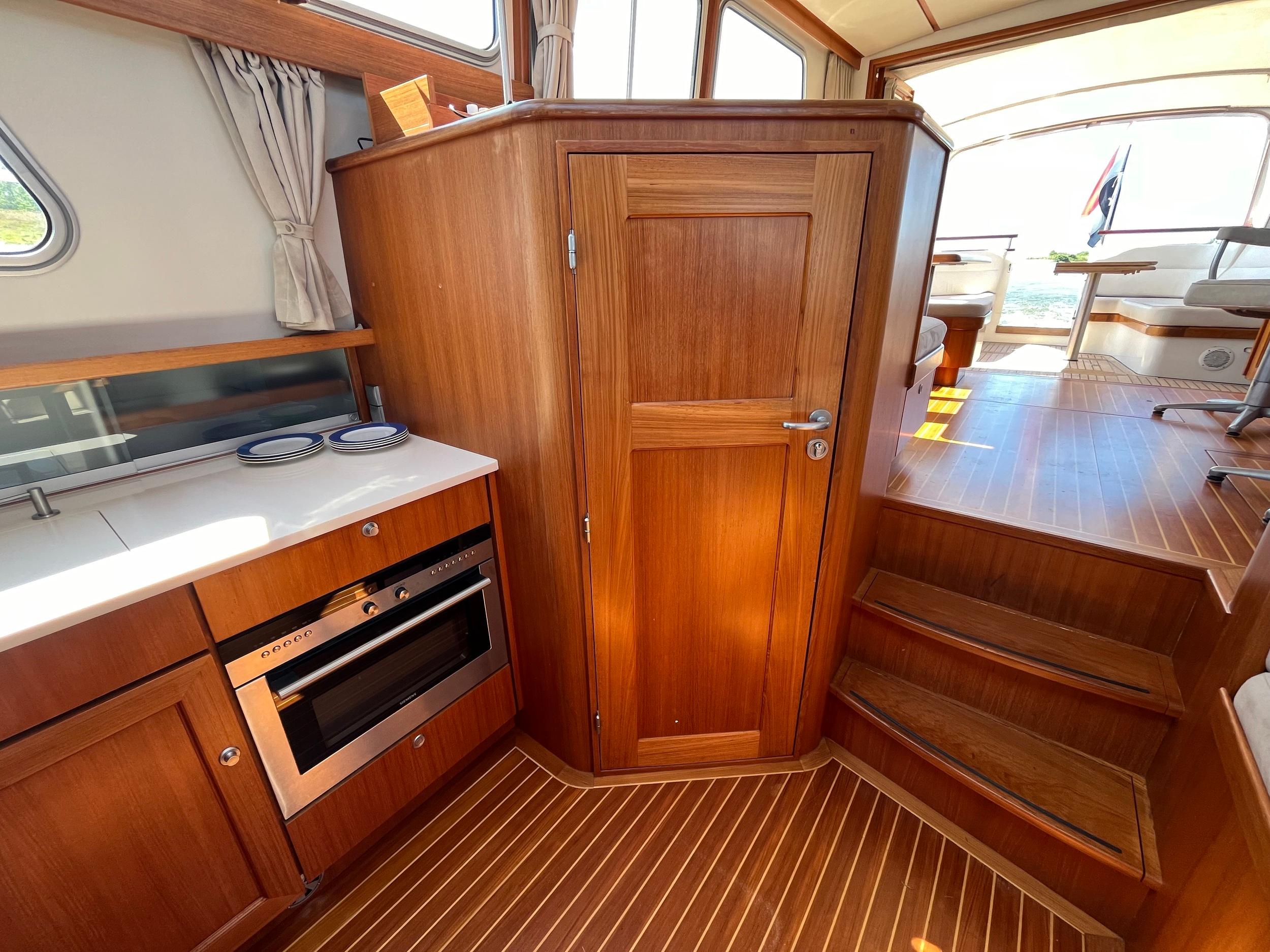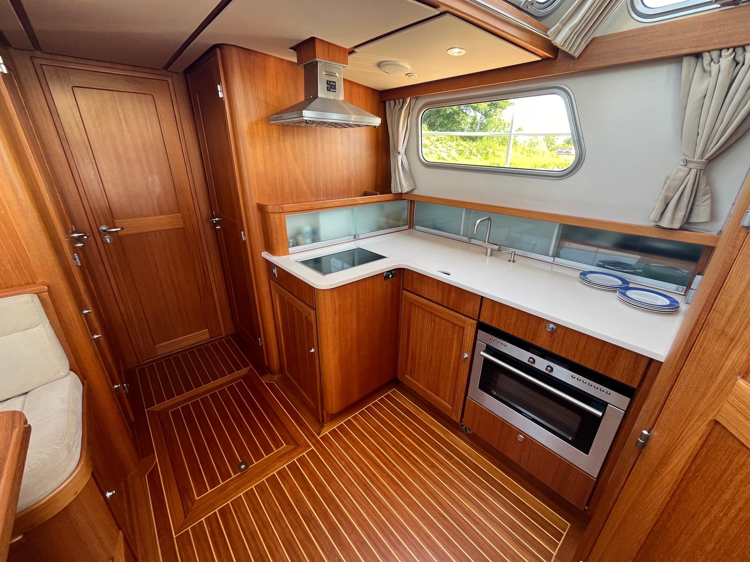 Webasto hetelucht verwarming. Goed geïsoleerd en daardoor ideaal voor alle seizoenen. Fraaie keuken met Siemens apparatuur en rolkast. Massief teakhouten vloeren en deurlijsten van massief teakhout. Seperate douche en toilet. Ruime mastercabin. Er is in het hele jacht veel kastruimte. Onder de salon is een berging met daarin een was/droogmachine.
