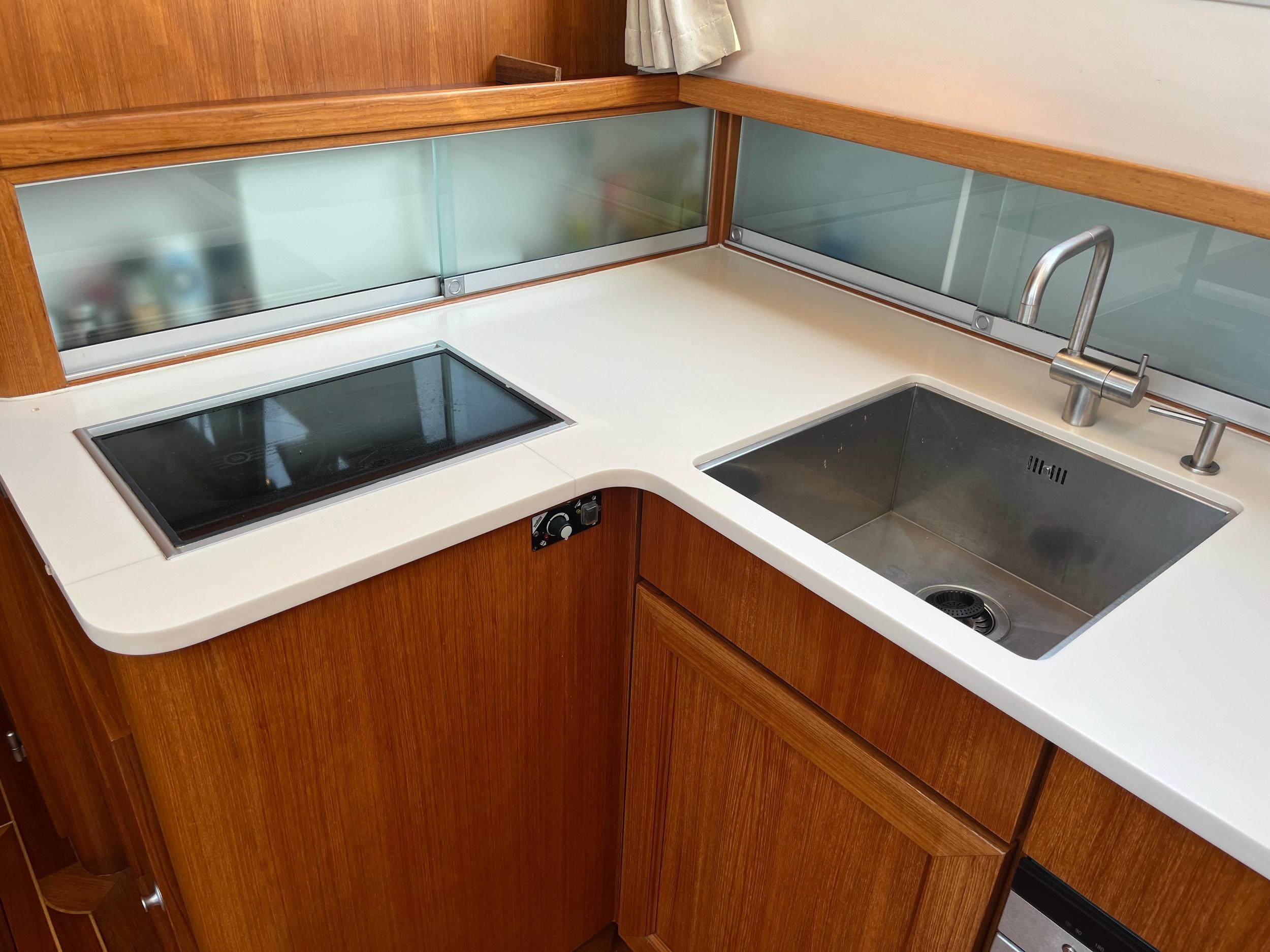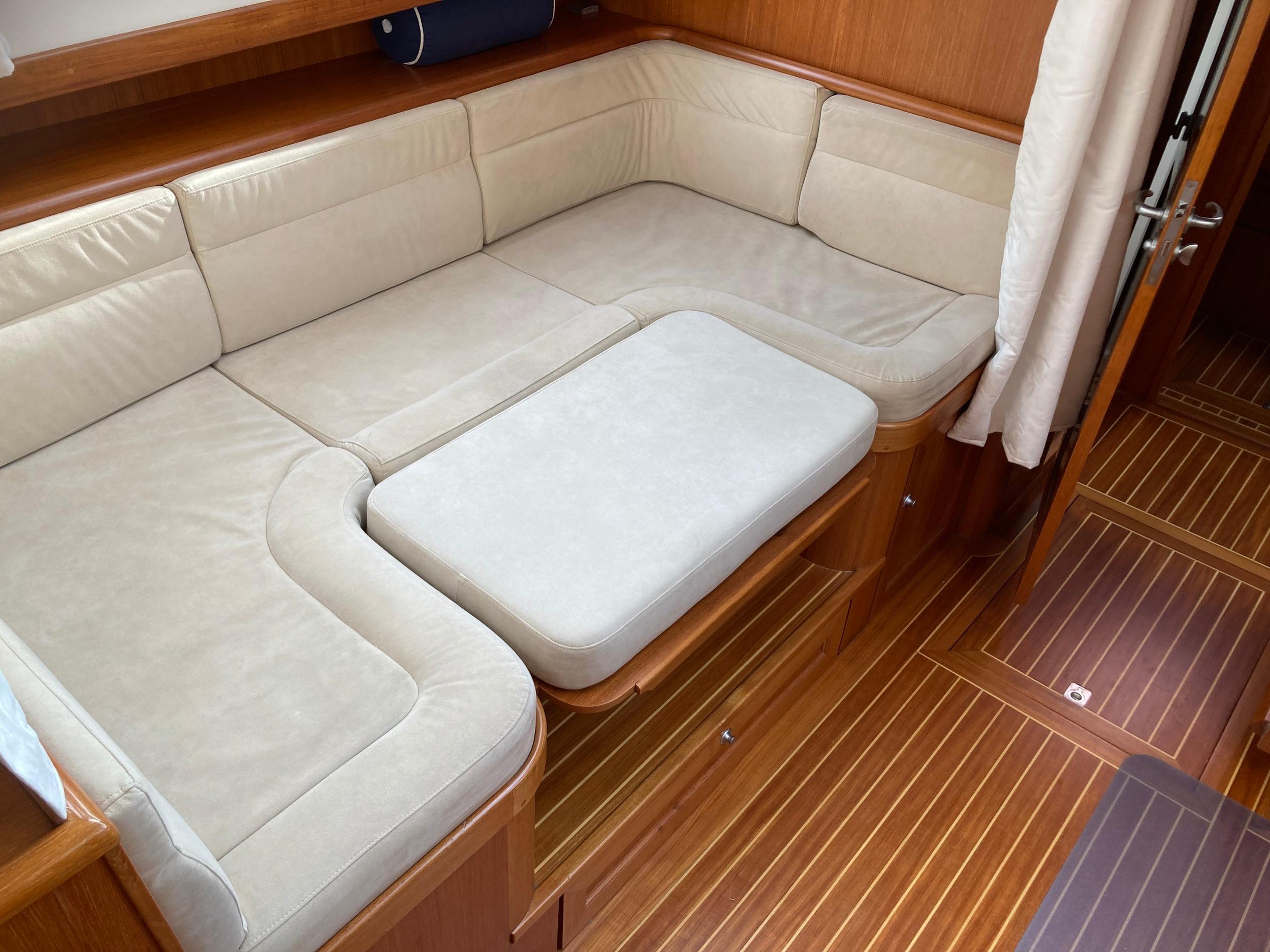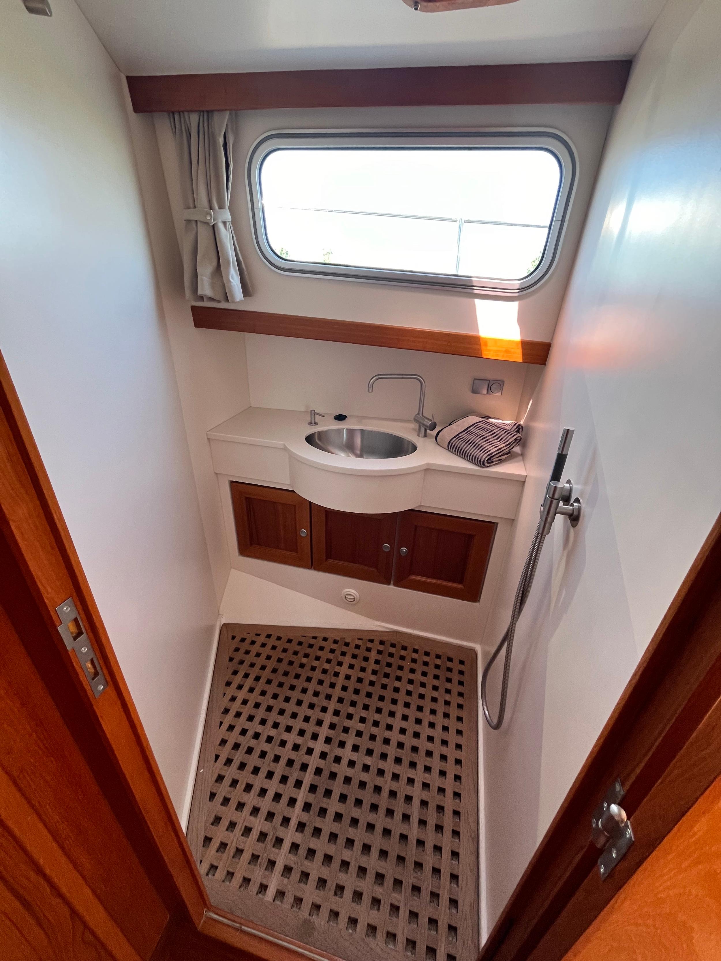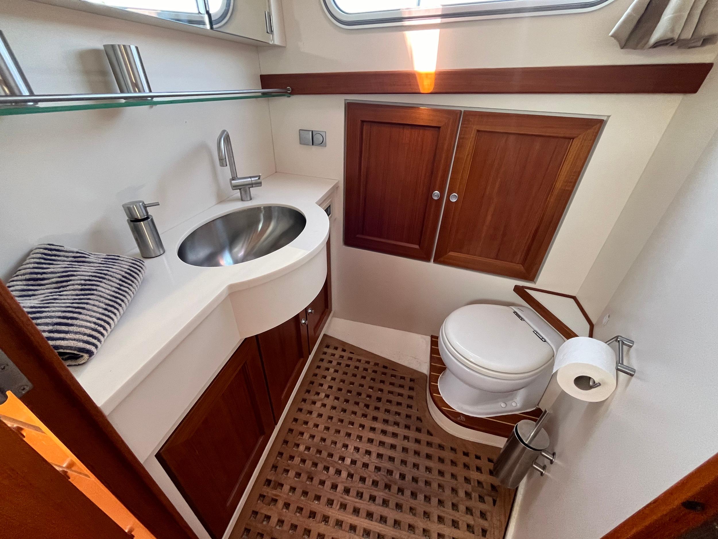 Webasto hetelucht verwarming. Goed geïsoleerd en daardoor ideaal voor alle seizoenen. Fraaie keuken met Siemens apparatuur en rolkast. Massief teakhouten vloeren en deurlijsten van massief teakhout. Seperate douche en toilet. Ruime mastercabin. Er is in het hele jacht veel kastruimte. Onder de salon is een berging met daarin een was/droogmachine.