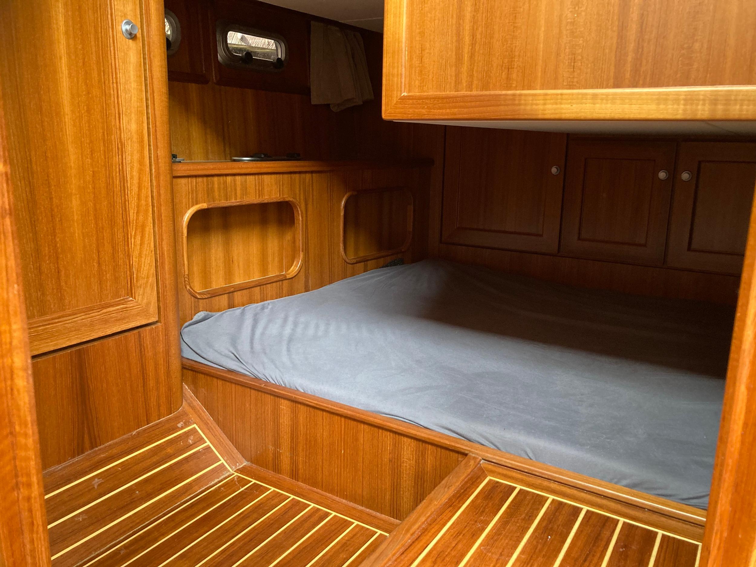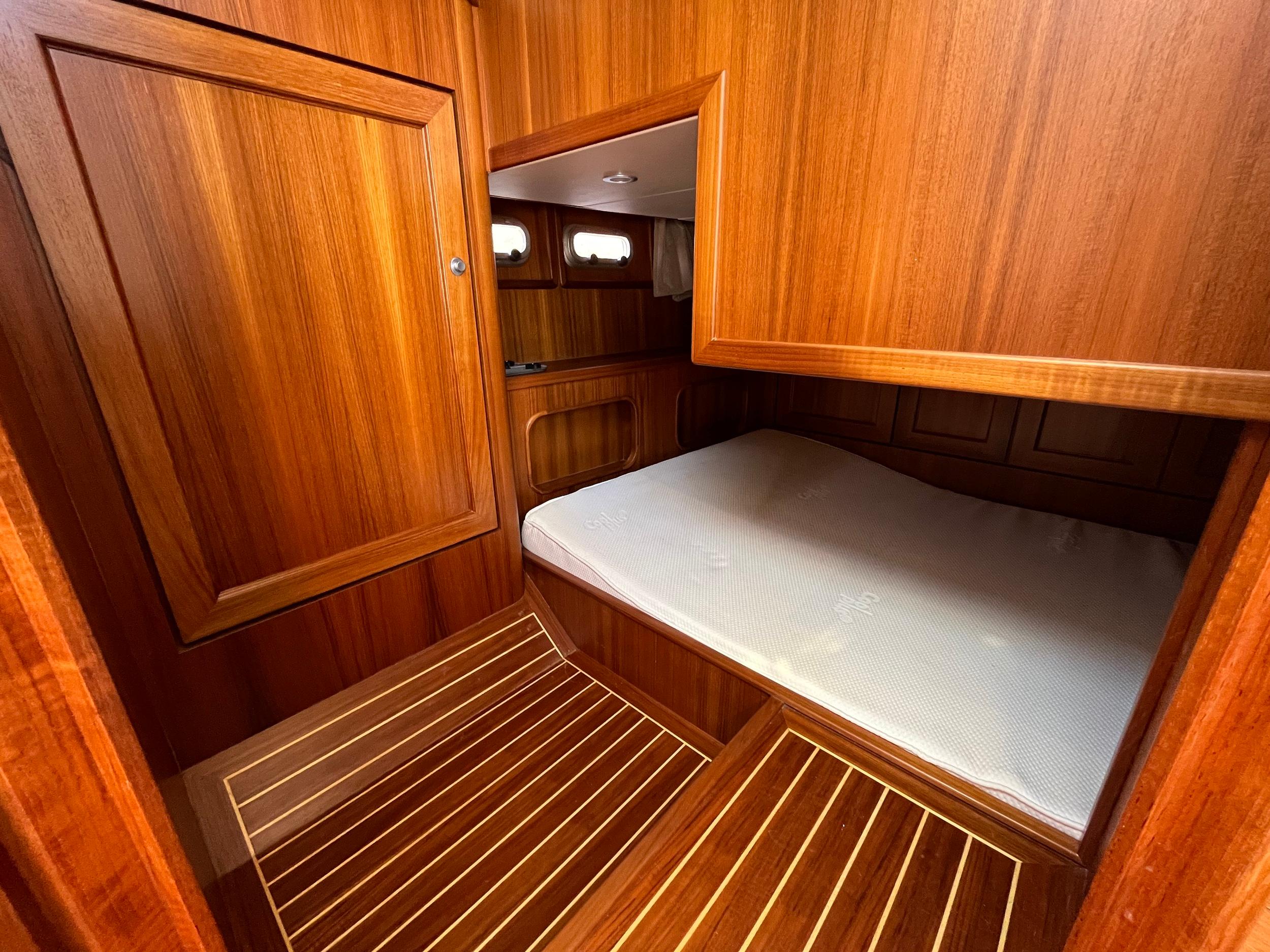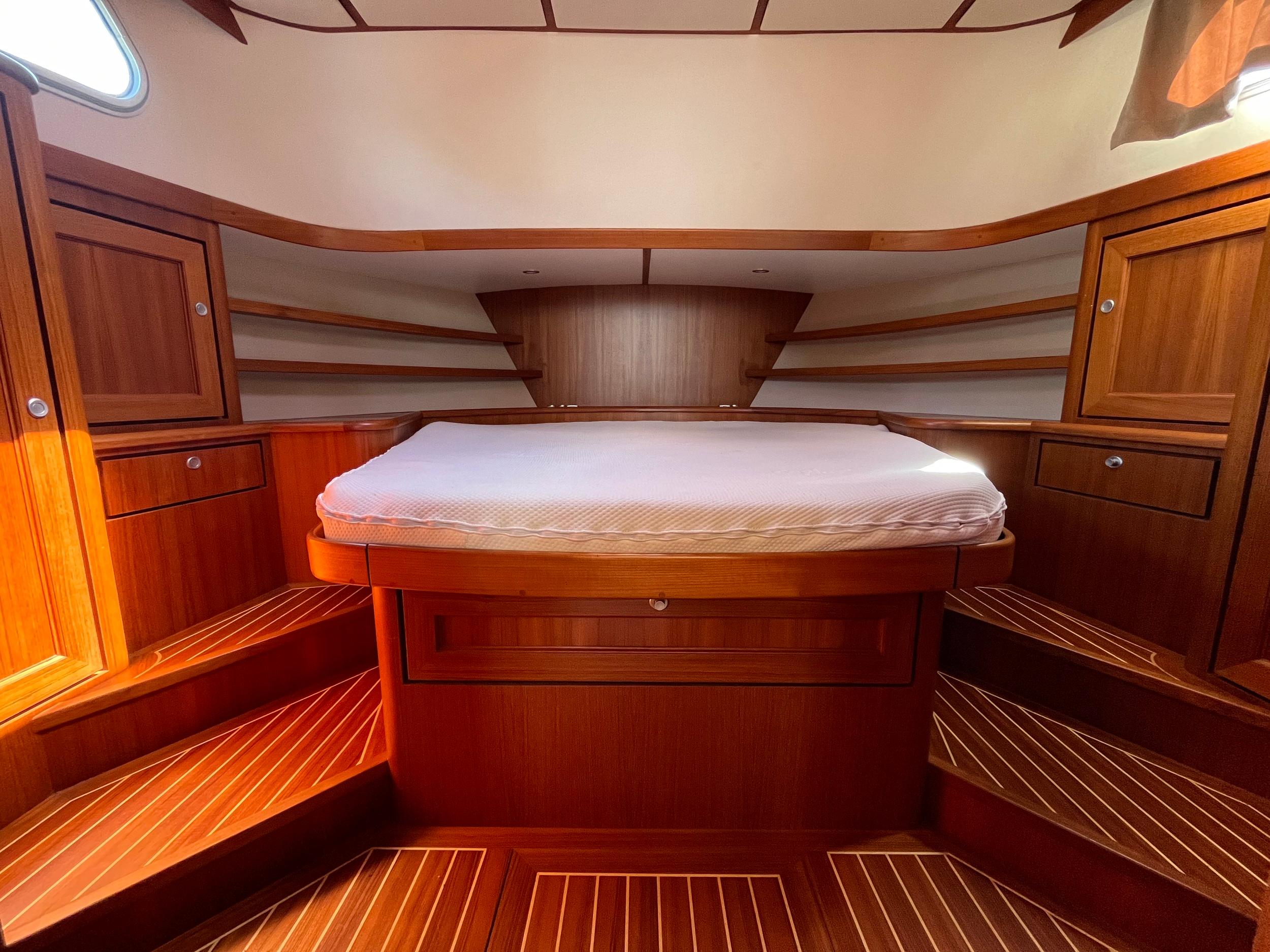 Grote mastercabin met centraal geplaatst bed. Gastenhut onder de salon.