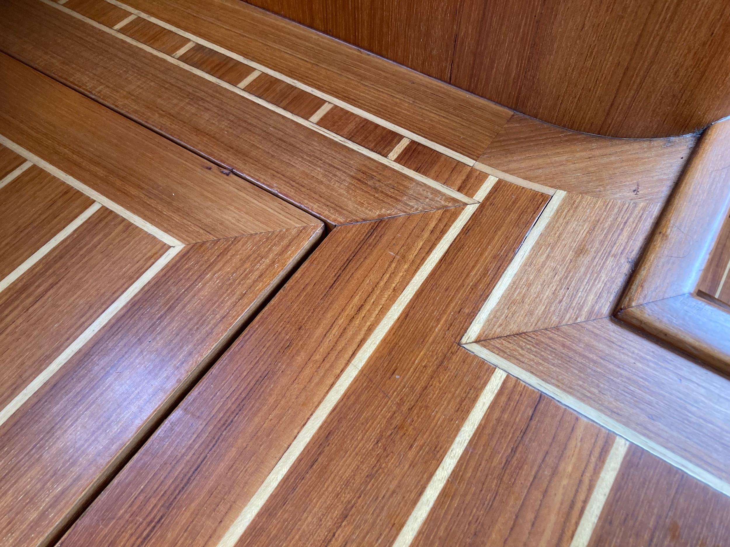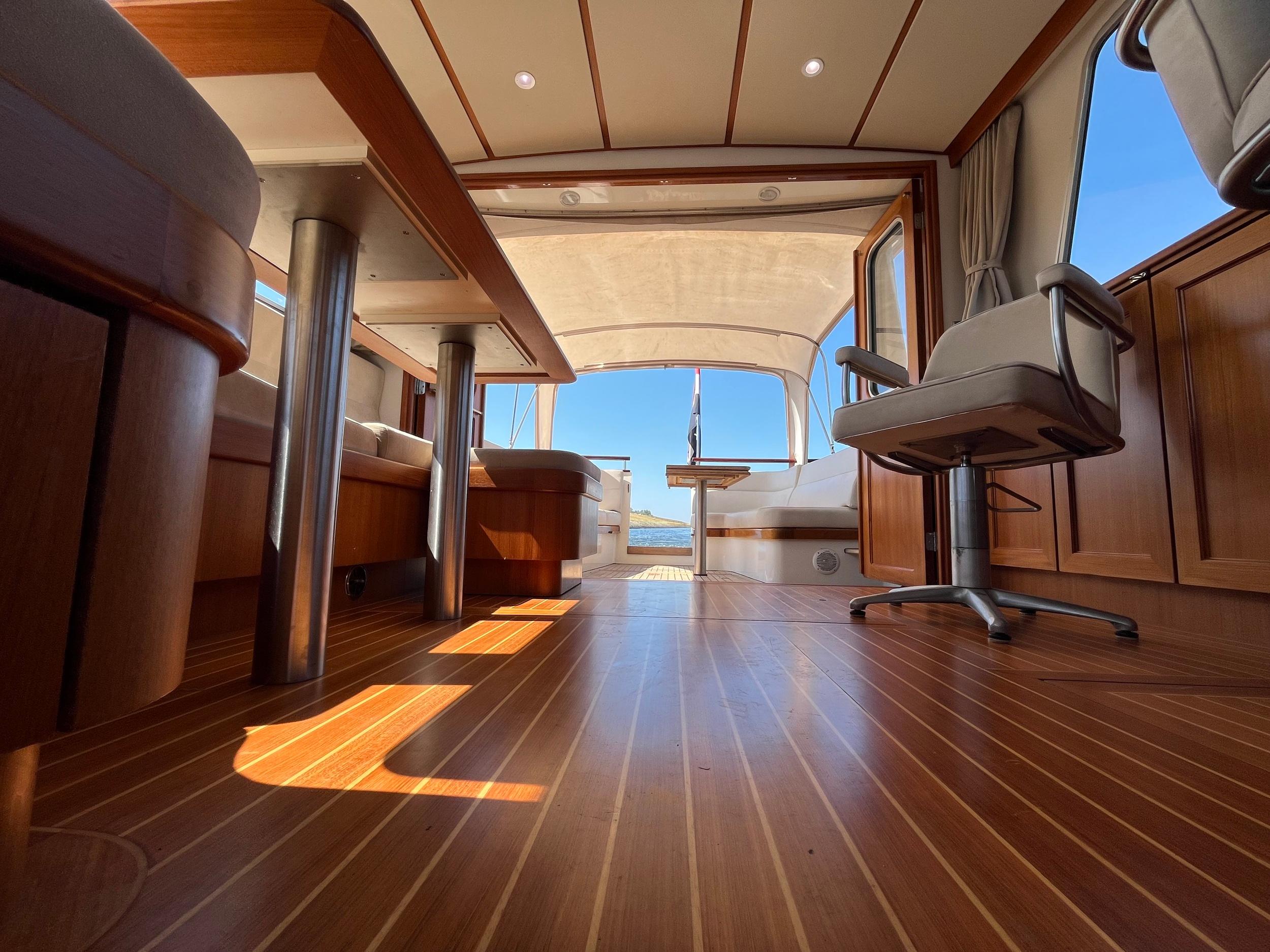 Teakhouten interieur met fraai teakhouten vloer.