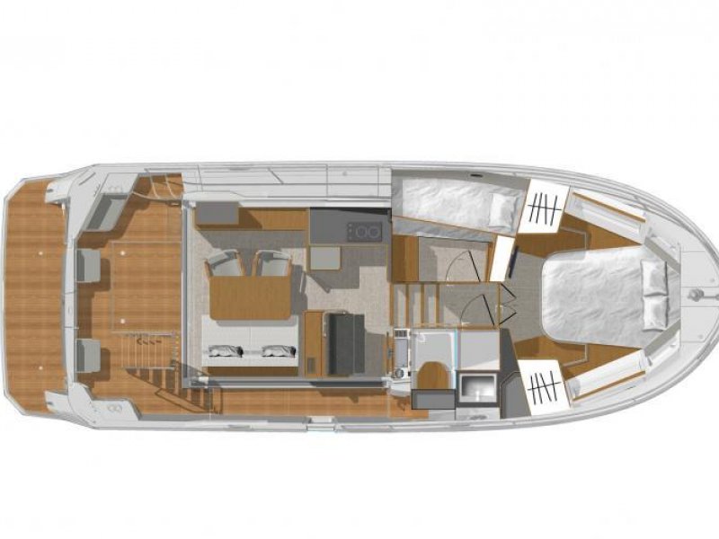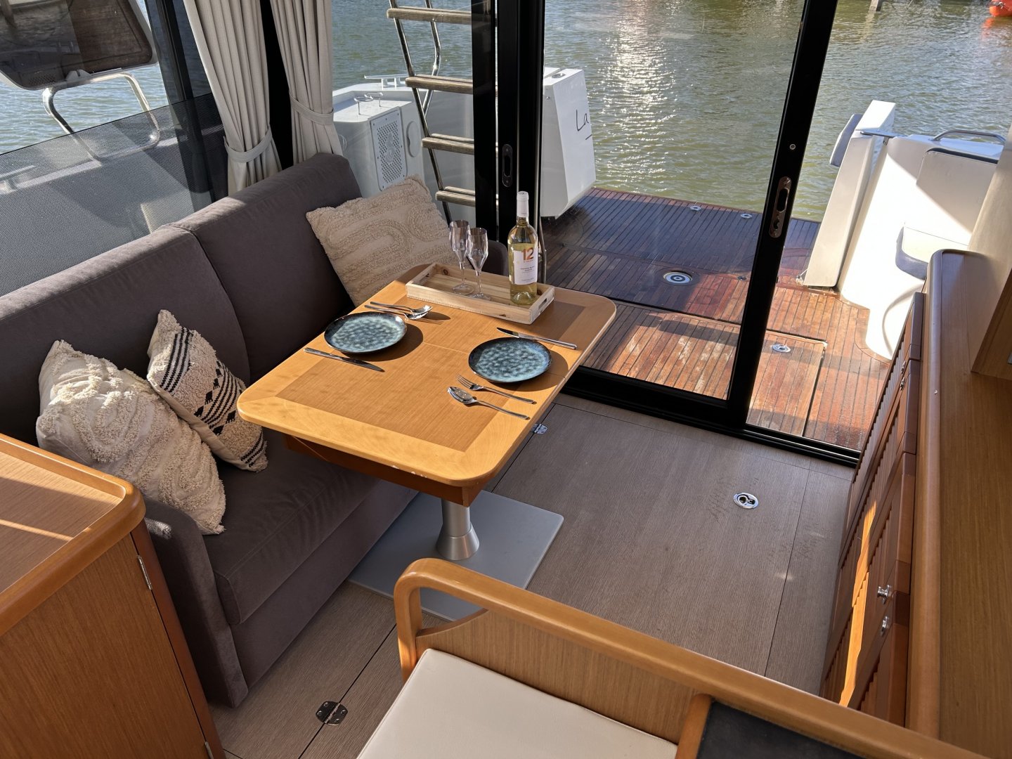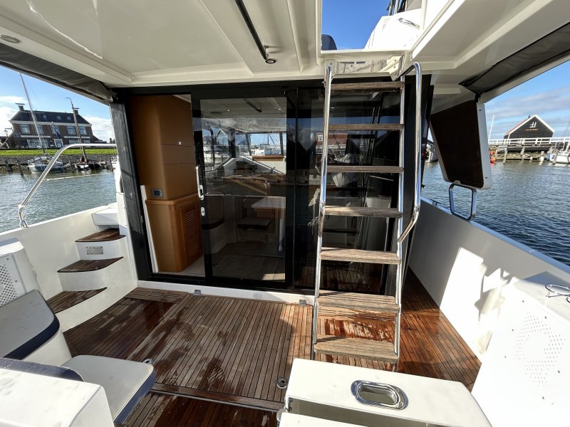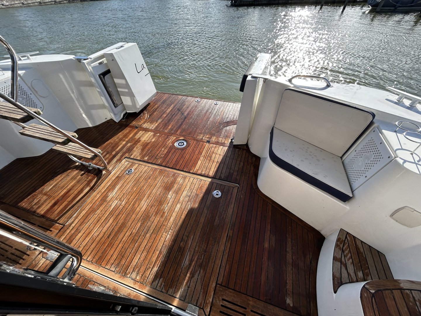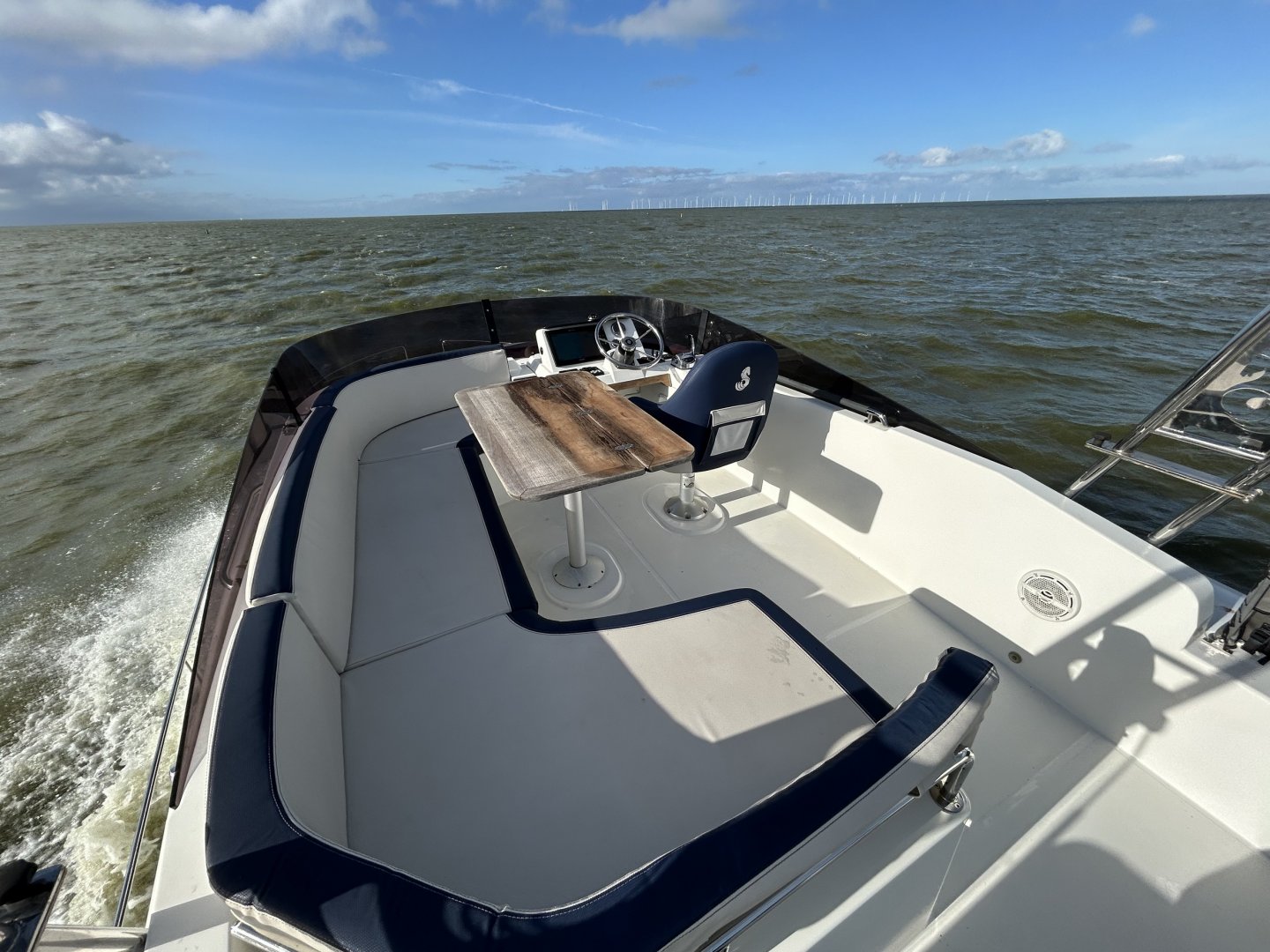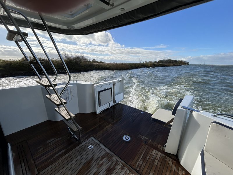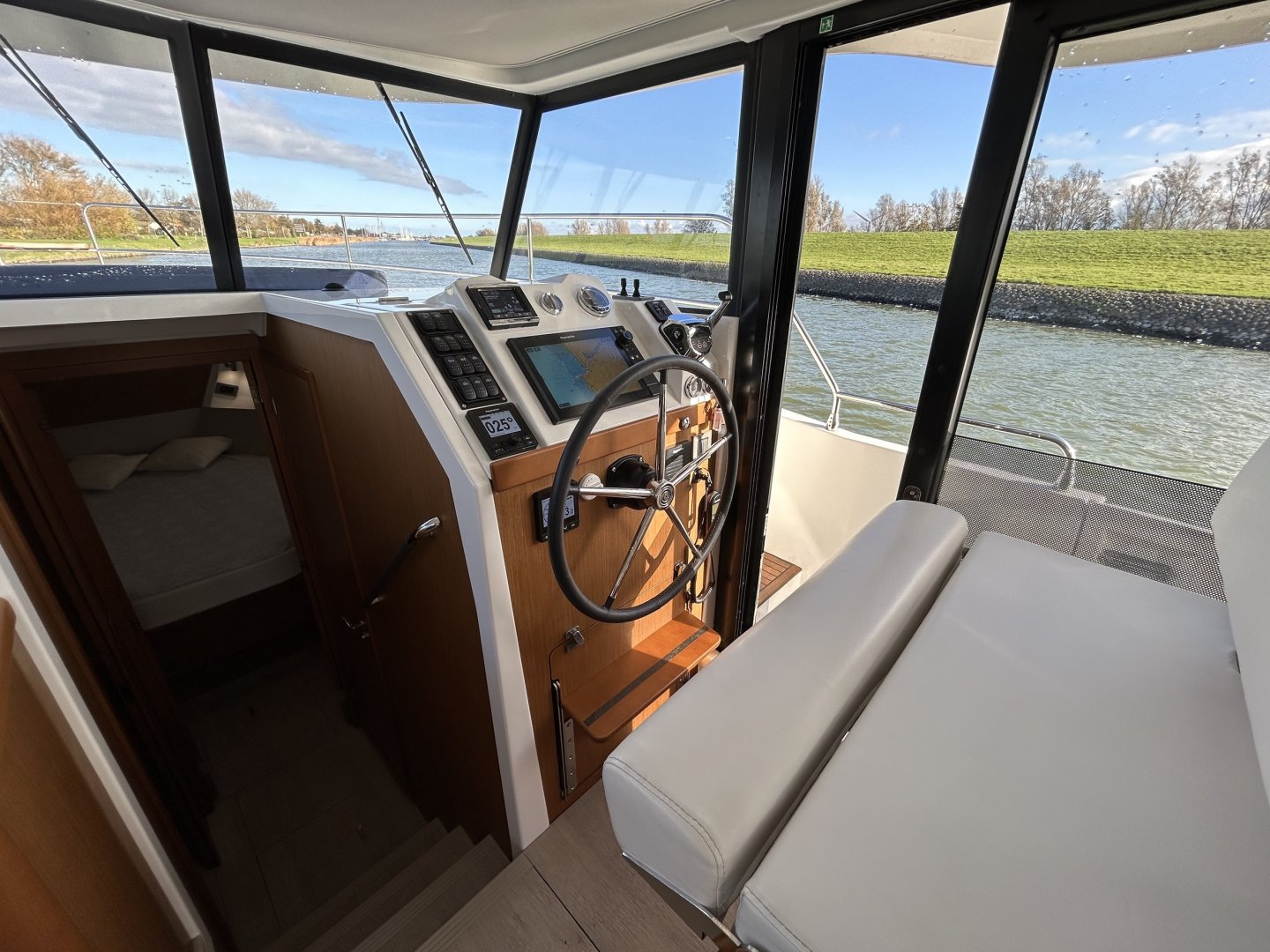 Ruim, licht en slim ontworpen interieur. Binnen in de salon valt direct het open en lichte karakter op, dankzij de grote panoramische ramen. Het interieur is uitgevoerd met warme houtaccenten en praktische opbergruimte, gecombineerd met een modern design.Gezellige salon met bank (om te bouwen tot extra bed). Volledig uitgeruste keuken met koelkast, oven, fornuis en spoelbak. Ruime master cabin met eilandbed en veel kastruimte. Tweede cabine met stapelbed – ideaal voor gasten of kinderen. Natte cel met elektrisch toilet en aparte douche. Grote schuifdeuren naar het achterdek naadloze overgang tussen binnen en buiten. Flybridge: comfort op het hoogste niveau. De flybridge is een van de paradepaardjes van deze Swift Trawler. Deze biedt niet alleen een tweede stuurstand met uitstekend zicht rondom, maar ook een royale zitbank, tafel en ruimte om te genieten van de zon en frisse lucht. Dankzij de slimme indeling blijft dit een volwaardig leefdek, zelfs tijdens het varen.