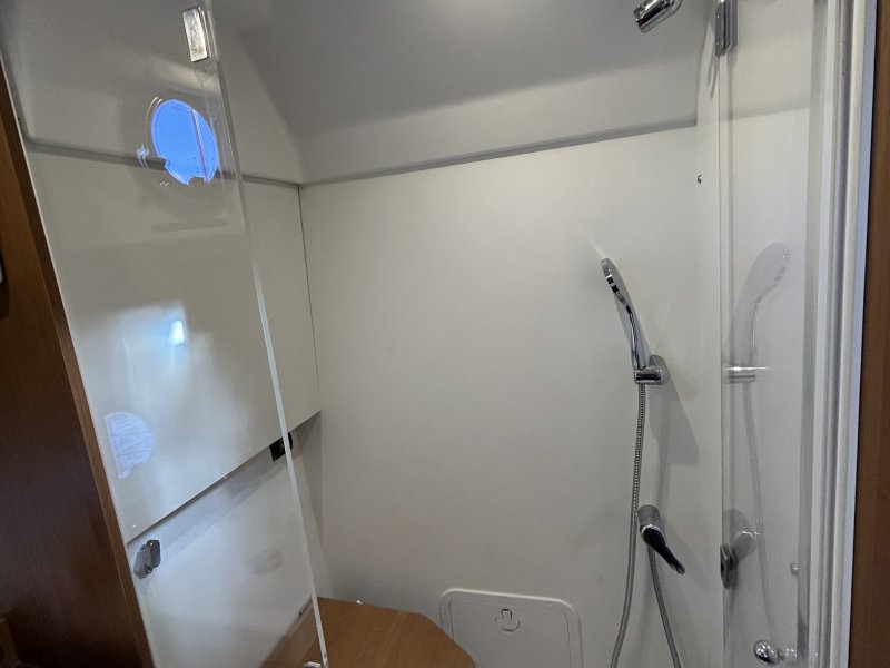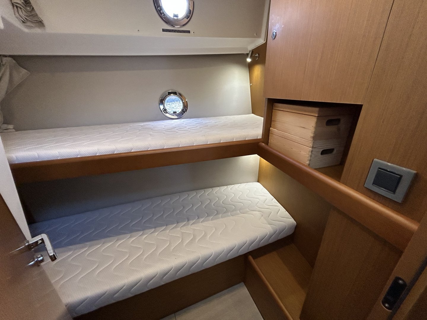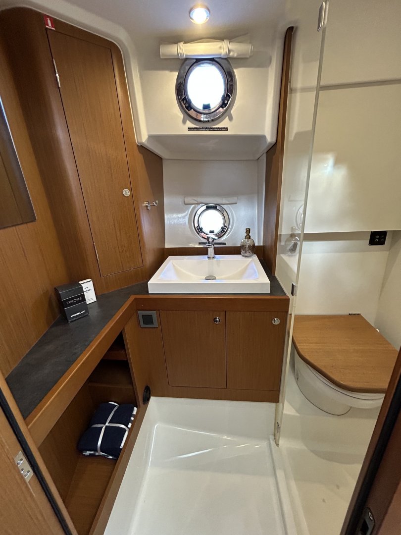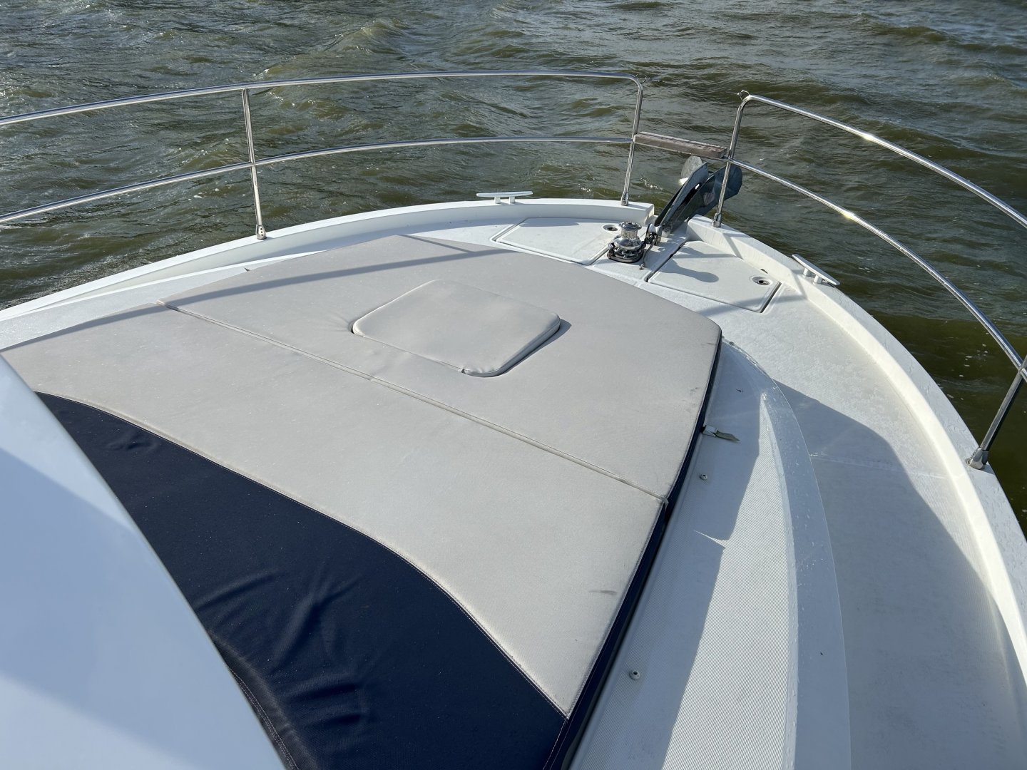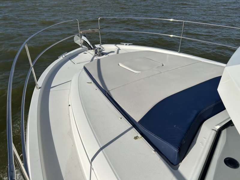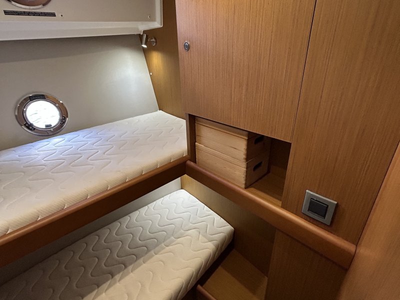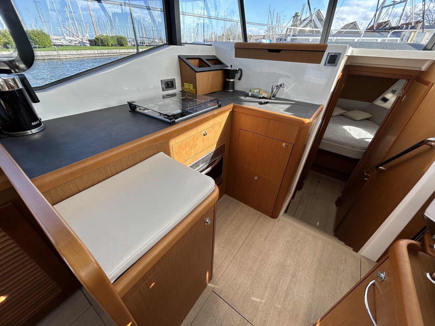 Ruim, licht en slim ontworpen interieur. Binnen in de salon valt direct het open en lichte karakter op, dankzij de grote panoramische ramen. Het interieur is uitgevoerd met warme houtaccenten en praktische opbergruimte, gecombineerd met een modern design.Gezellige salon met bank (om te bouwen tot extra bed). Volledig uitgeruste keuken met koelkast, oven, fornuis en spoelbak. Ruime master cabin met eilandbed en veel kastruimte. Tweede cabine met stapelbed – ideaal voor gasten of kinderen. Natte cel met elektrisch toilet en aparte douche. Grote schuifdeuren naar het achterdek naadloze overgang tussen binnen en buiten. Flybridge: comfort op het hoogste niveau. De flybridge is een van de paradepaardjes van deze Swift Trawler. Deze biedt niet alleen een tweede stuurstand met uitstekend zicht rondom, maar ook een royale zitbank, tafel en ruimte om te genieten van de zon en frisse lucht. Dankzij de slimme indeling blijft dit een volwaardig leefdek, zelfs tijdens het varen.