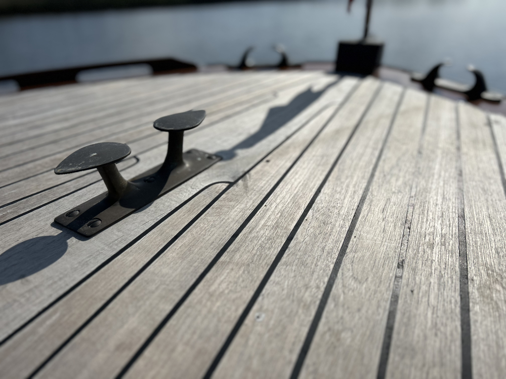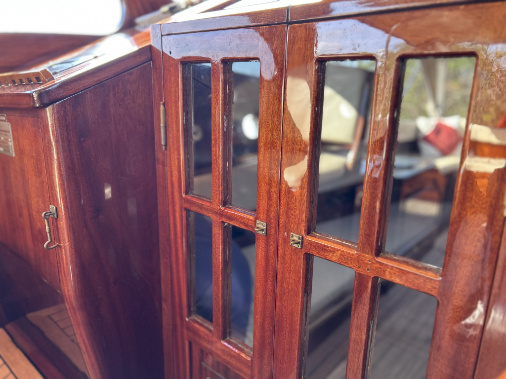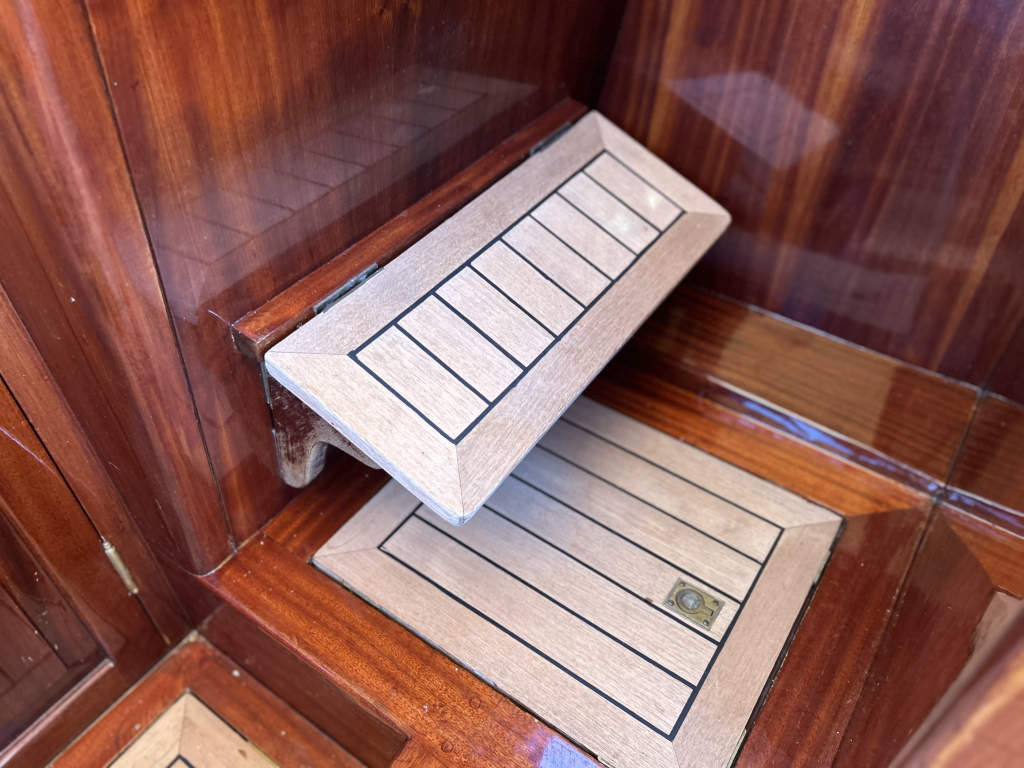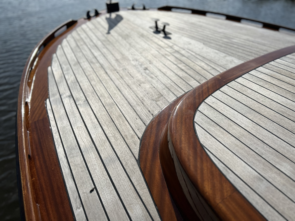 Sfeervol betimmerd met gelakt mahonie en teakhouten vloerdelen.