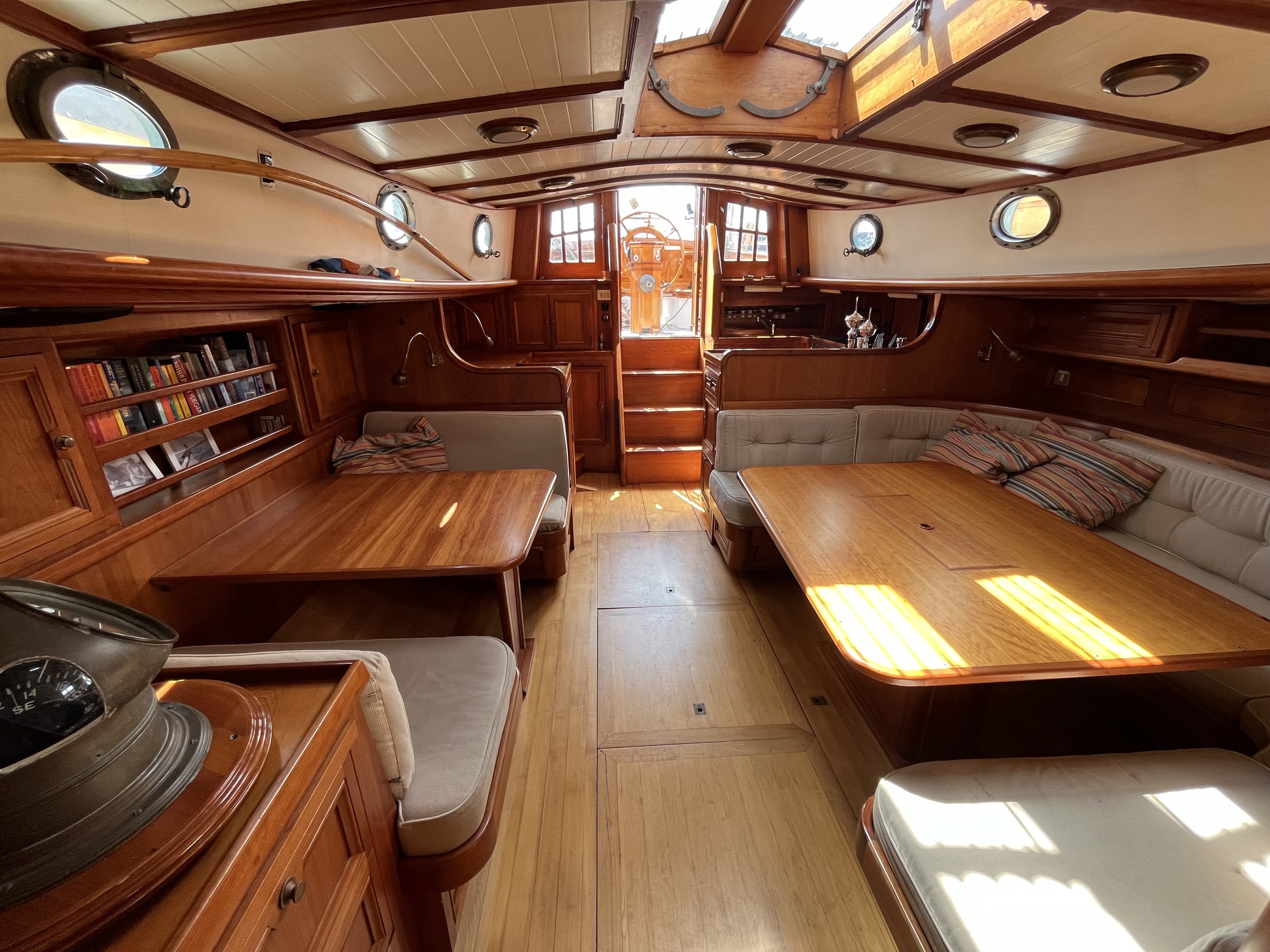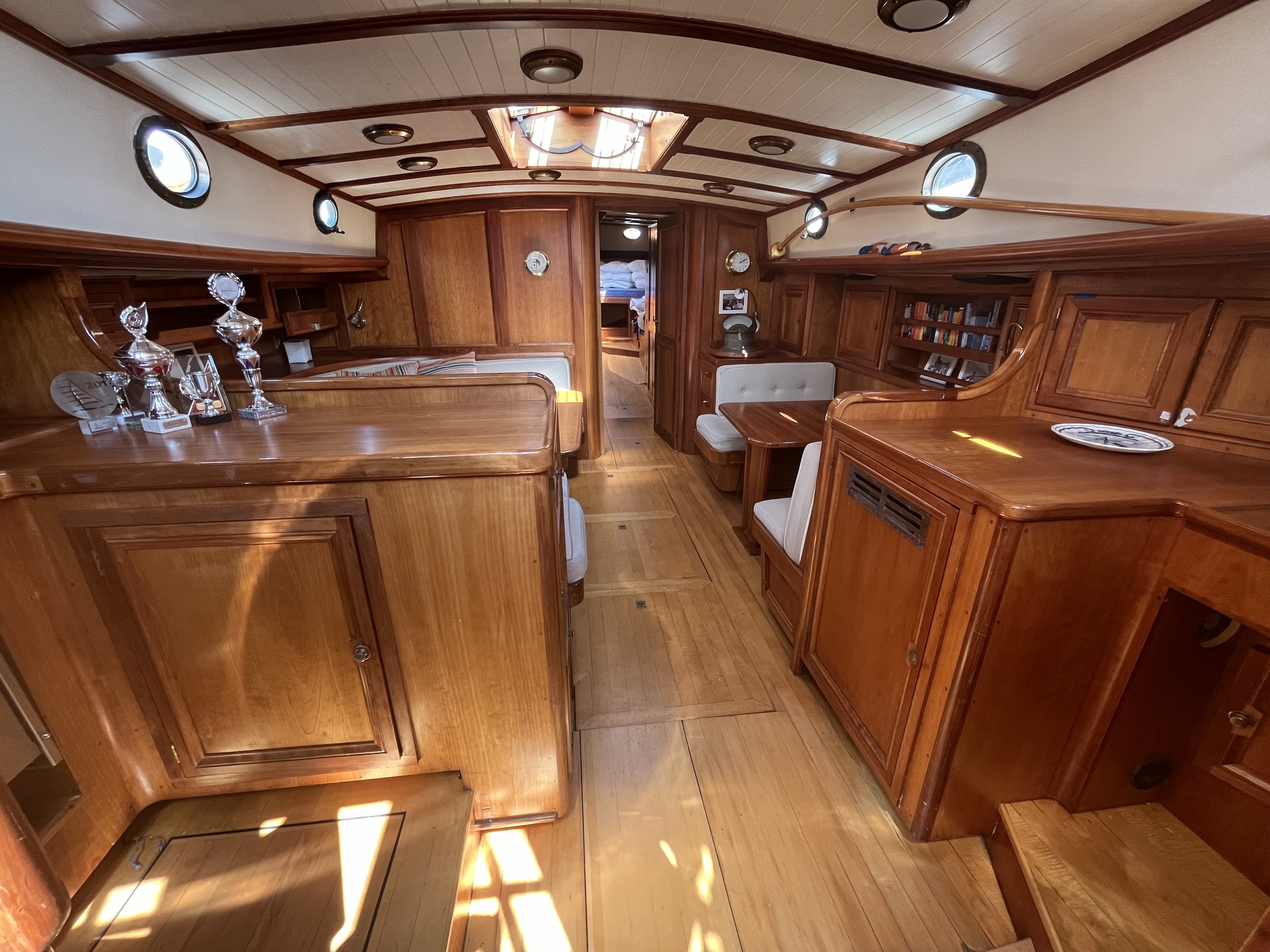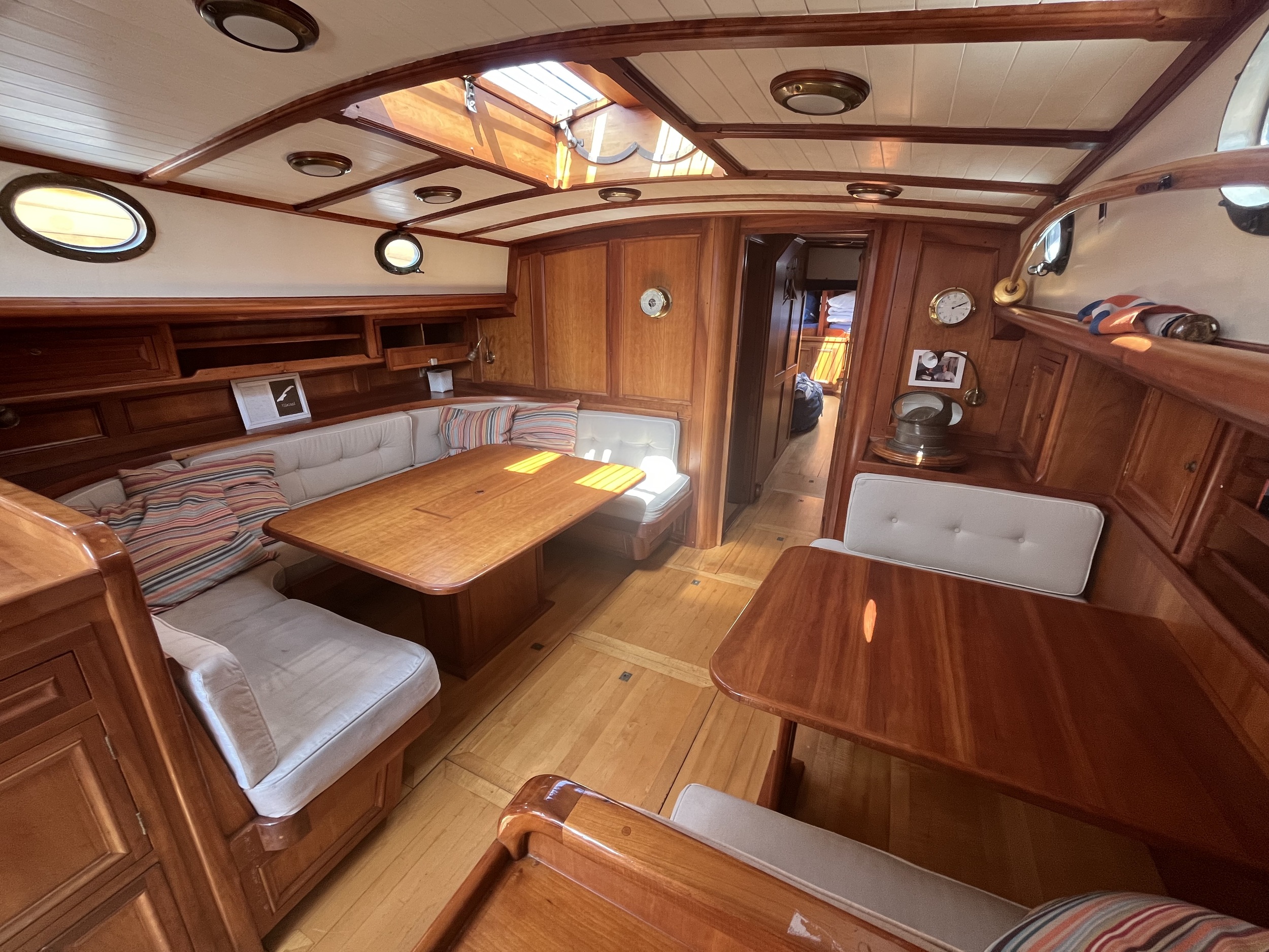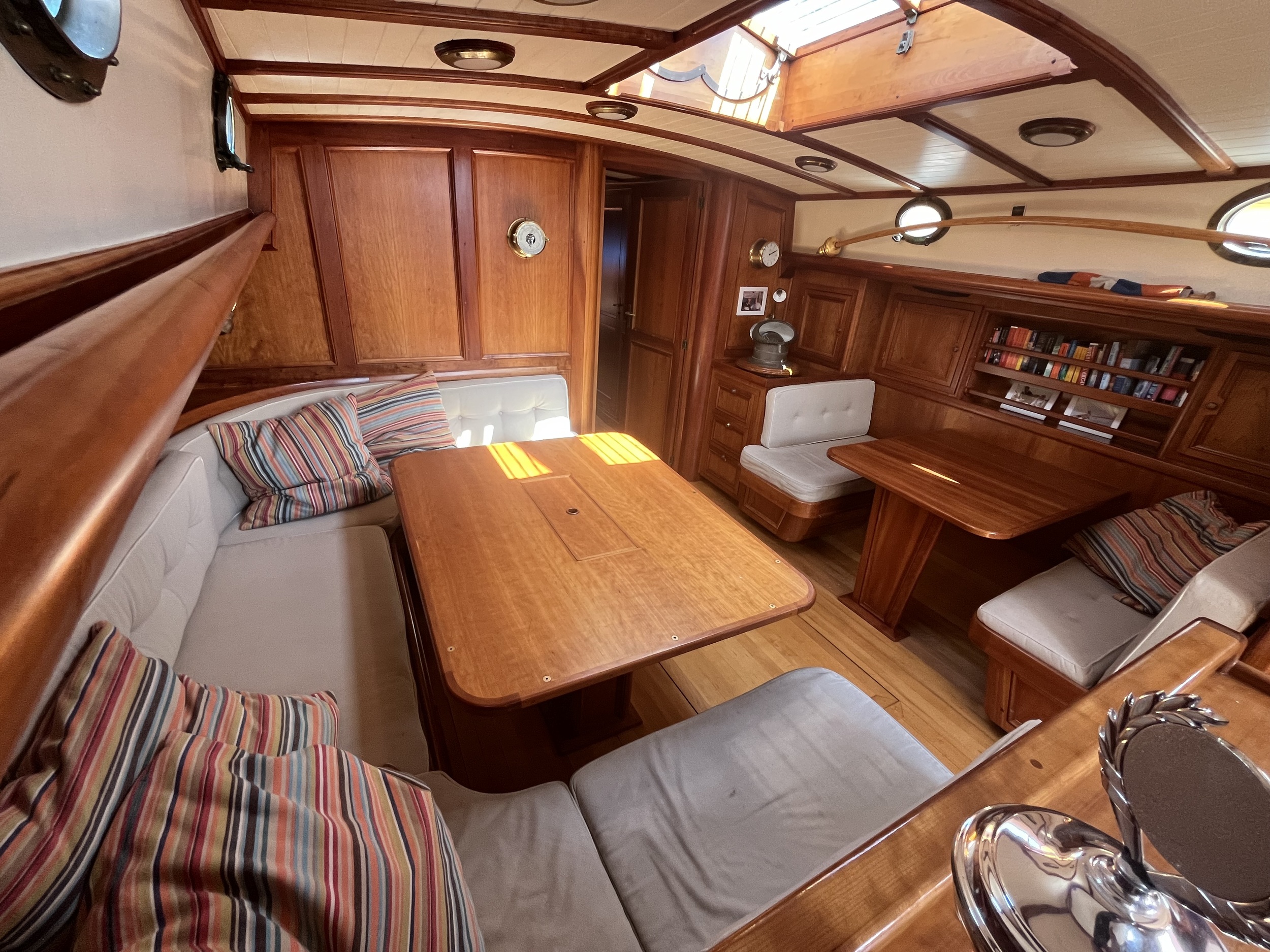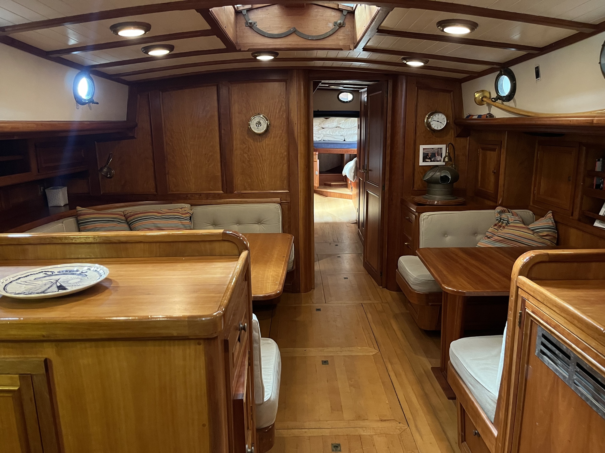 Het kersenhouten interieur is volgens de hoogste standaard gemaakt door de firma Dörr te Lemmer. De kombuis is ruim van opzet en uitgevoerd met cardanisch opgehangen Force 10 rvs fornuis met oven. Aan stuurboord is de navigatiehoek met schakelpaneel. In de salon is aan beide kanten een zitplaats met veel kastruimte. De massief ingelegde essenhouten vloer maakt het interieur sfeervol maar toch ook licht. De mastercabin met spoelbak heeft royale stahoogte en is voorzien van 2 persoonsbed met lattenbodem. In de doorgang is een separate douche en toilet. In het voorschip is een ruime 4 persoons hut met fraaie koekoek.