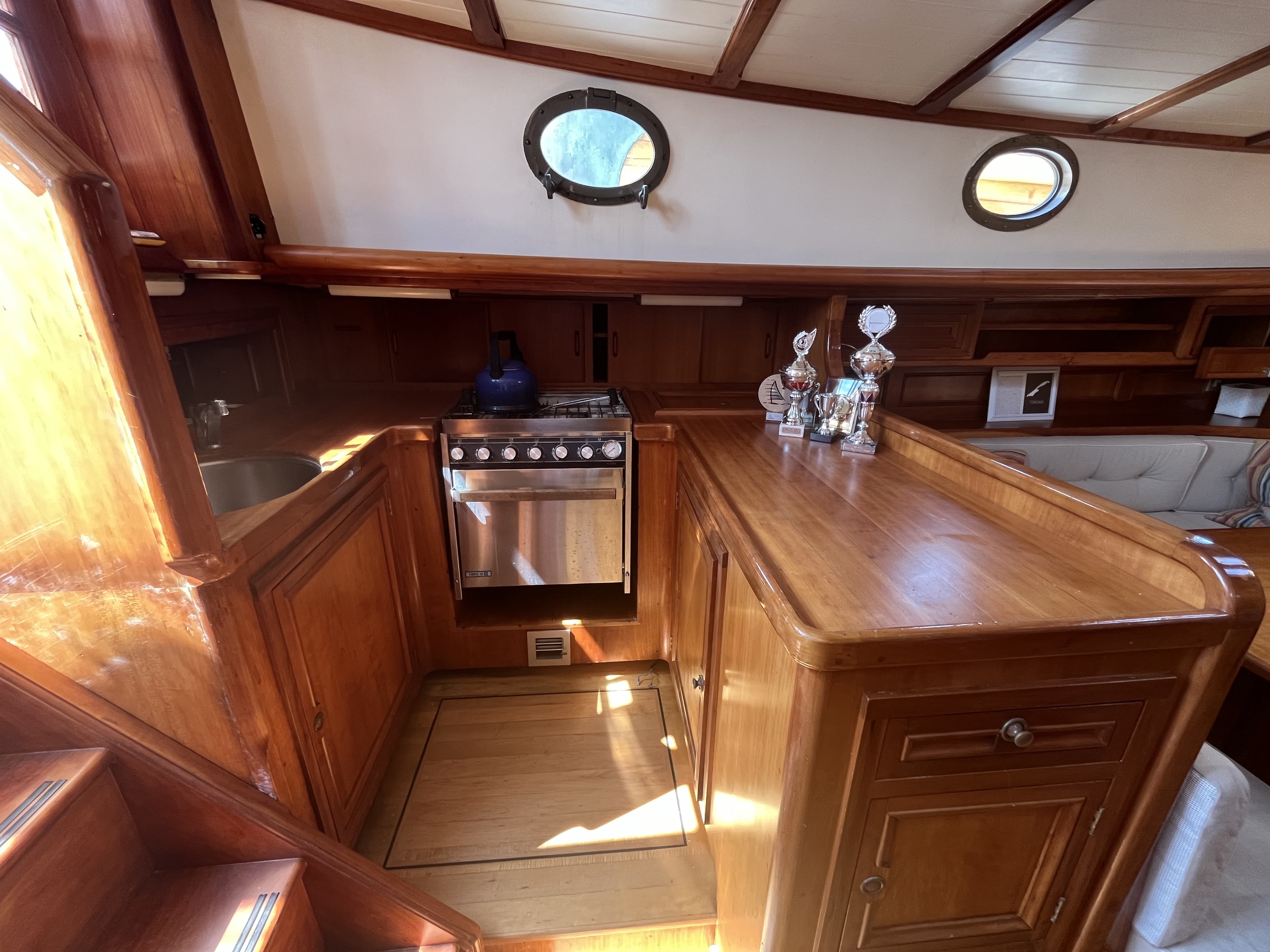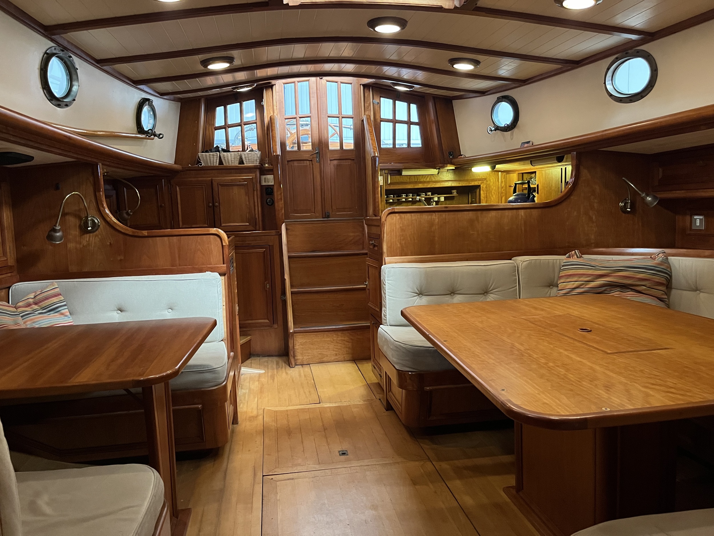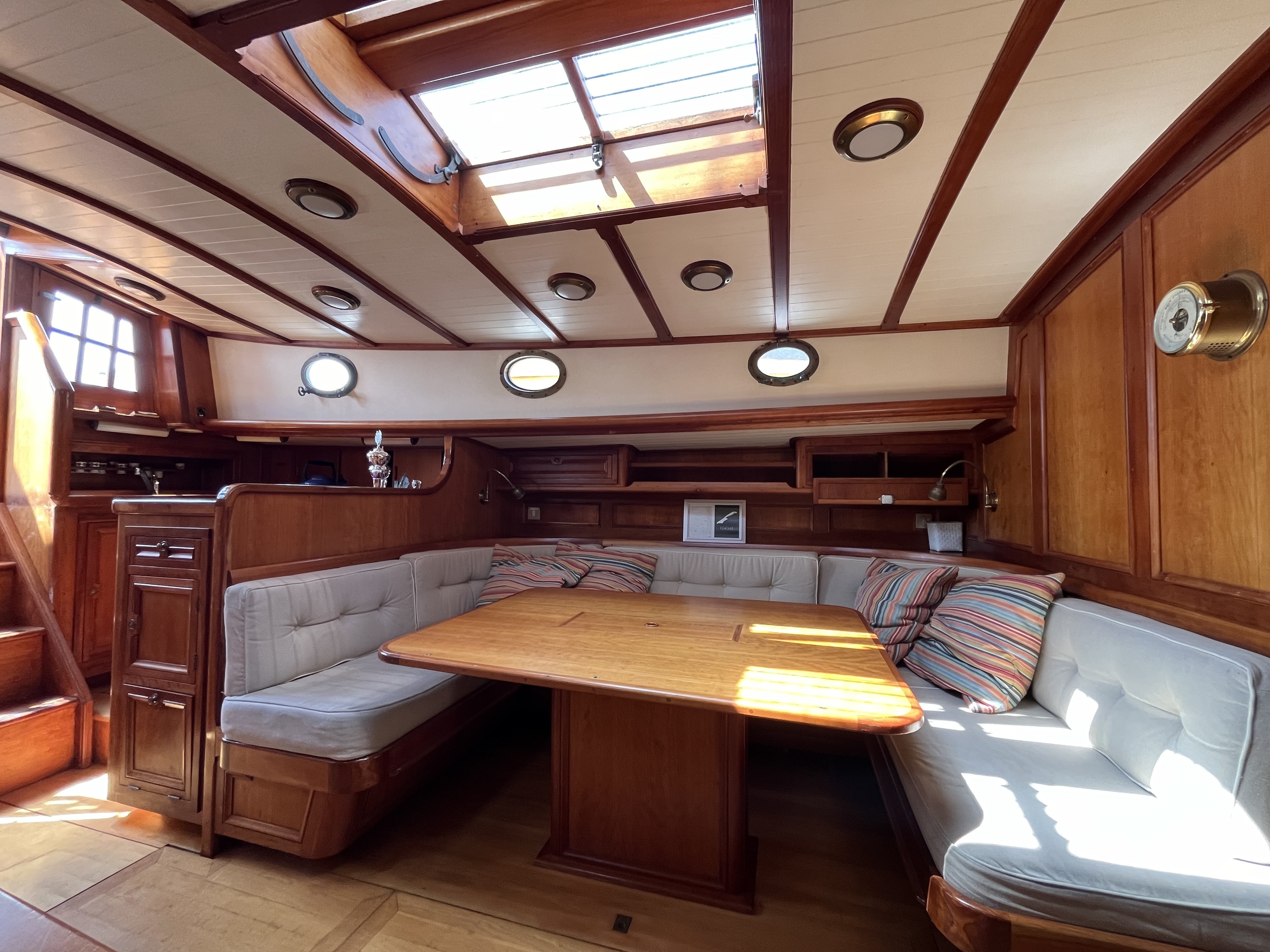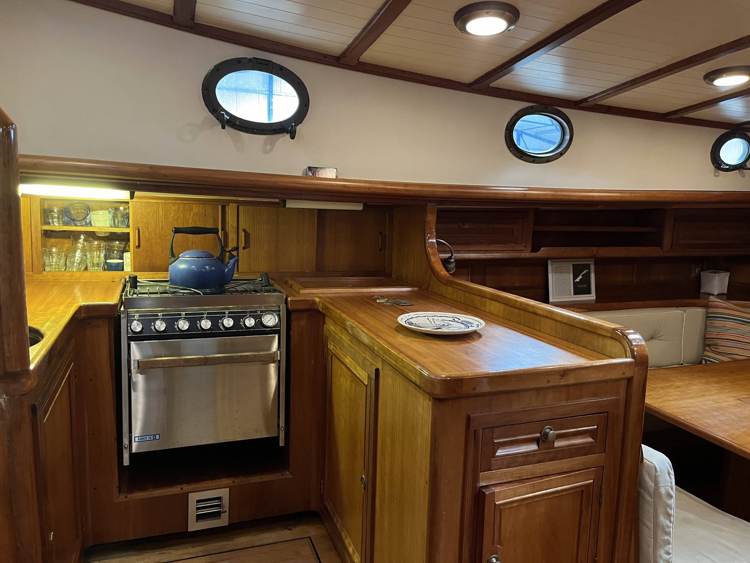 Het kersenhouten interieur is volgens de hoogste standaard gemaakt door de firma Dörr te Lemmer. De kombuis is ruim van opzet en uitgevoerd met cardanisch opgehangen Force 10 rvs fornuis met oven. Aan stuurboord is de navigatiehoek met schakelpaneel. In de salon is aan beide kanten een zitplaats met veel kastruimte. De massief ingelegde essenhouten vloer maakt het interieur sfeervol maar toch ook licht. De mastercabin met spoelbak heeft royale stahoogte en is voorzien van 2 persoonsbed met lattenbodem. In de doorgang is een separate douche en toilet. In het voorschip is een ruime 4 persoons hut met fraaie koekoek.