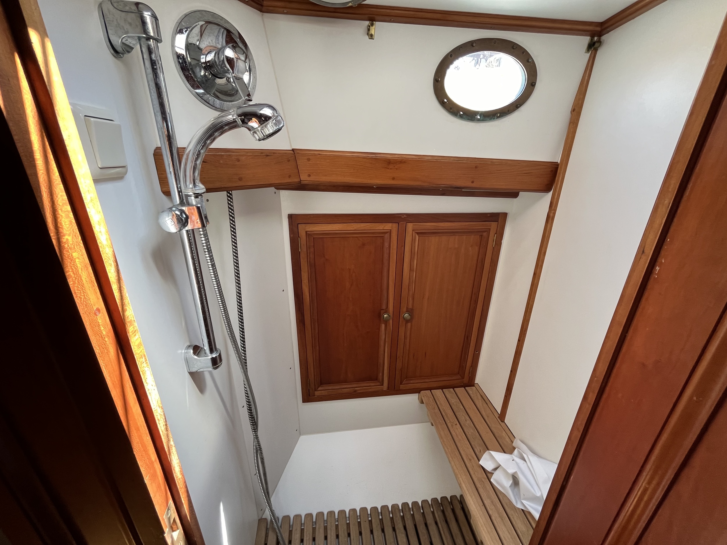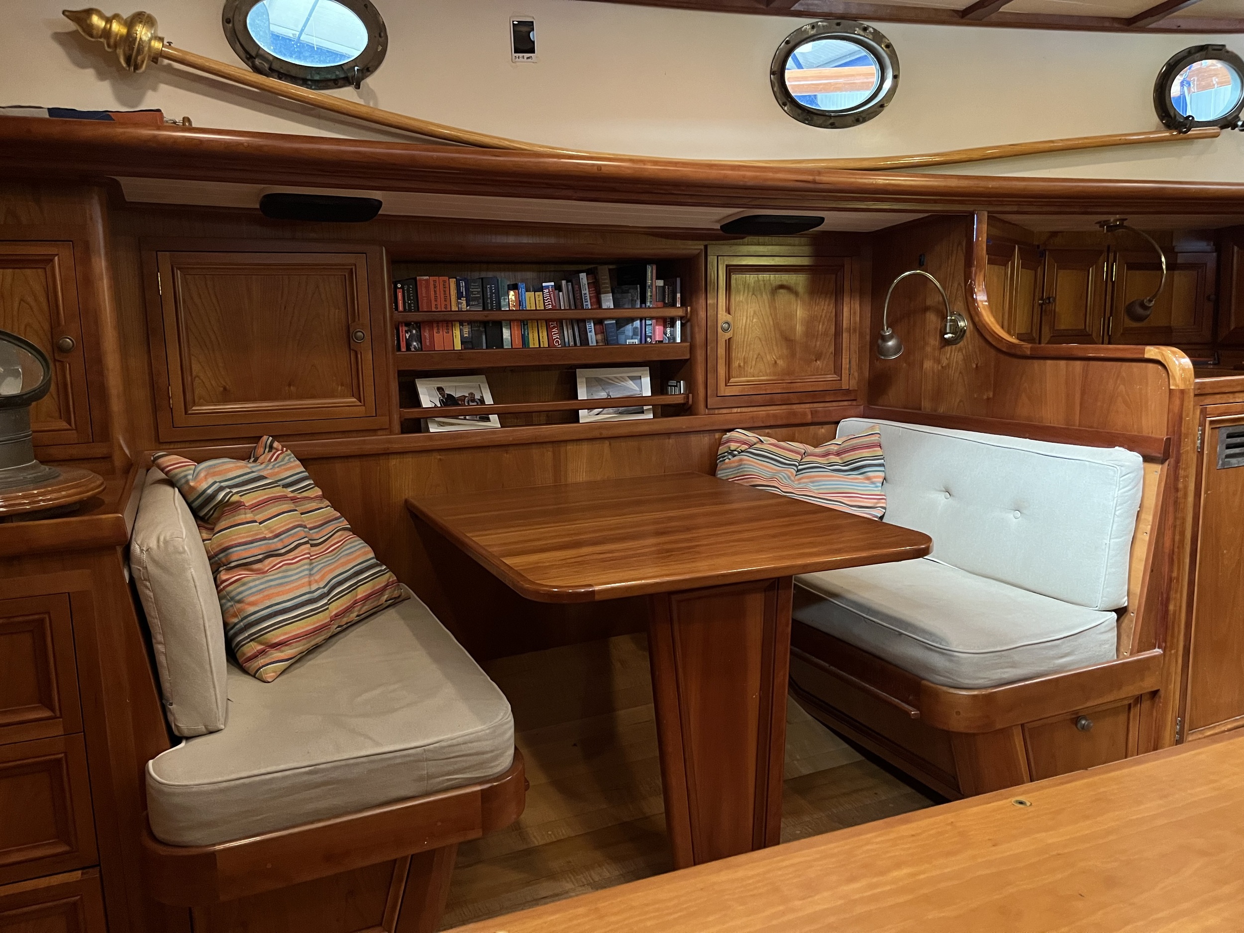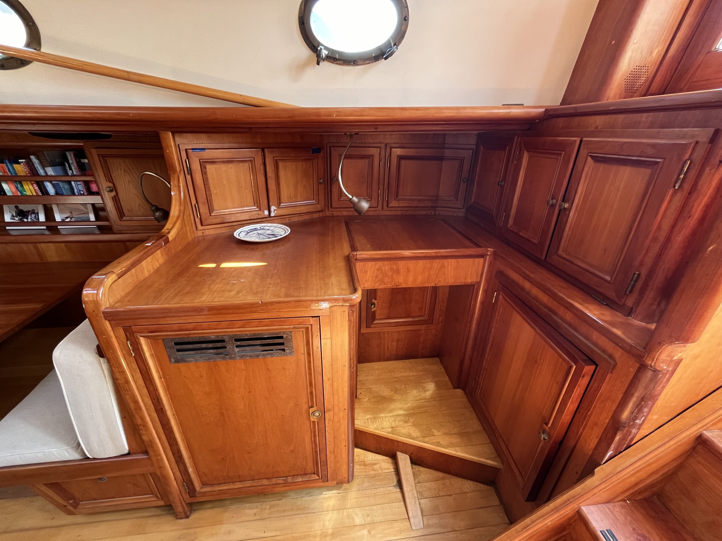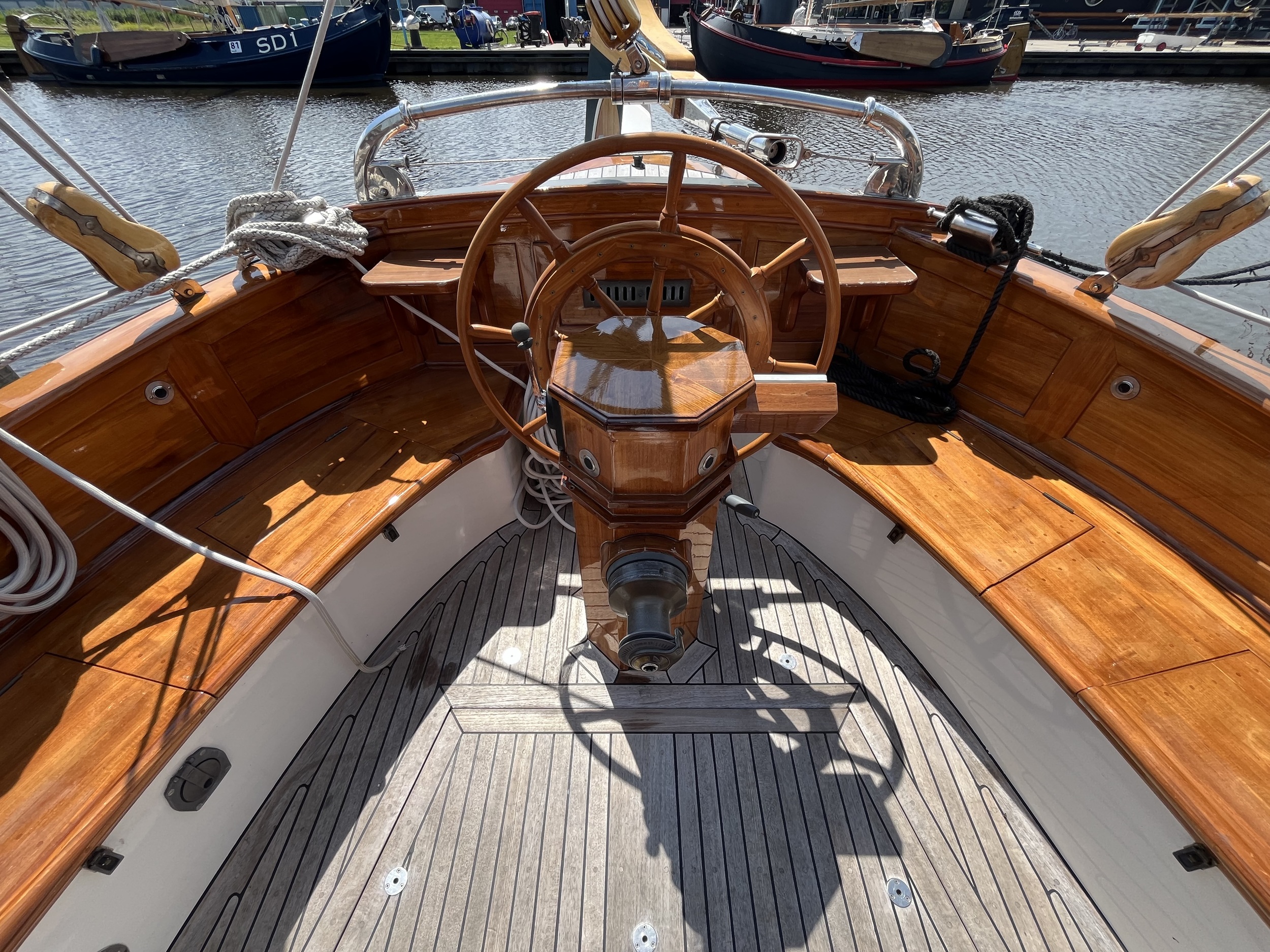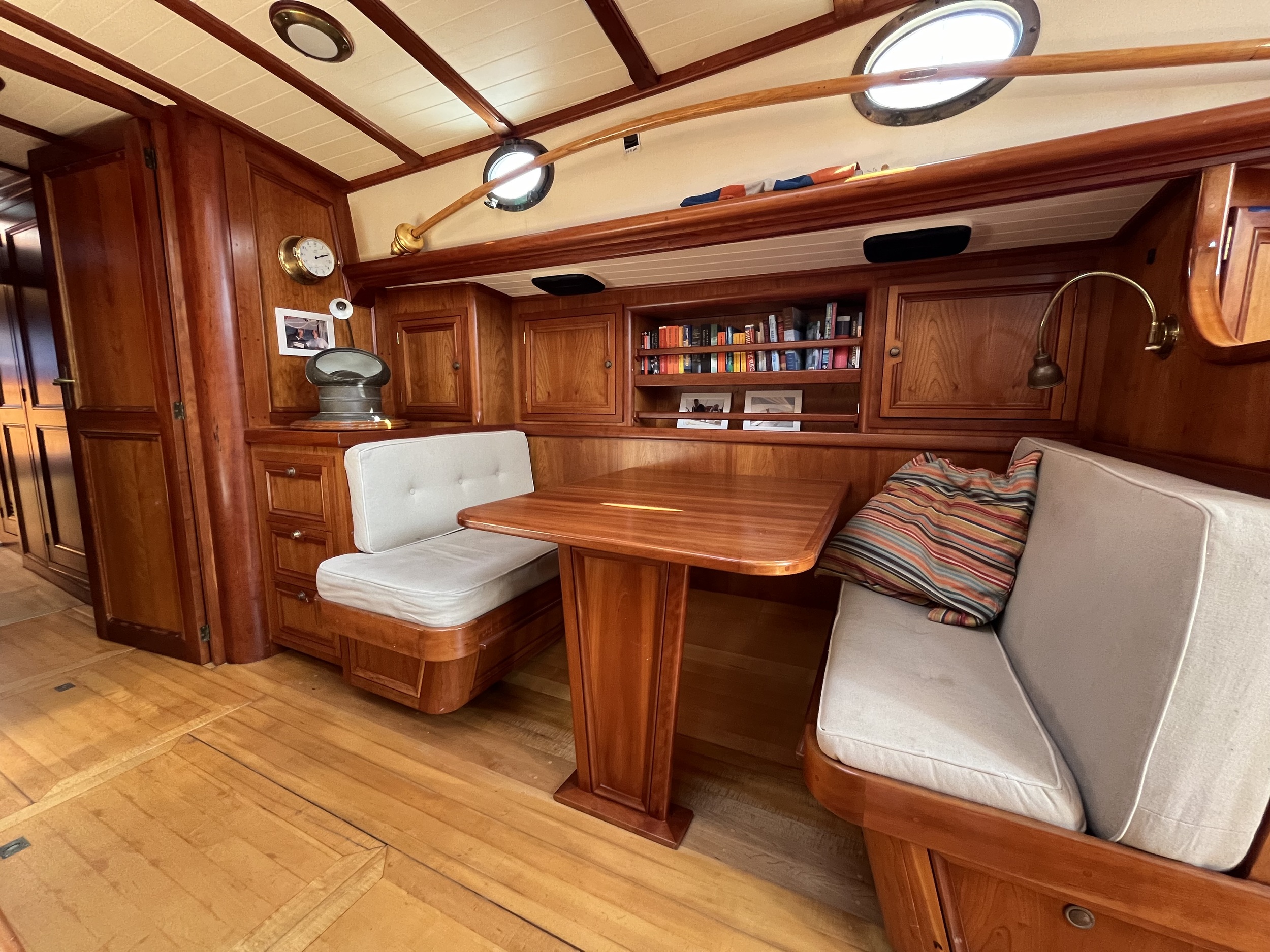 Het kersenhouten interieur is volgens de hoogste standaard gemaakt door de firma Dörr te Lemmer. De kombuis is ruim van opzet en uitgevoerd met cardanisch opgehangen Force 10 rvs fornuis met oven. Aan stuurboord is de navigatiehoek met schakelpaneel. In de salon is aan beide kanten een zitplaats met veel kastruimte. De massief ingelegde essenhouten vloer maakt het interieur sfeervol maar toch ook licht. De mastercabin met spoelbak heeft royale stahoogte en is voorzien van 2 persoonsbed met lattenbodem. In de doorgang is een separate douche en toilet. In het voorschip is een ruime 4 persoons hut met fraaie koekoek.