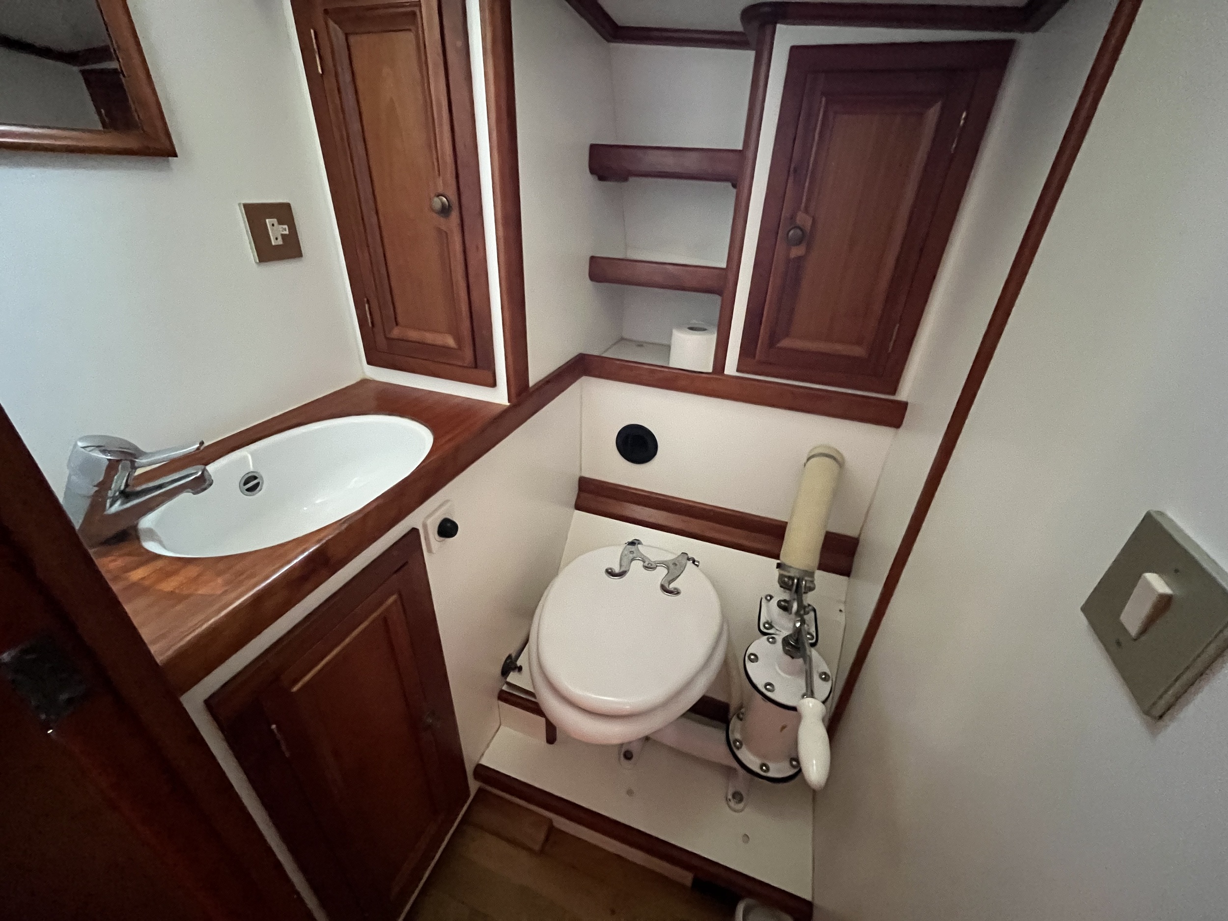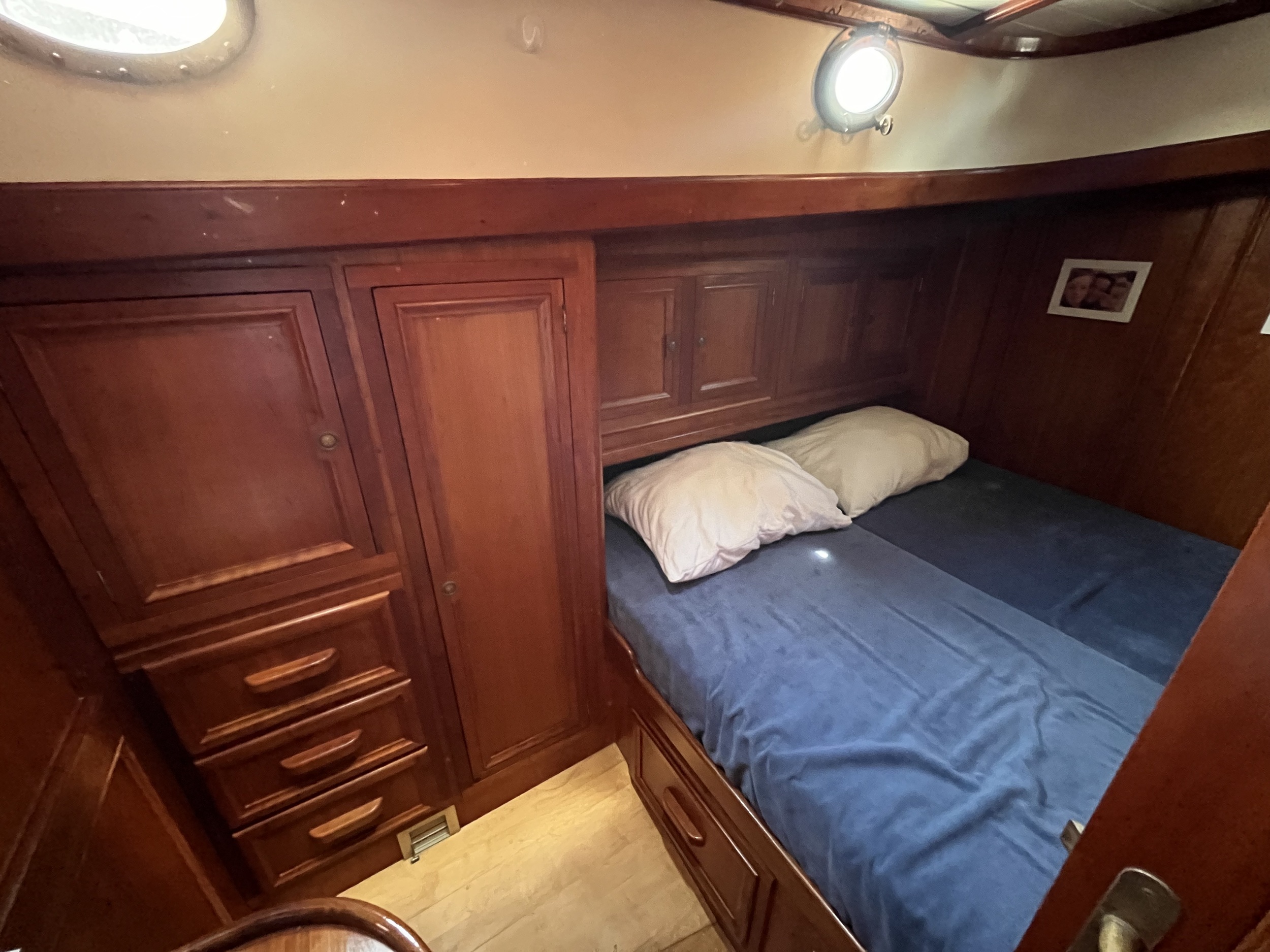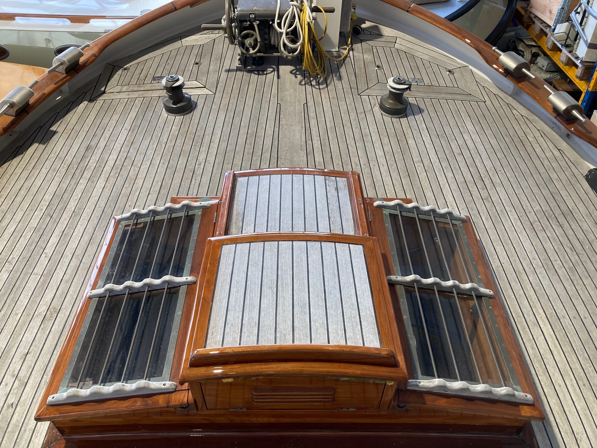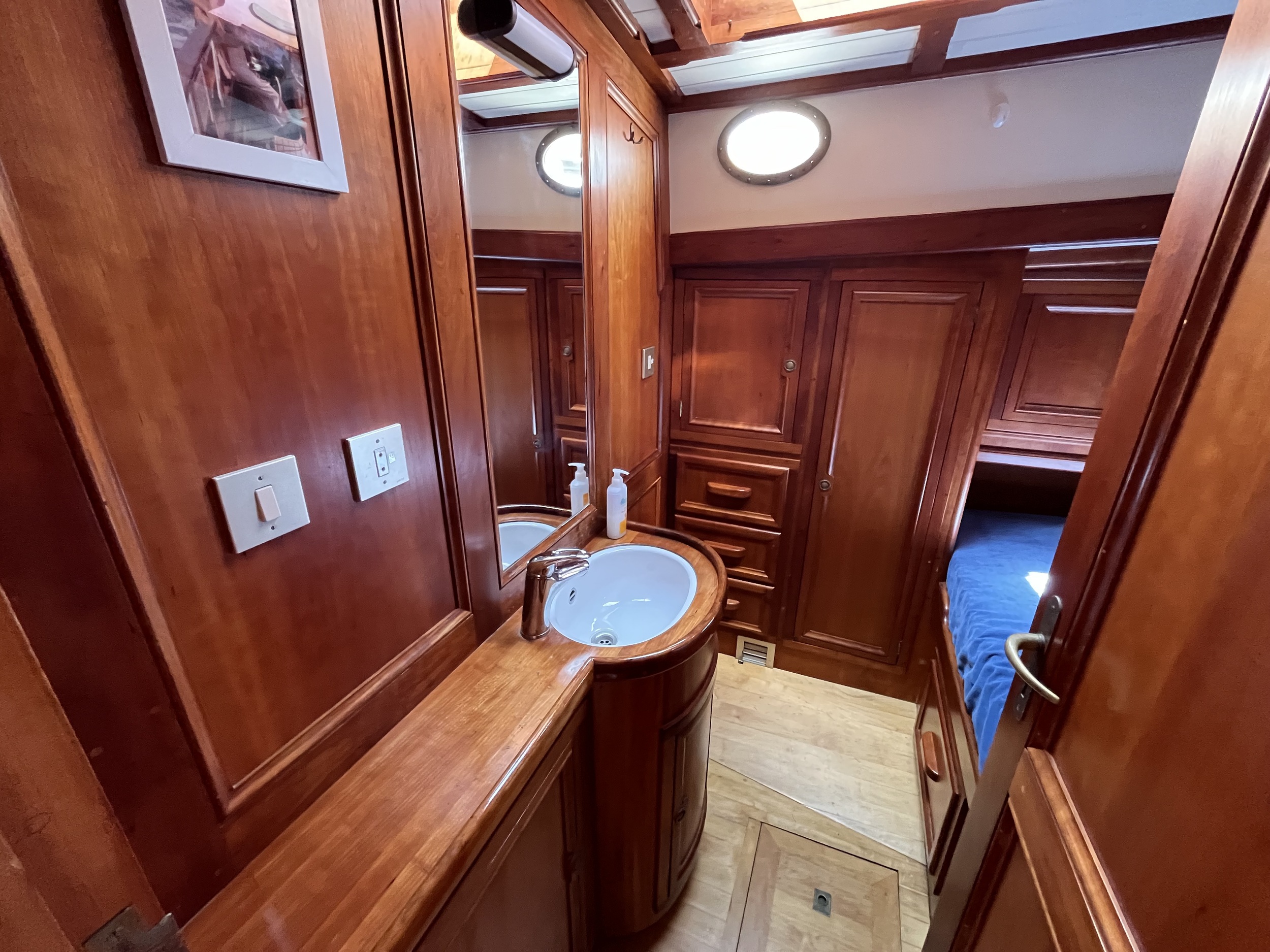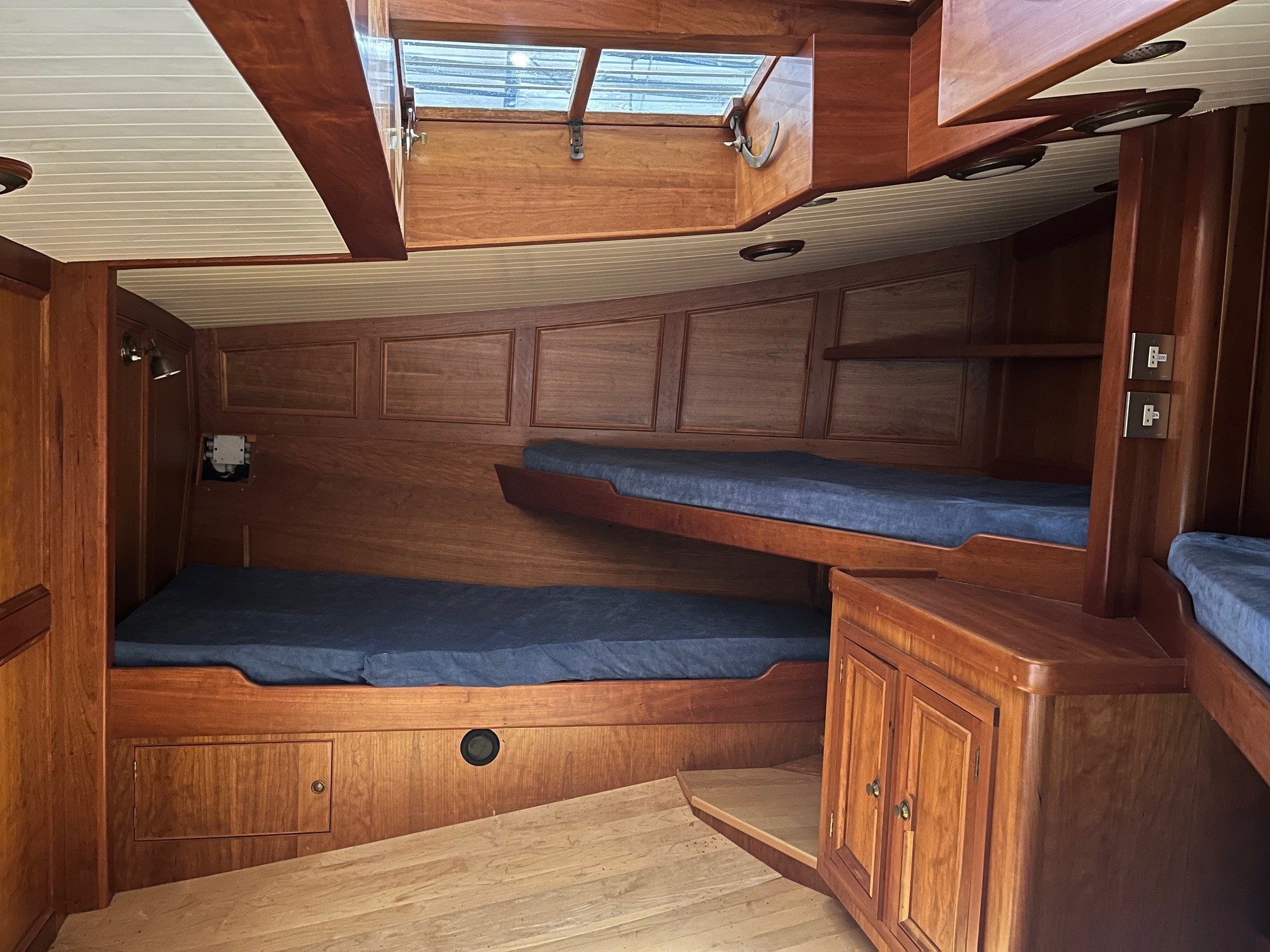 Het kersenhouten interieur is volgens de hoogste standaard gemaakt door de firma Dörr te Lemmer. De kombuis is ruim van opzet en uitgevoerd met cardanisch opgehangen Force 10 rvs fornuis met oven. Aan stuurboord is de navigatiehoek met schakelpaneel. In de salon is aan beide kanten een zitplaats met veel kastruimte. De massief ingelegde essenhouten vloer maakt het interieur sfeervol maar toch ook licht. De mastercabin met spoelbak heeft royale stahoogte en is voorzien van 2 persoonsbed met lattenbodem. In de doorgang is een separate douche en toilet. In het voorschip is een ruime 4 persoons hut met fraaie koekoek.