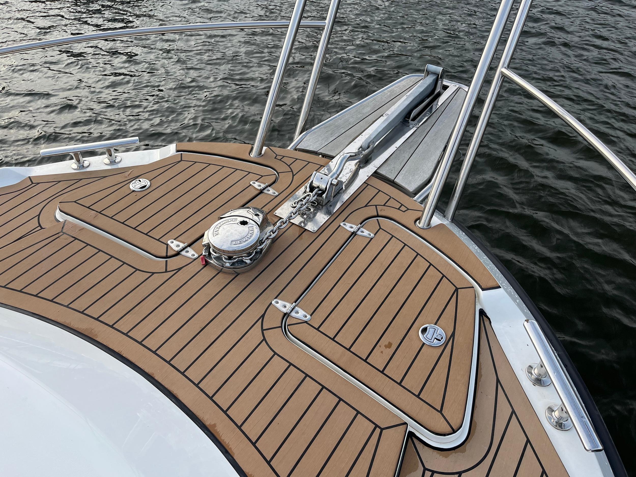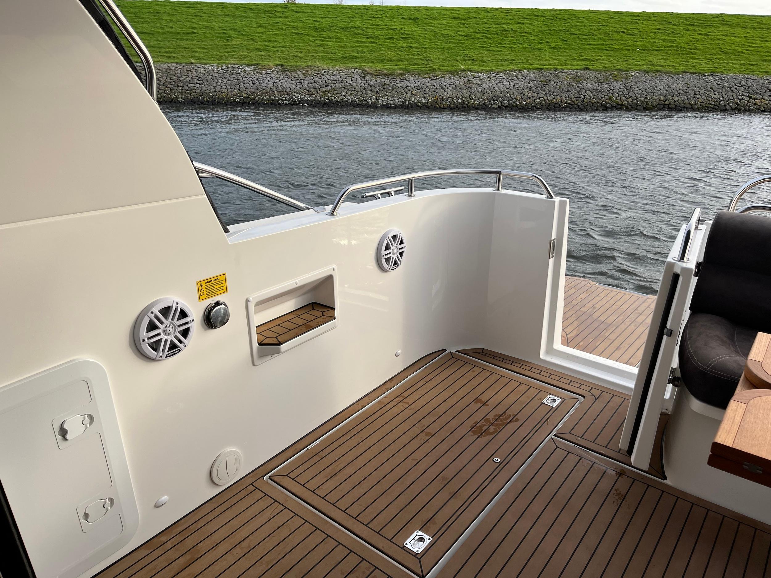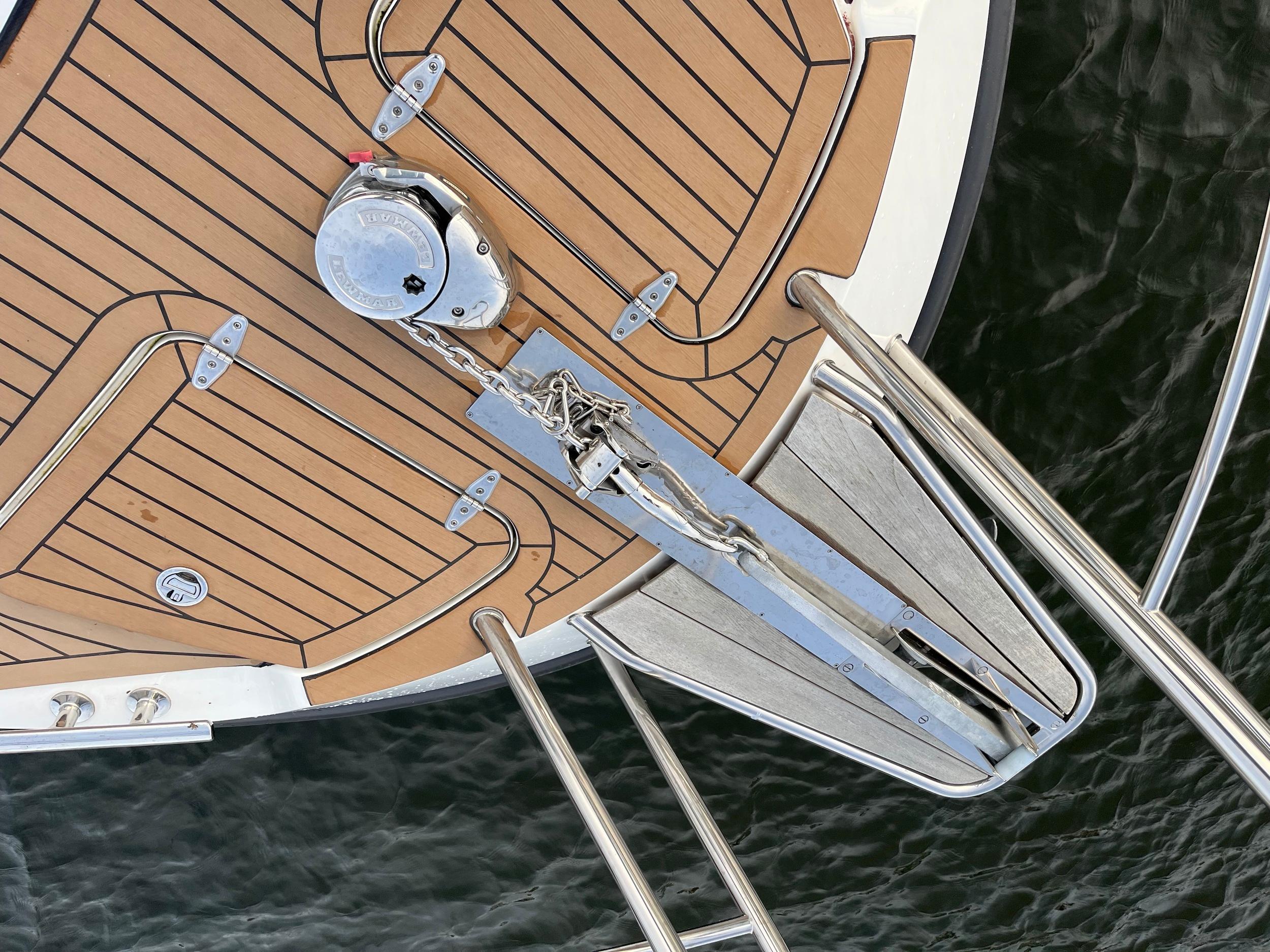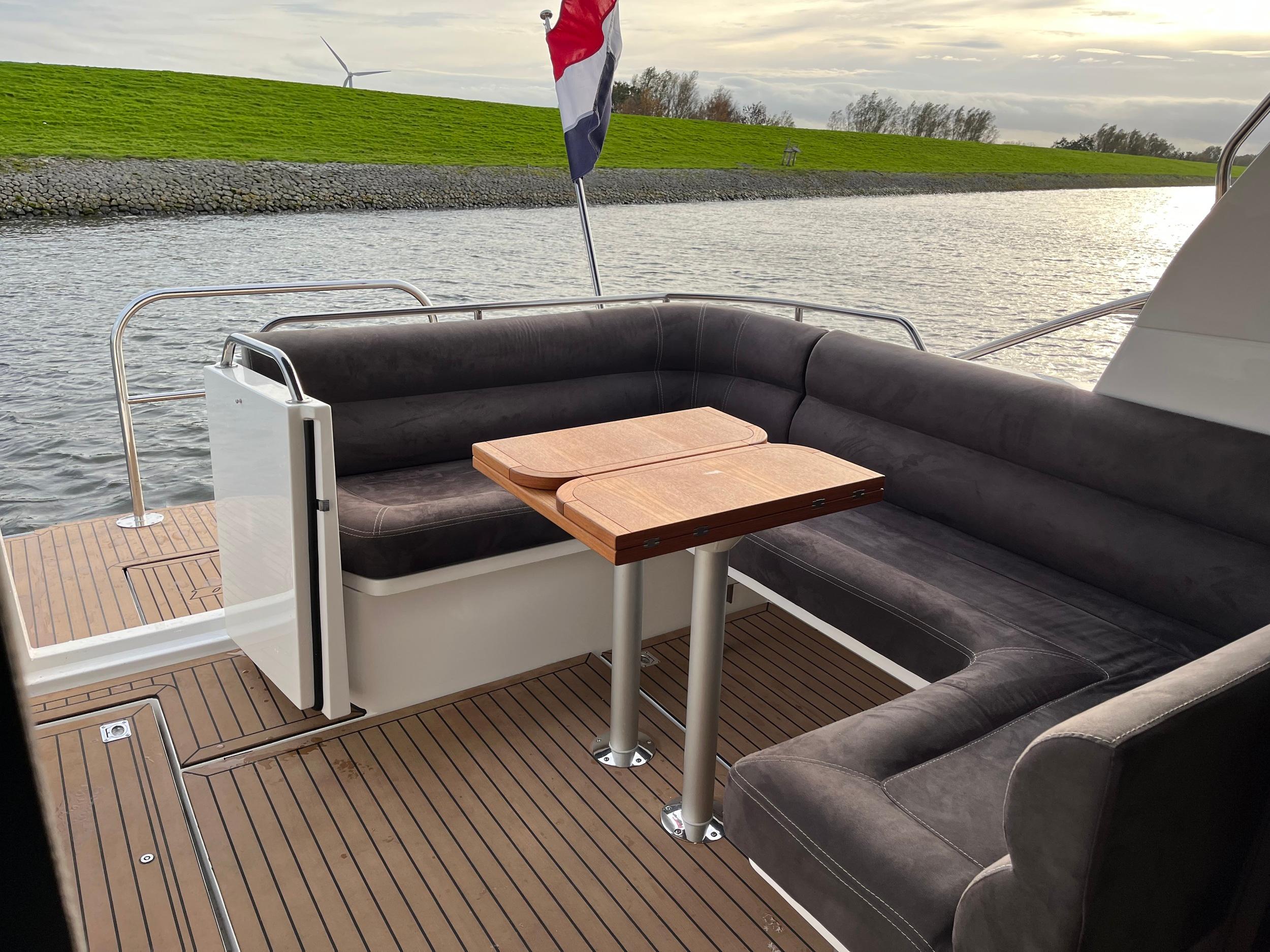 Flexiteak in kuip, op zwemplateau en op de gangboorden. Op het voordek zijn roestvrijstalen handgrepen geplaatst met een zonnebed. De dubbele zeerailing is stevig en hoog waardoor u veilig rondom het jacht kunt lopen. In het salondak zitten 2 royale schuifluiken met raamverblinding. Teakhouten kuiptafel met inklapbare delen. Speakers in kuip. Ruime toegangsdeur naar zwemplateau.