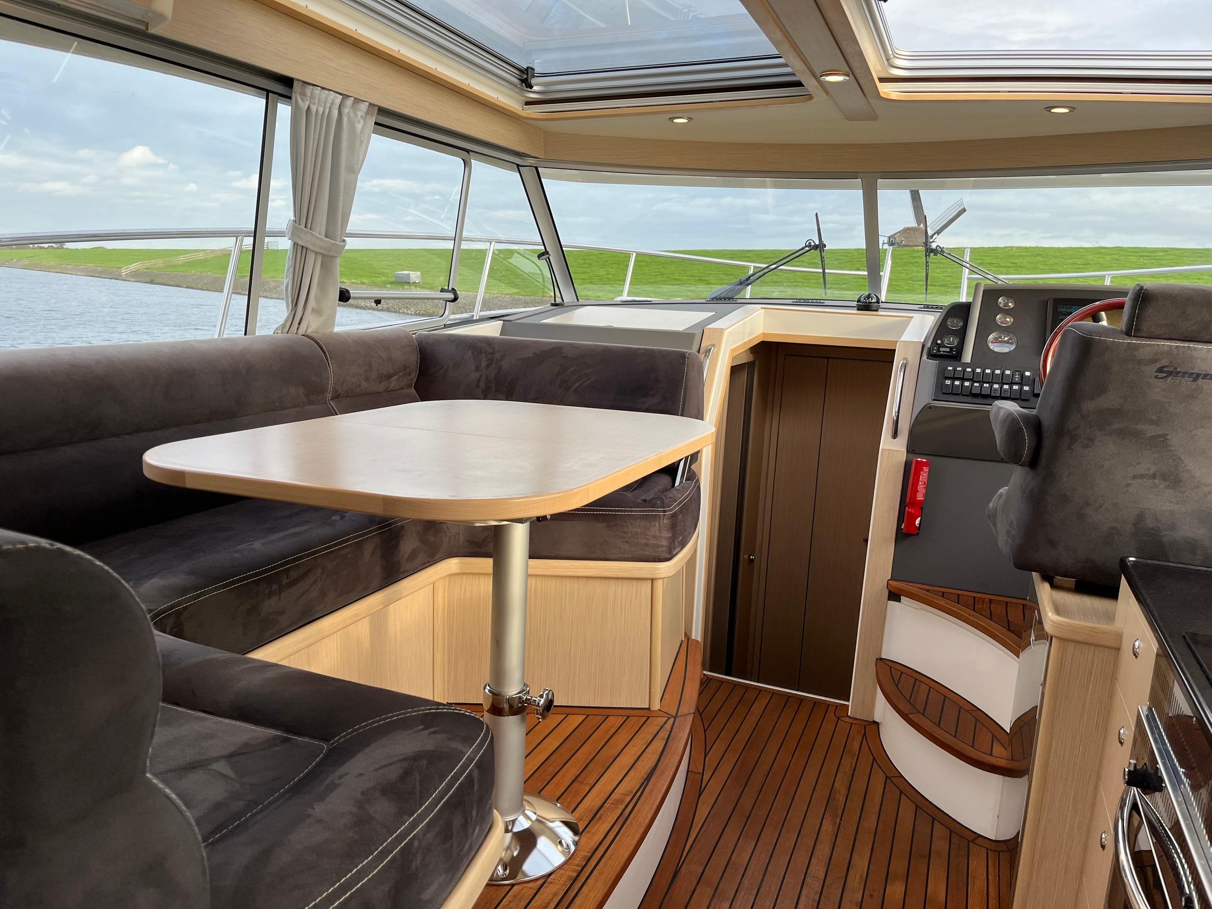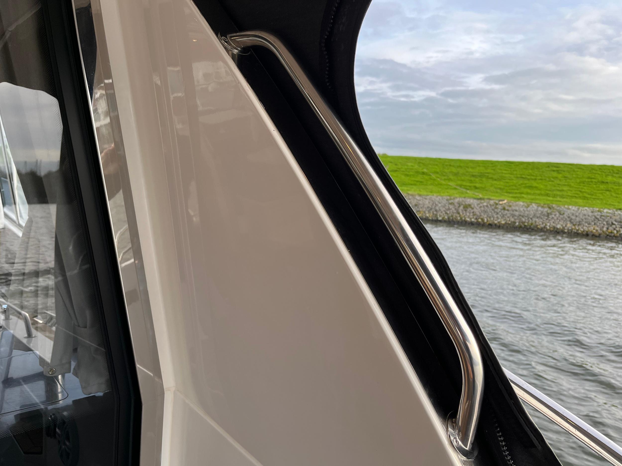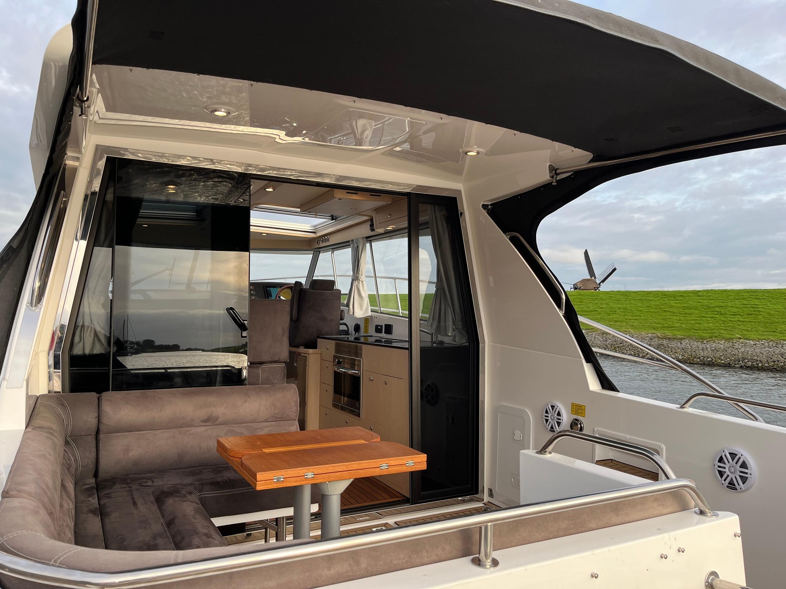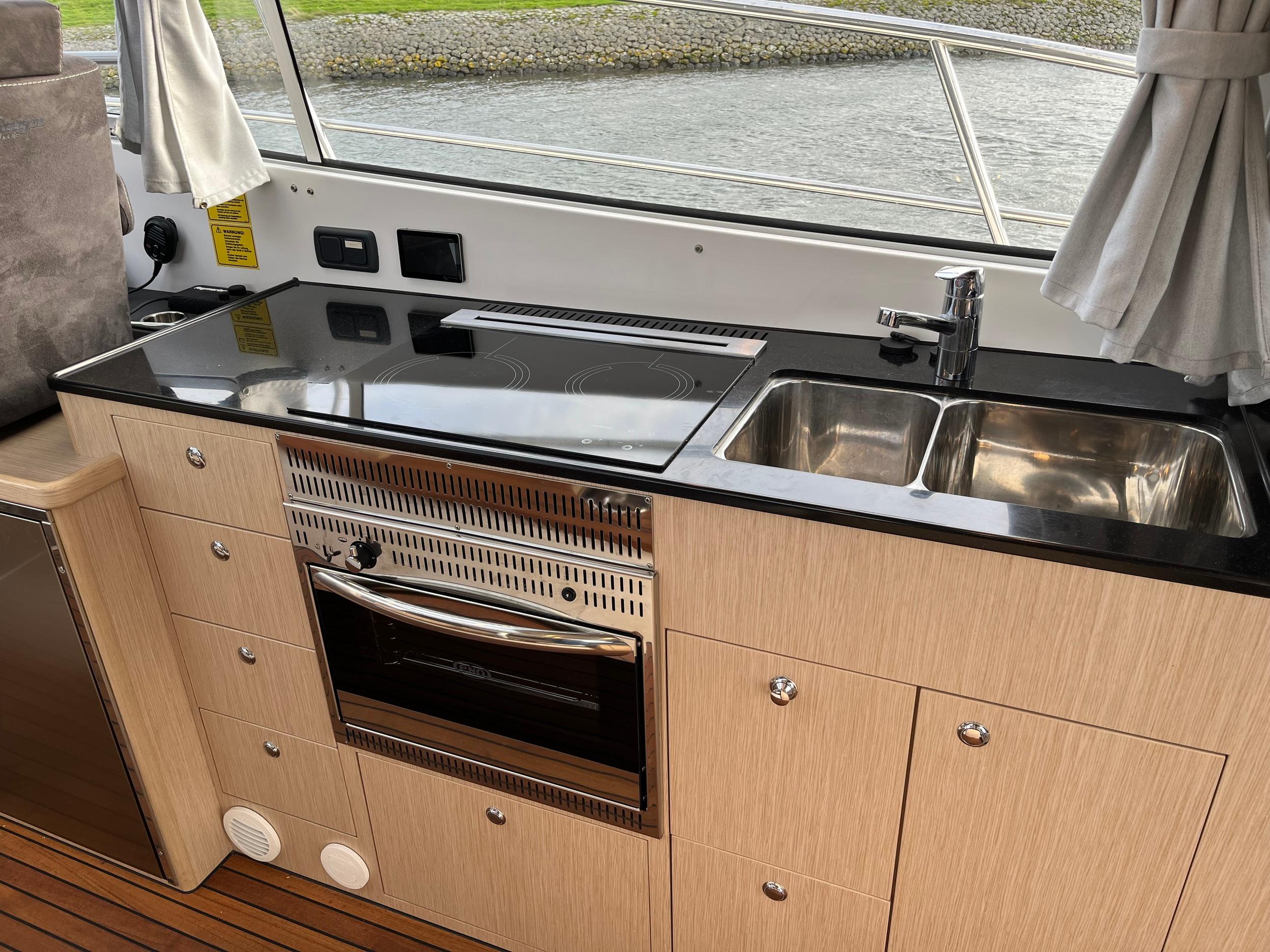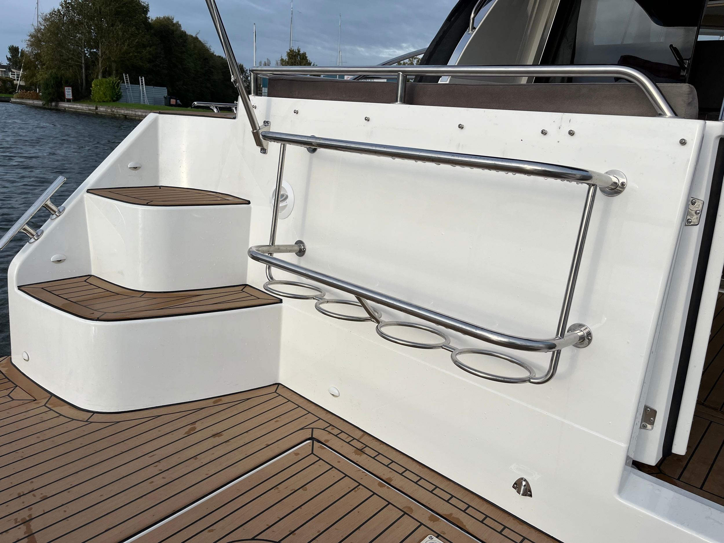 Flexiteak in kuip, op zwemplateau en op de gangboorden. Op het voordek zijn roestvrijstalen handgrepen geplaatst met een zonnebed. De dubbele zeerailing is stevig en hoog waardoor u veilig rondom het jacht kunt lopen. In het salondak zitten 2 royale schuifluiken met raamverblinding. Teakhouten kuiptafel met inklapbare delen. Speakers in kuip. Ruime toegangsdeur naar zwemplateau.