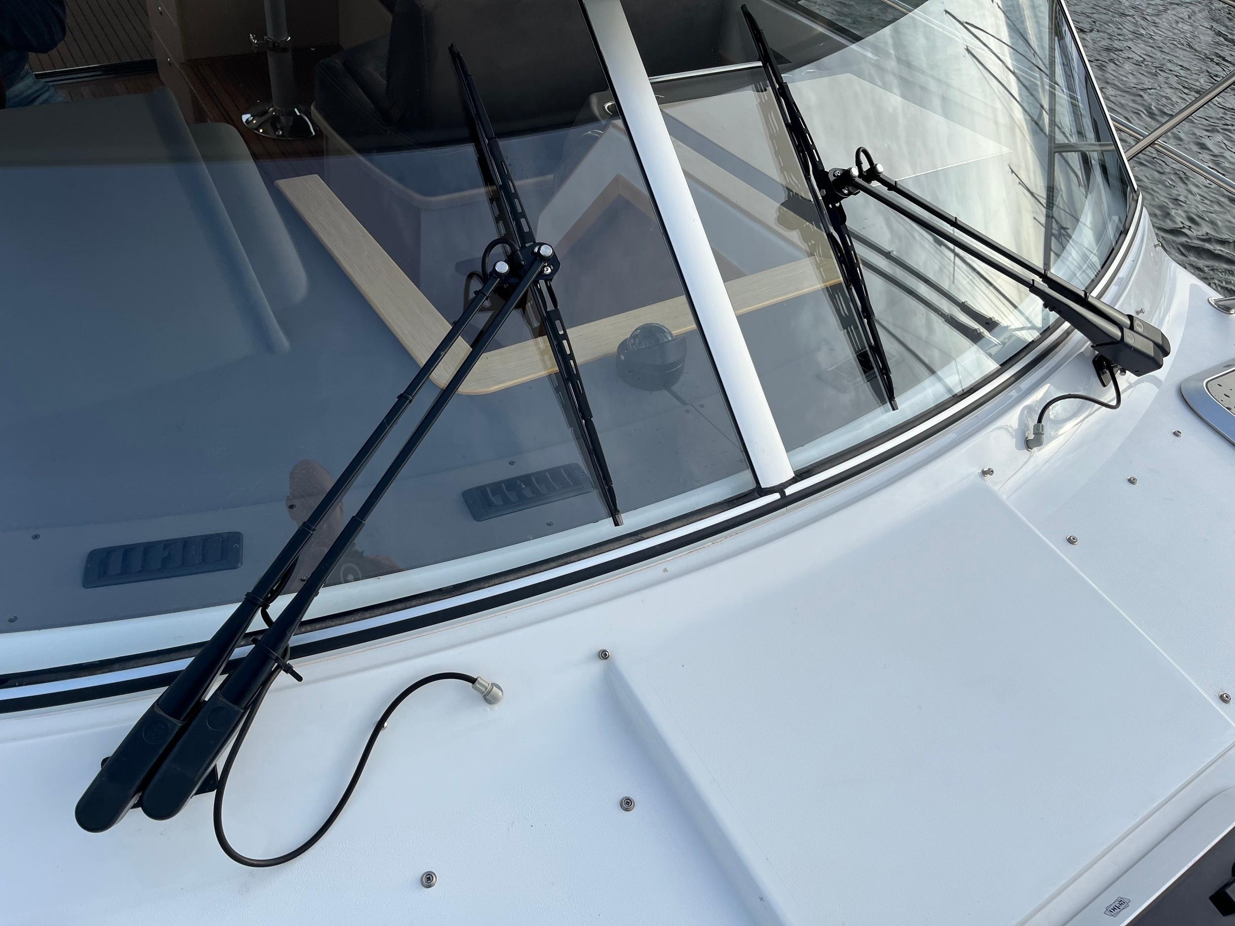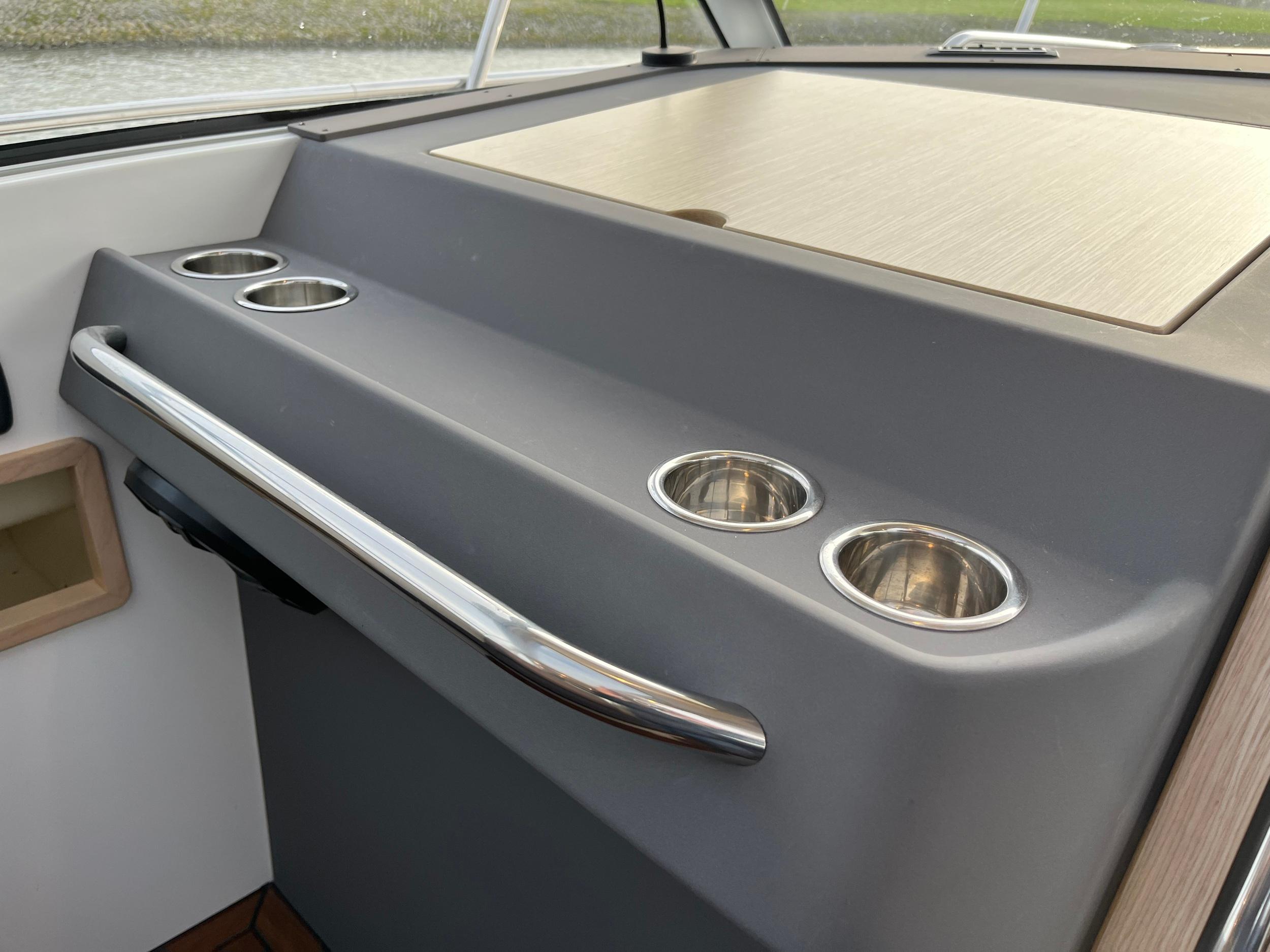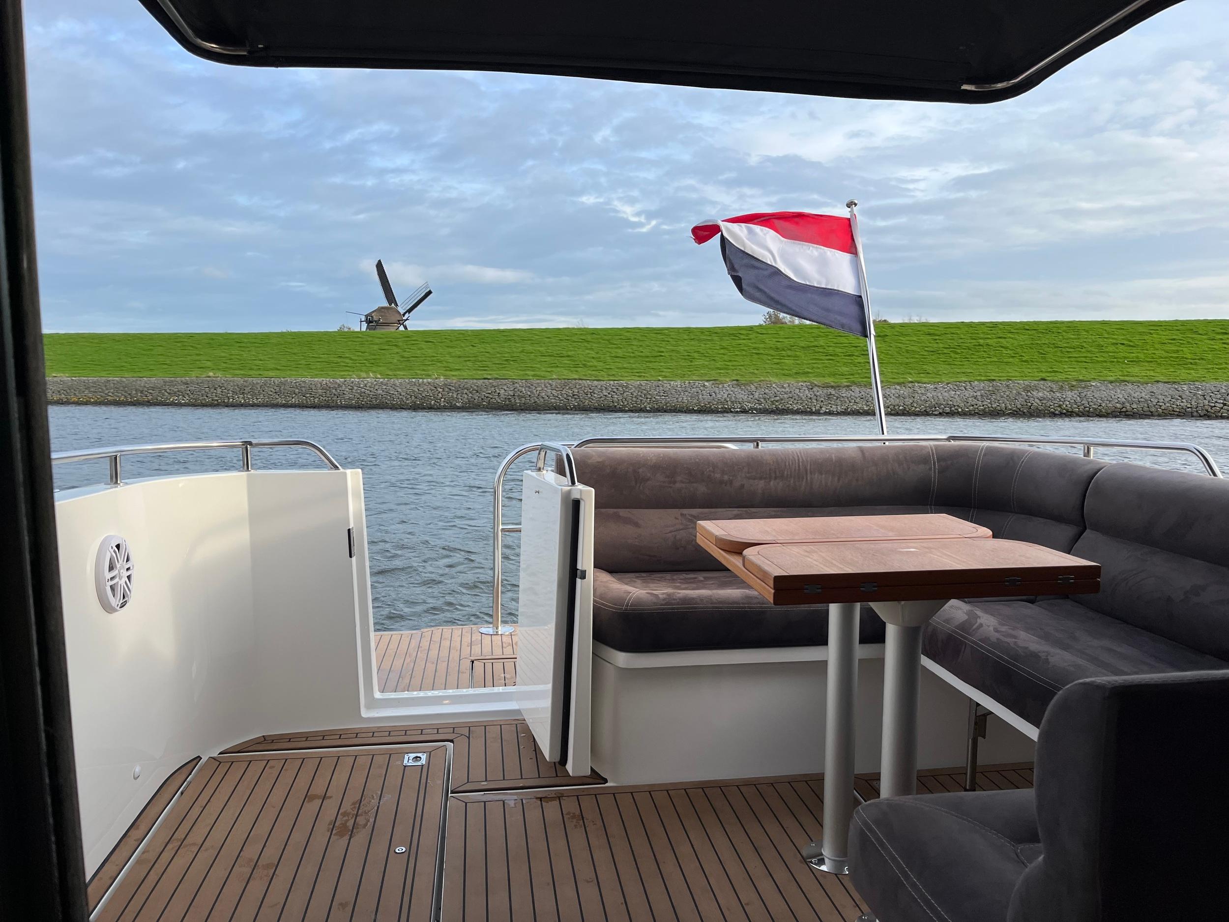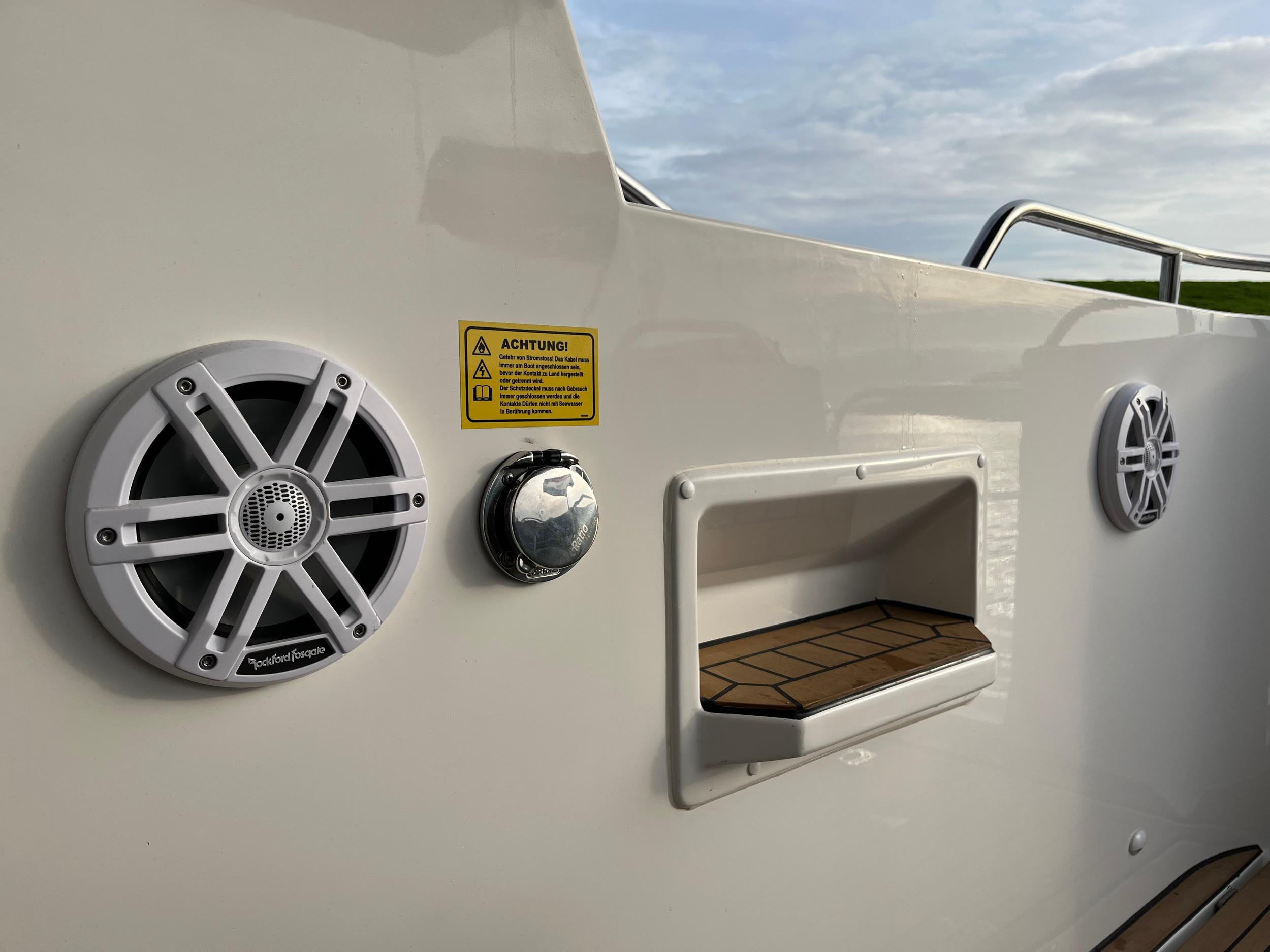 Flexiteak in kuip, op zwemplateau en op de gangboorden. Op het voordek zijn roestvrijstalen handgrepen geplaatst met een zonnebed. De dubbele zeerailing is stevig en hoog waardoor u veilig rondom het jacht kunt lopen. In het salondak zitten 2 royale schuifluiken met raamverblinding. Teakhouten kuiptafel met inklapbare delen. Speakers in kuip. Ruime toegangsdeur naar zwemplateau.