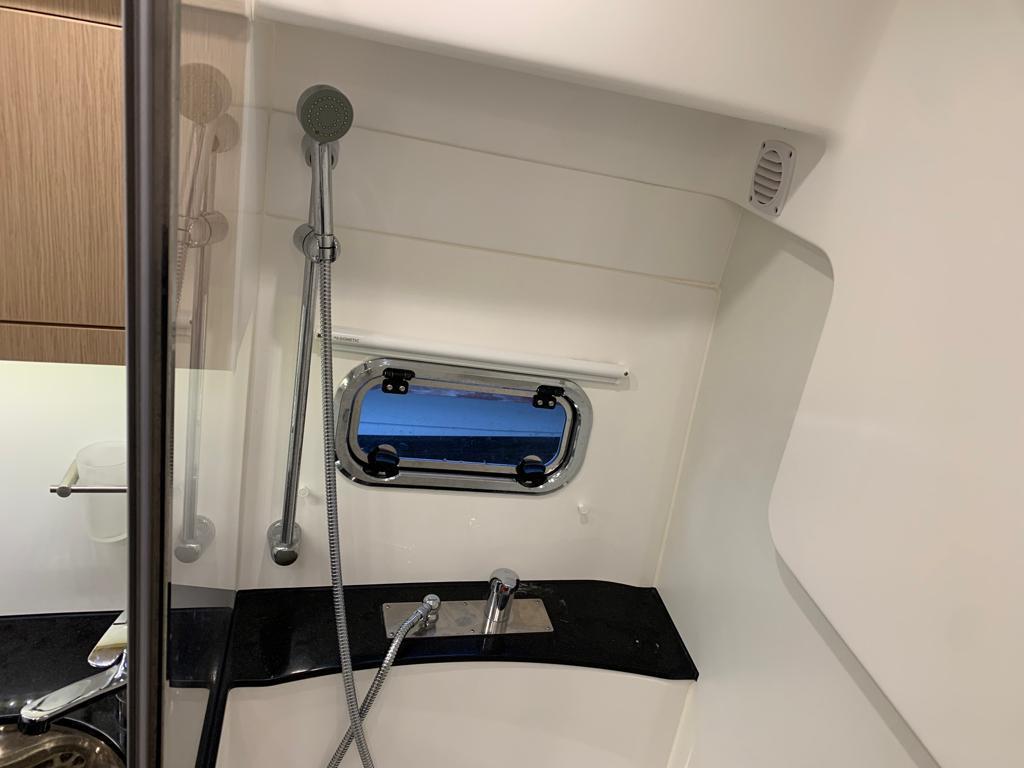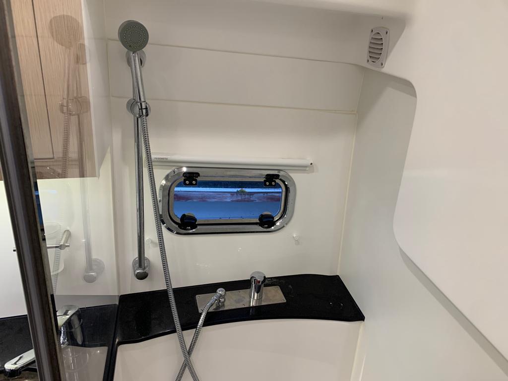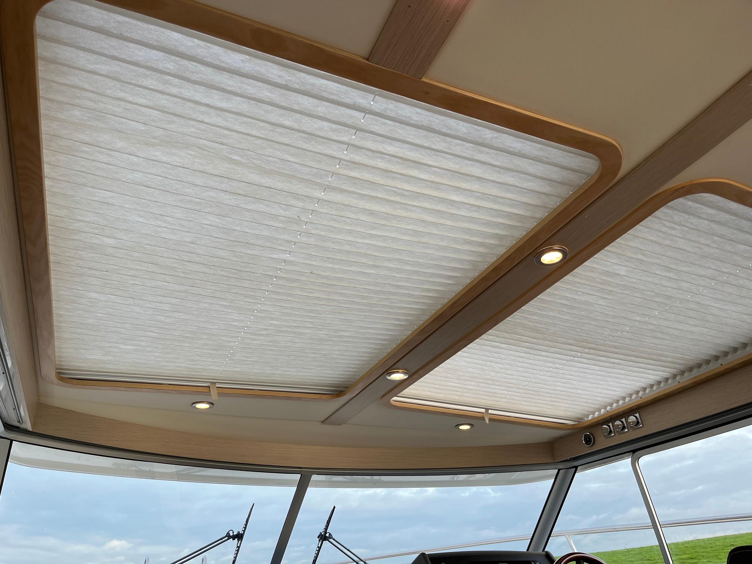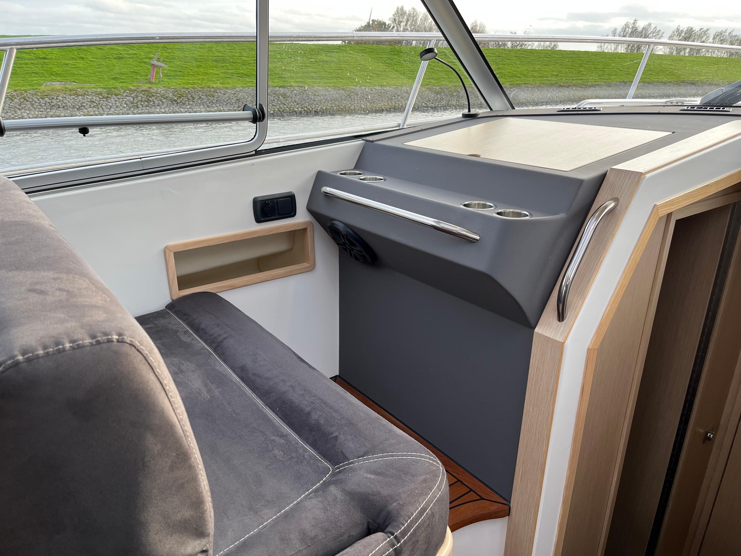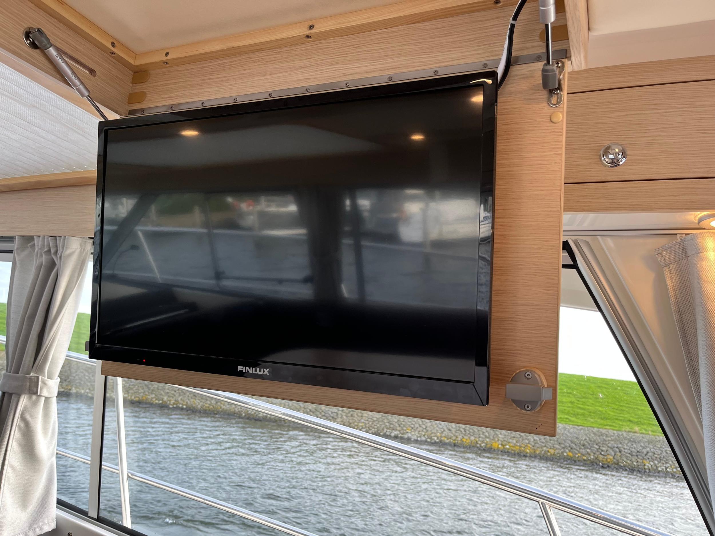 Flexiteak in kuip, op zwemplateau en op de gangboorden. Op het voordek zijn roestvrijstalen handgrepen geplaatst met een zonnebed. De dubbele zeerailing is stevig en hoog waardoor u veilig rondom het jacht kunt lopen. In het salondak zitten 2 royale schuifluiken met raamverblinding. Teakhouten kuiptafel met inklapbare delen. Speakers in kuip. Ruime toegangsdeur naar zwemplateau.