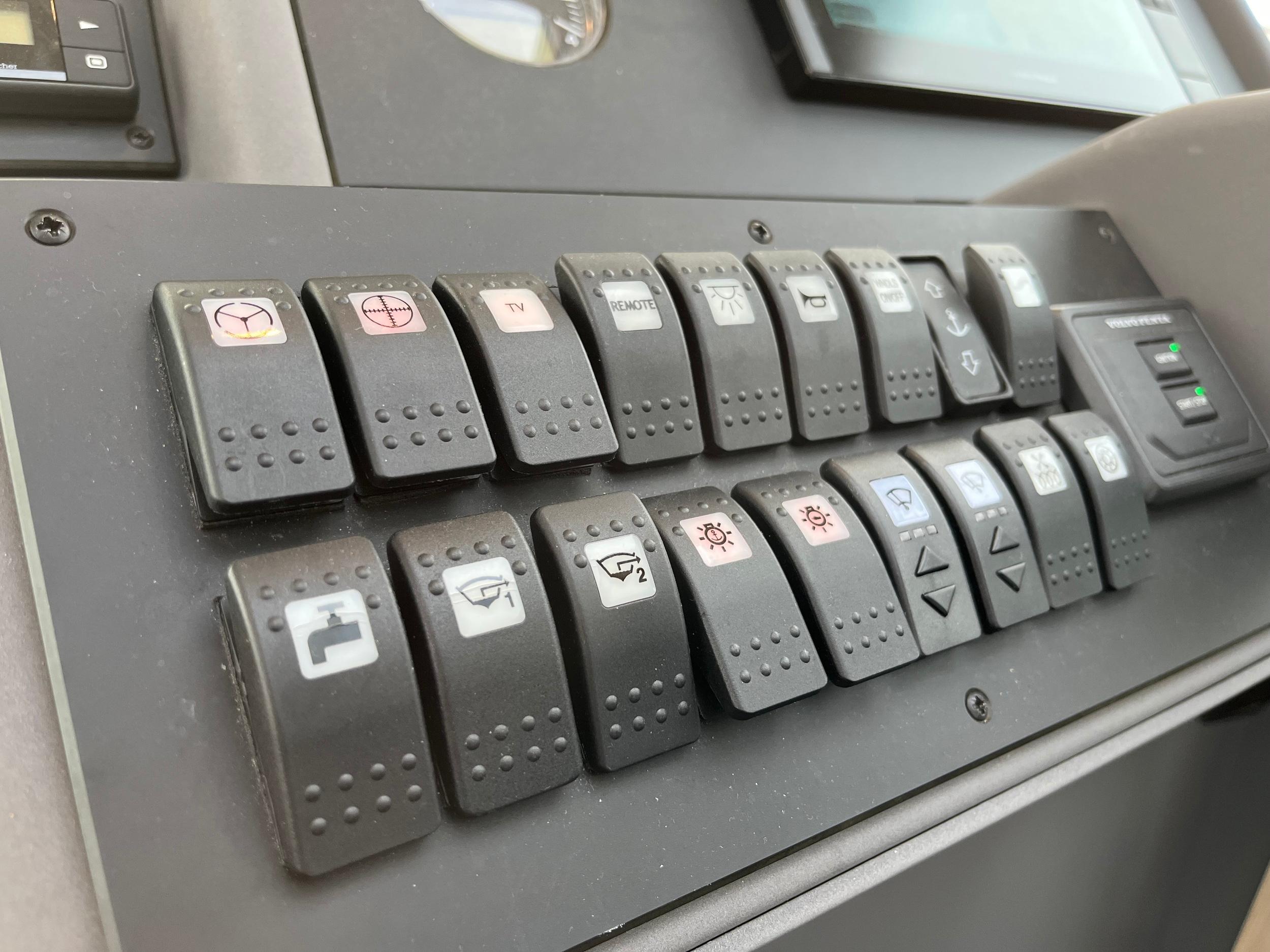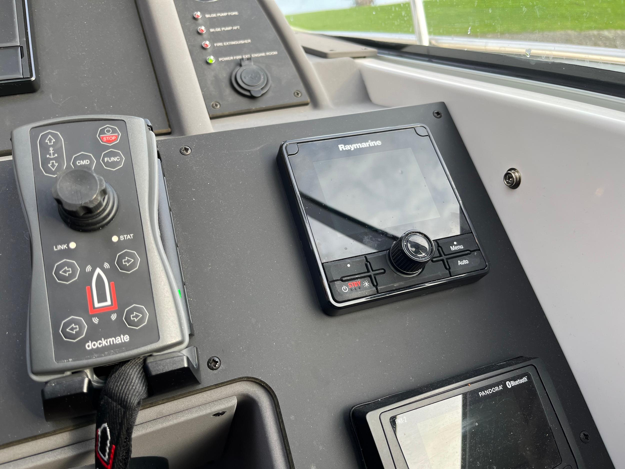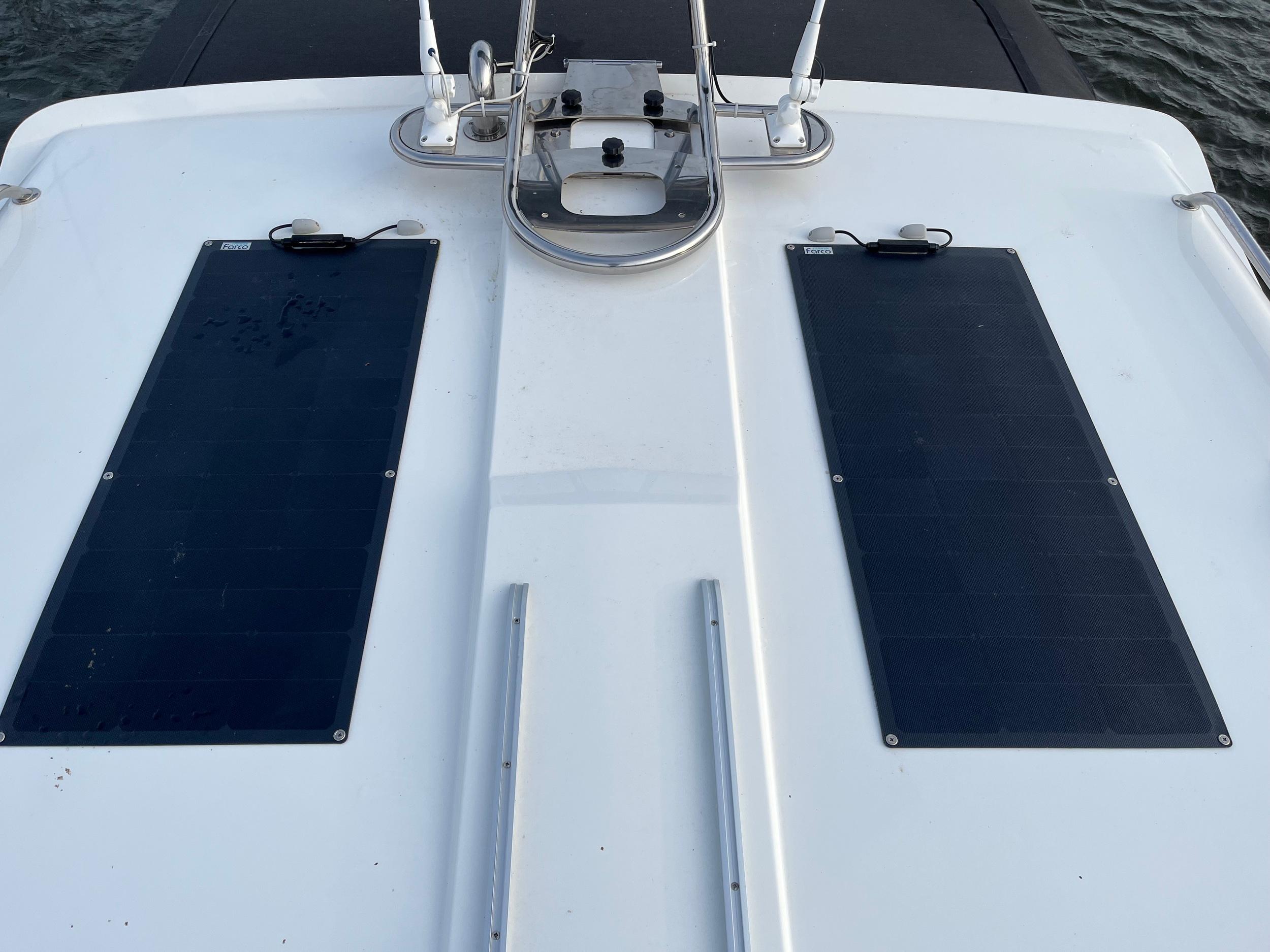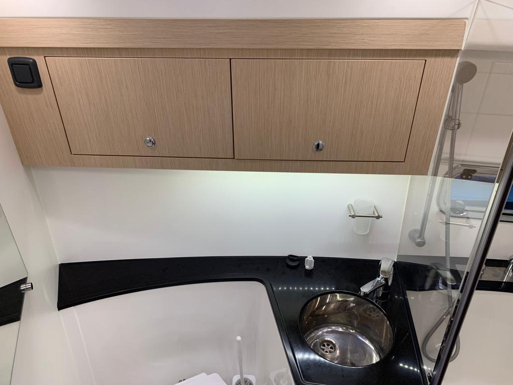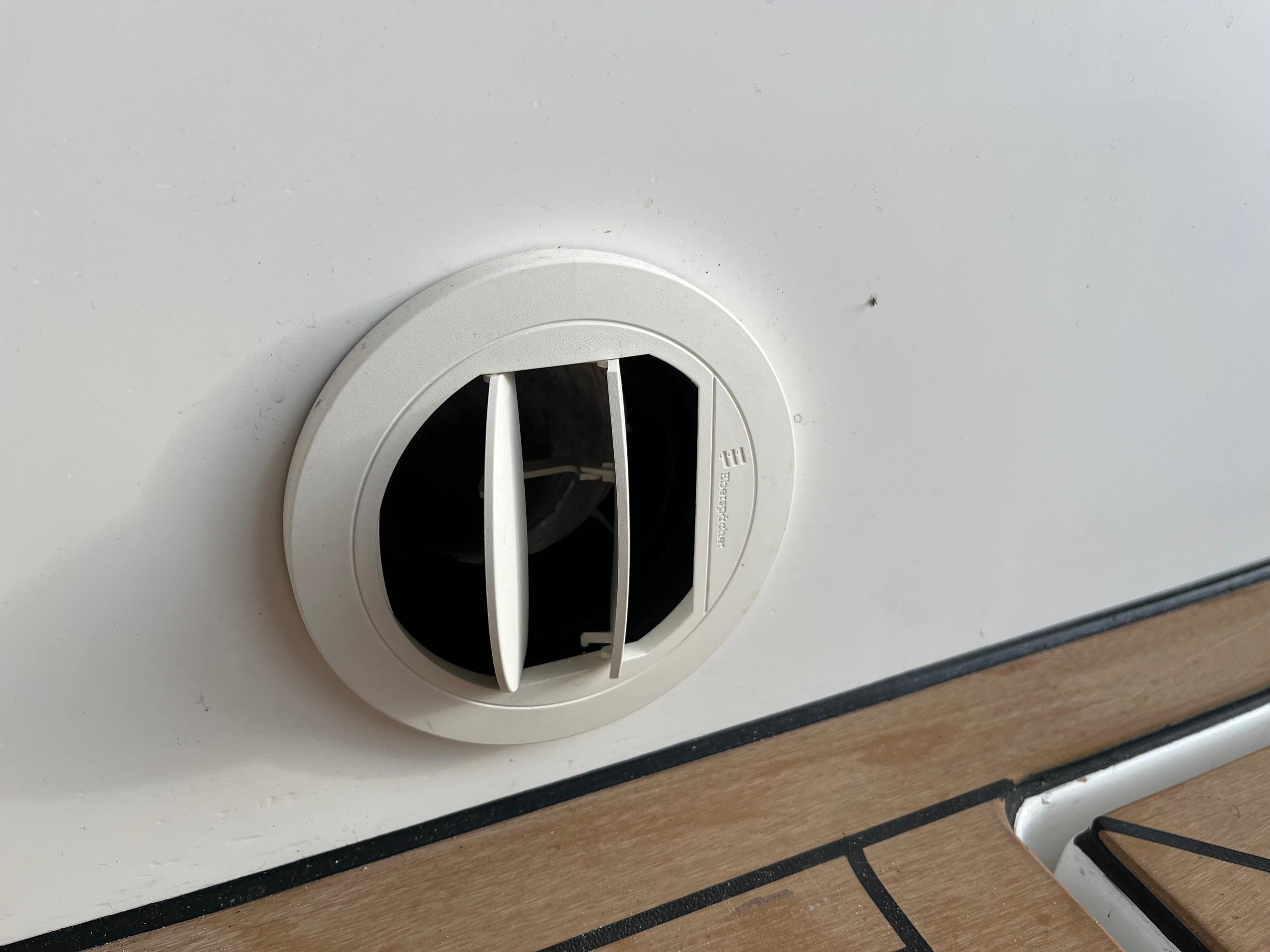 Flexiteak in kuip, op zwemplateau en op de gangboorden. Op het voordek zijn roestvrijstalen handgrepen geplaatst met een zonnebed. De dubbele zeerailing is stevig en hoog waardoor u veilig rondom het jacht kunt lopen. In het salondak zitten 2 royale schuifluiken met raamverblinding. Teakhouten kuiptafel met inklapbare delen. Speakers in kuip. Ruime toegangsdeur naar zwemplateau.