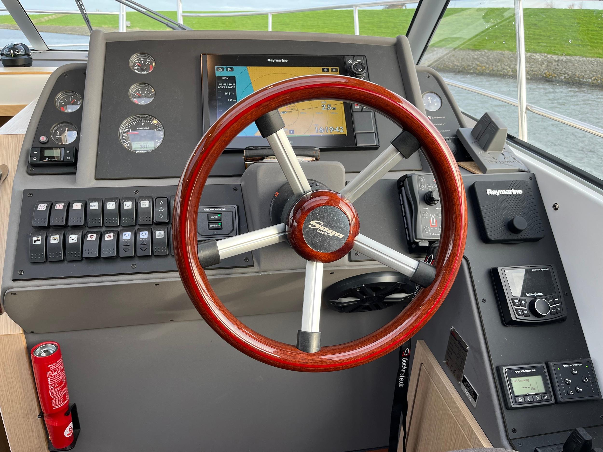 Daarnaast heeft het motorjacht een fris en licht interieur en is zij voorzien van een sterke Volvo Penta motor (480PK) en een uitgebreid “uptodate” navigatie systeem. De huidige eerste eigenaar heeft de Saga 385 nog “geupgrade” met een proportionele boeg- en hekschroef van Sidepower met daarbij nog een Dockmate bediening. (Vraag om de extra optielijst!)