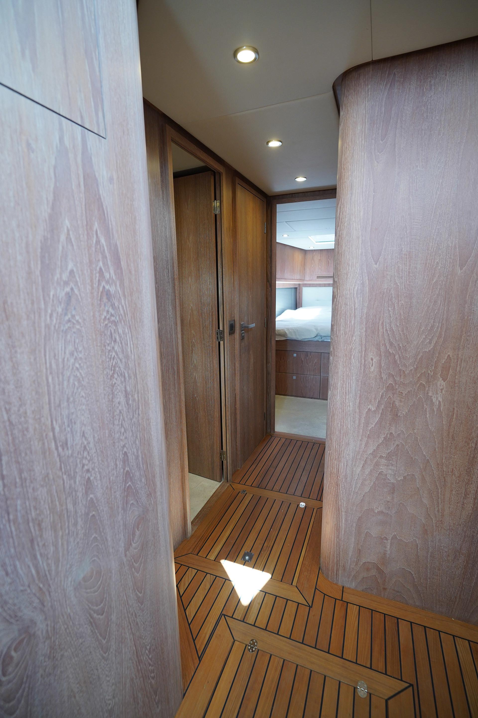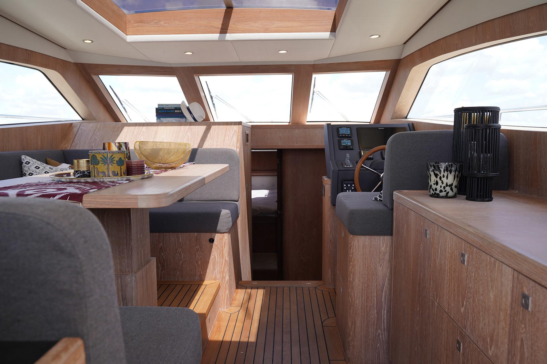 Heerlijk comfortabel teakhouten interieur. Voorzien van vloerverwarming met massief teakhouten vloerdelen. In de keuken is een wasmachine (Candy 8 kg) een vaatwasser (Siemens) en Corean werkbladen. Dit is echt een jacht voor alle seizoenen door de perfecte isolatie en dubbel glas. Het salonluik kan elektrisch geopend worden.