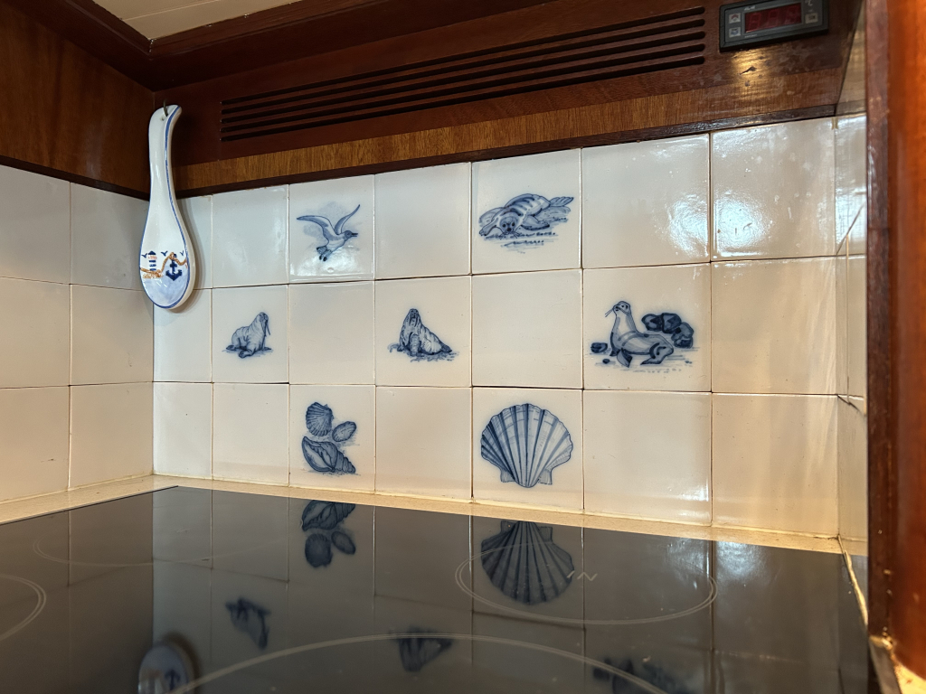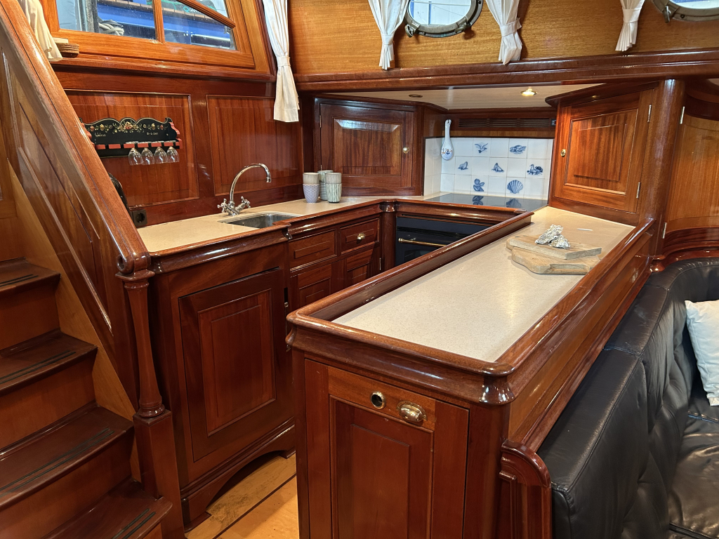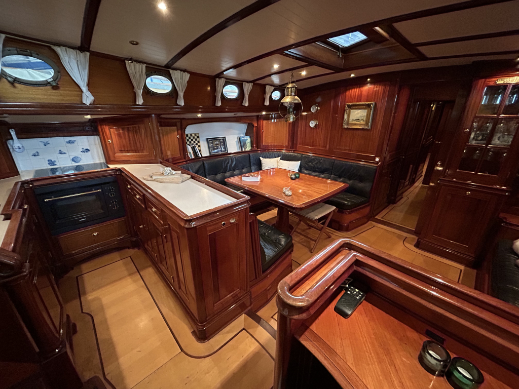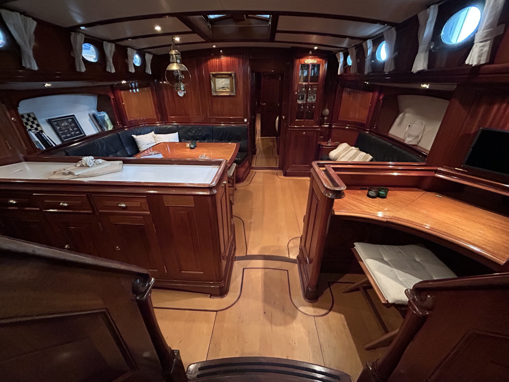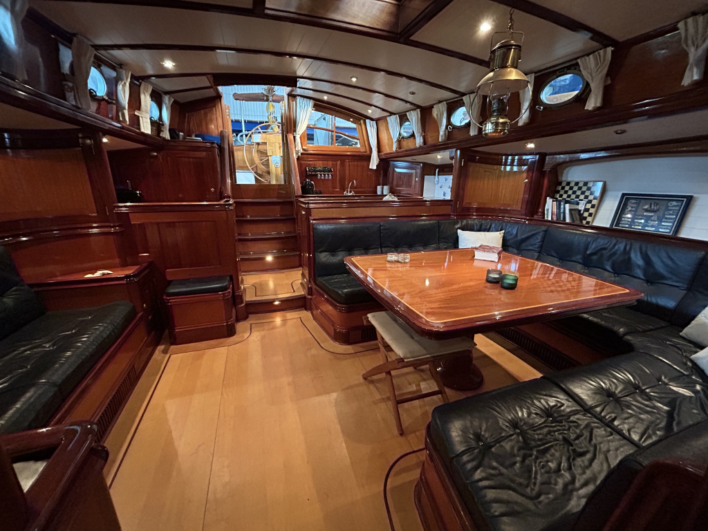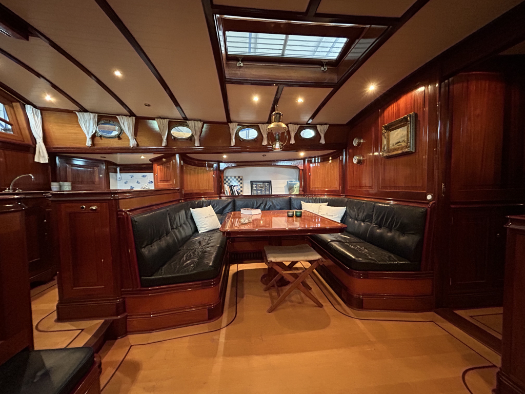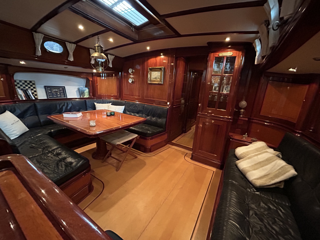 De Walrus is gebouwd met een zeldzaam oog voor detail. De betimmering is ongekend verfijnd, een meesterwerk van houtbewerking. De essenhouten vloer met bies loopt als een warme ader door het hele schip, en in elk hoekje ontdek je opnieuw het vakmanschap waarmee dit schip is afgewerkt. De salon is ruim en licht, met een praktische indeling waarin je je direct thuis voelt. Een gezellige navigatiehoek en een volledig uitgeruste keuken met handgebakken tegeltjes brengen functionaliteit en sfeer samen.