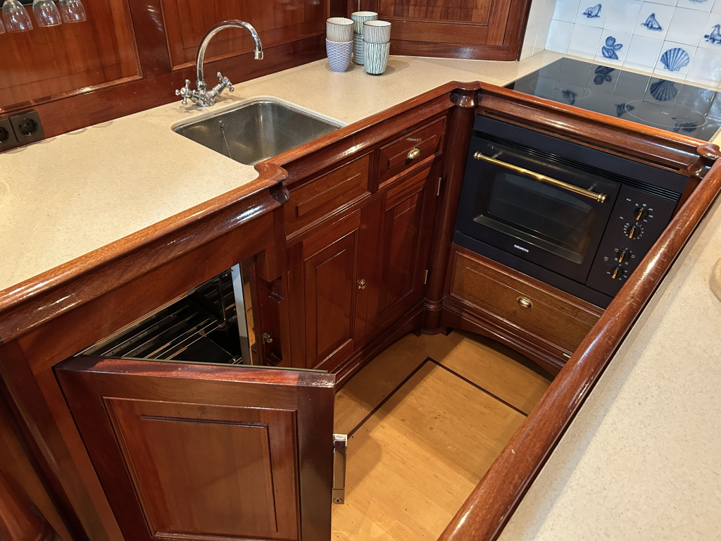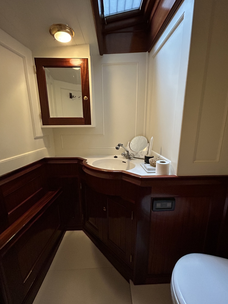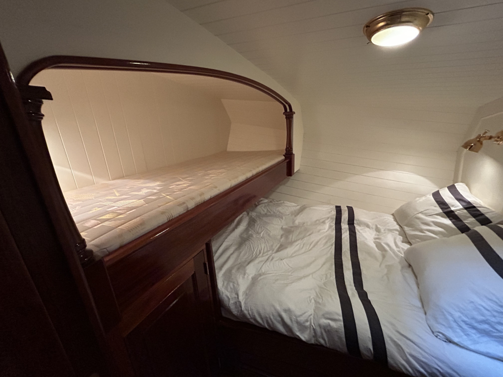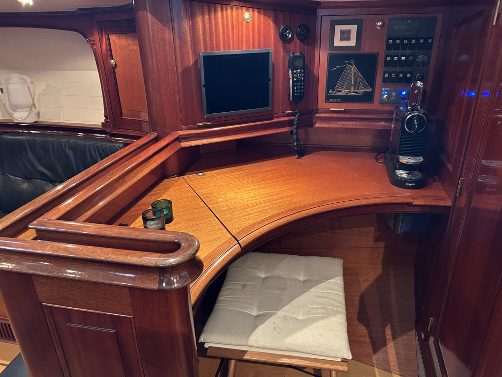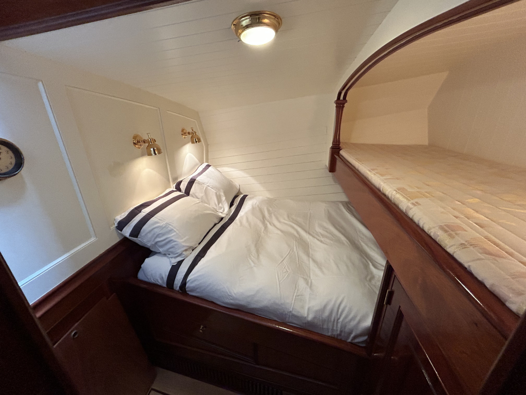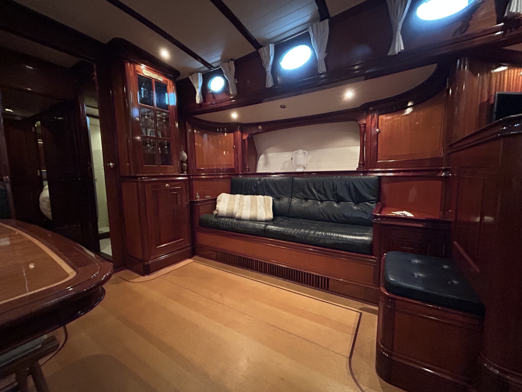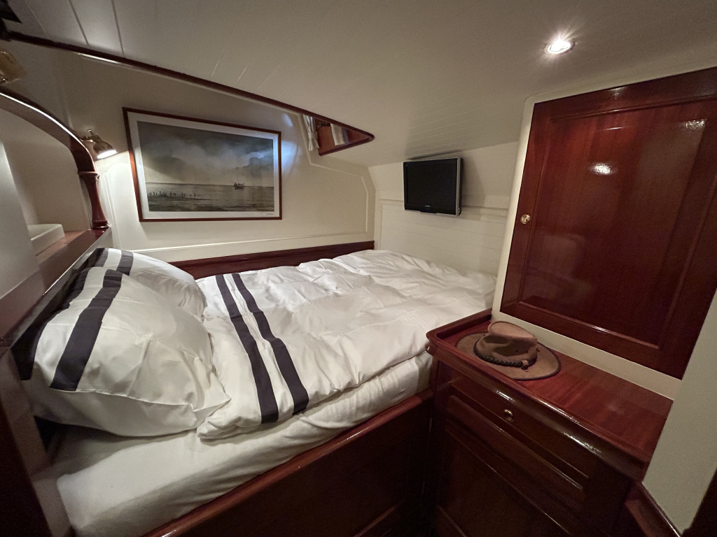 De Walrus is gebouwd met een zeldzaam oog voor detail. De betimmering is ongekend verfijnd, een meesterwerk van houtbewerking. De essenhouten vloer met bies loopt als een warme ader door het hele schip, en in elk hoekje ontdek je opnieuw het vakmanschap waarmee dit schip is afgewerkt. De salon is ruim en licht, met een praktische indeling waarin je je direct thuis voelt. Een gezellige navigatiehoek en een volledig uitgeruste keuken met handgebakken tegeltjes brengen functionaliteit en sfeer samen.