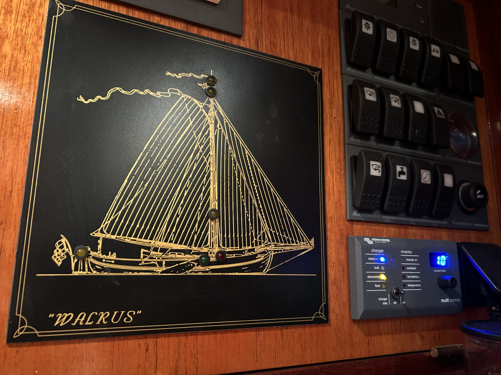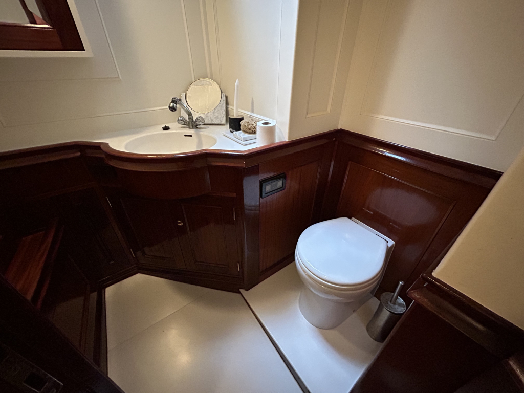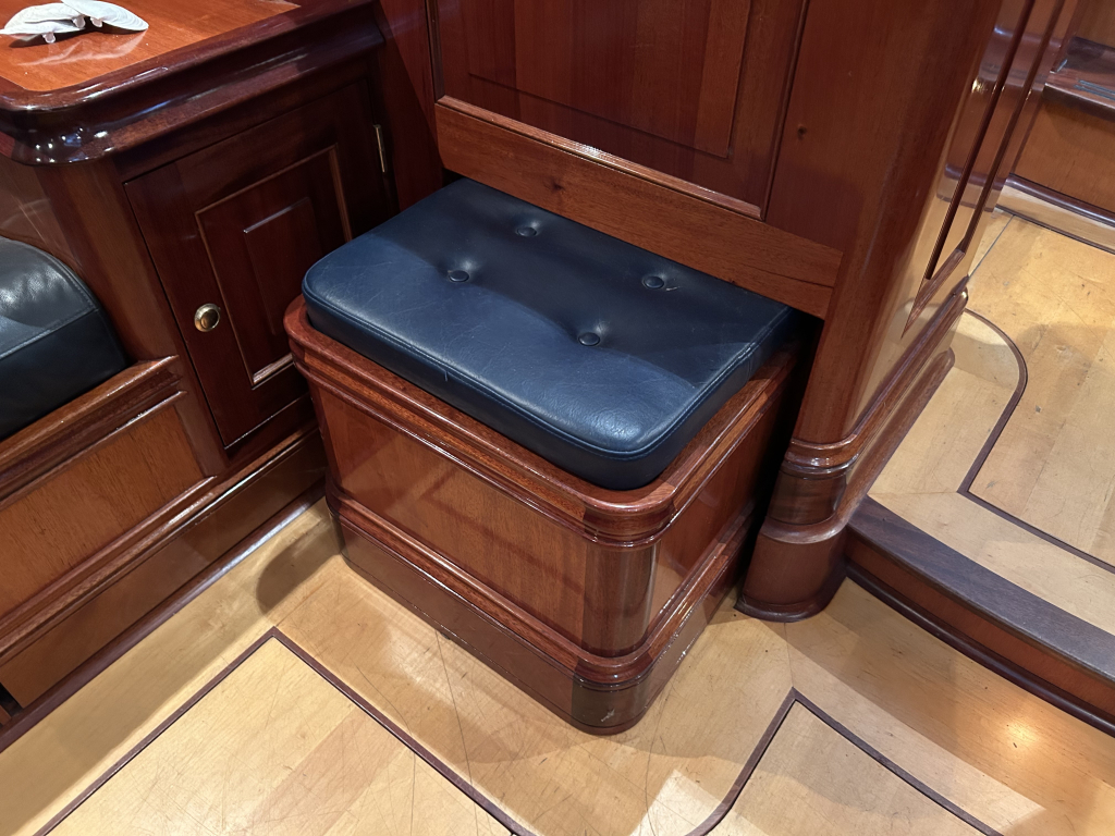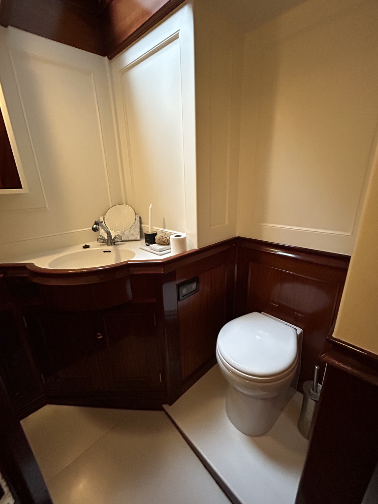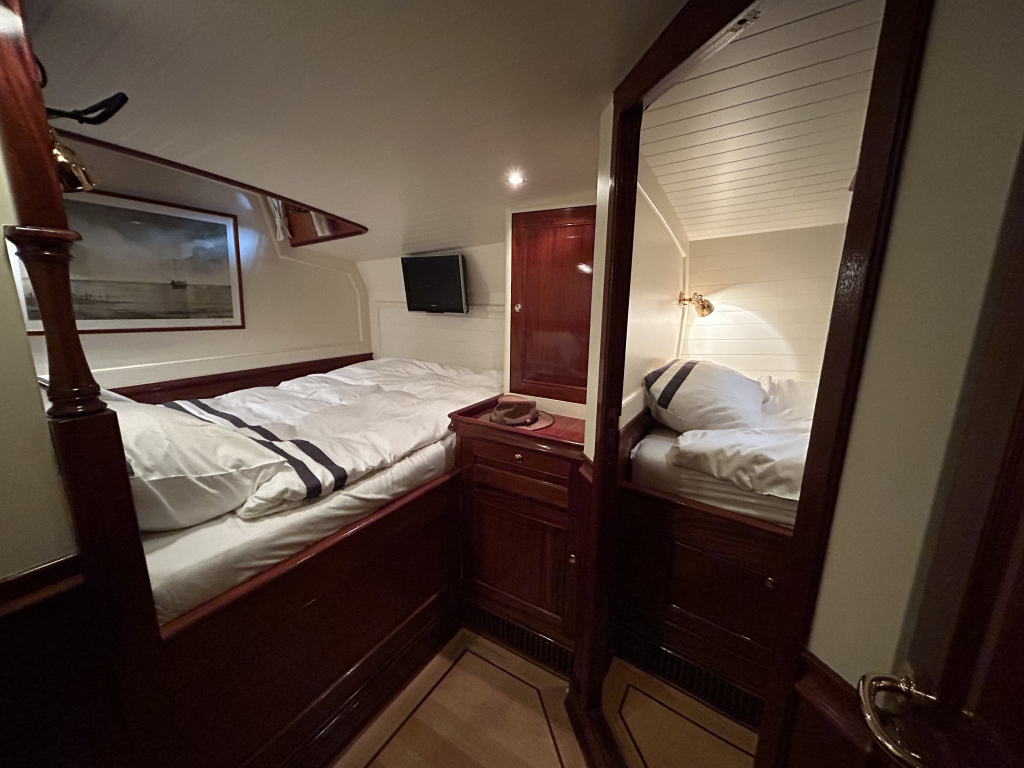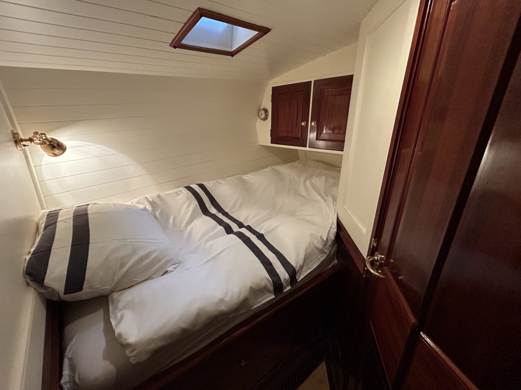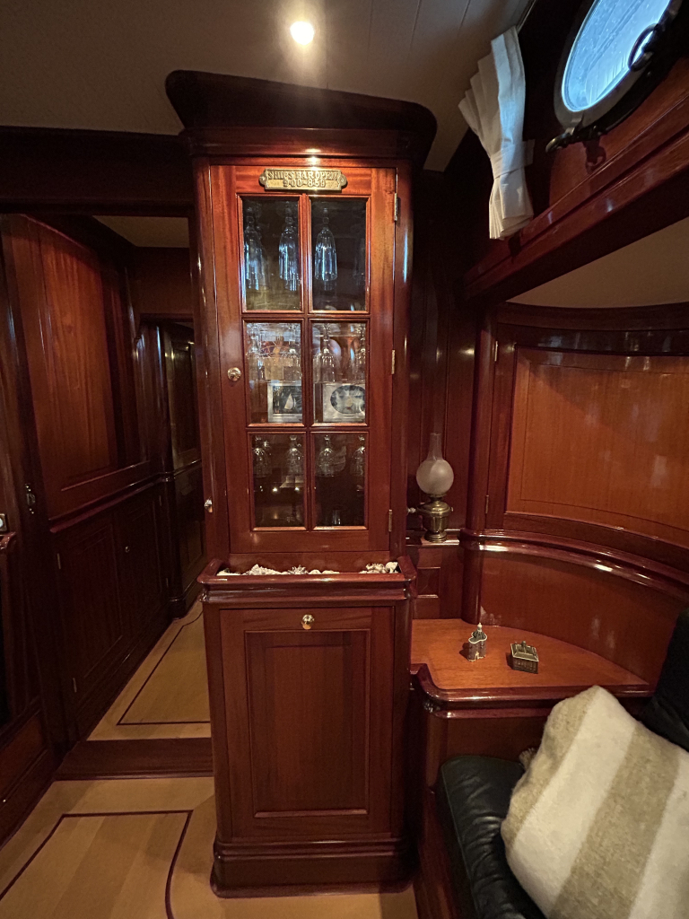 De Walrus is gebouwd met een zeldzaam oog voor detail. De betimmering is ongekend verfijnd, een meesterwerk van houtbewerking. De essenhouten vloer met bies loopt als een warme ader door het hele schip, en in elk hoekje ontdek je opnieuw het vakmanschap waarmee dit schip is afgewerkt. De salon is ruim en licht, met een praktische indeling waarin je je direct thuis voelt. Een gezellige navigatiehoek en een volledig uitgeruste keuken met handgebakken tegeltjes brengen functionaliteit en sfeer samen.