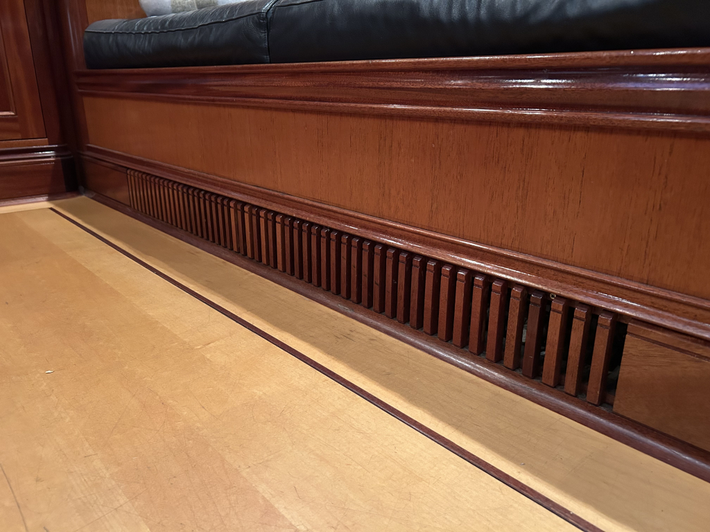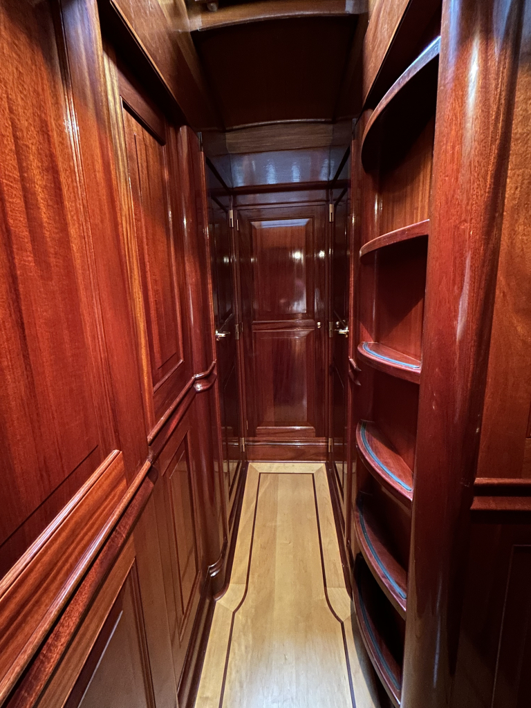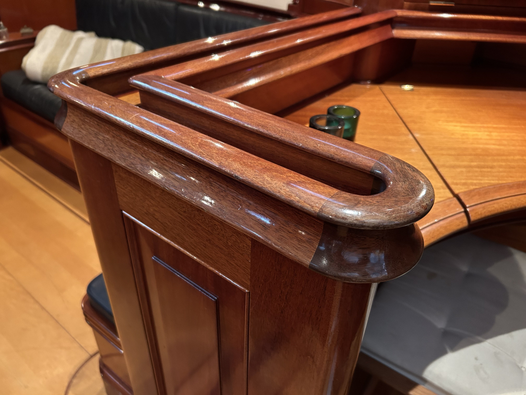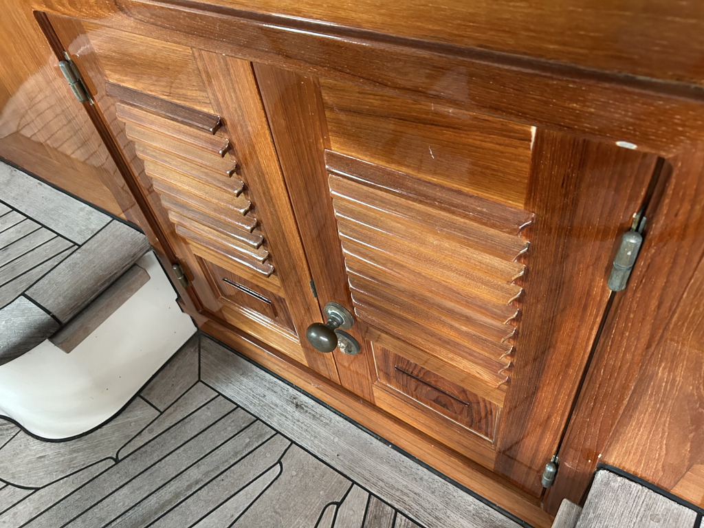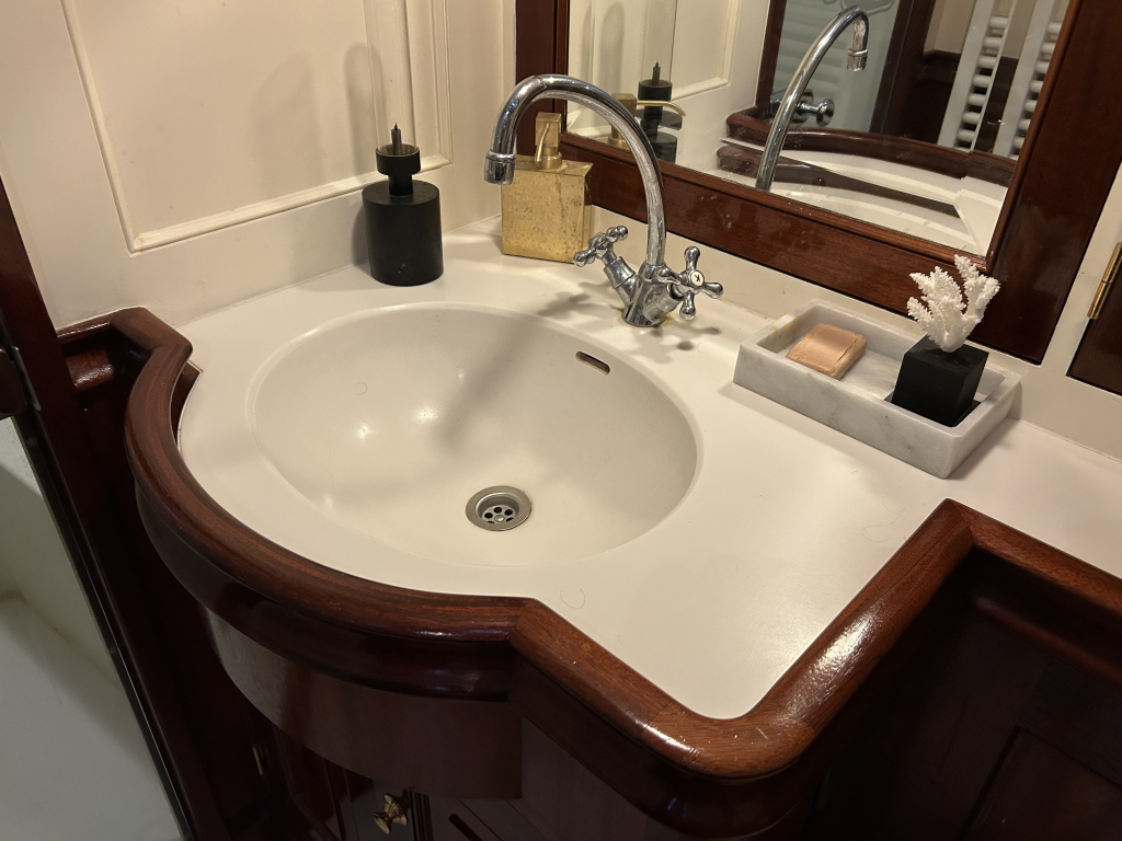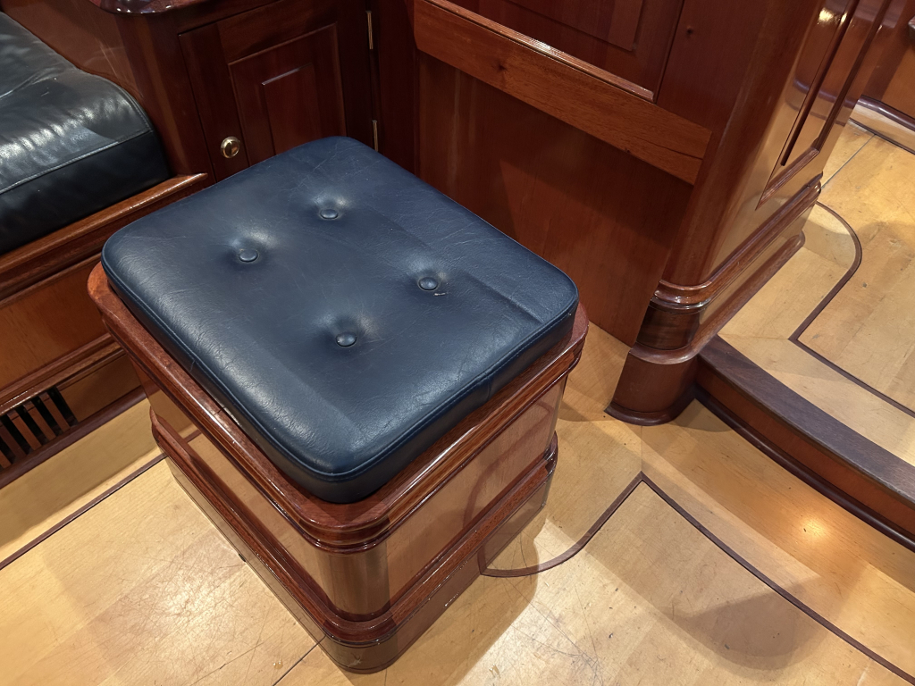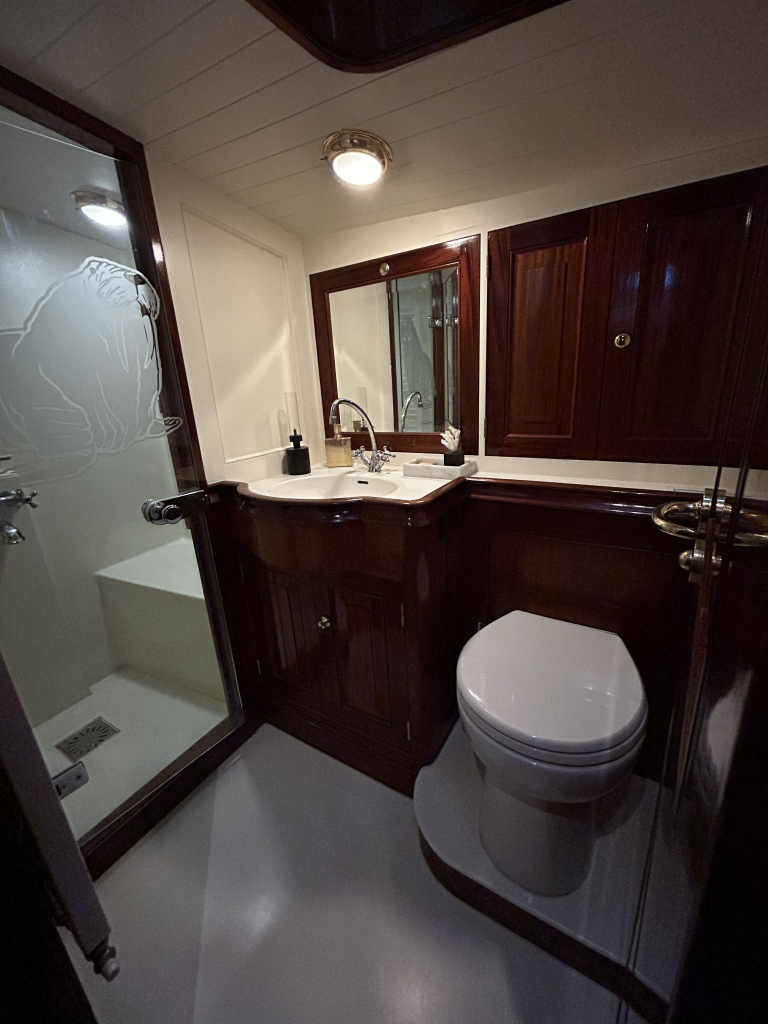 De Walrus is gebouwd met een zeldzaam oog voor detail. De betimmering is ongekend verfijnd, een meesterwerk van houtbewerking. De essenhouten vloer met bies loopt als een warme ader door het hele schip, en in elk hoekje ontdek je opnieuw het vakmanschap waarmee dit schip is afgewerkt. De salon is ruim en licht, met een praktische indeling waarin je je direct thuis voelt. Een gezellige navigatiehoek en een volledig uitgeruste keuken met handgebakken tegeltjes brengen functionaliteit en sfeer samen.