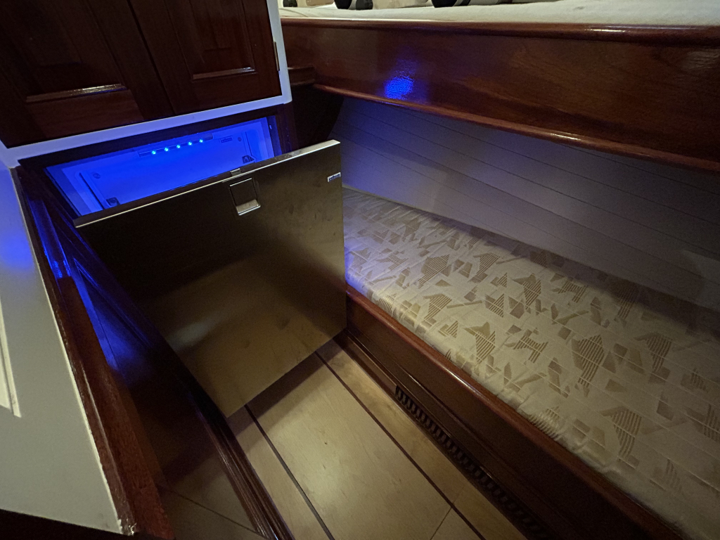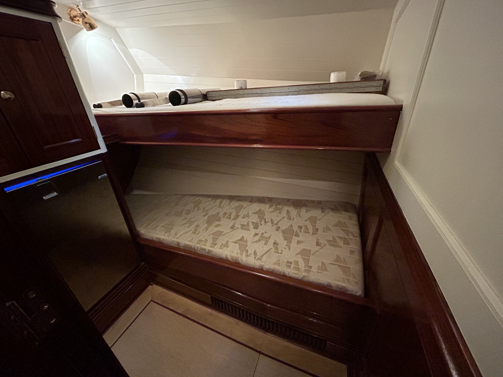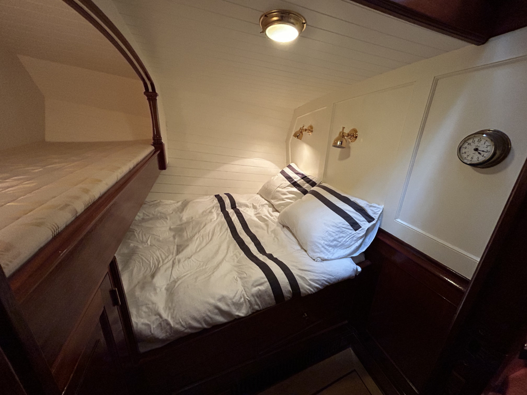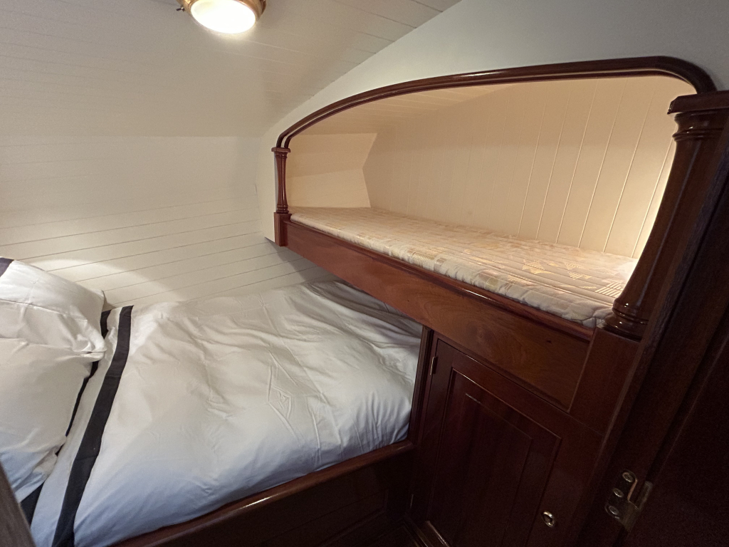 Met vijf hutten biedt de Walrus ruimte aan een groter gezelschap, zonder in te leveren op privacy of comfort. De mastercabin beschikt over een eigen natte cel, afgewerkt met duurzame Corean bladen. In de doorloop is aan stuurboord een gastenhut met stapelbed en een extra koelkast. In het voorschip zijn 2 gastenhutten met een dubbelbed en enkel bed. Alles aan boord ademt degelijkheid en doordachtheid.