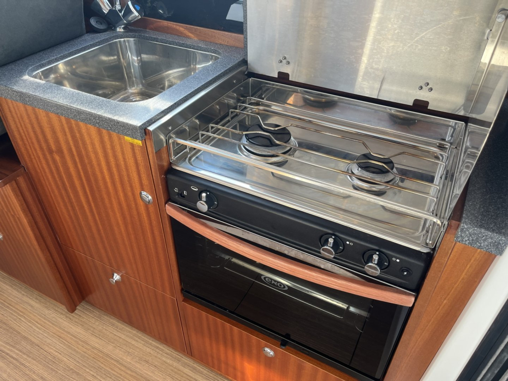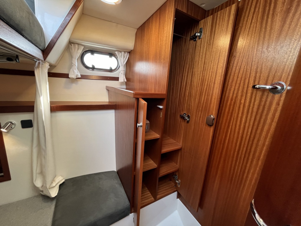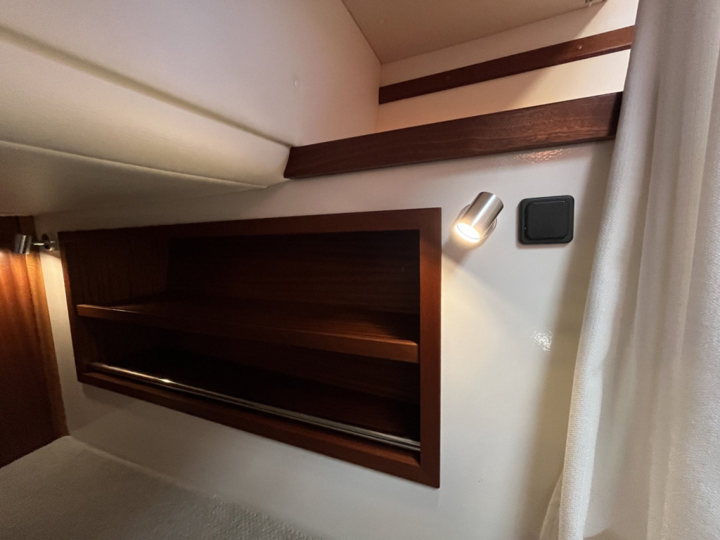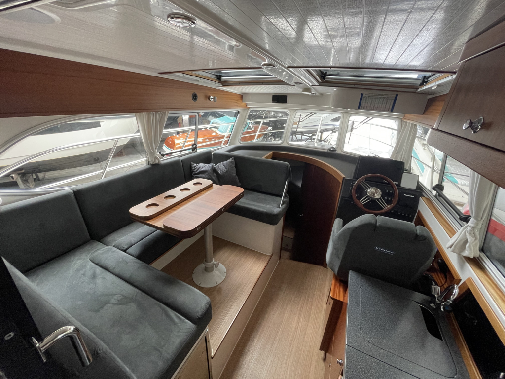 Zeer doordacht interieur. Massief mahoniehouten lijstwerk. De salon heeft een uitklapbare tafel. De salonbank kan omgeklapt worden naar een mee-vaar zit. Het salondak is voorzien van 2 grote schuifluiken en daarnaast zijn er klapramen.