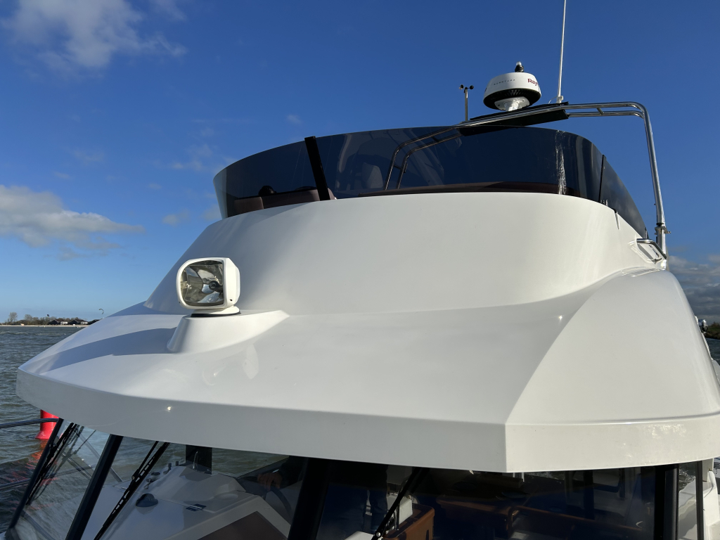 Ruim, licht en slim ontworpen interieur. Binnen in de salon valt direct het open en lichte karakter op, dankzij de grote panoramische ramen. Het interieur is uitgevoerd met warme houtaccenten en praktische opbergruimte, gecombineerd met een modern design.Gezellige salon met bank (om te bouwen tot extra bed). Volledig uitgeruste keuken met koelkast, oven, fornuis en spoelbak. Ruime master cabin met eilandbed en veel kastruimte. Tweede cabine met stapelbed – ideaal voor gasten of kinderen. Natte cel met elektrisch toilet en aparte douche. Grote schuifdeuren naar het achterdek naadloze overgang tussen binnen en buiten. Flybridge: comfort op het hoogste niveau. De flybridge is een van de paradepaardjes van deze Swift Trawler. Deze biedt niet alleen een tweede stuurstand met uitstekend zicht rondom, maar ook een royale zitbank, tafel en ruimte om te genieten van de zon en frisse lucht. Dankzij de slimme indeling blijft dit een volwaardig leefdek, zelfs tijdens het varen.