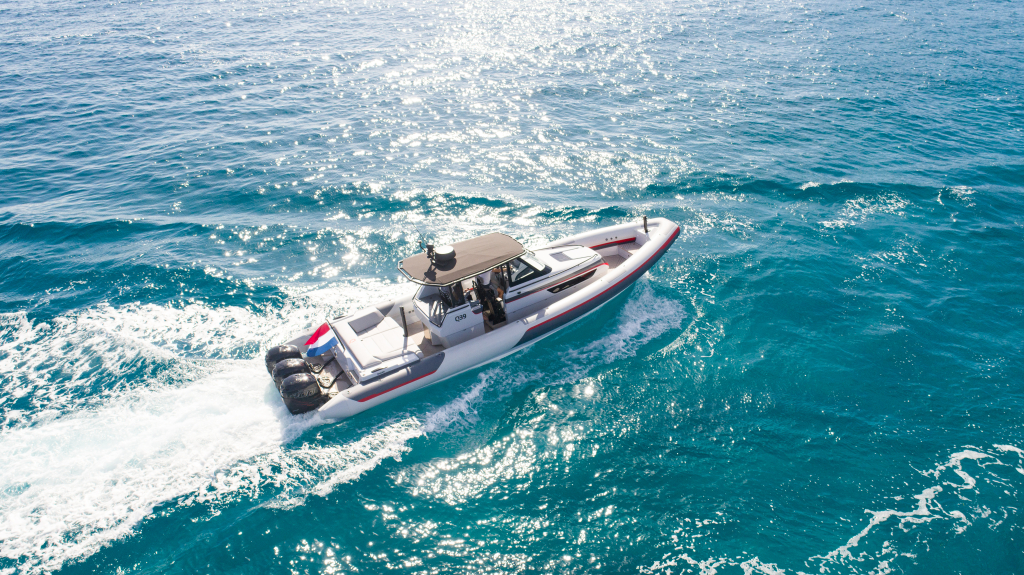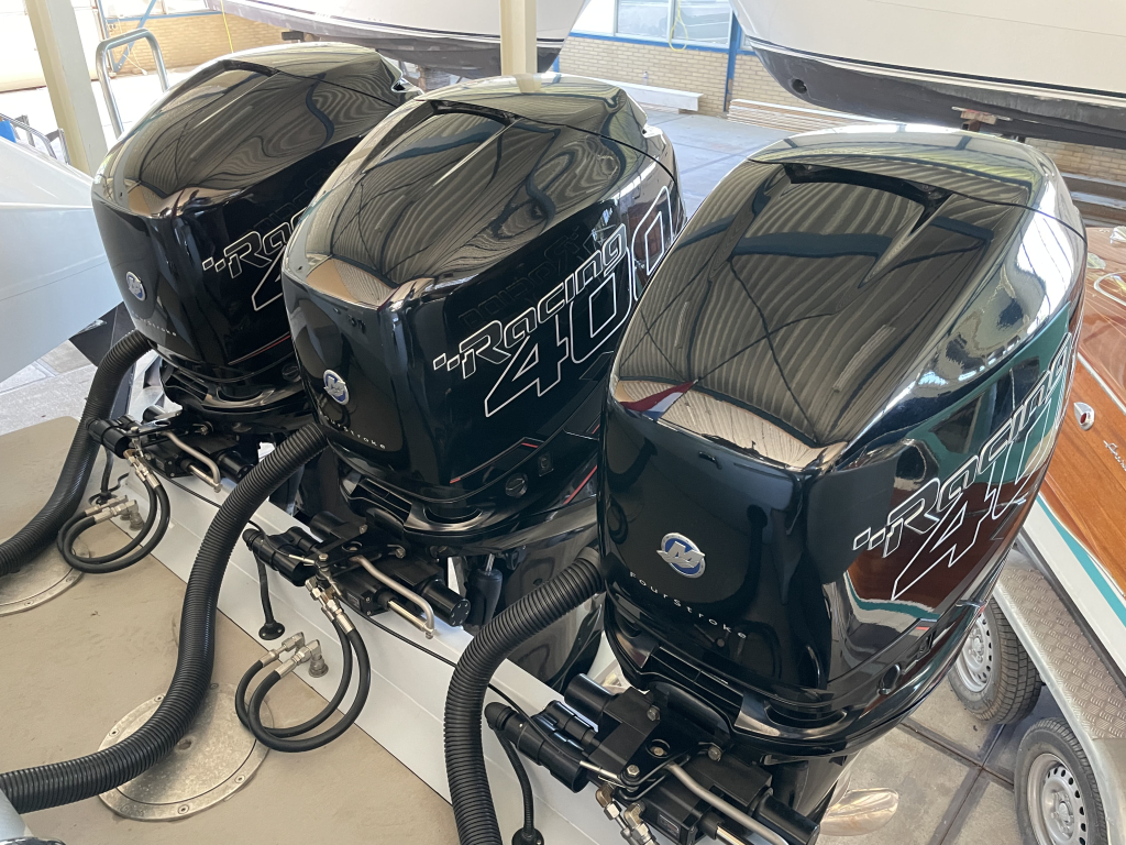De Q39 Superb Rib is uitgerust met 3 x 400 pk Mercury Racing Verado-motoren*, welke ervoor zorgen dat de Rib, maar liefst een topsnelheid van zo’n 55 tot 60 knopen haalt. Ze beschikt over de nieuwste apparatuur, Carbon sleeppaal achter, carbon bolder, Custom-made T top, exclusieve schokabsoberende stuurstoelen, hoogwaardige kwaliteit afwerking in het moderne interieur, Mercury Joystick Pilot systeem. Kruissnelheid ca. 40 knopen.