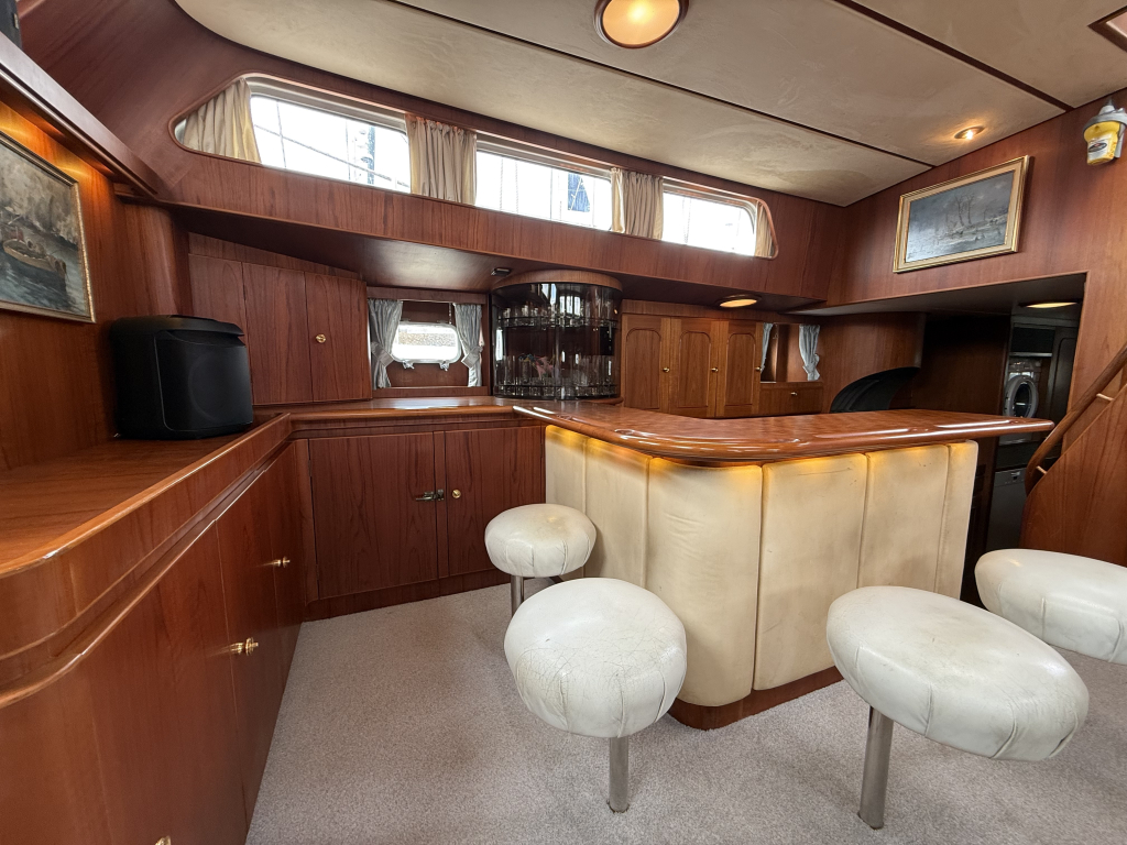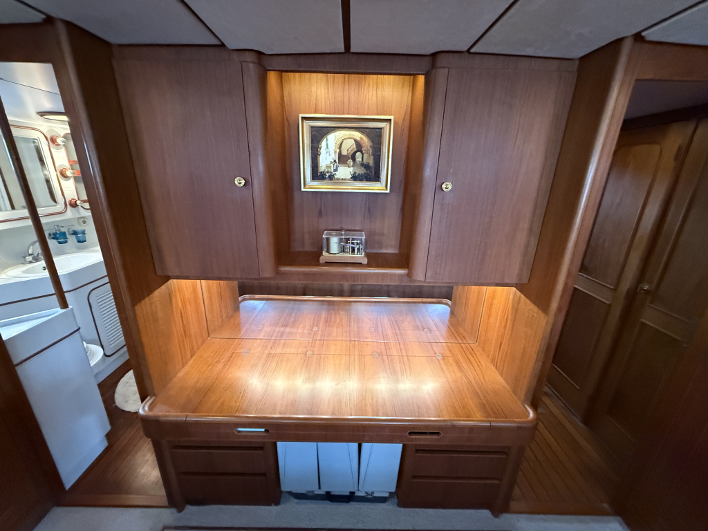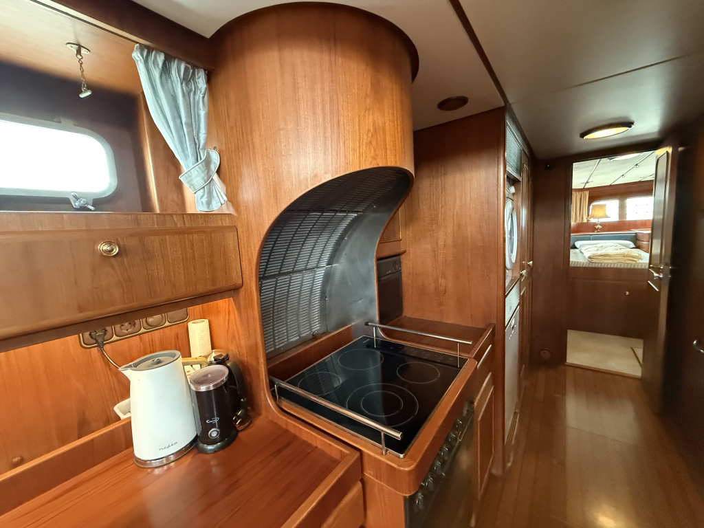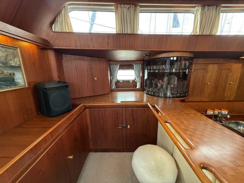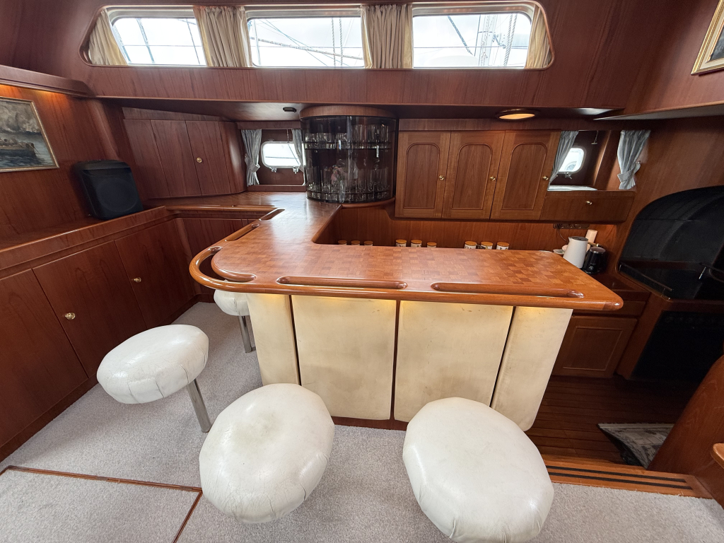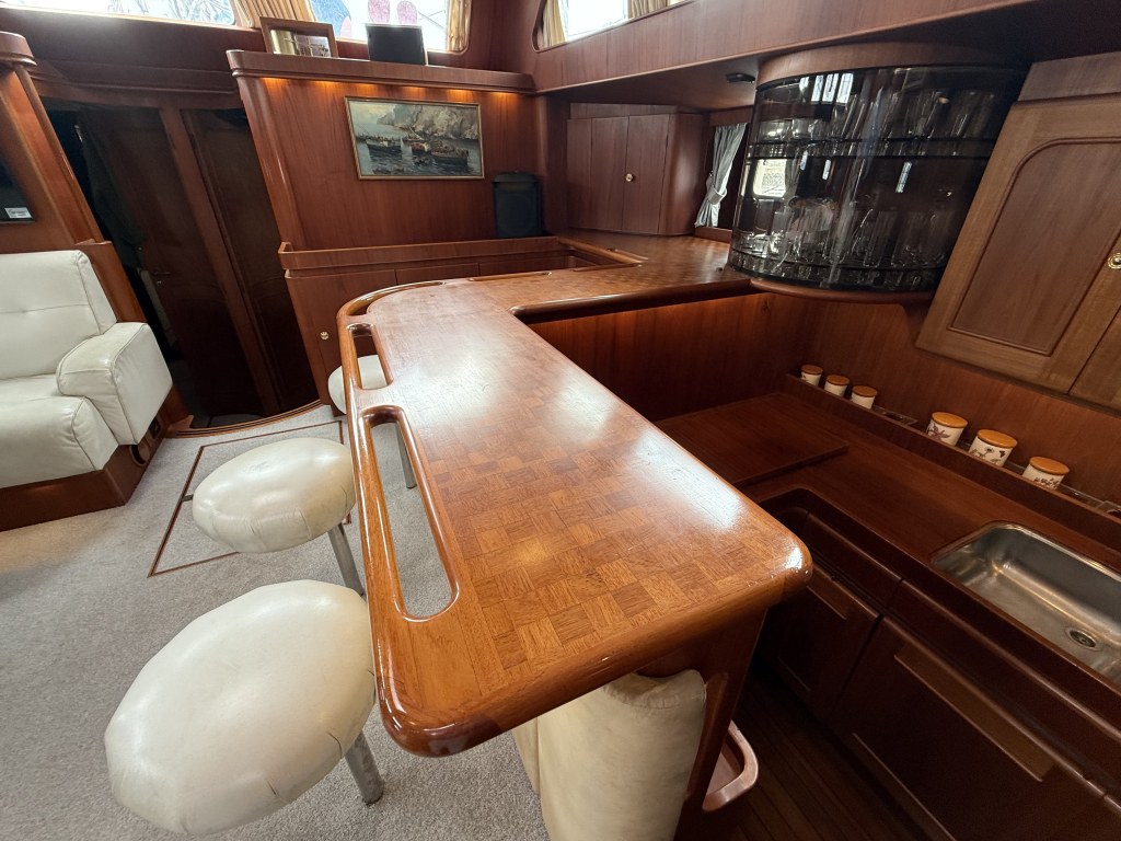 Exclusiviteit en Comfort Het jacht onderscheidt zich door een exquis houten interieur, een opvallend ruime machinekamer en een riant cockpitgebied. Uniek aan dit exemplaar is het uiterst praktische Jongert-platform aan de achterzijde. De goed beschutte stuurhut biedt een veilige haven onder alle weersomstandigheden.