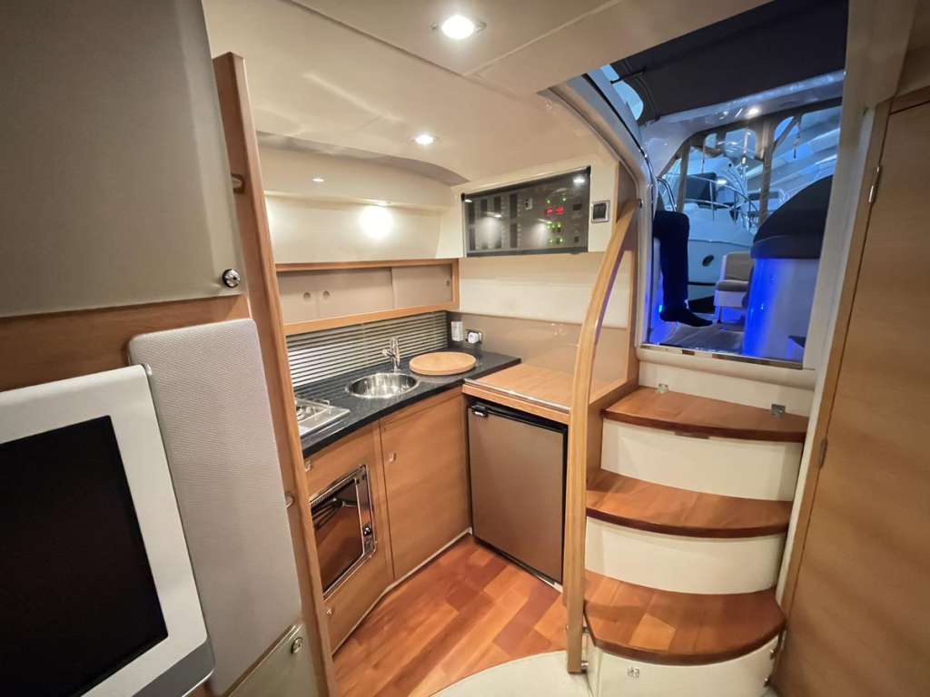 De Fairline 38 Targa is de meest praktische sportcruiser in haar klasse. Zowel de layout buiten als binnen is doordacht en functioneel. De twee hekschroeven in combinatie met de boegschroef maakt manoeuvreren tot kinderspel. Het dek is belegd met teak waardoor de uitstraling luxe is. De Fairline staat bekend om de uitstekende afwerking. Onder andere voorzien van: zonnebed op het voordek, elektrische ankerlier, hoge zeerailing, rvs stootstrip rondom, cabriotent met uitneembere delen, volledige navigatie met radar, wegklapbare kuiptafel, granieten werkbladen in keuken en natte cel, elektrisch toilet, afsluitbare douchecabine, mastercabin met Frans bed, stereo-installatie binnen en buiten, wetbar in de kuip, binnenkeuken met gascomfort - oven - grote ijskast, gastenhut met verschuifbaar bed.