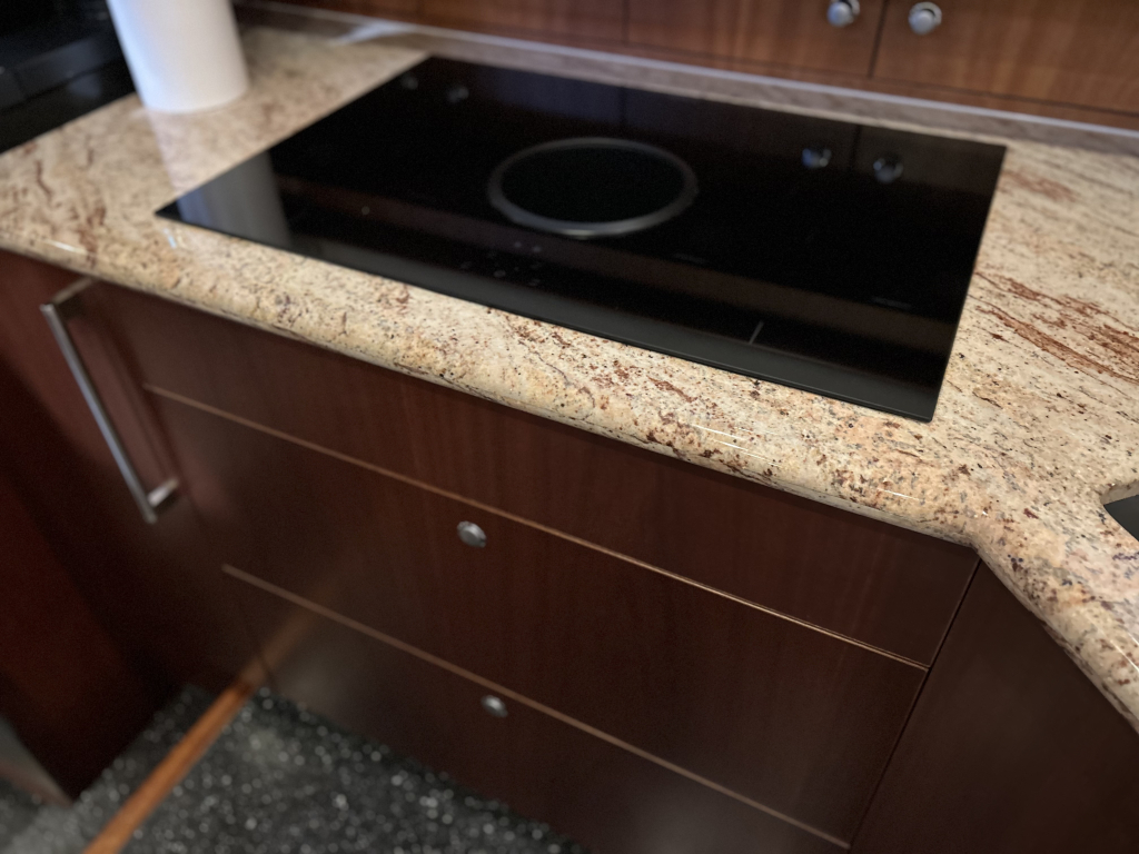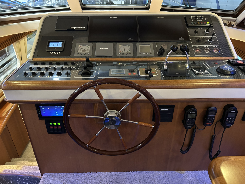 Renovated interior with Corian flooring in the wheelhouse, galley, and both forward and aft bathrooms.